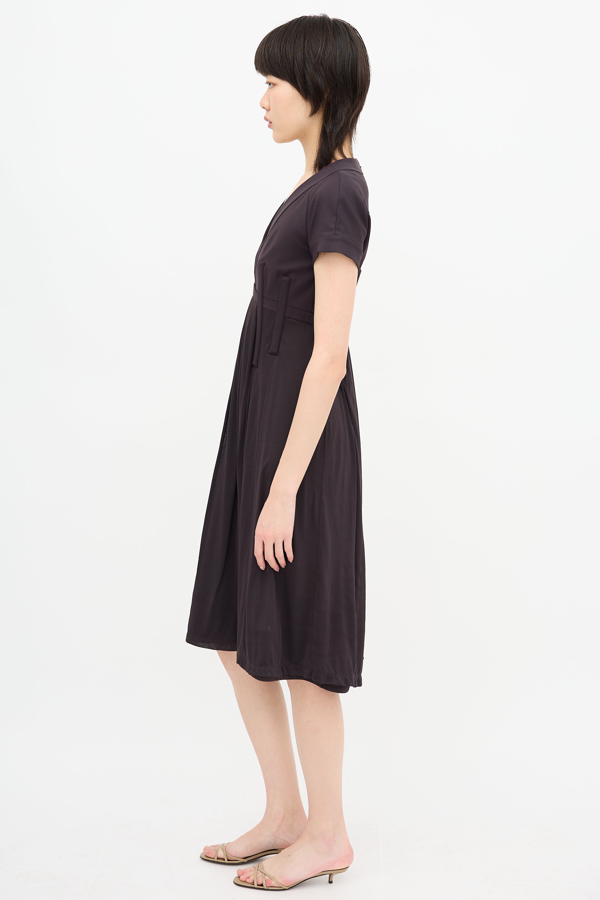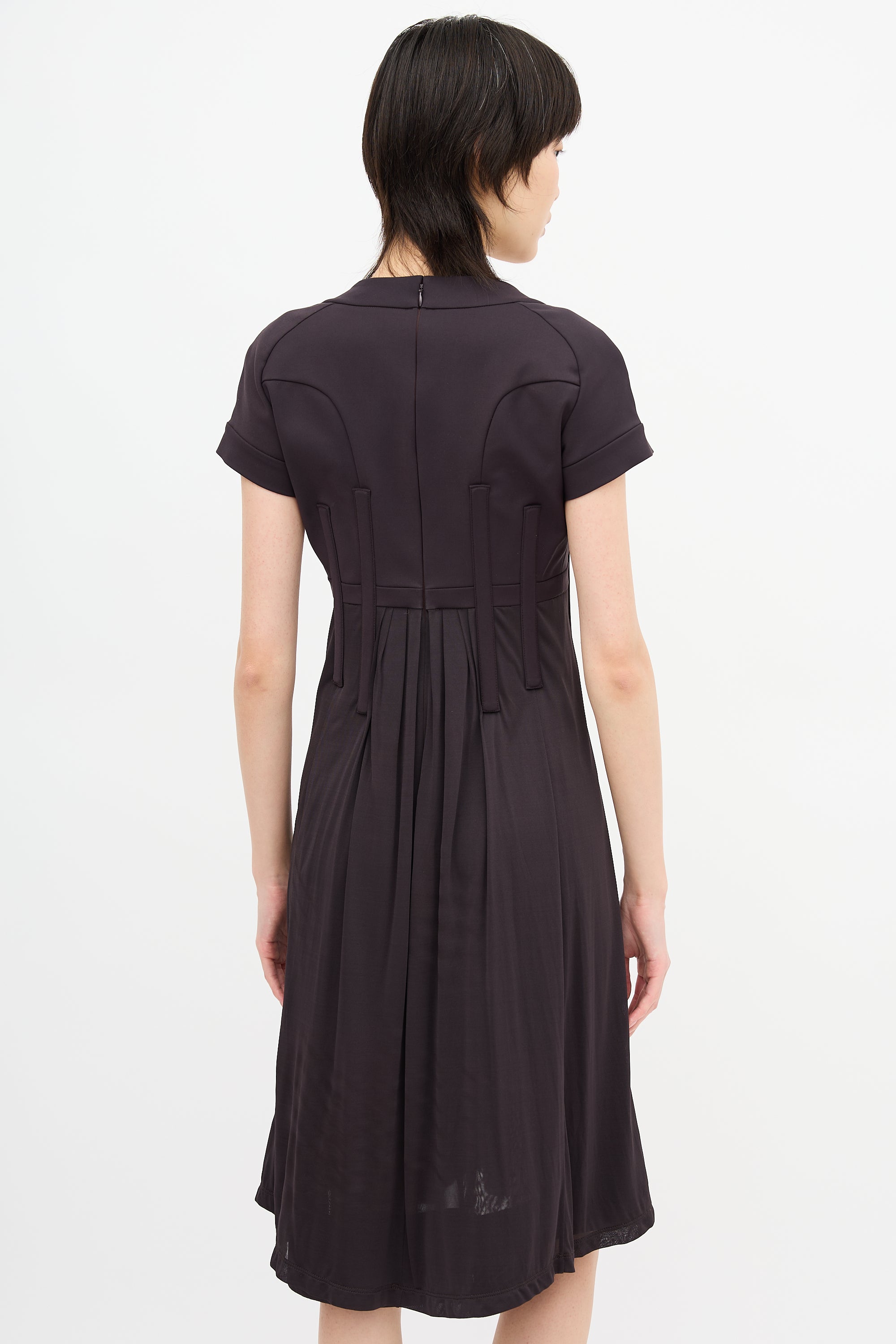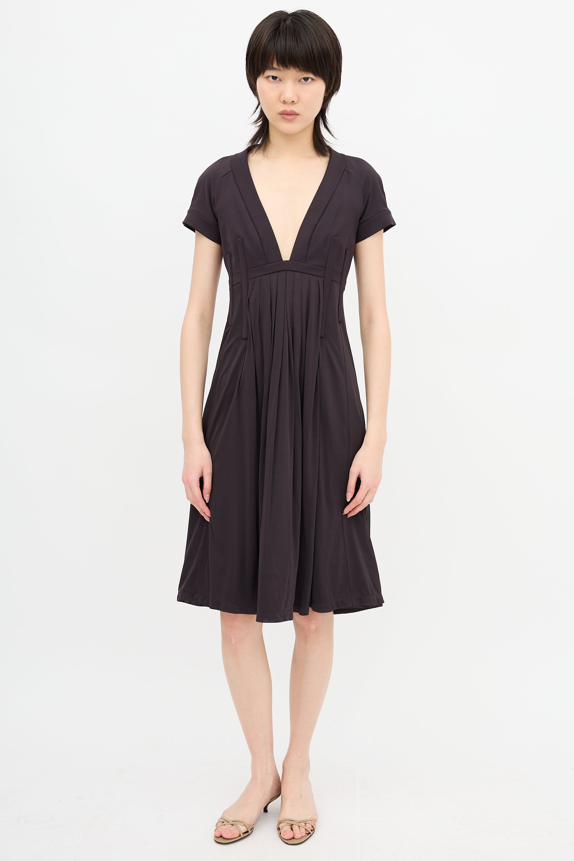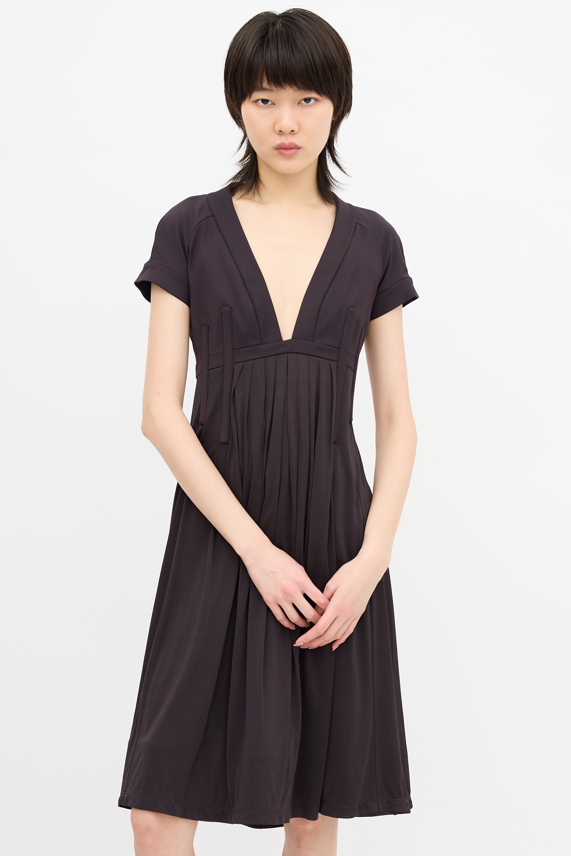 Pre-owned Celine black dress featuring V-neckline, cap sleeves, boning at waist, pleated skirt, and concealed back zip. Lined.