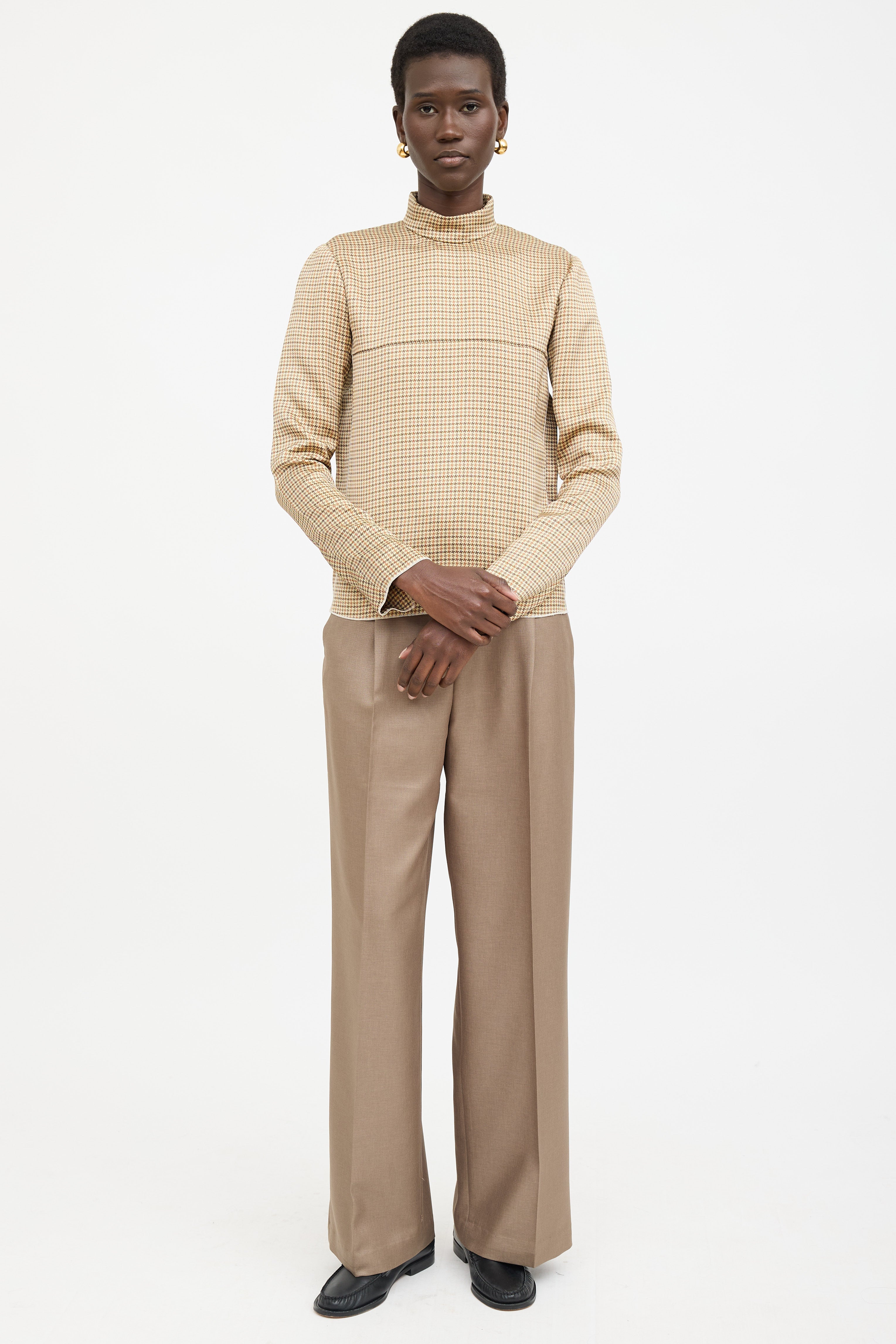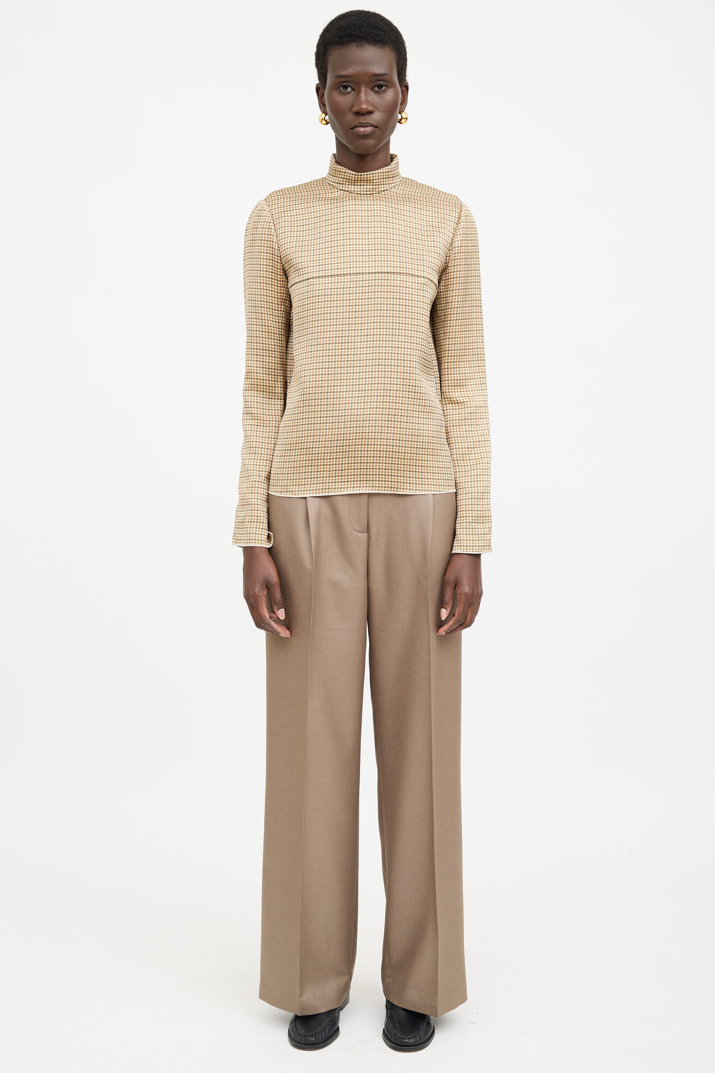 Pre-owned Celine beige silk top featuring a turtleneck, brown houndstooth pattern throughout, long sleeves with slit cuffs, seam at bust, and zip closure at back. Phoebe Philo era design.