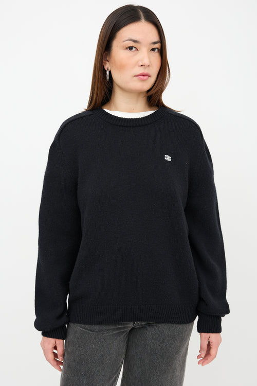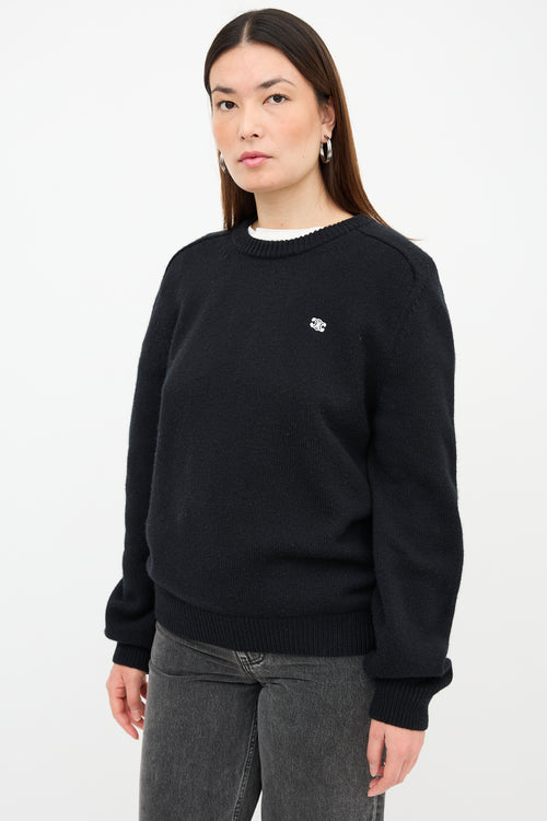 Pre-owned Celine black wool and cashmere blend sweater featuring crew neck, white embroidered Triomphe logo at left chest, and ribbed collar, hem, and cuffs.