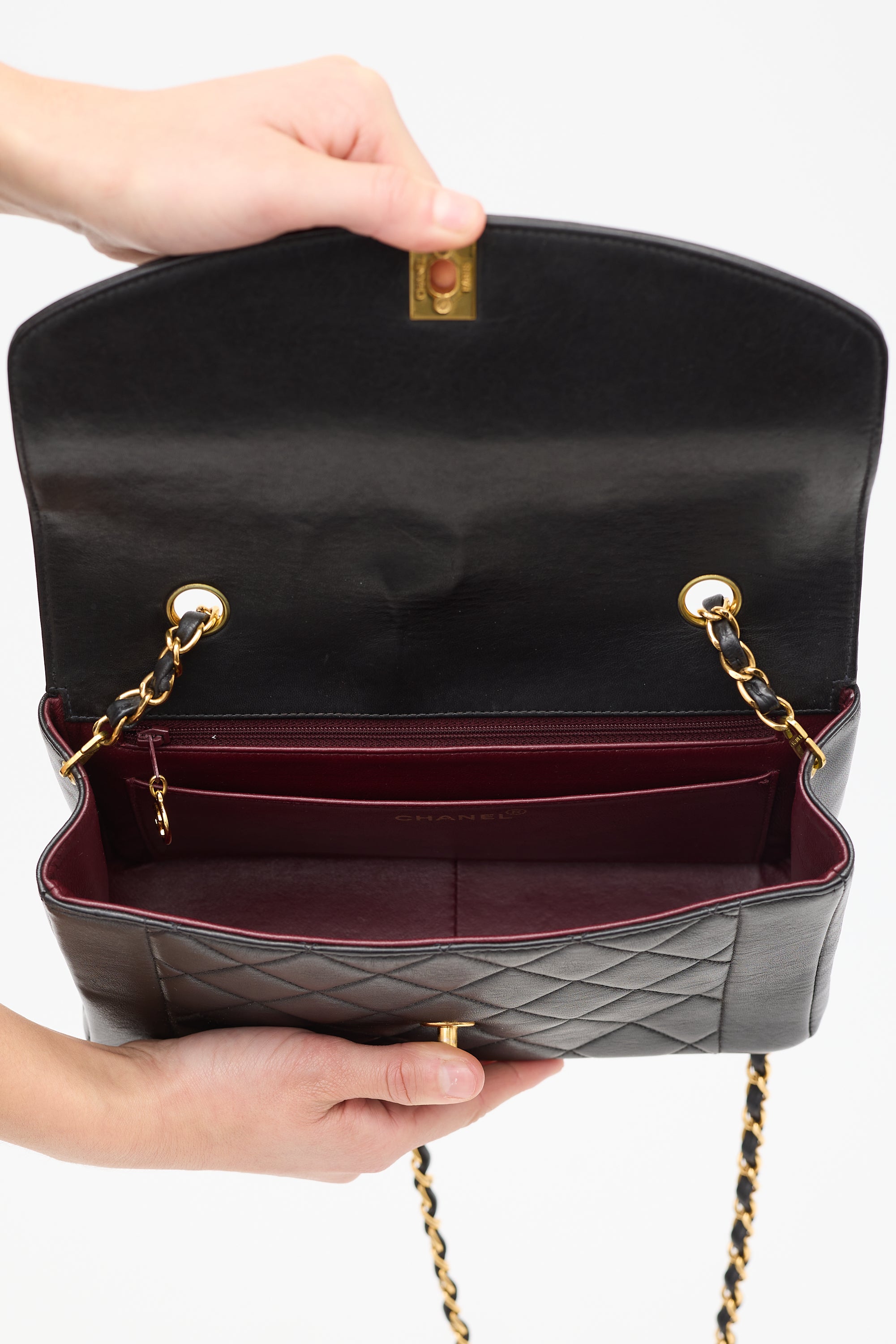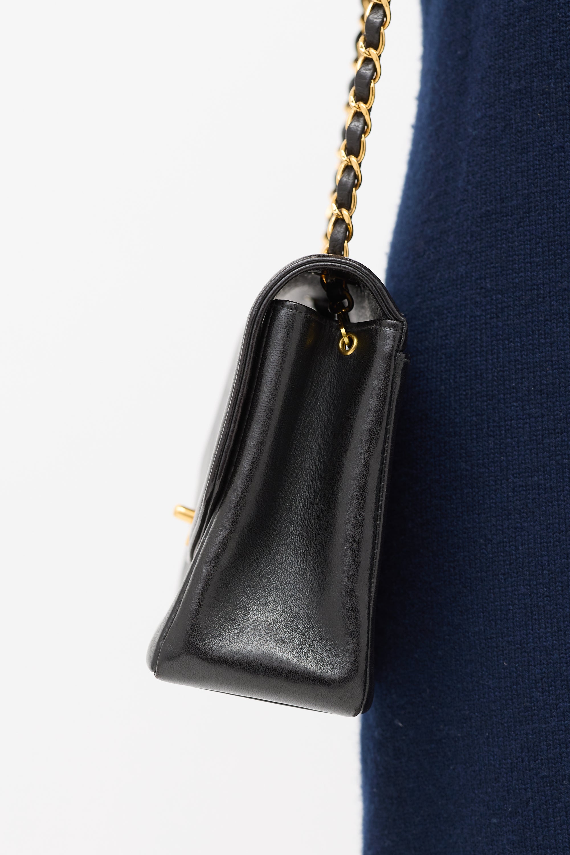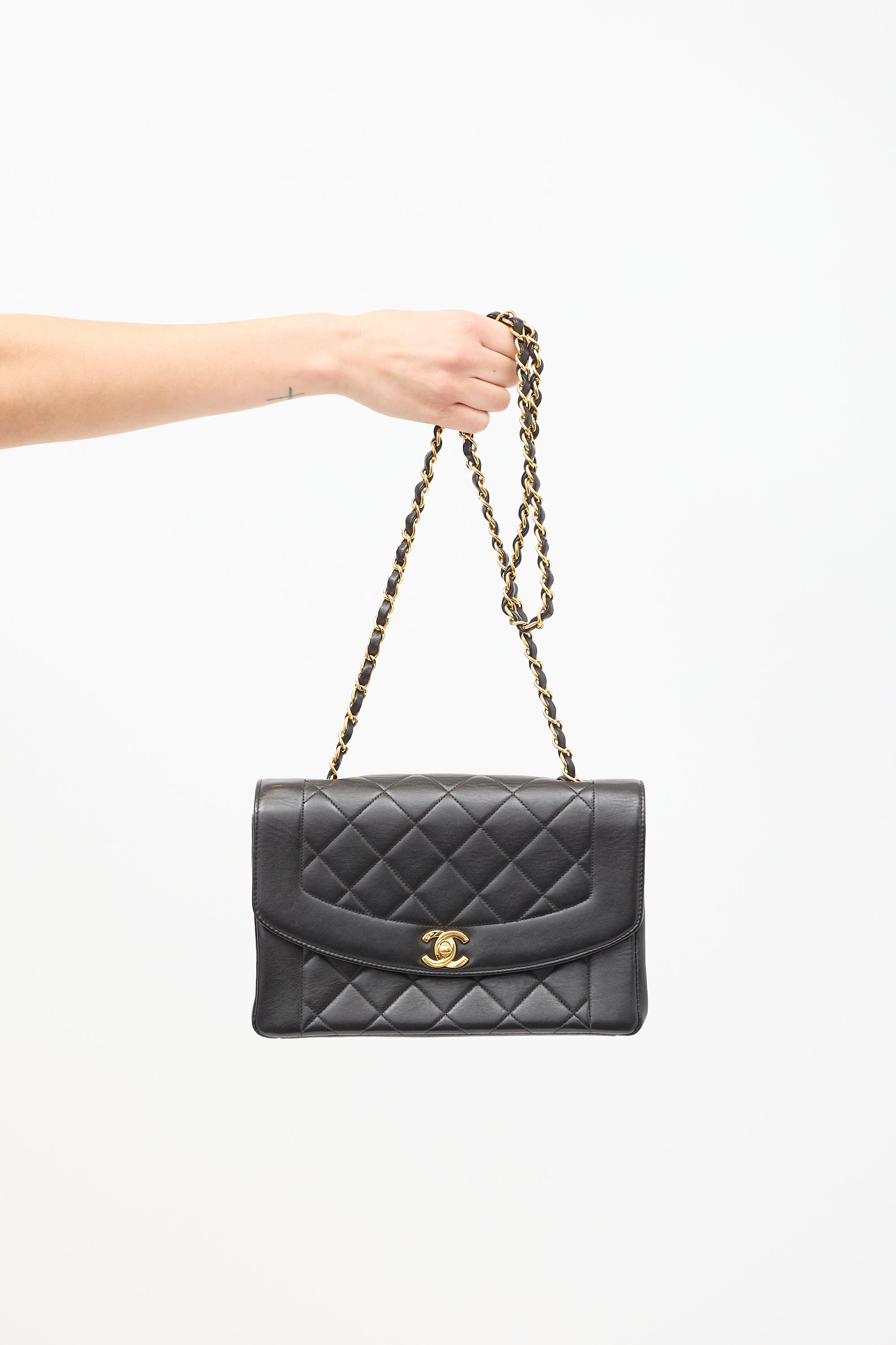 Pre-owned Chanel 1997-1999 black medium Diana flap bag featuring quilted leather body, 24k gold hardware, single braided leather and chain shoulder strap, front flap with interlocking CC logo hardware, twist lock closure, and one lined main compartment with one slip pocket and one zip pocket. Comes with original box, dust bag, certificate of authenticity card, and care guide.
