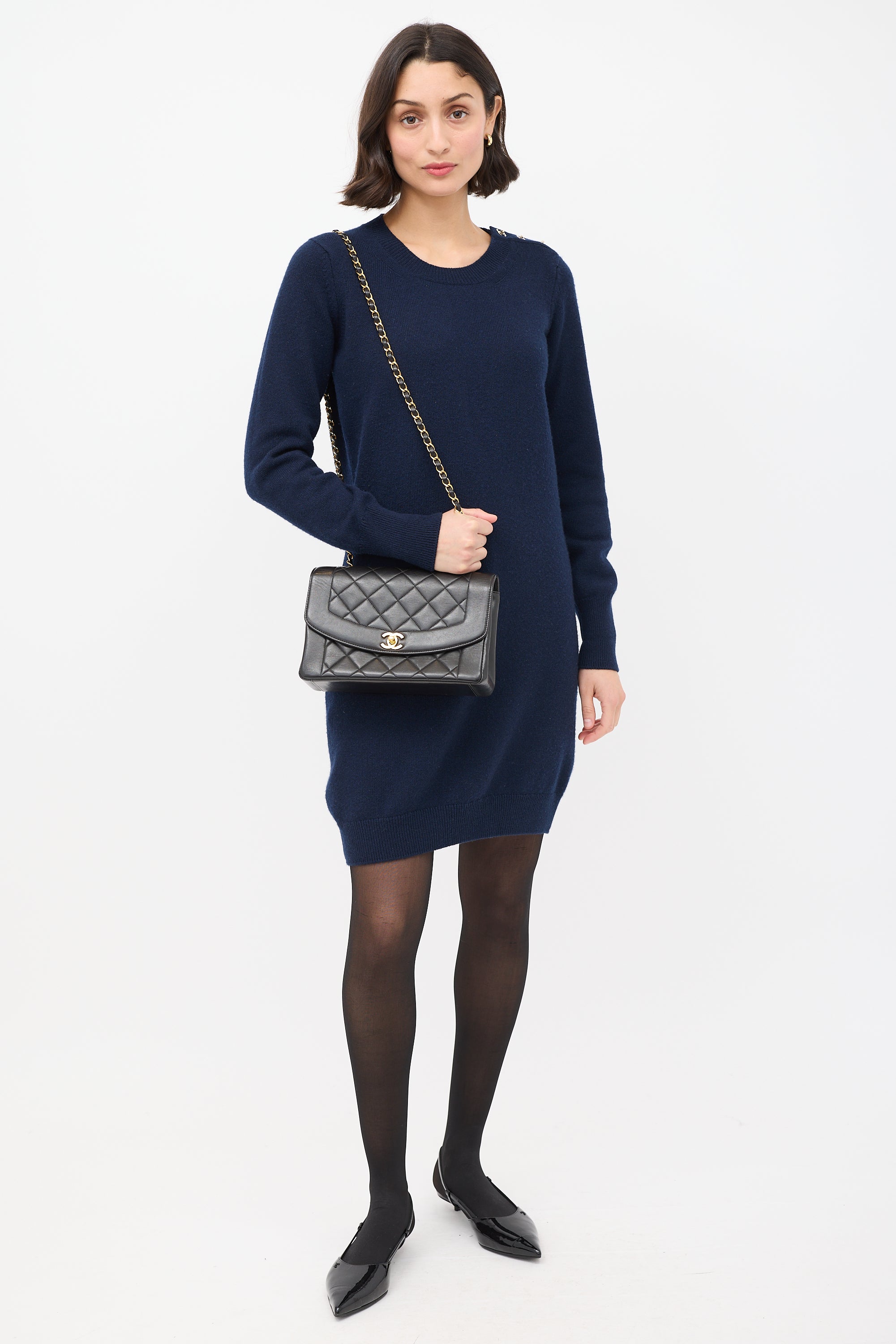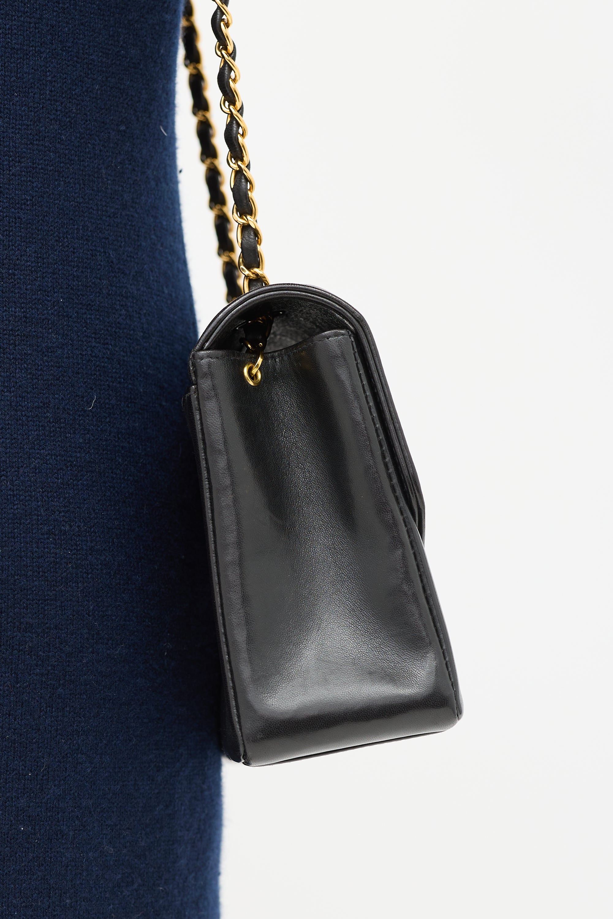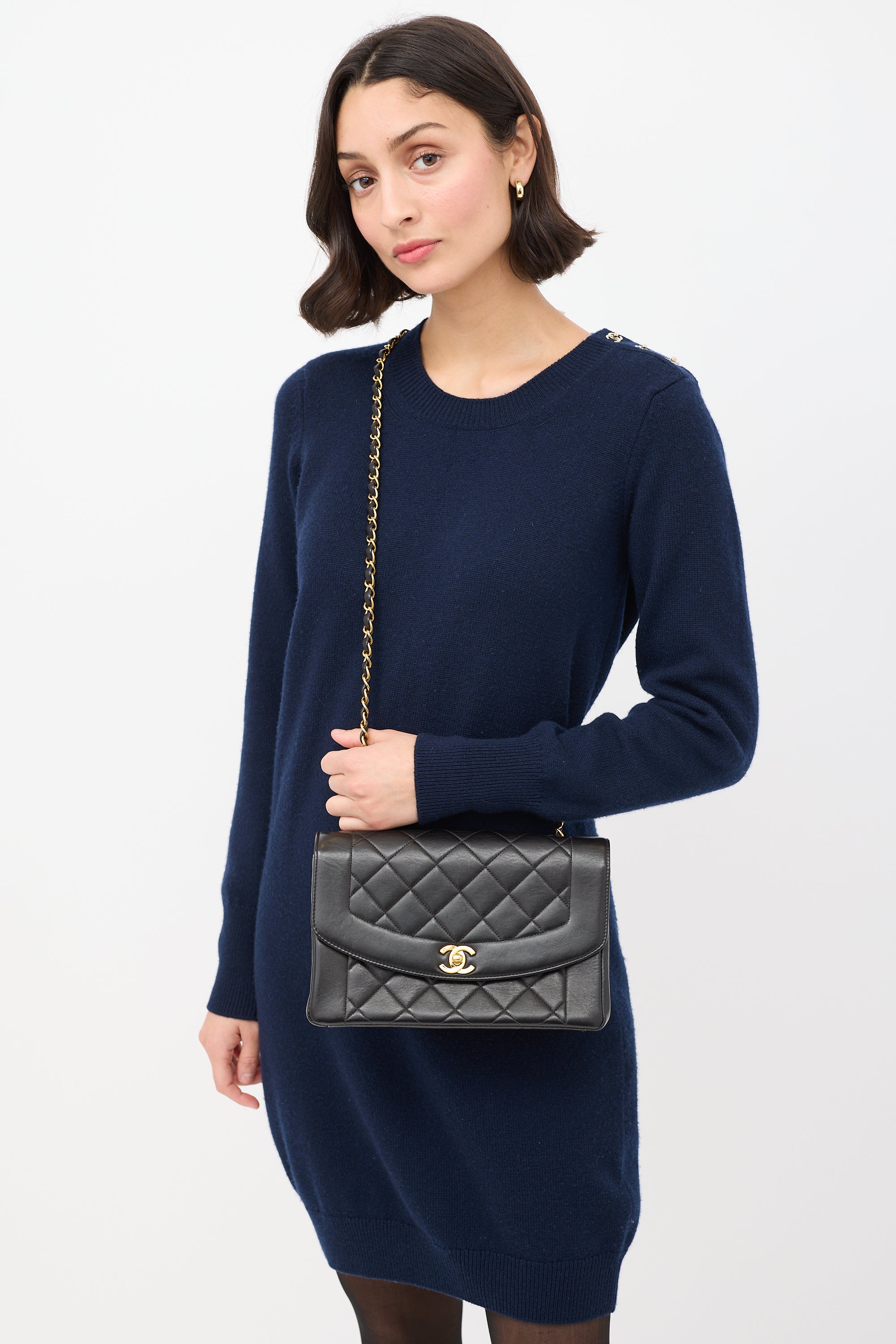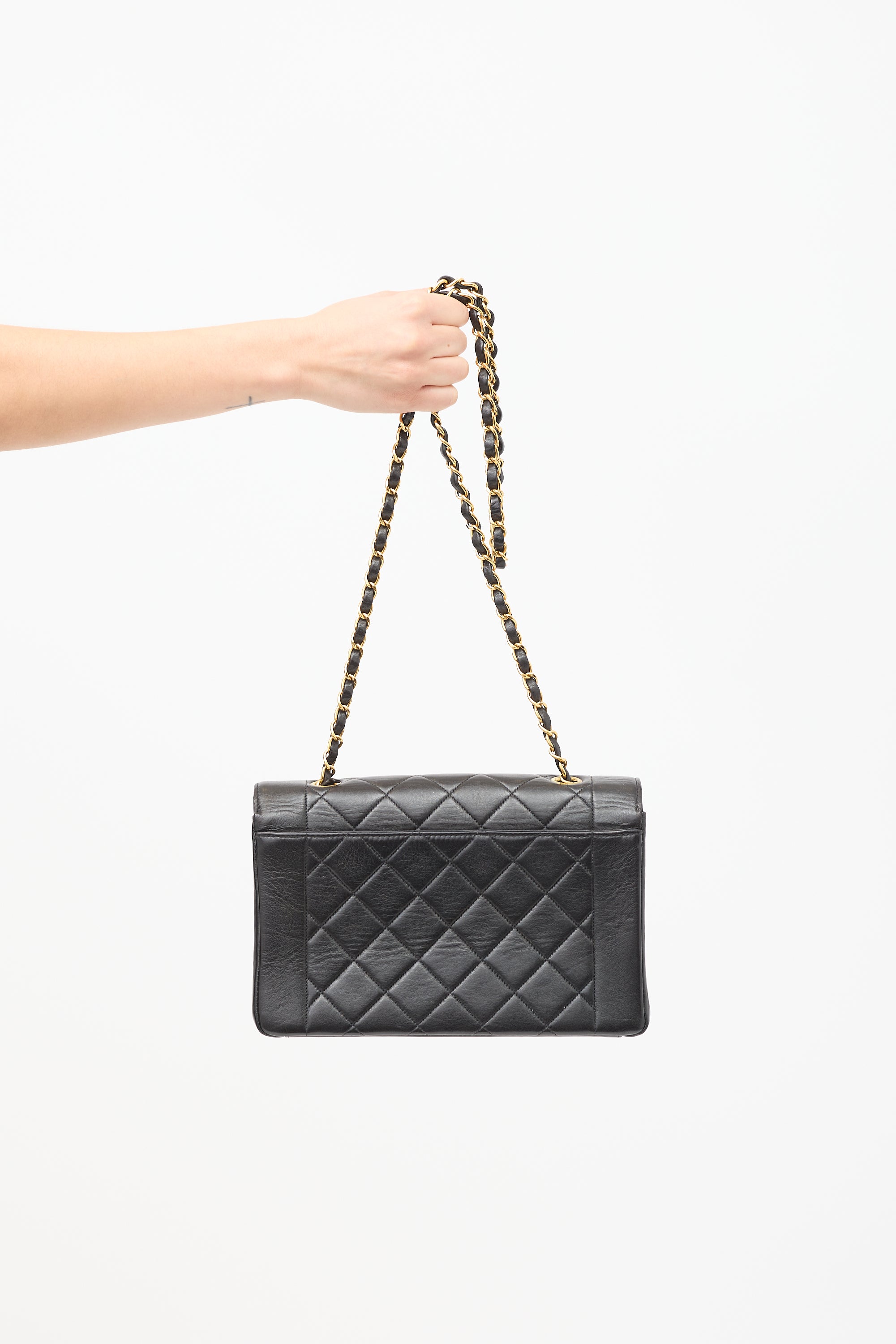 Pre-owned Chanel 1997-1999 black medium Diana flap bag featuring quilted leather body, 24k gold hardware, single braided leather and chain shoulder strap, front flap with interlocking CC logo hardware, twist lock closure, and one lined main compartment with one slip pocket and one zip pocket. Comes with original box, dust bag, certificate of authenticity card, and care guide.