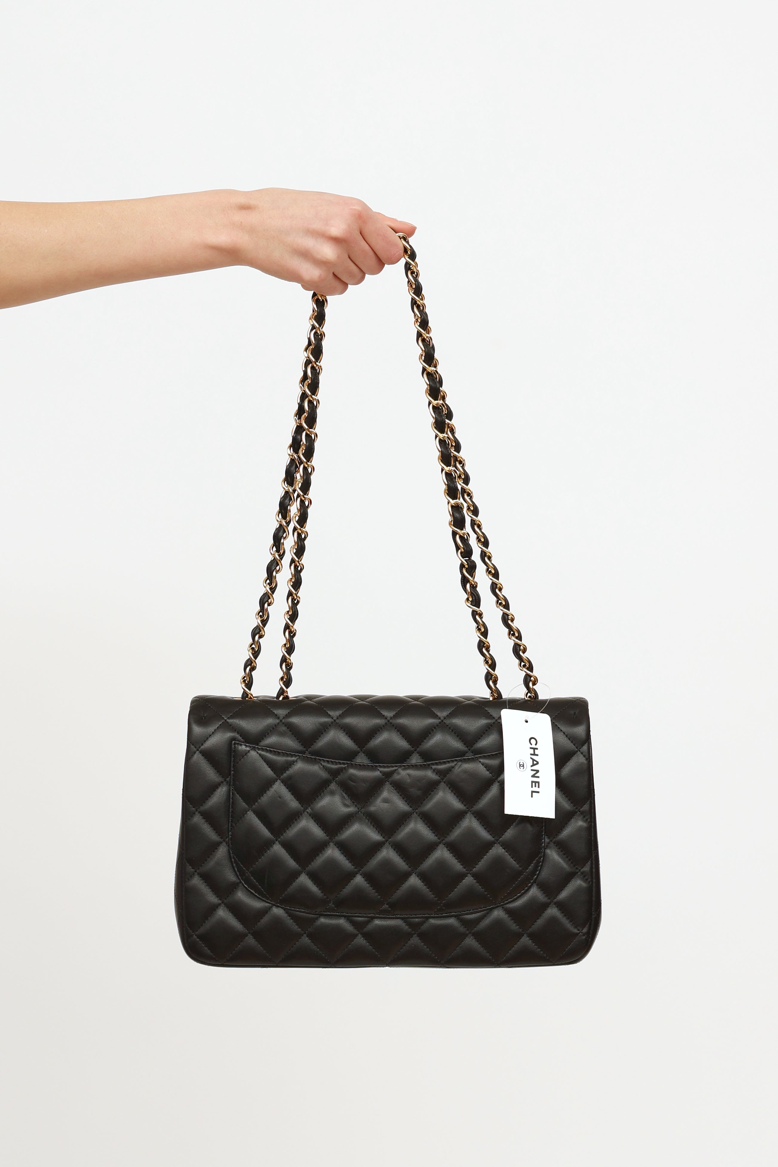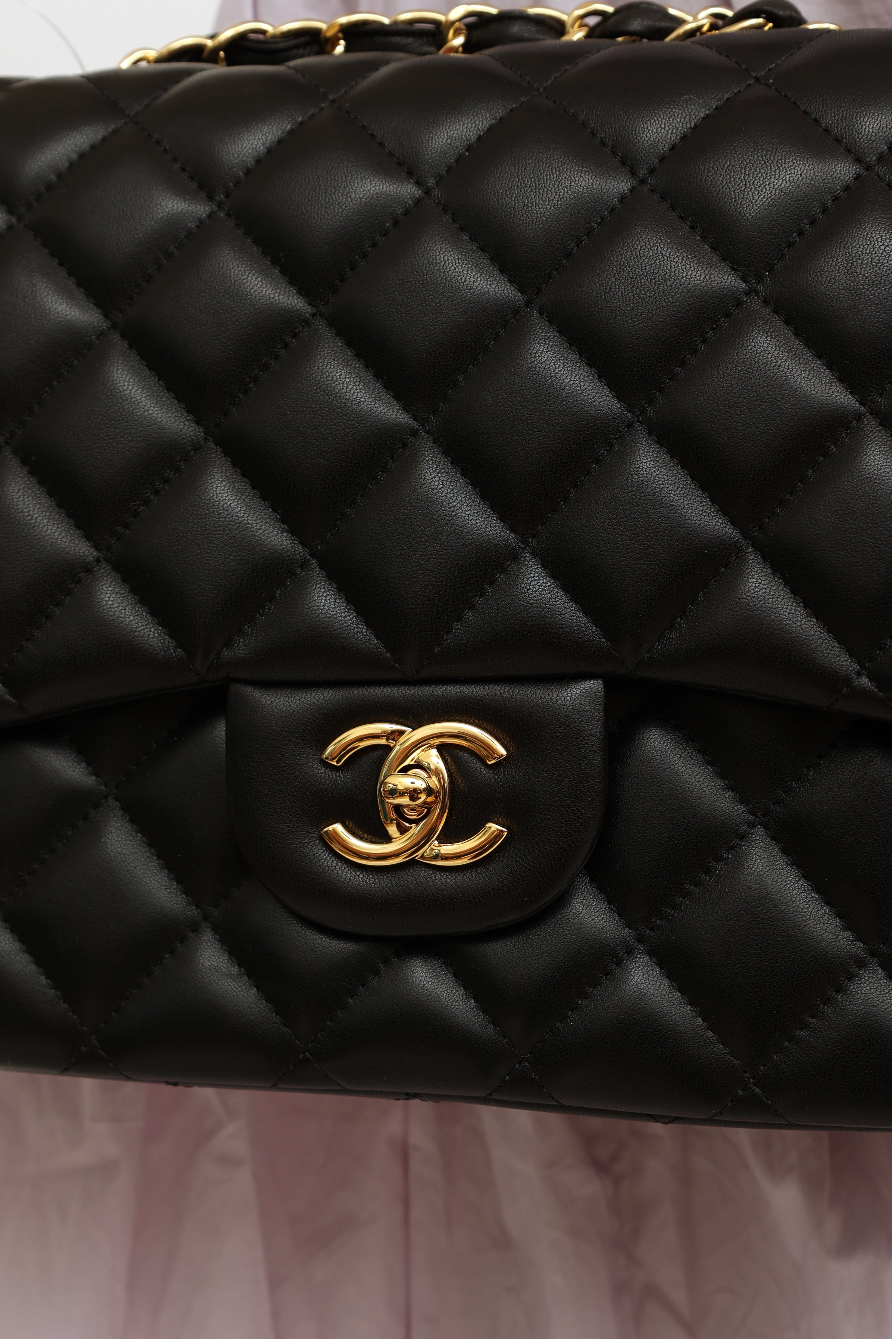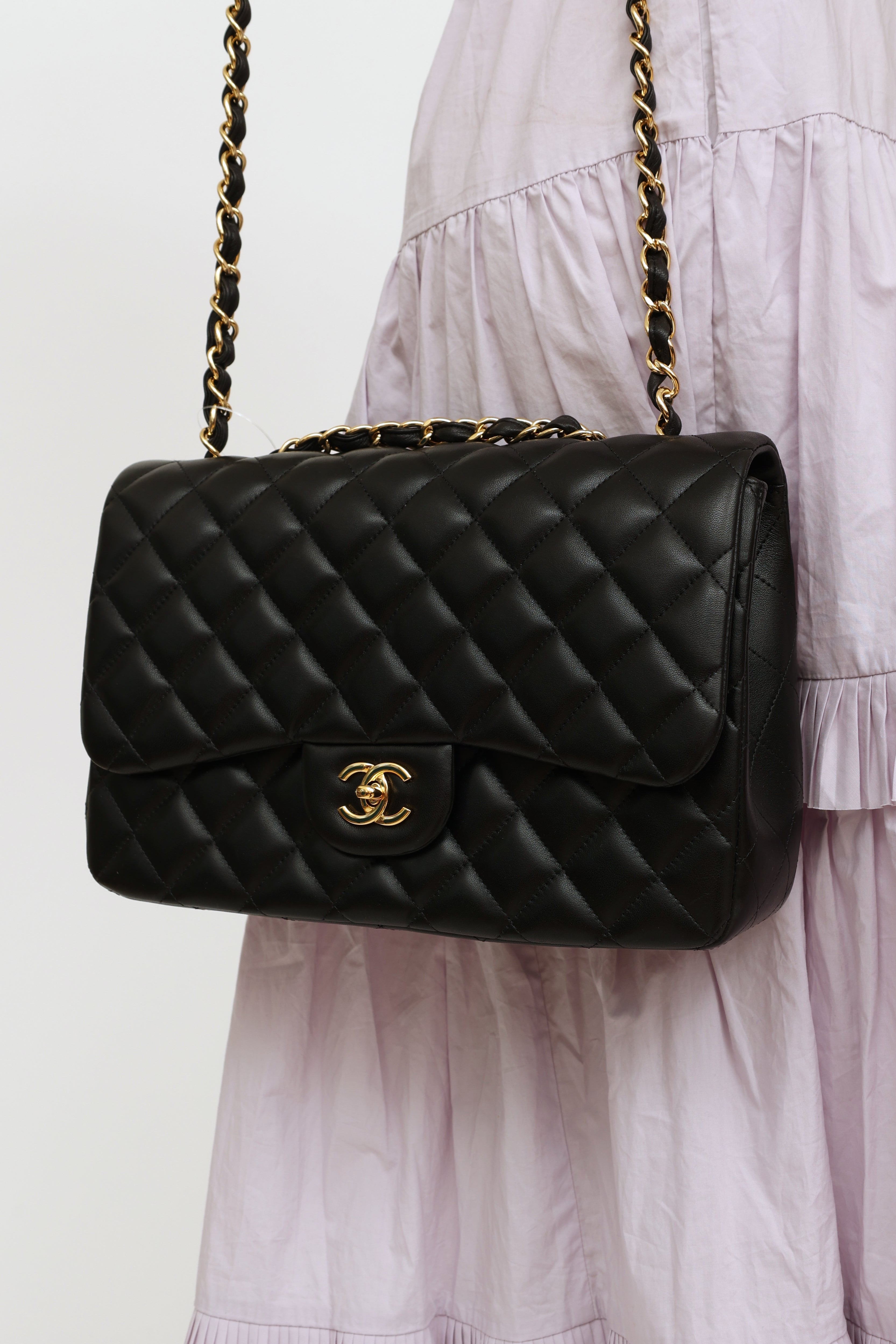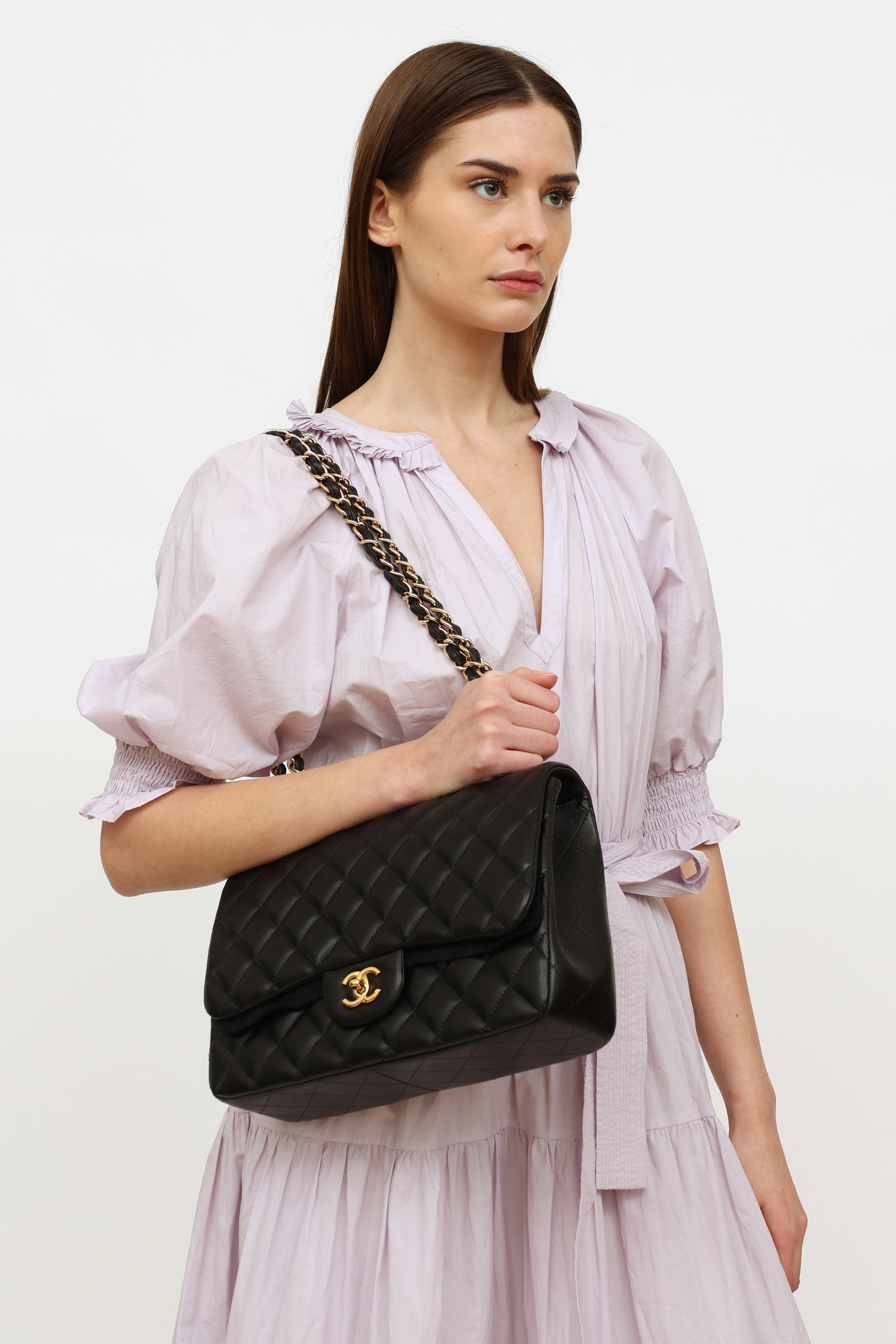 Pre-loved Chanel Classic Quilted Flap Jumbo bag in black lambskin leather featuring gold-tone hardware, interlocking CC logo with turn lock closure at face, one main leather-lined compartment, one zip and slip pocket at interior, one slip pocket at back and two way leather woven chain. Series 13 from 2009.