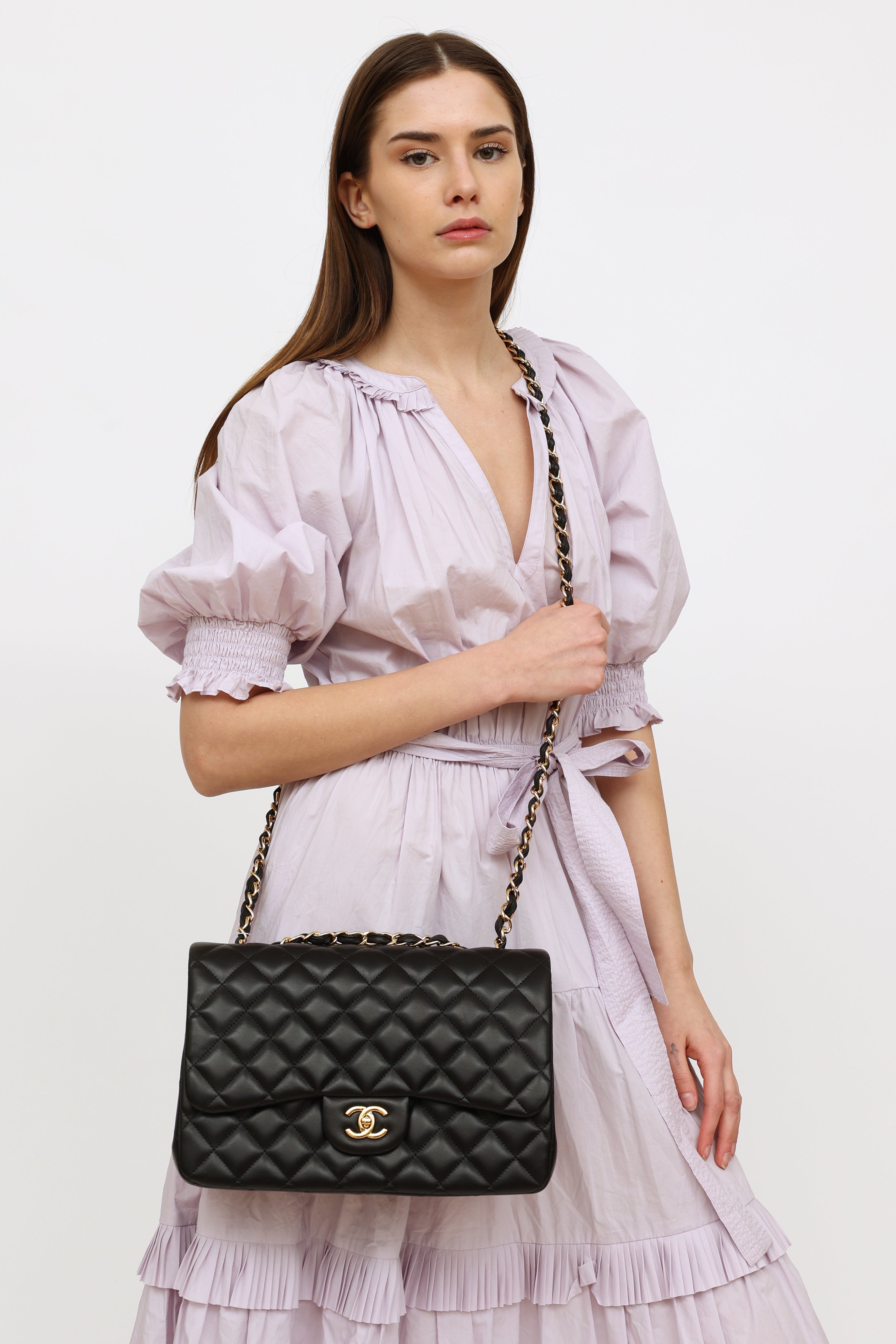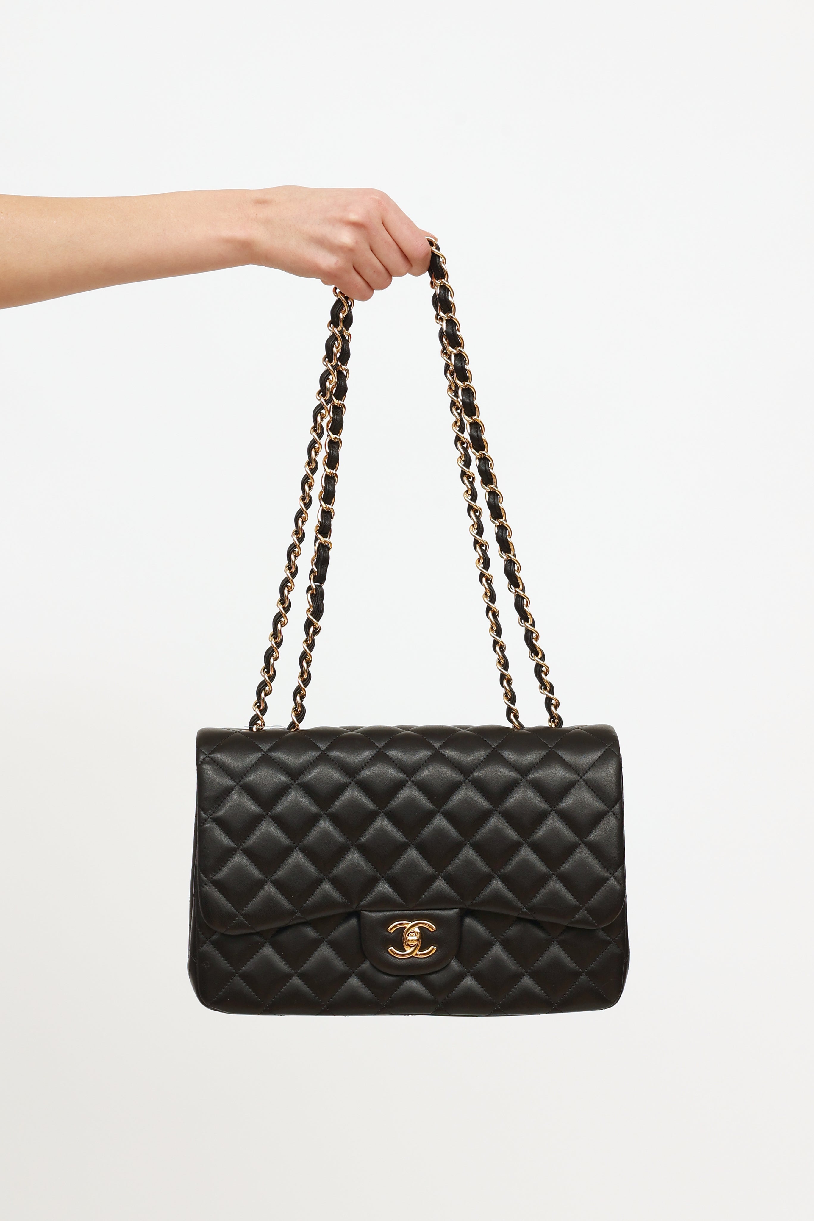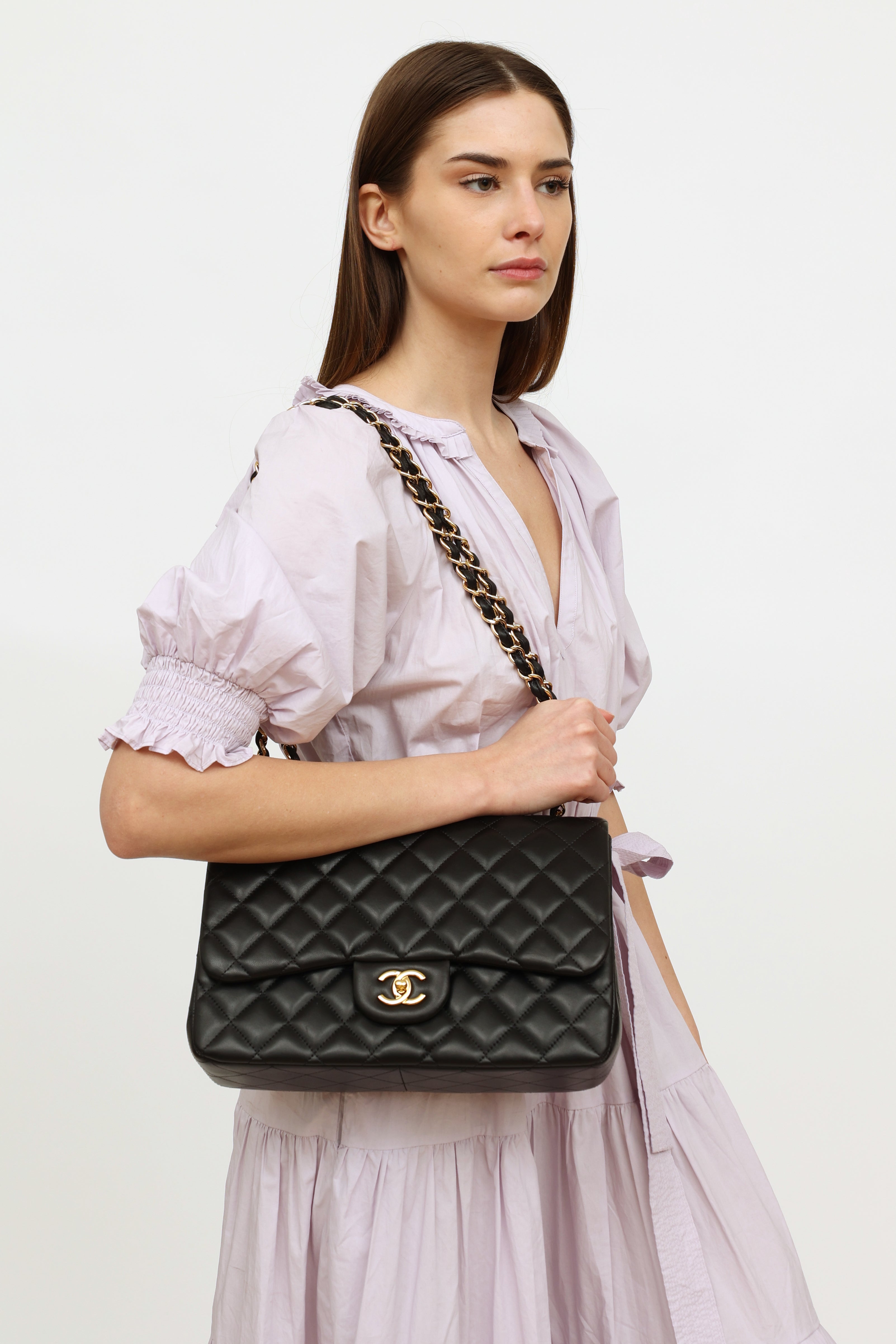Pre-loved Chanel Classic Quilted Flap Jumbo bag in black lambskin leather featuring gold-tone hardware, interlocking CC logo with turn lock closure at face, one main leather-lined compartment, one zip and slip pocket at interior, one slip pocket at back and two way leather woven chain. Series 13 from 2009.