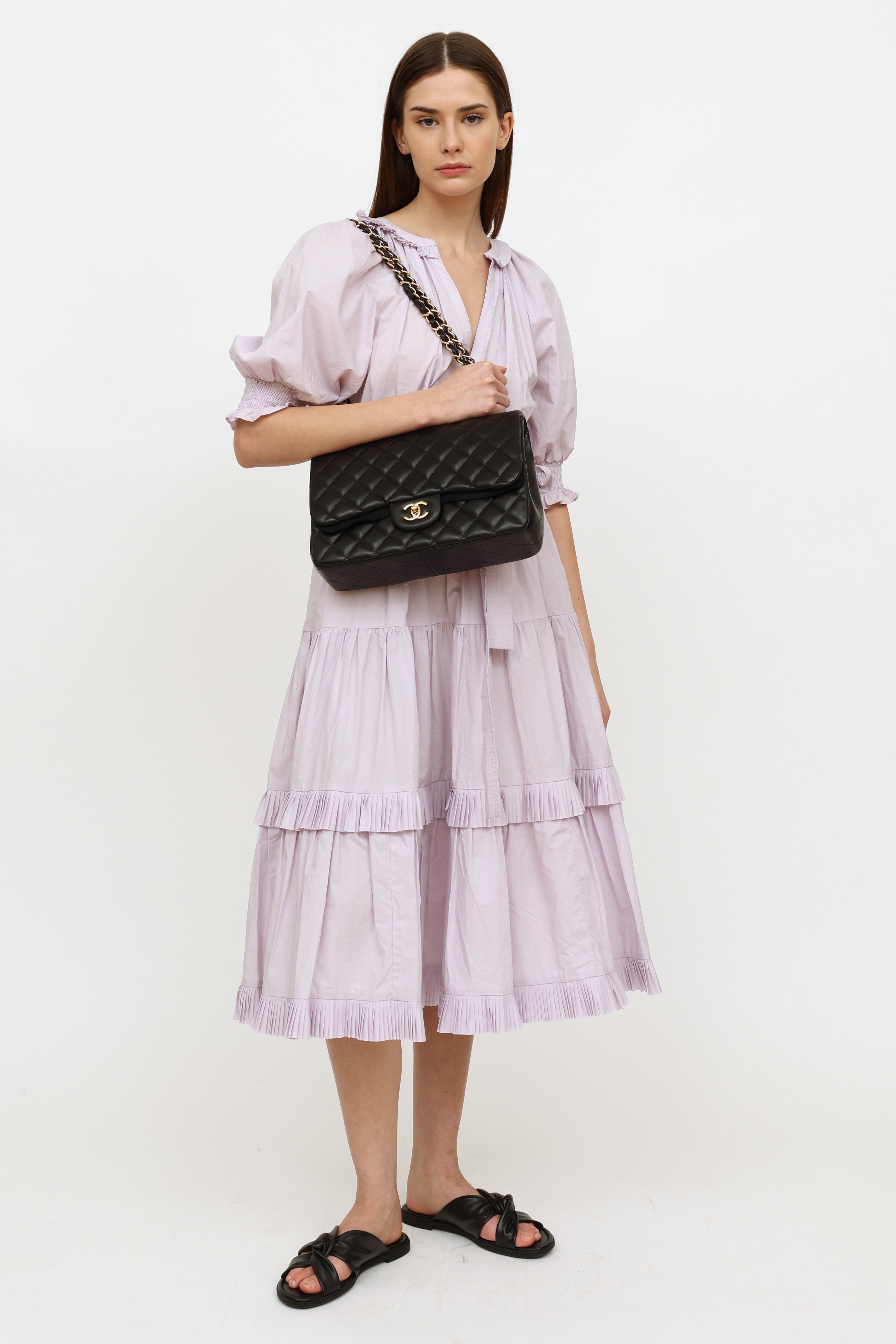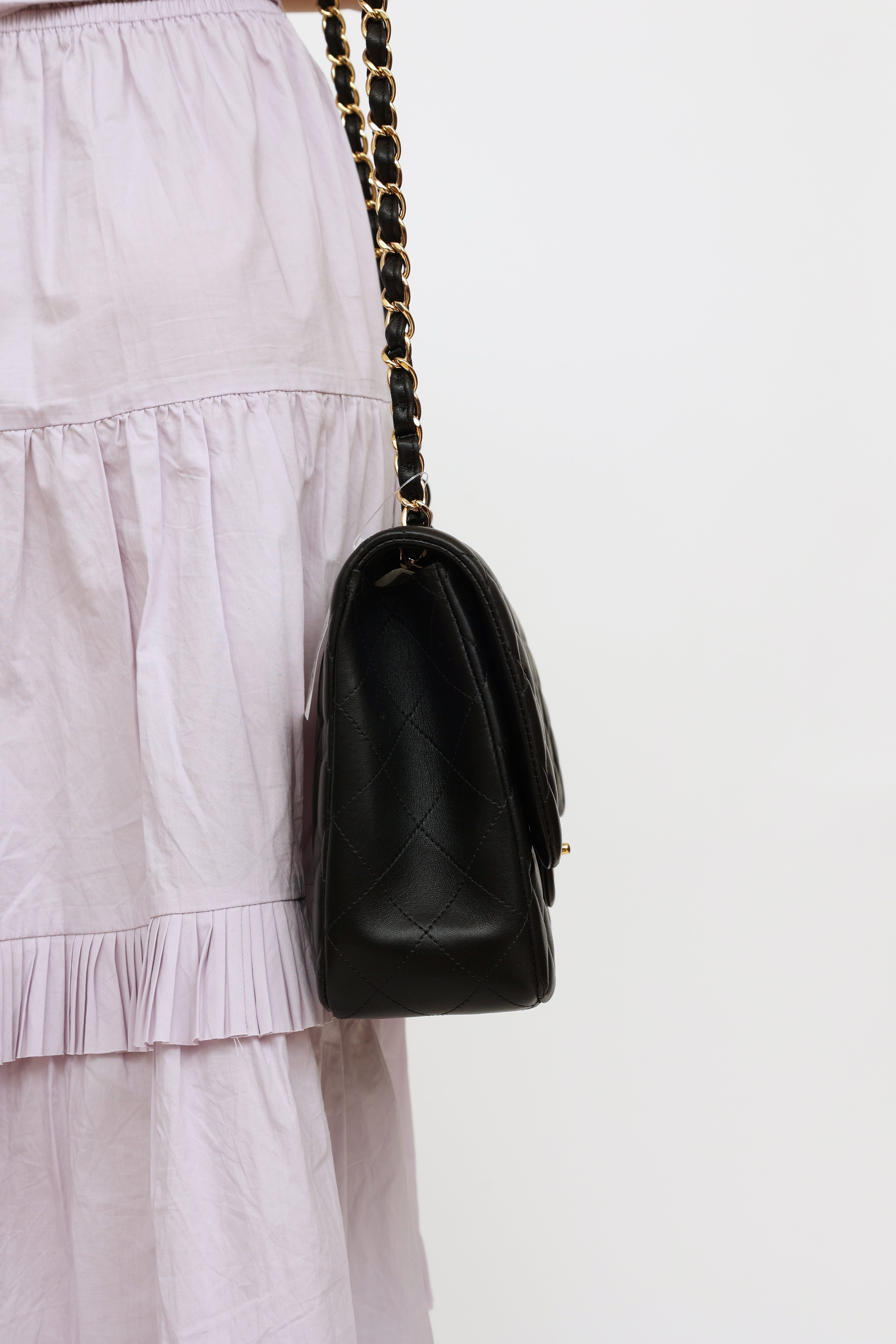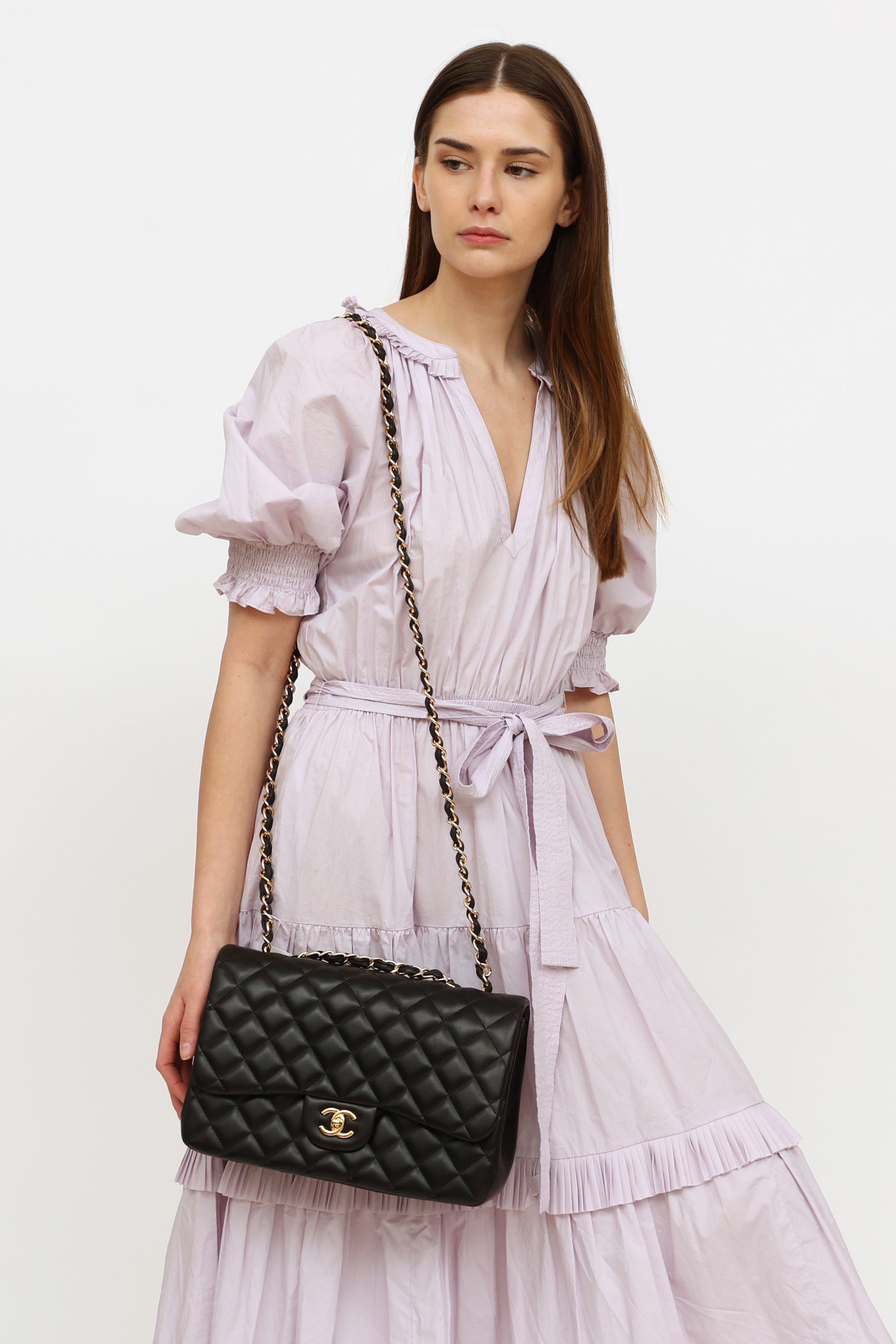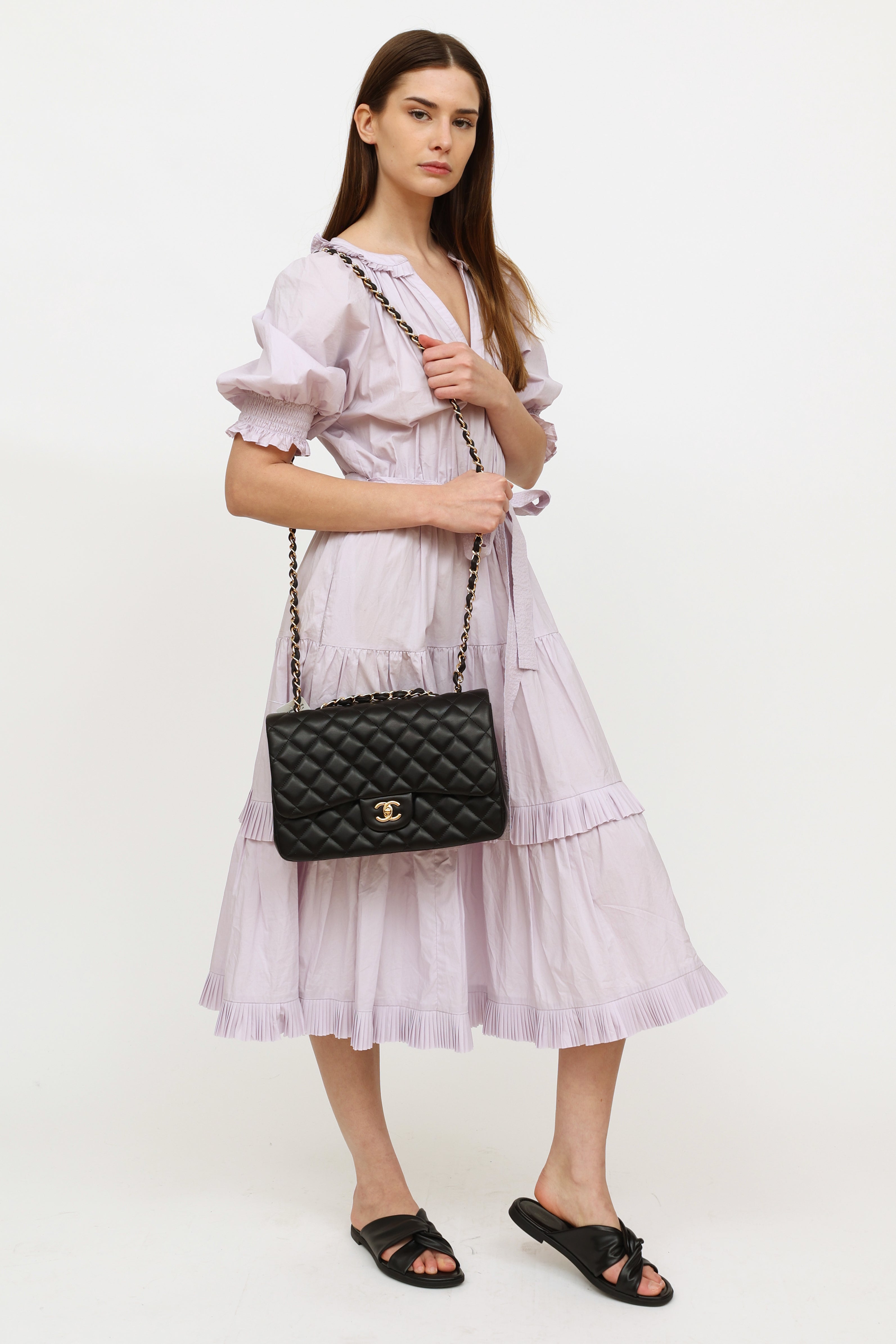 Pre-loved Chanel Classic Quilted Flap Jumbo bag in black lambskin leather featuring gold-tone hardware, interlocking CC logo with turn lock closure at face, one main leather-lined compartment, one zip and slip pocket at interior, one slip pocket at back and two way leather woven chain. Series 13 from 2009.
