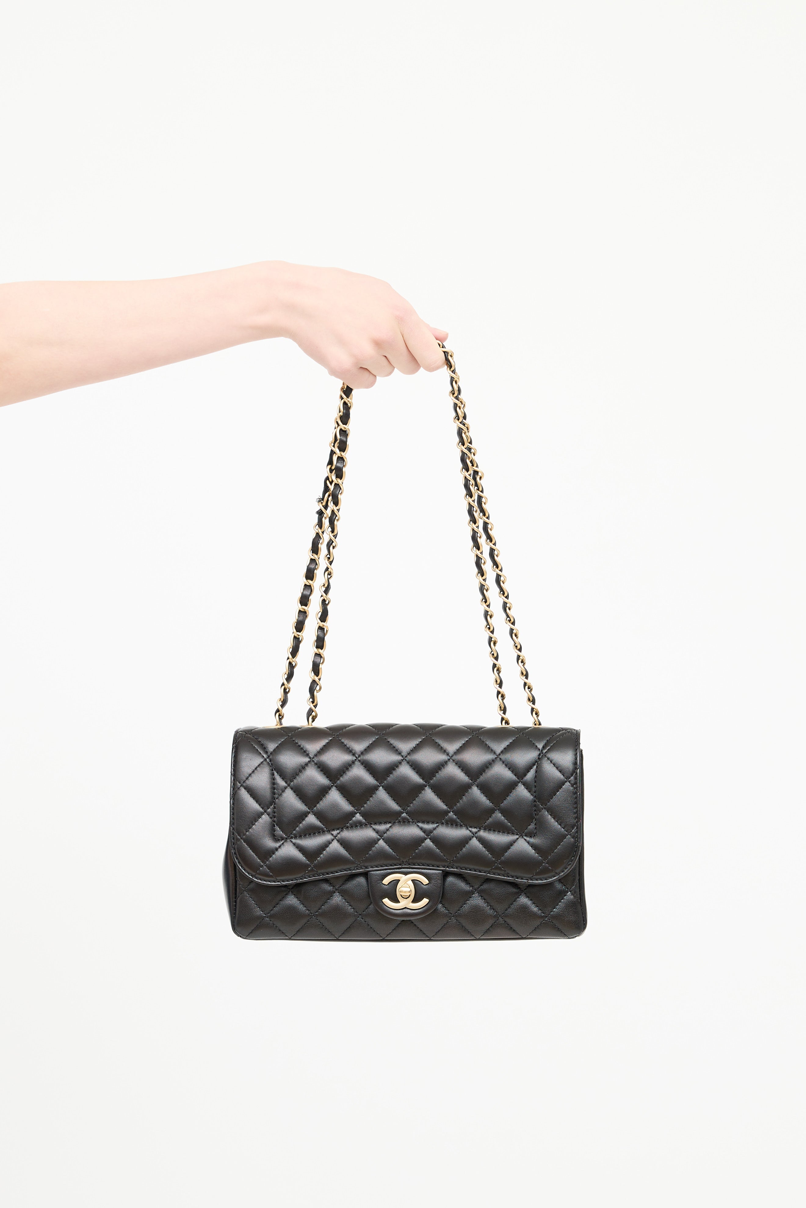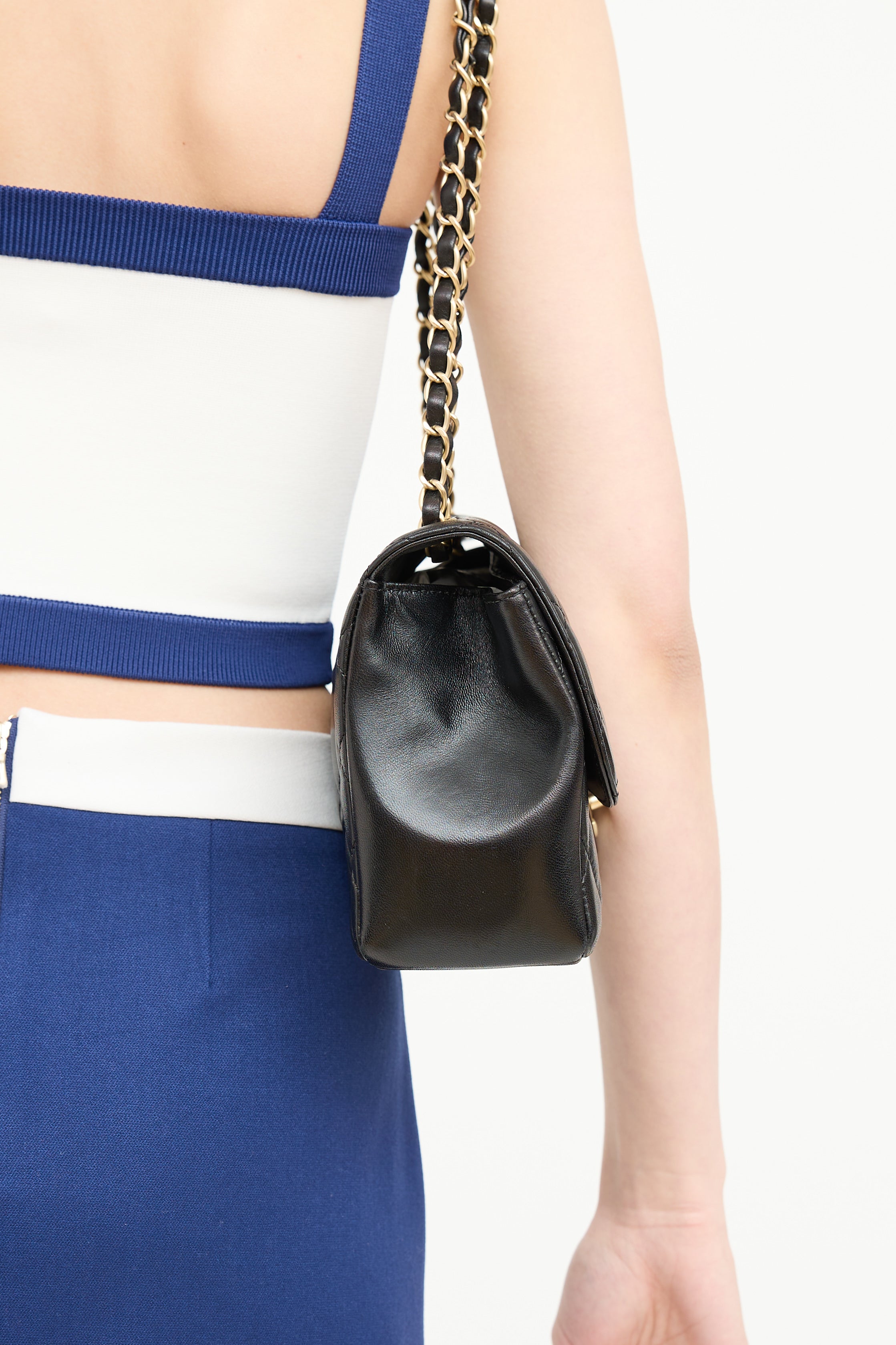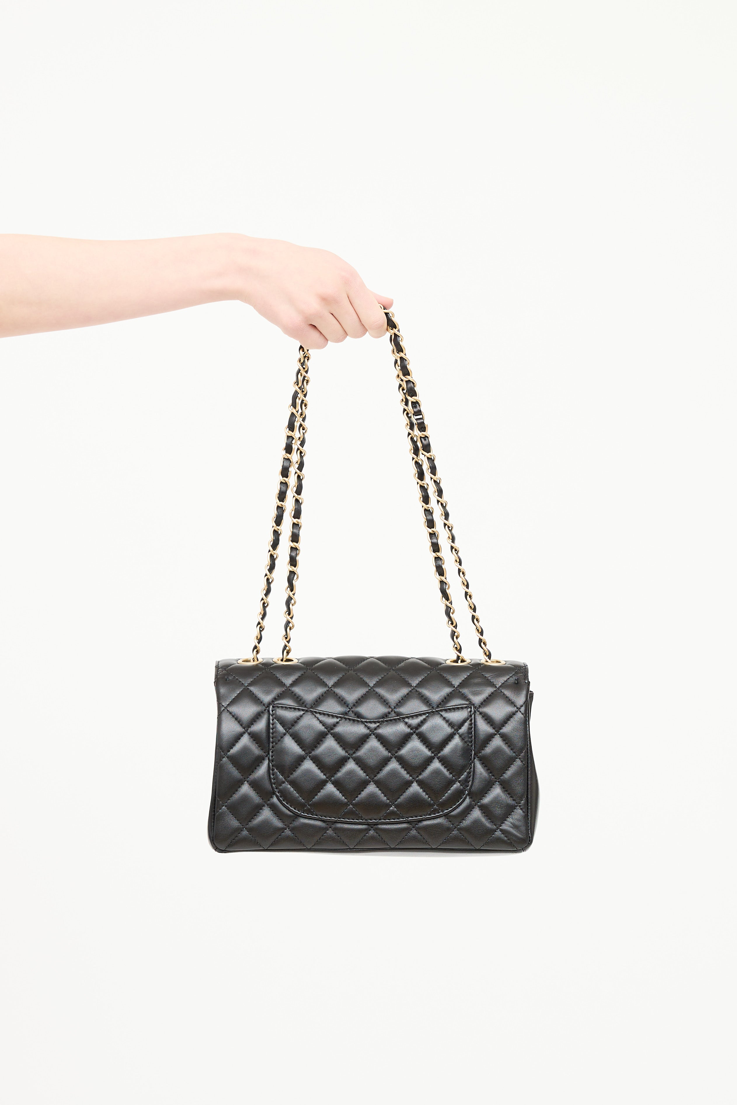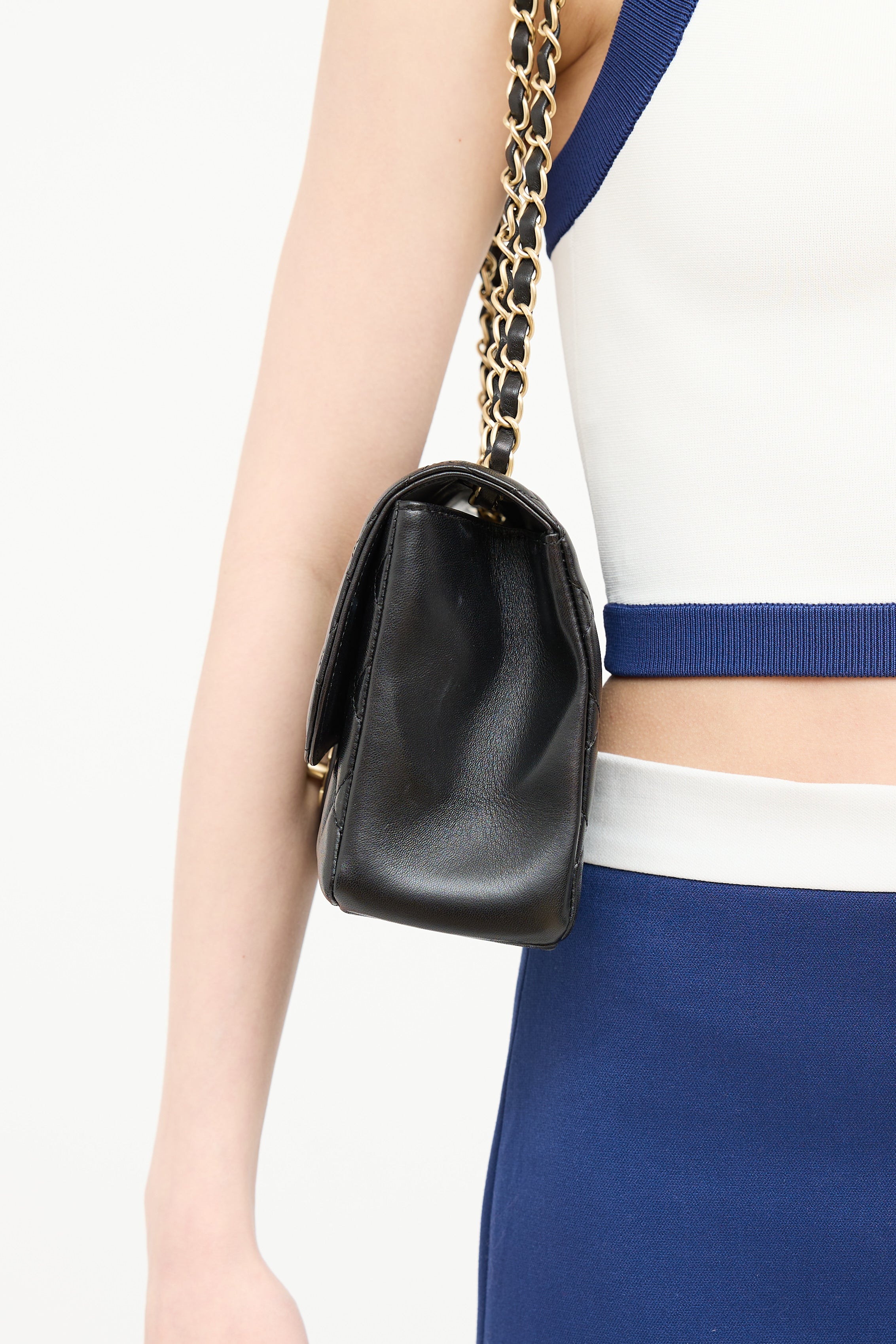 Pre-owned Chanel black 2015 Mademoiselle Chic Flap bag featuring quilted leather with additional flap stitching at front, turn lock closure with interlocking CC logo, braided leather and chain strap, single slip pocket at back and matte gold tone hardware. Interior features one main compartment and one zipped pocket.
