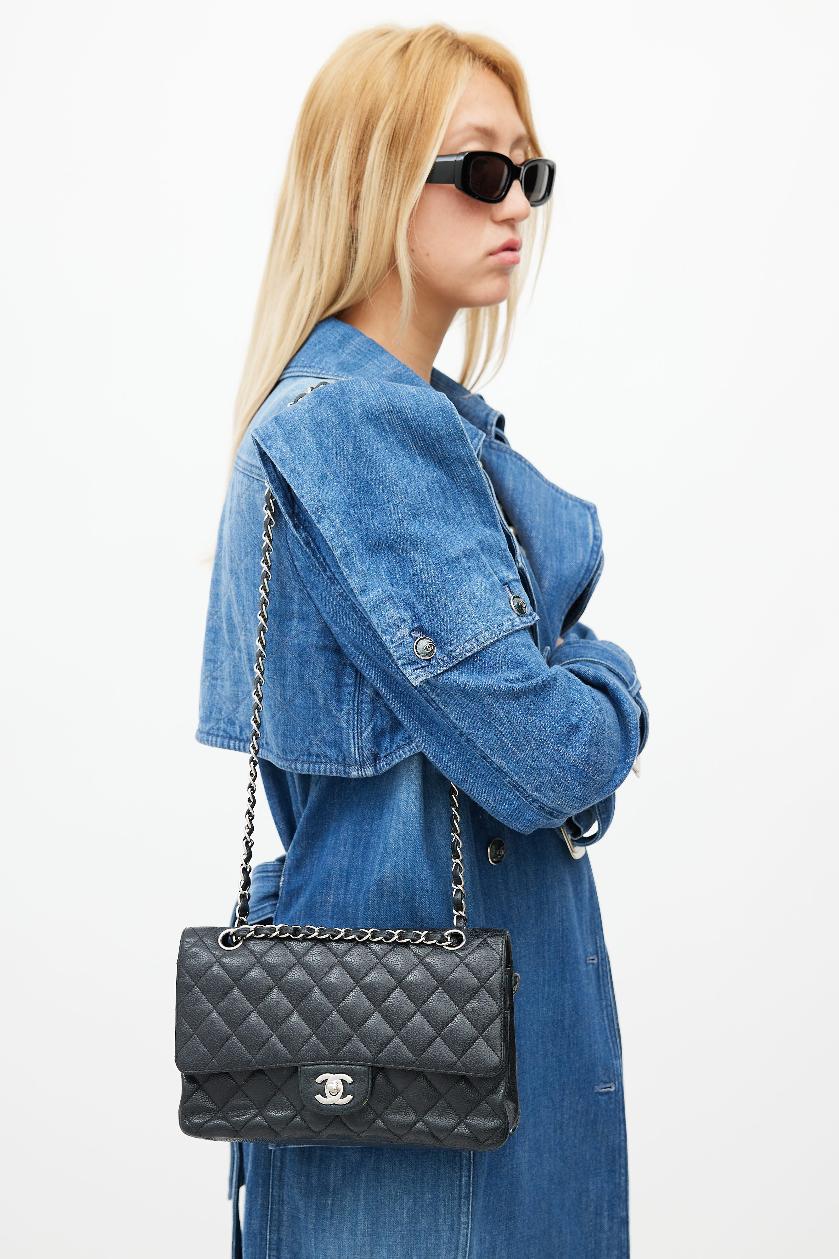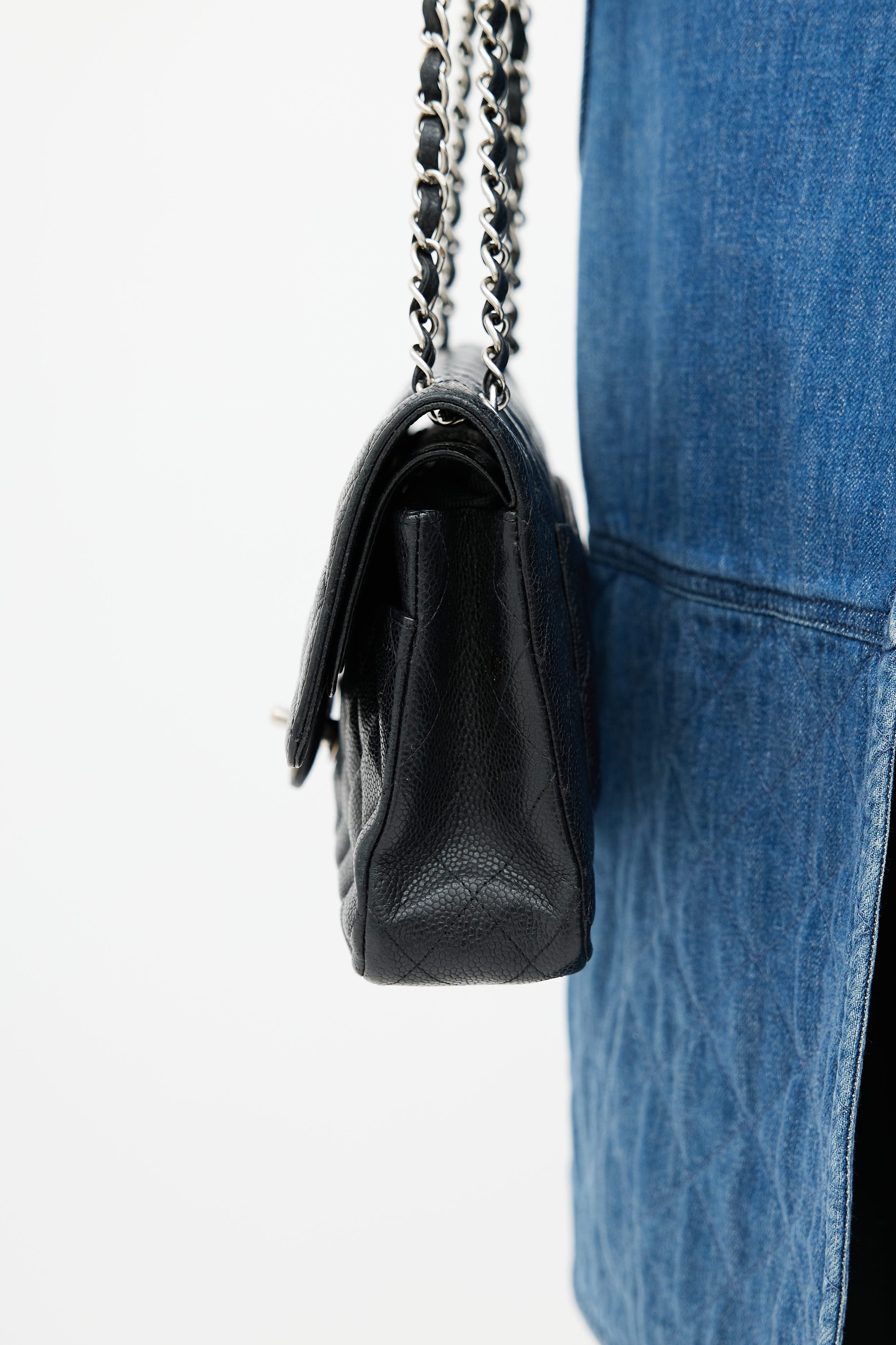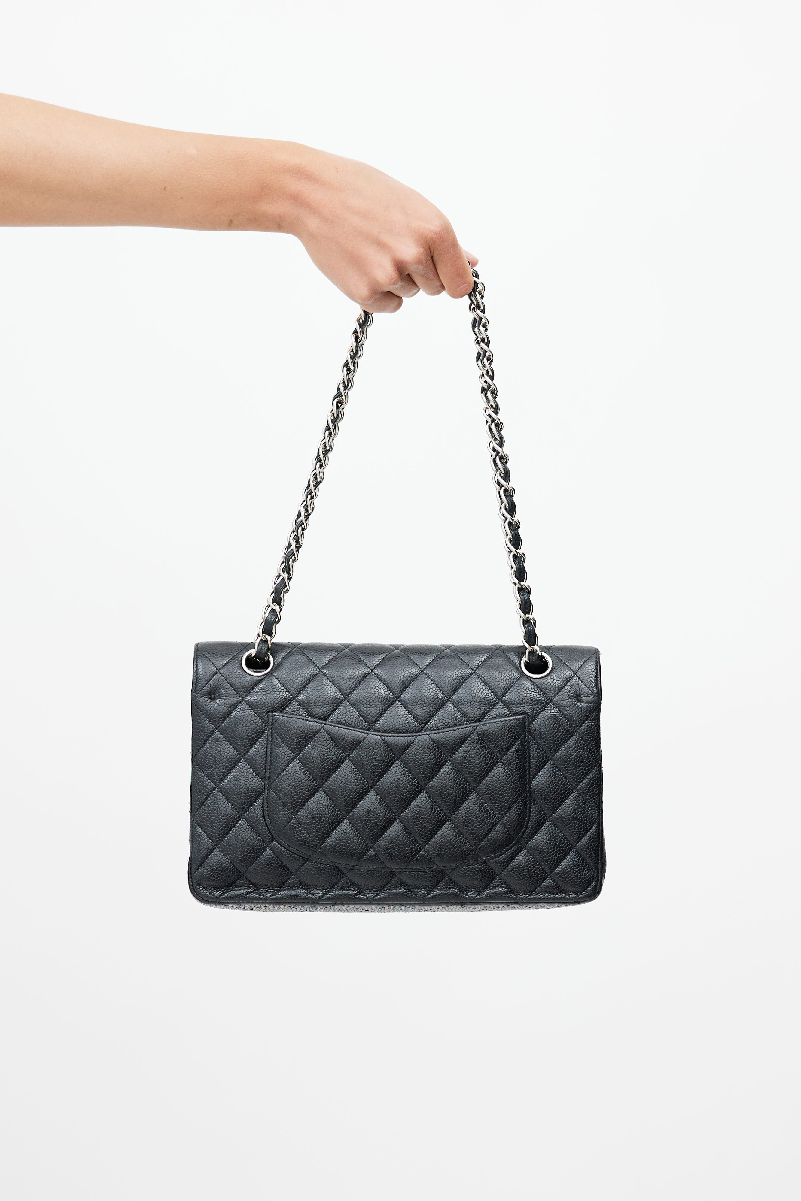 Pre-owned Chanel black classic Double Flap shoulder bag featuring signature quilted Caviar leather, silver tone chain shoulder strap, CC turn lock closure with dual flap, one slip pocket at back, one main compartment with two slip pockets and tonal CC embroidery, and one interior zip pocket at flap. Comes with original dust bag.