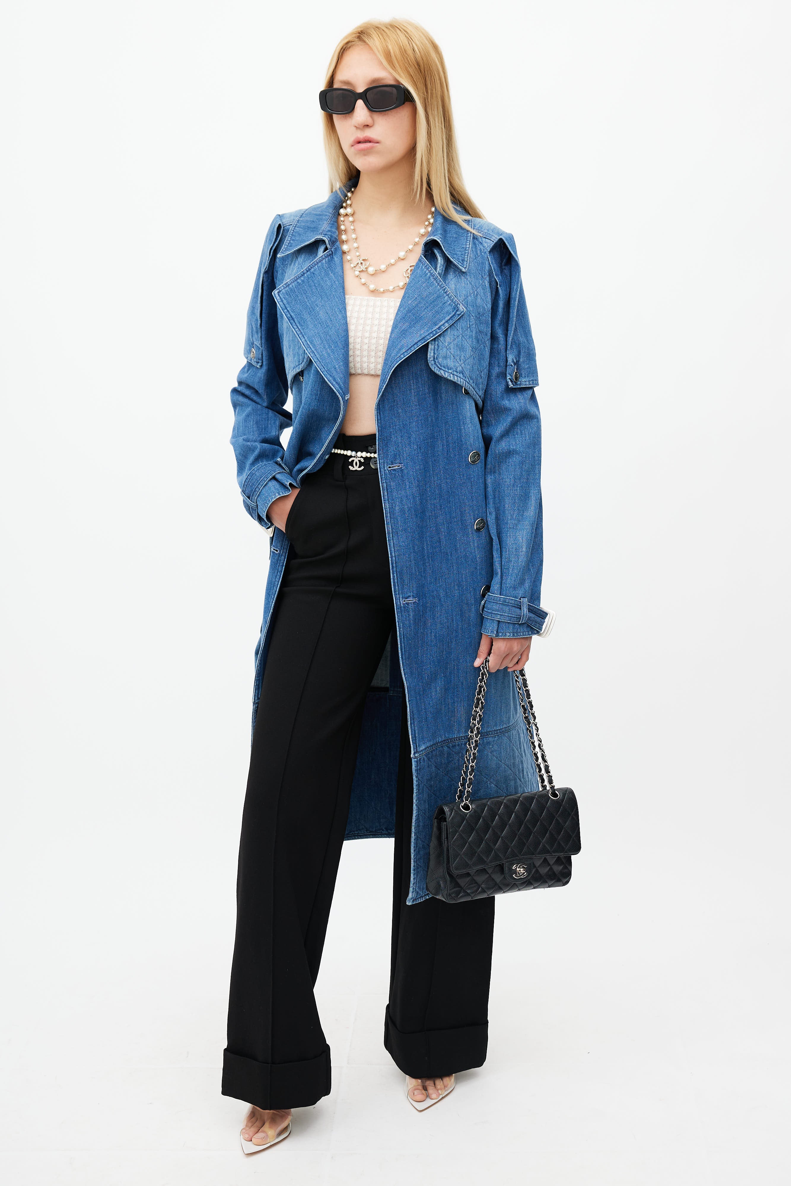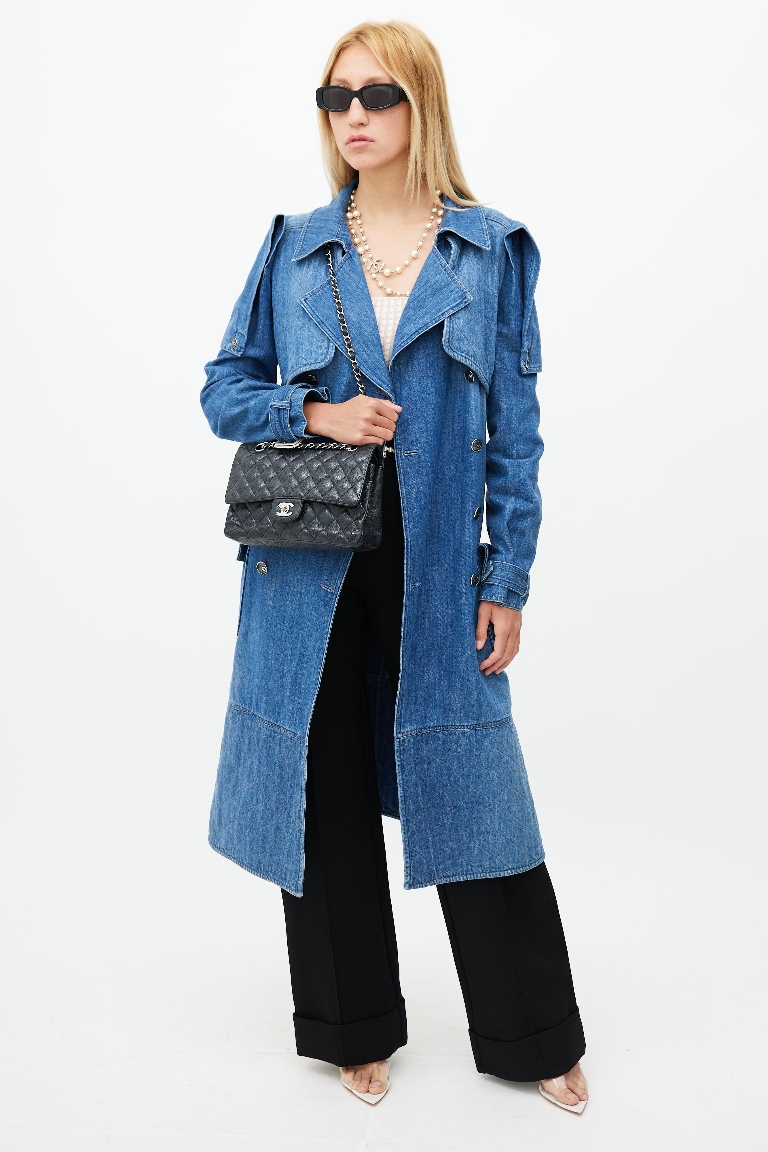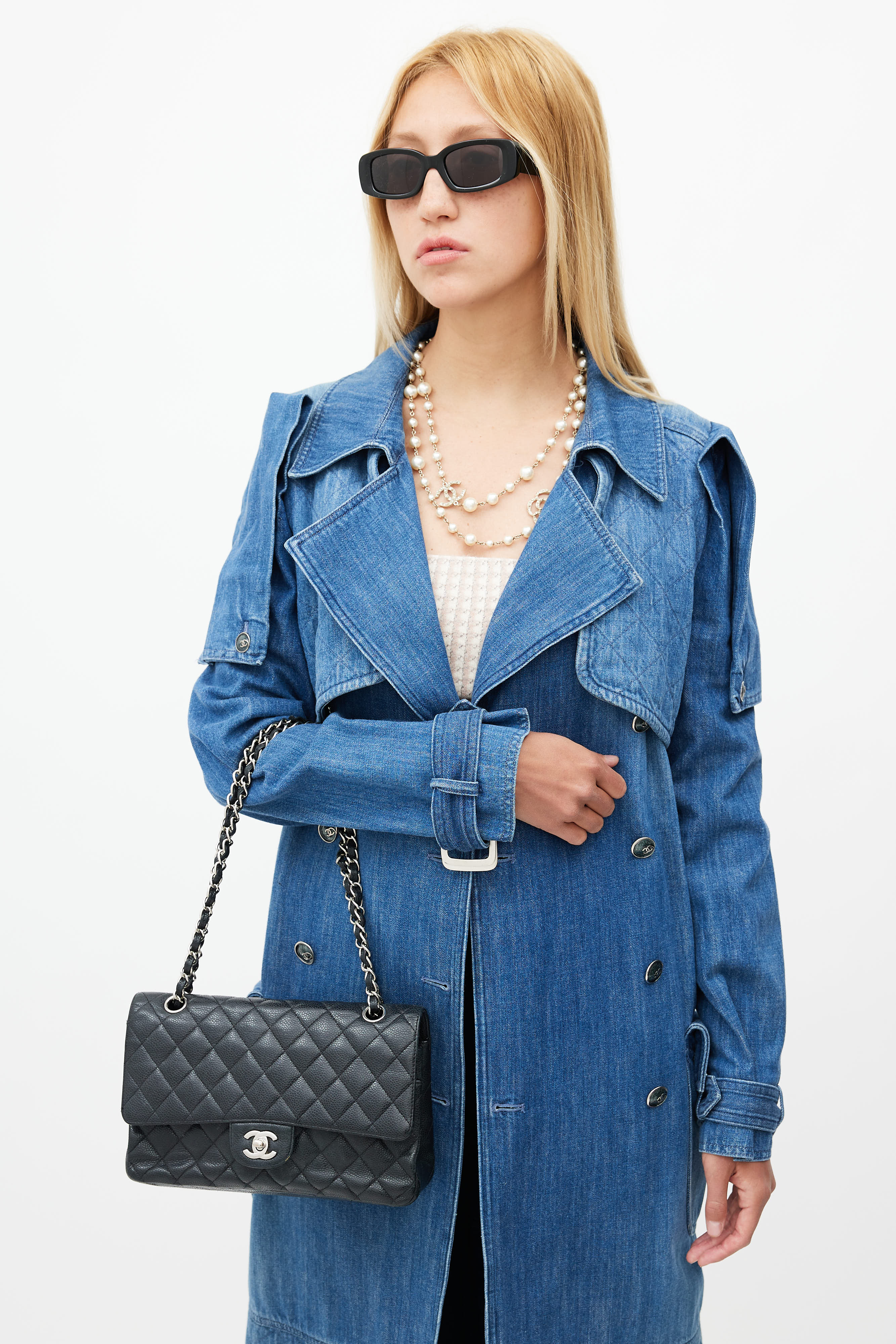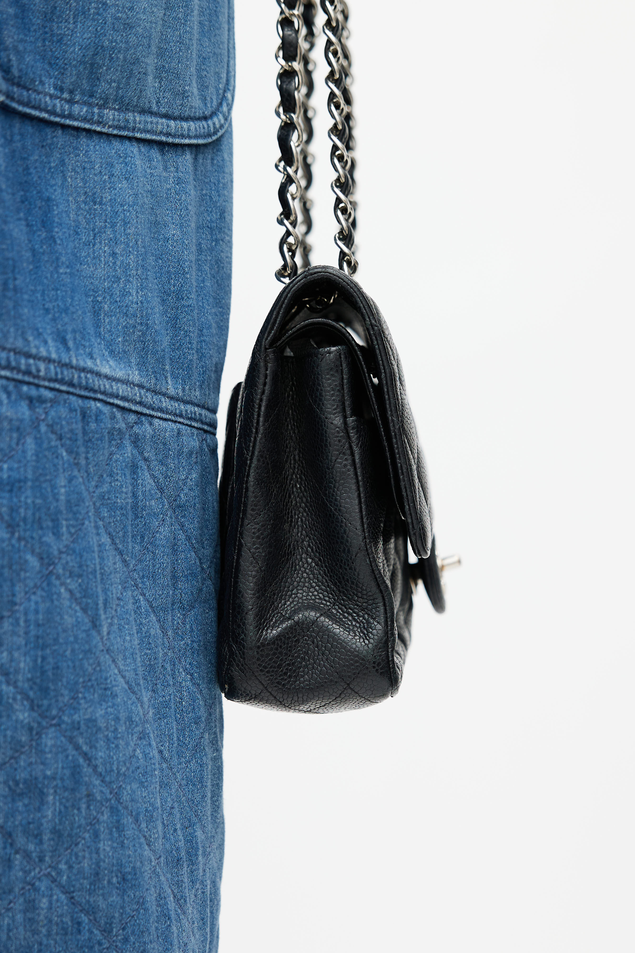 Pre-owned Chanel black classic Double Flap shoulder bag featuring signature quilted Caviar leather, silver tone chain shoulder strap, CC turn lock closure with dual flap, one slip pocket at back, one main compartment with two slip pockets and tonal CC embroidery, and one interior zip pocket at flap. Comes with original dust bag.