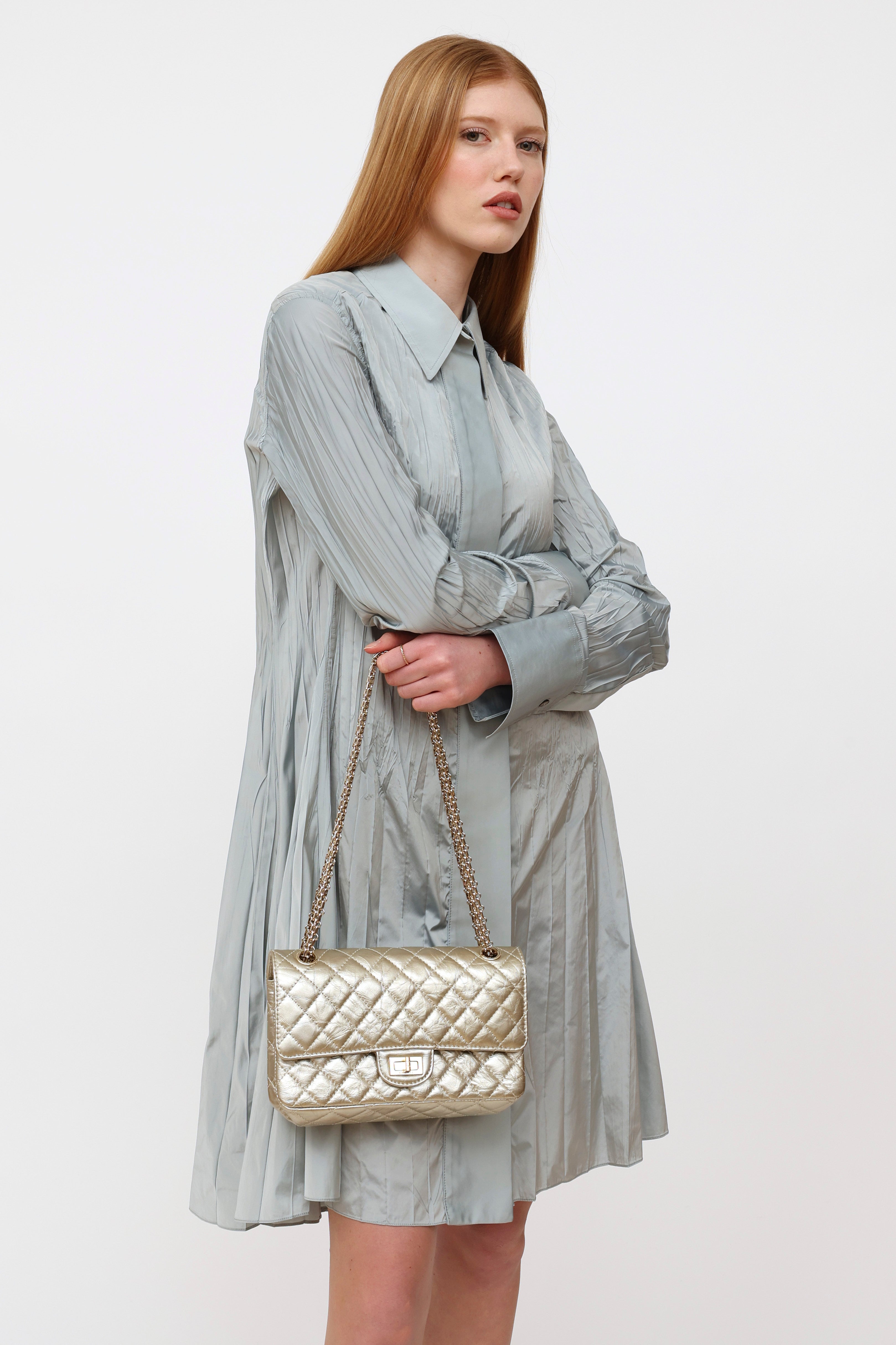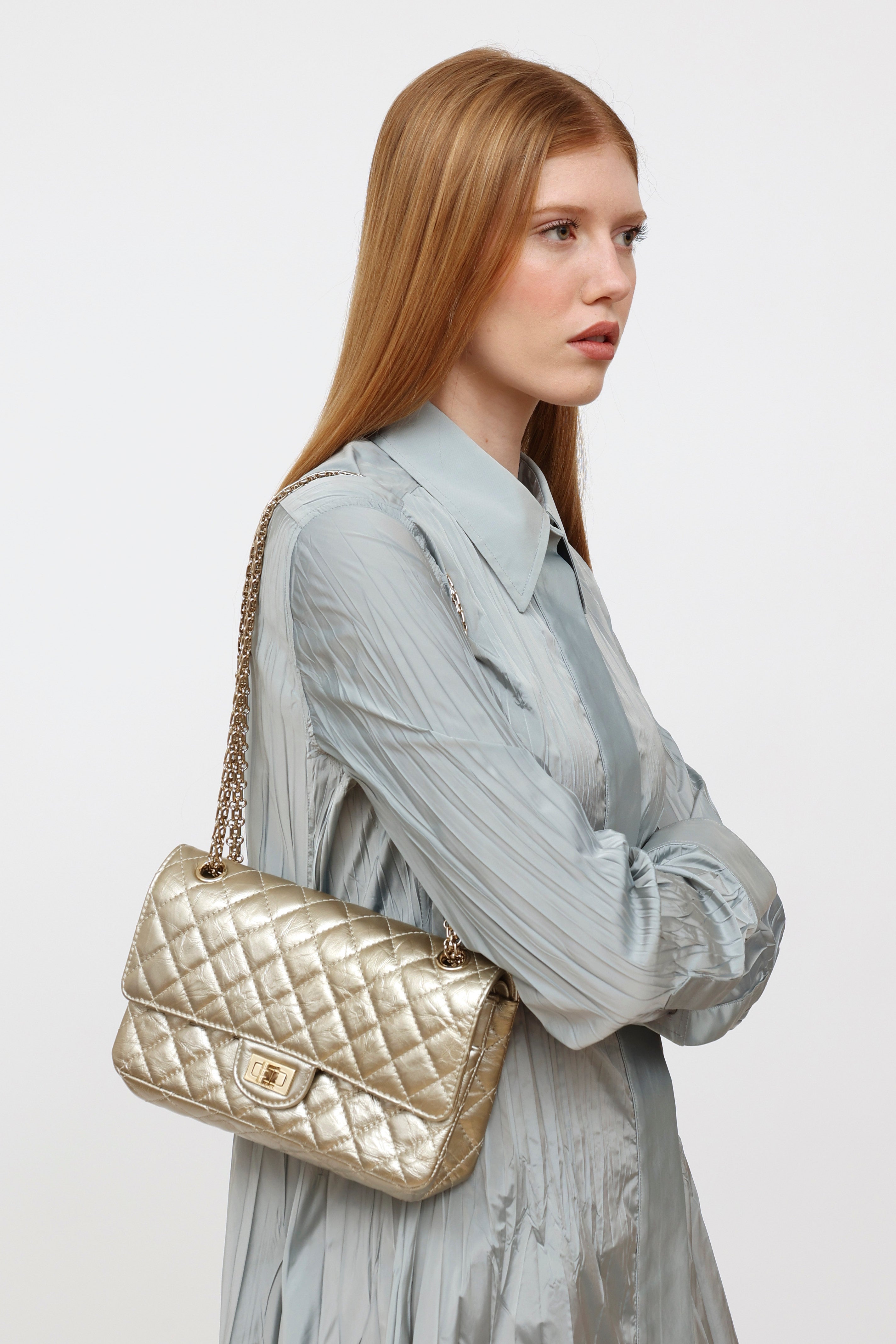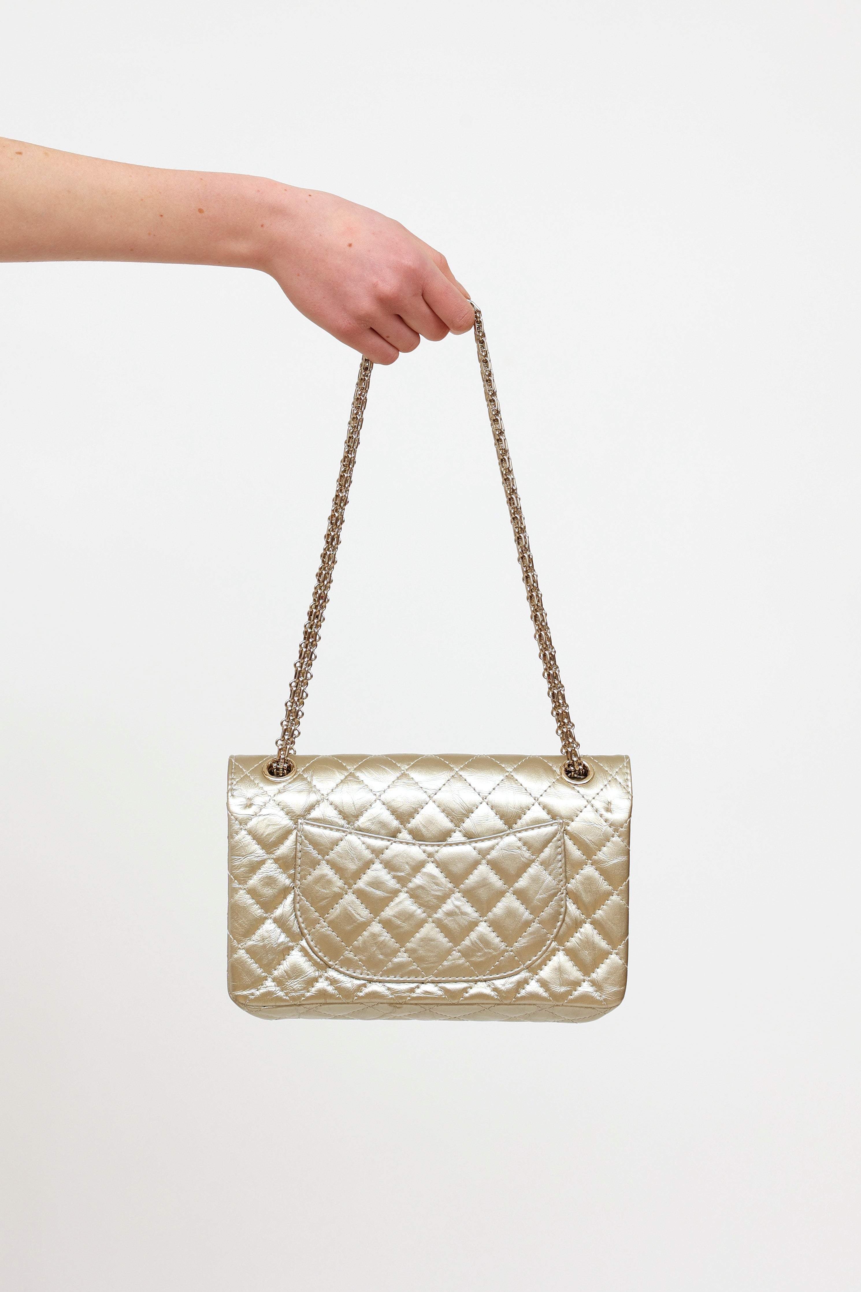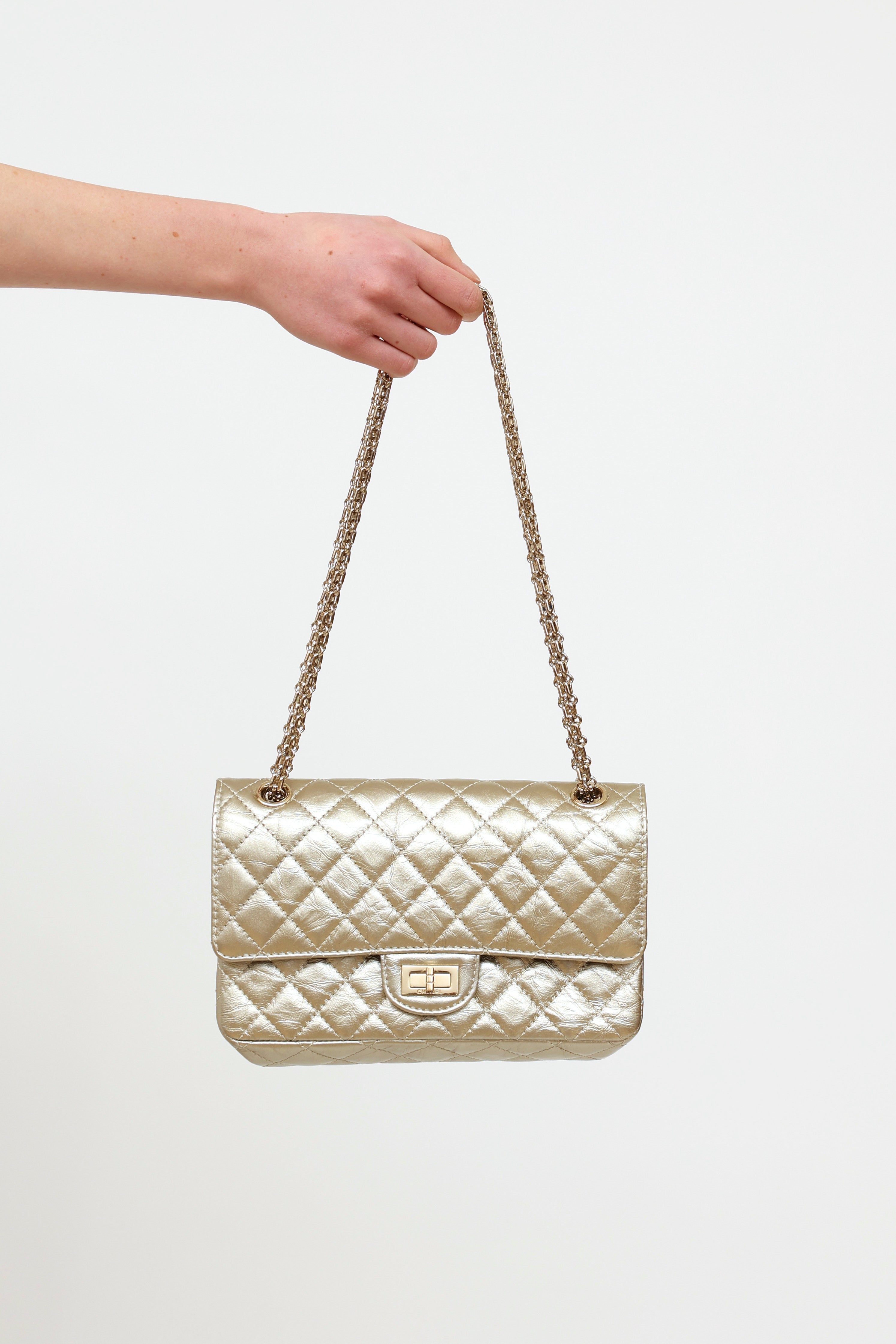 Pre-owned Chanel Quilted Double Flap bag in Gold lambskin leather featuring gold tone hardware, double flap with snap button and turn lock closure, single slip pocket at back and dual chainlink shoulder strap. Interior features one main compartment with two slip pockets and one lipstick pocket, one zipped pocket on inner side of primary flap, one slip pocket under secondary flap and stitched CC logo on inner side of secondary flap.