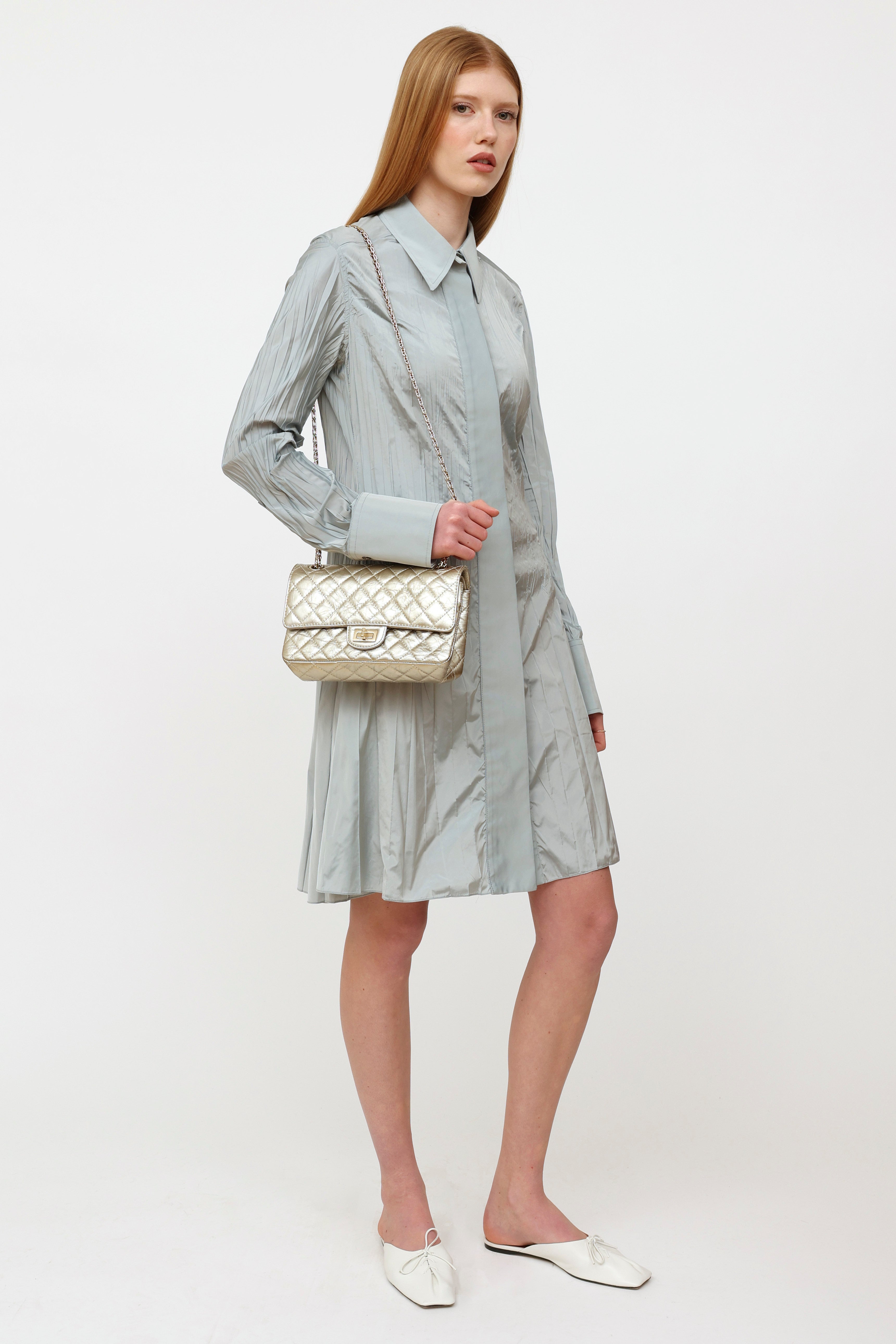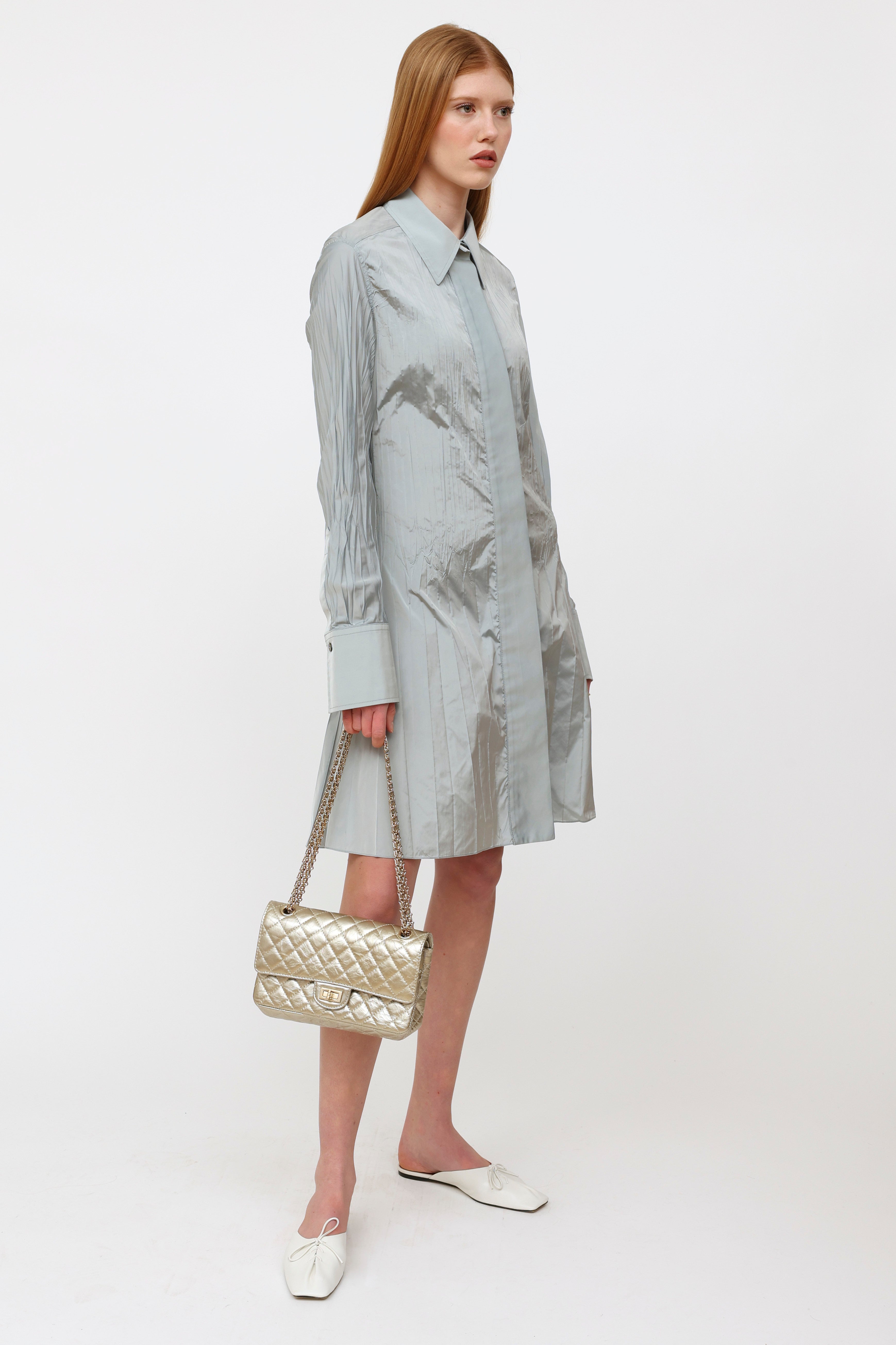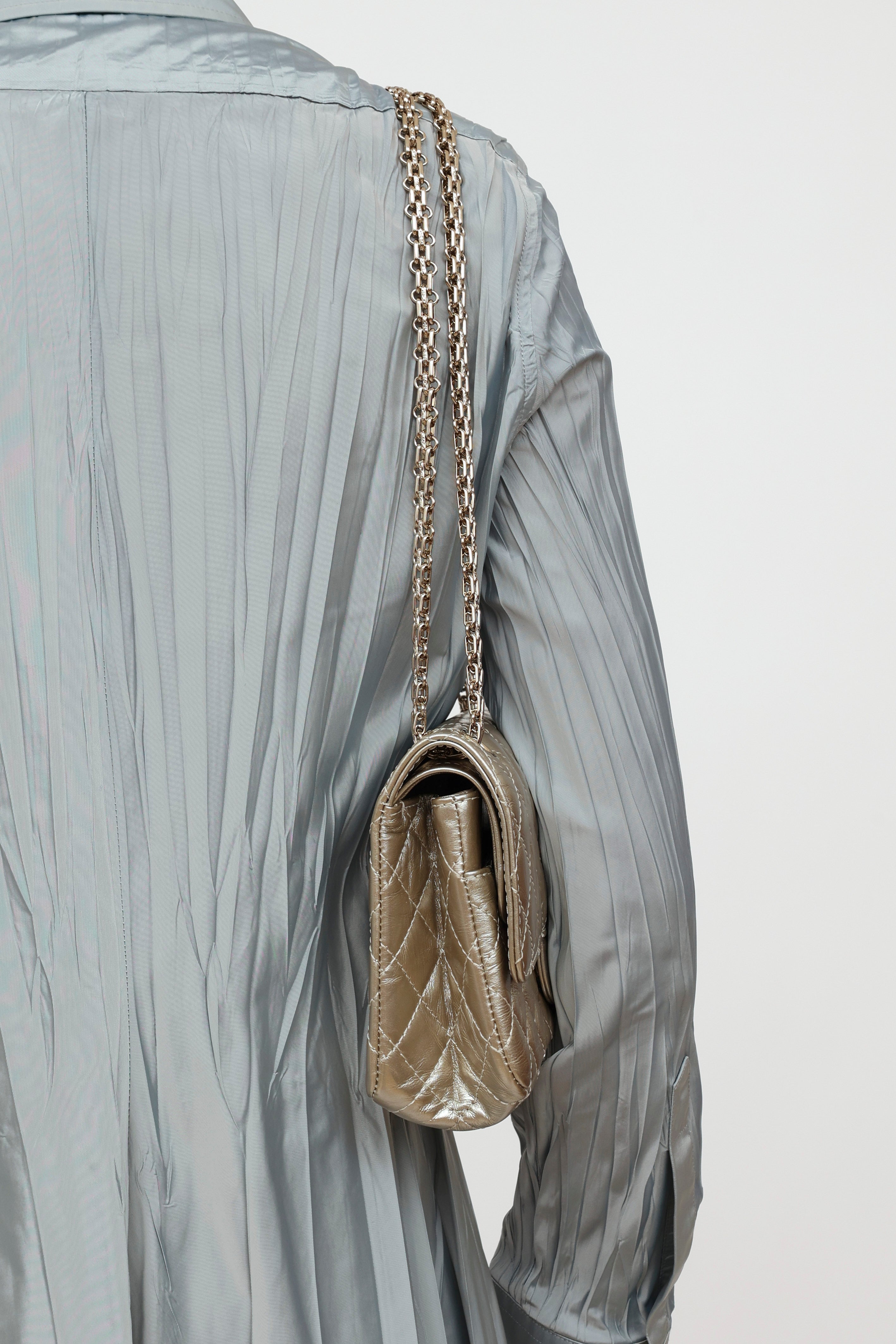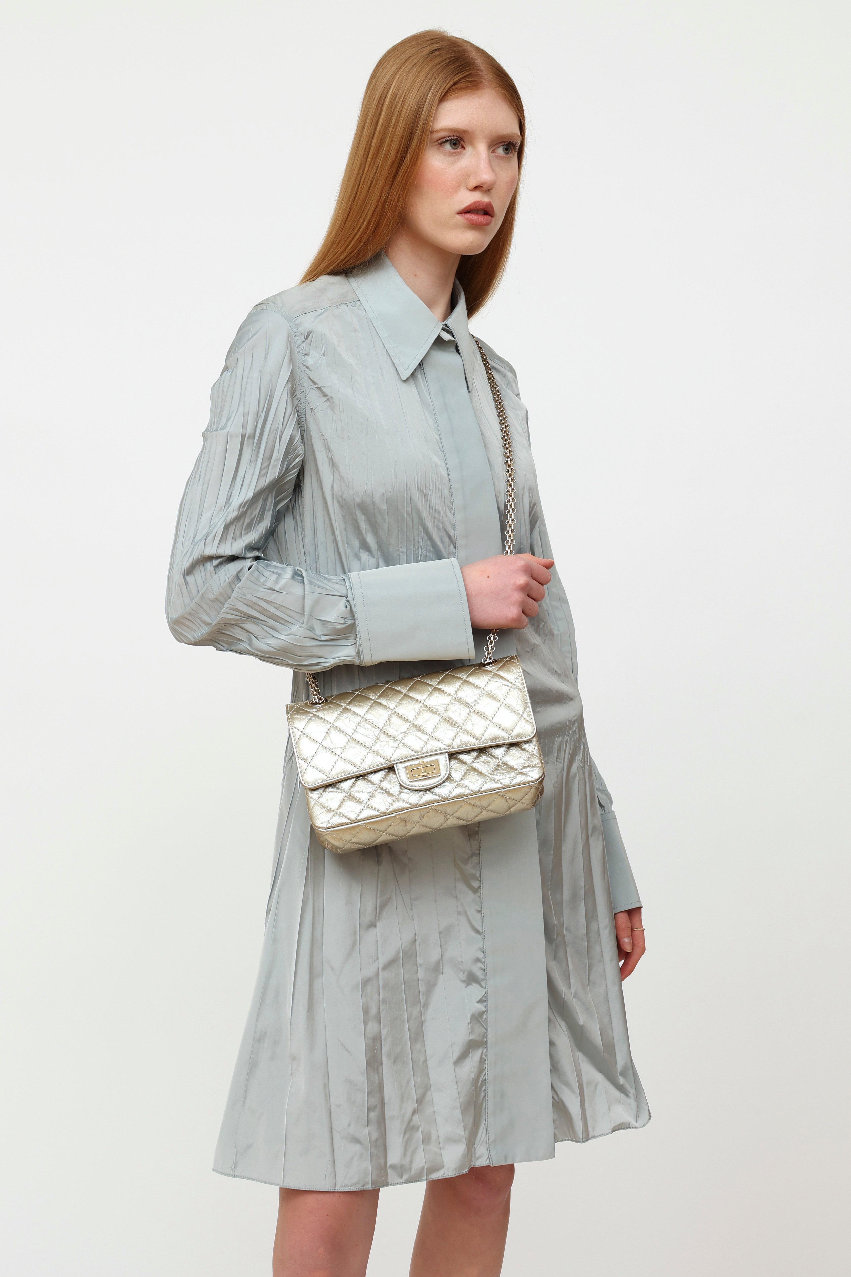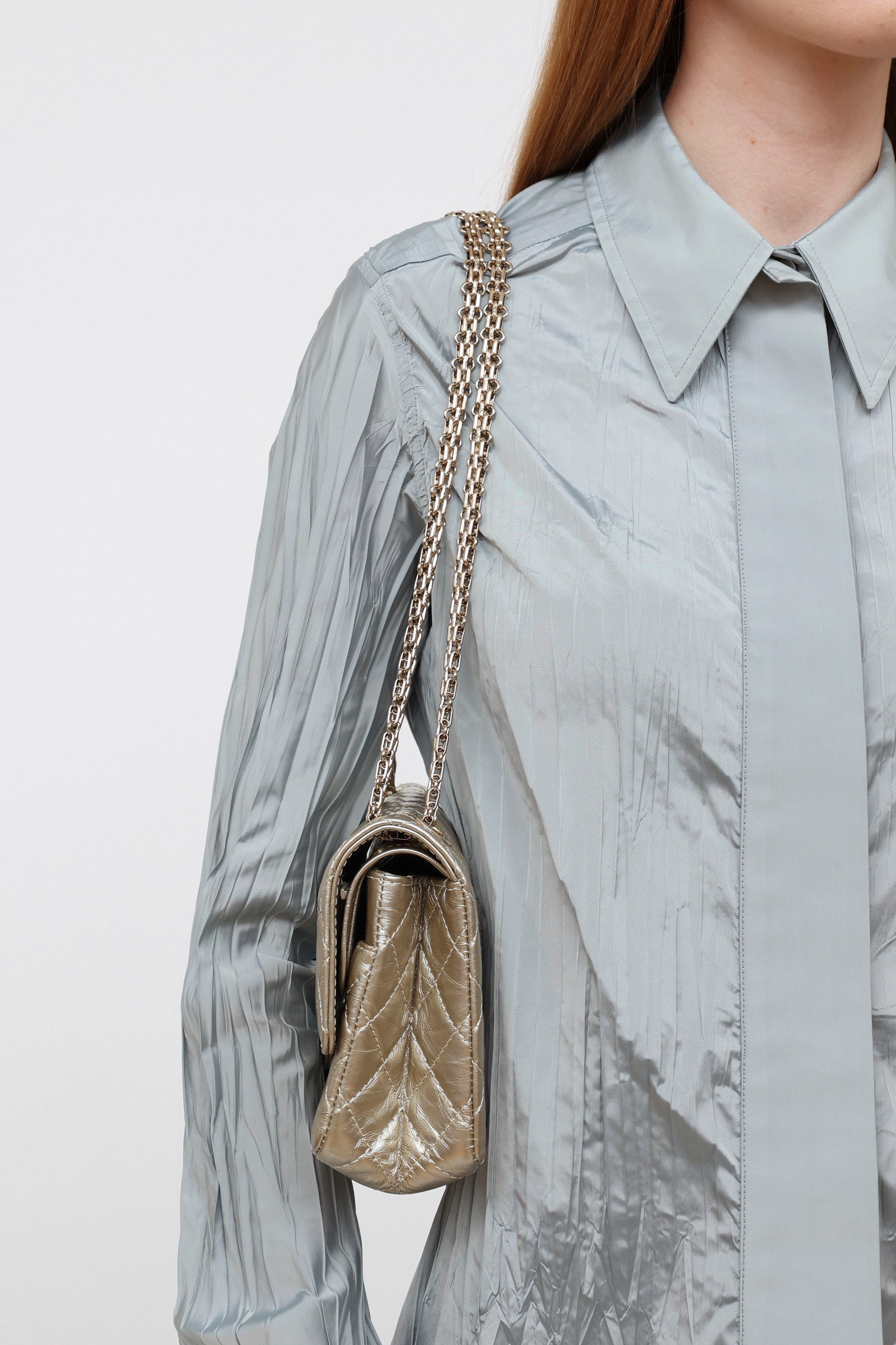 Pre-owned Chanel Quilted Double Flap bag in Gold lambskin leather featuring gold tone hardware, double flap with snap button and turn lock closure, single slip pocket at back and dual chainlink shoulder strap. Interior features one main compartment with two slip pockets and one lipstick pocket, one zipped pocket on inner side of primary flap, one slip pocket under secondary flap and stitched CC logo on inner side of secondary flap.
