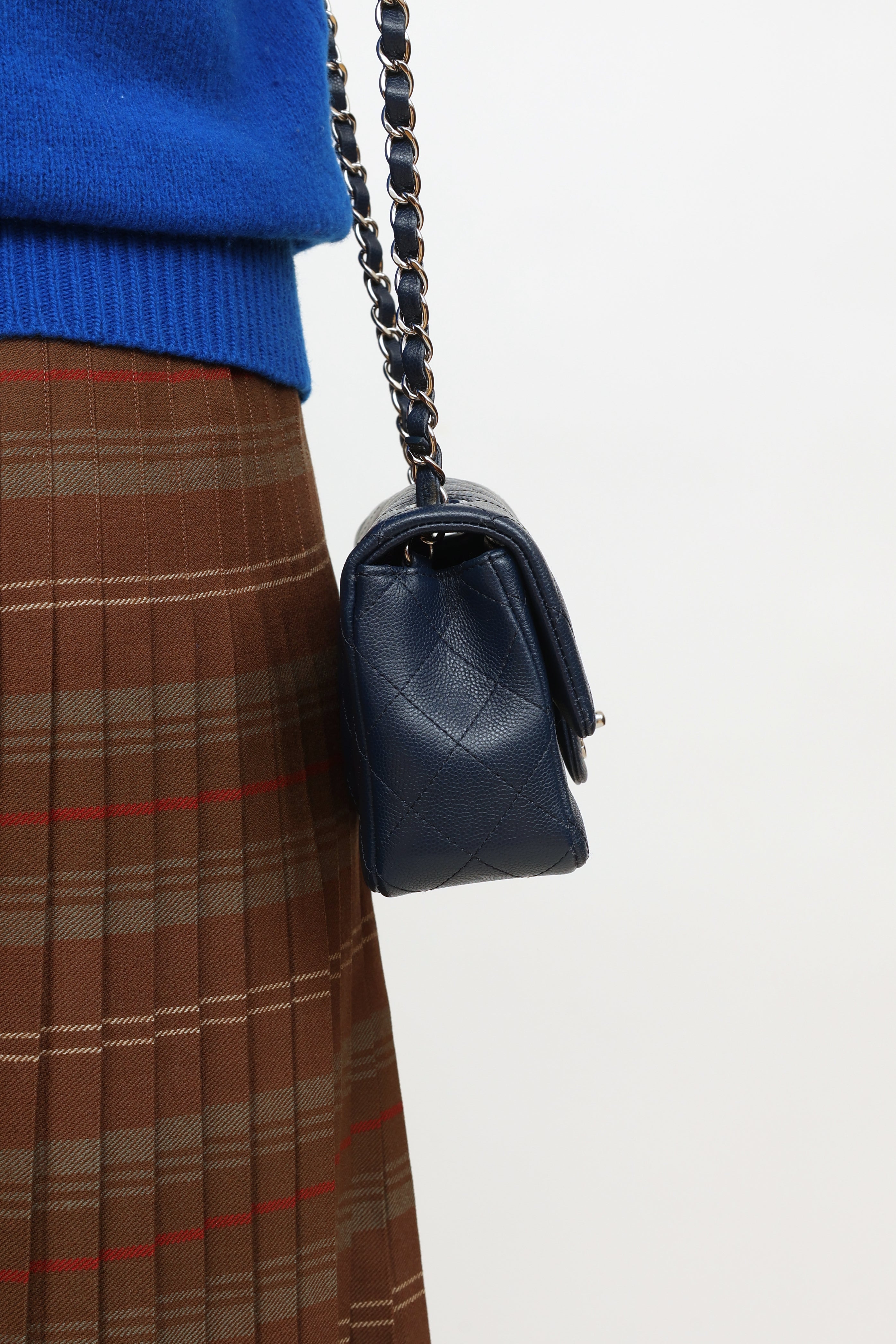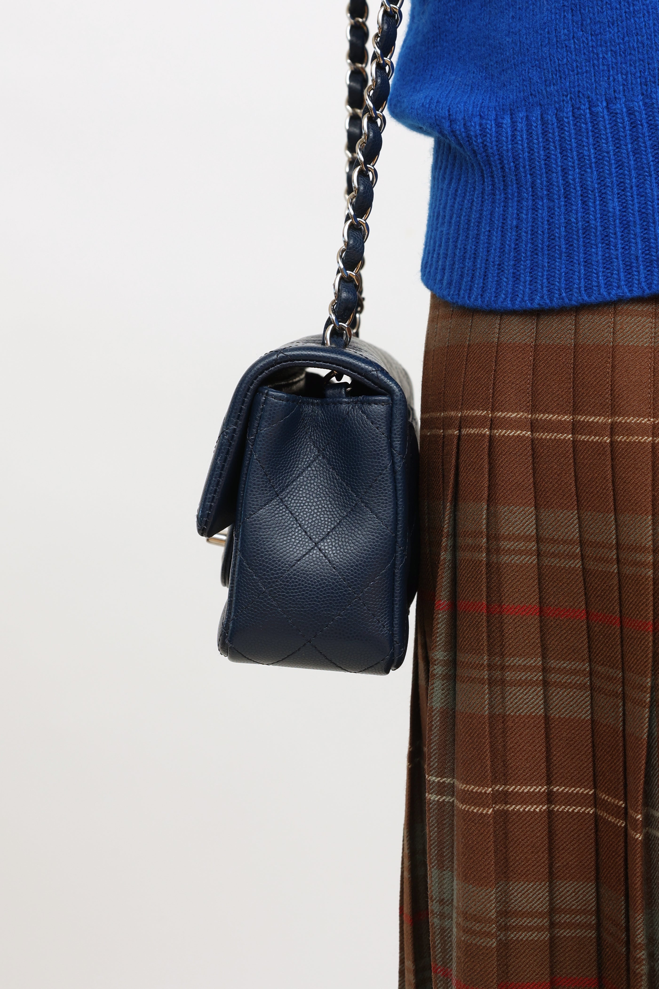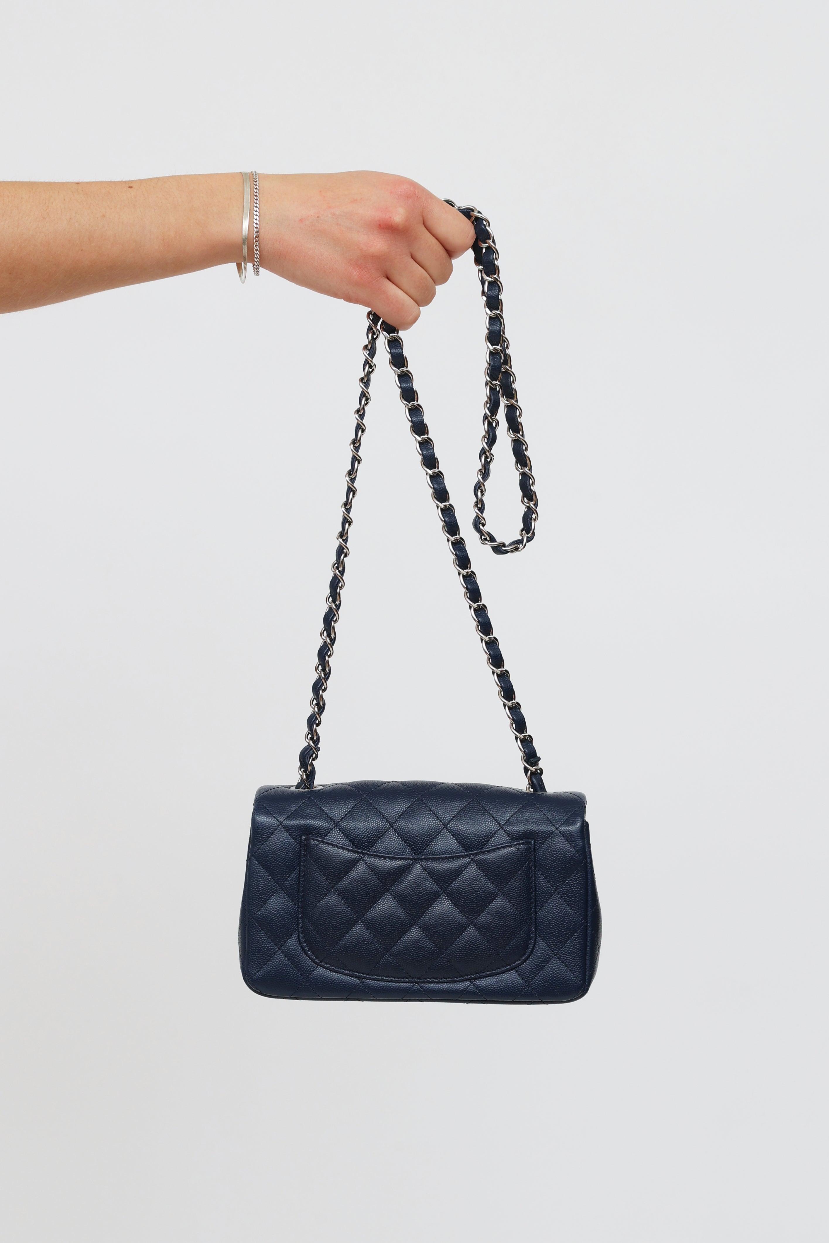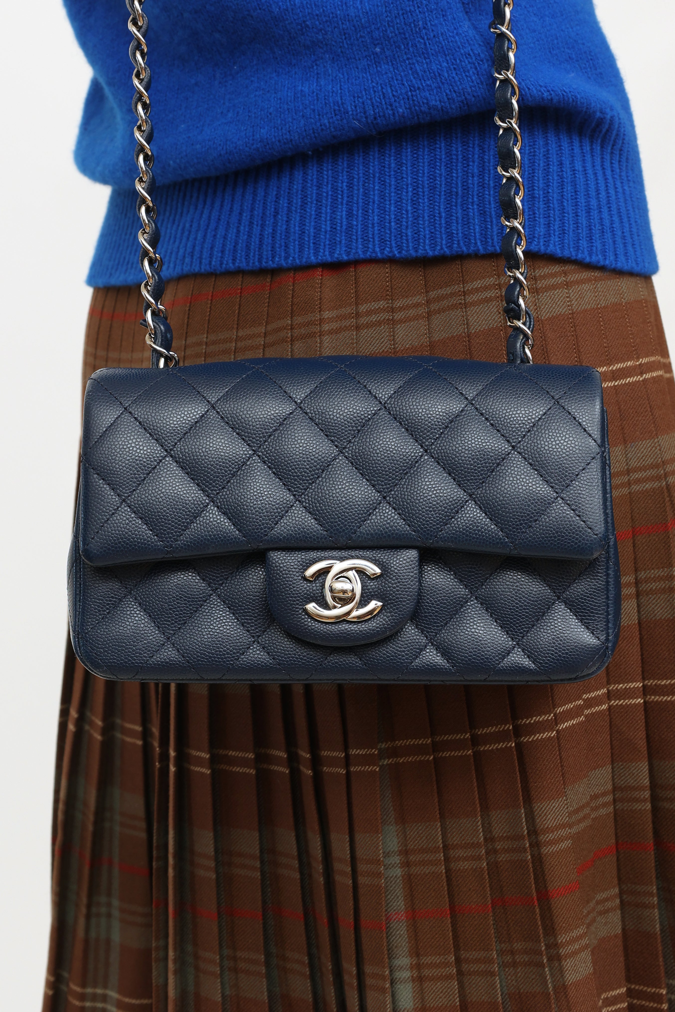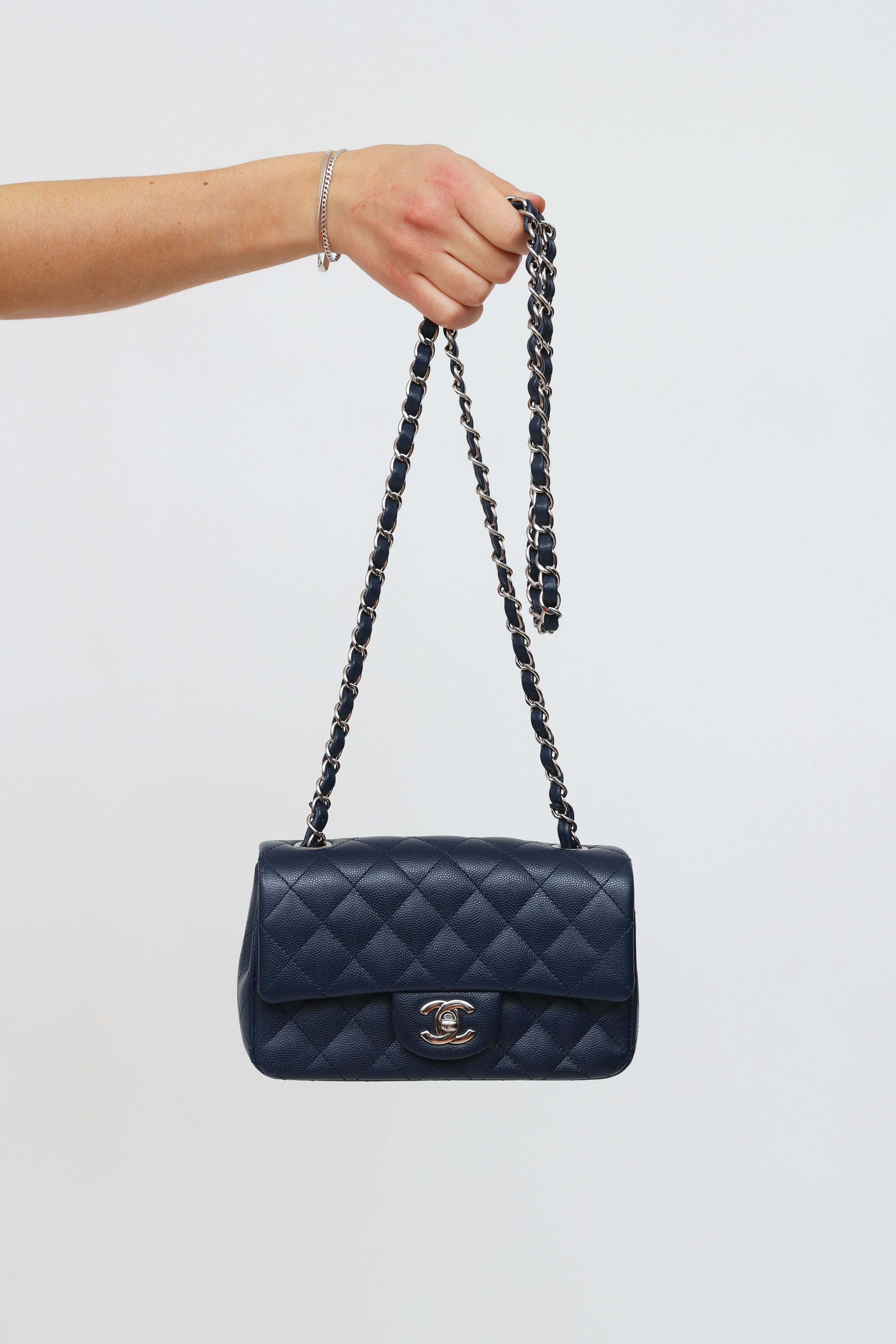 Pre-owned Chanel navy Caviar Classic Flap bag in signature quilted leather featuring sliding woven leather strap with silver-tone hardware. Classic foldover strap with CC logo twist lock at front. Mona Lisa pocket at back. Interior features one zip pocket and one flap pocket with printed logo. Size 17B, year 2017.