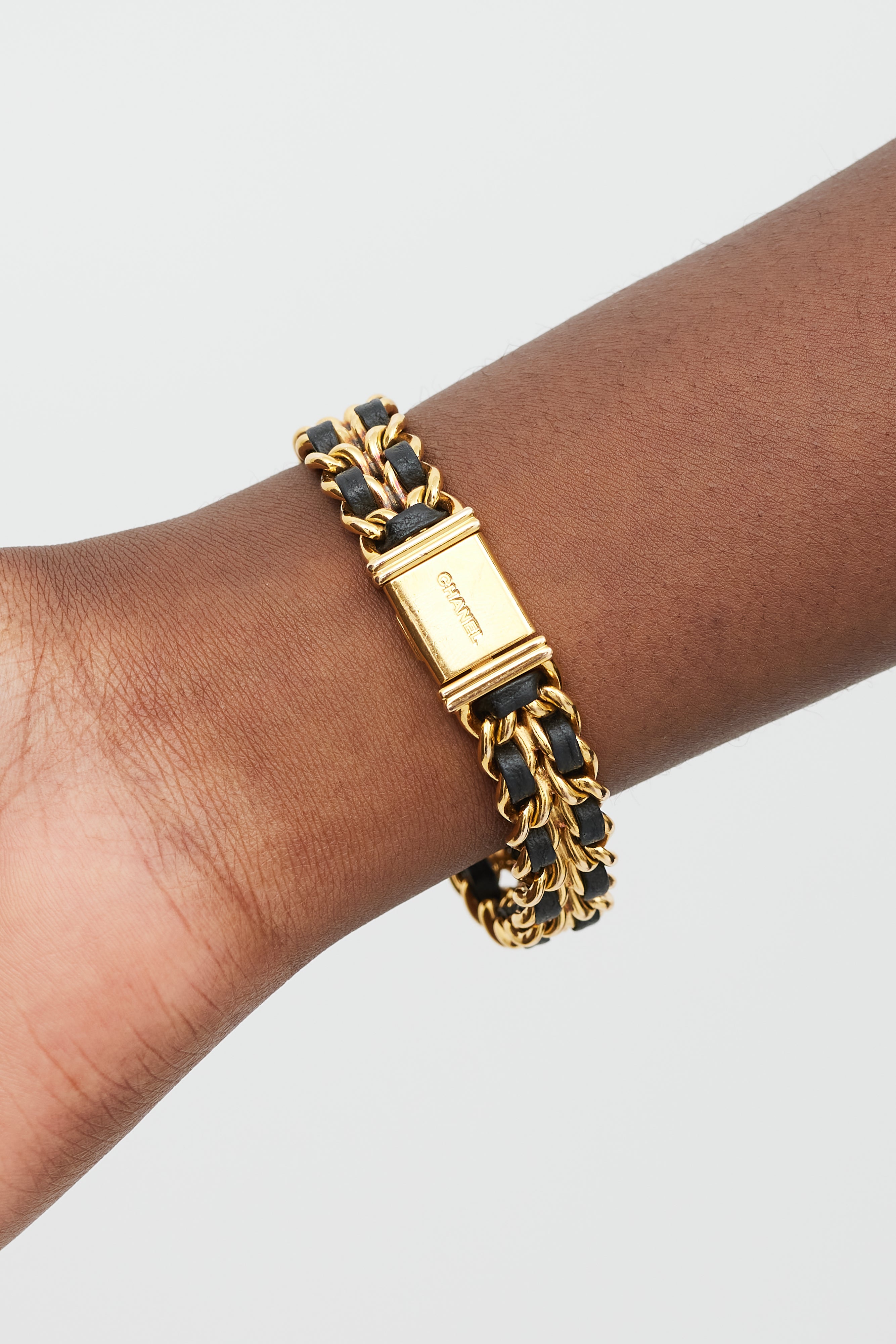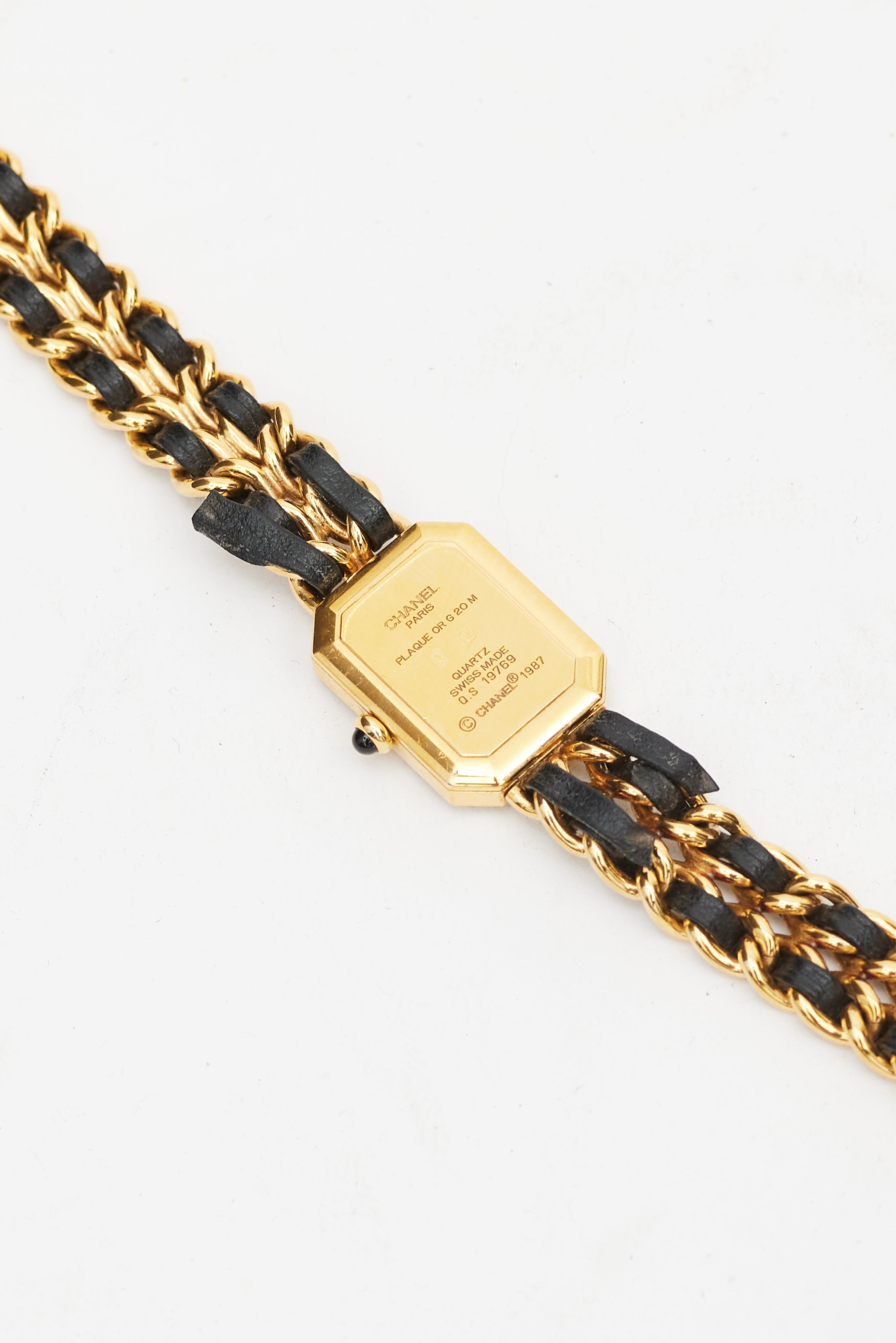 Pre-owned Chanel 1987 Premiere Iconic Chain watch in 18K plated yellow gold featuring a square face, smooth bezel, quartz movement, black dial, engraved logo at interior, black leather woven chain link band, and peg-in-hole clasp closure.