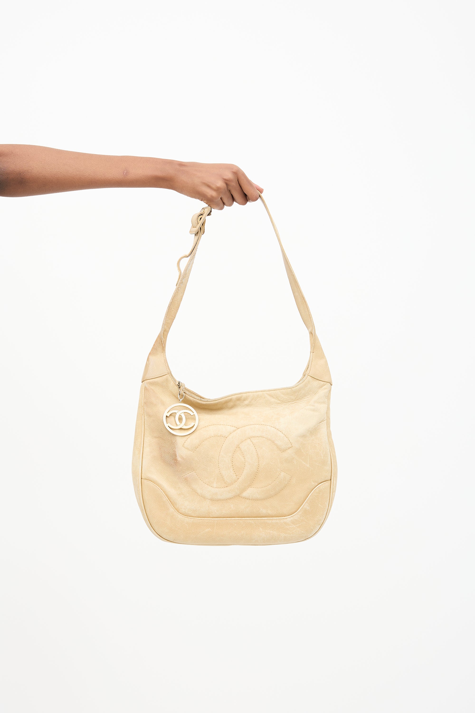 Pre-owned Chanel 1989-1991 beige caviar leather Timeless shoulder bag featuring an adjustable shoulder strap with buckle fastening, tonal embroidered CC logo at front, zip top closure with gold plated CC logo charm, and two zip pockets at interior.