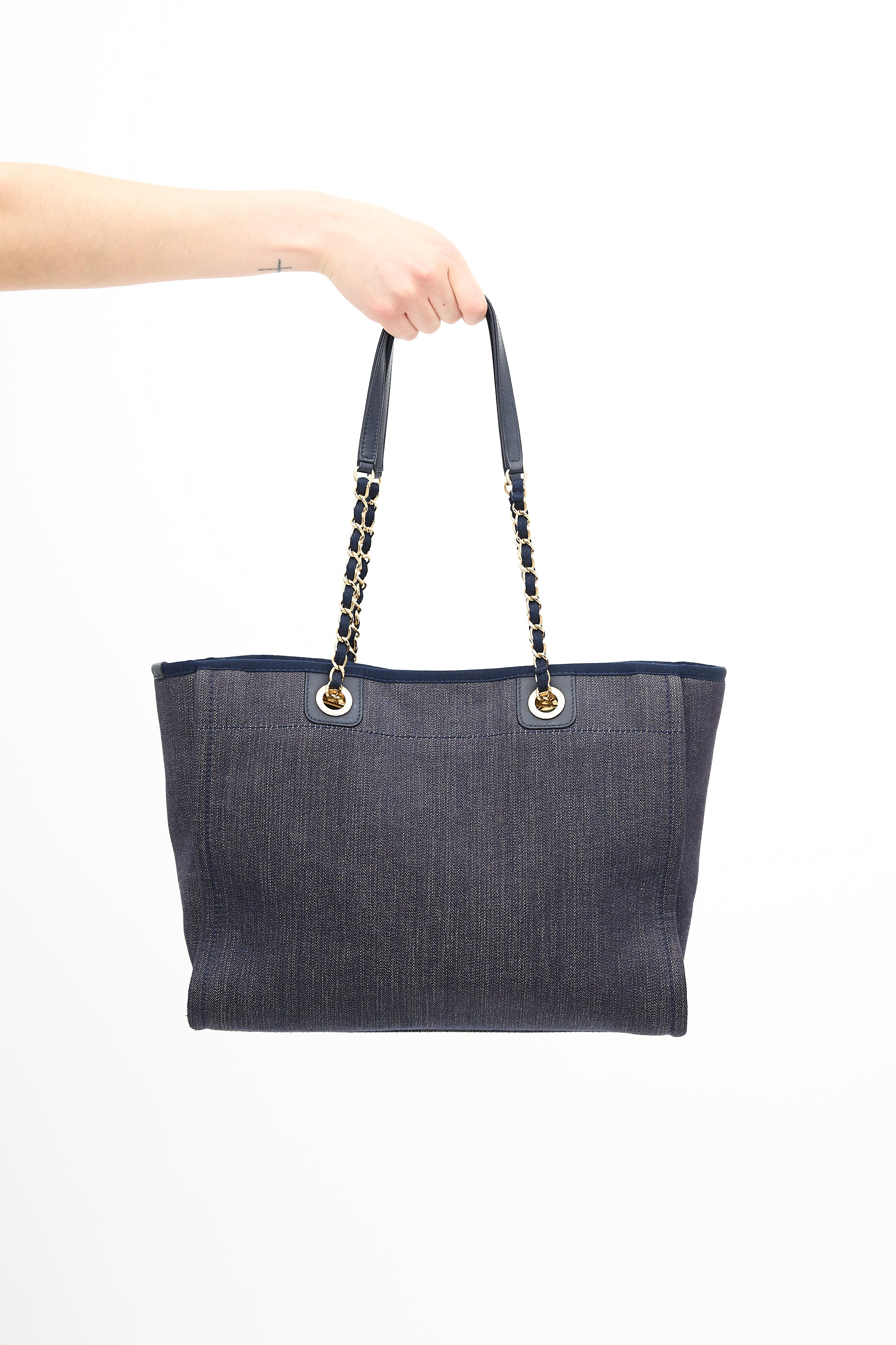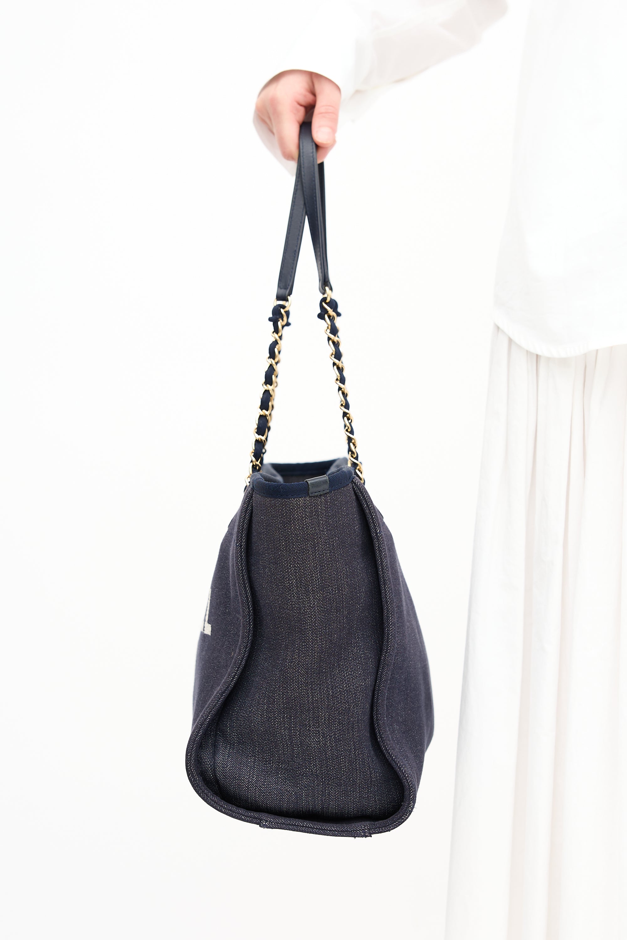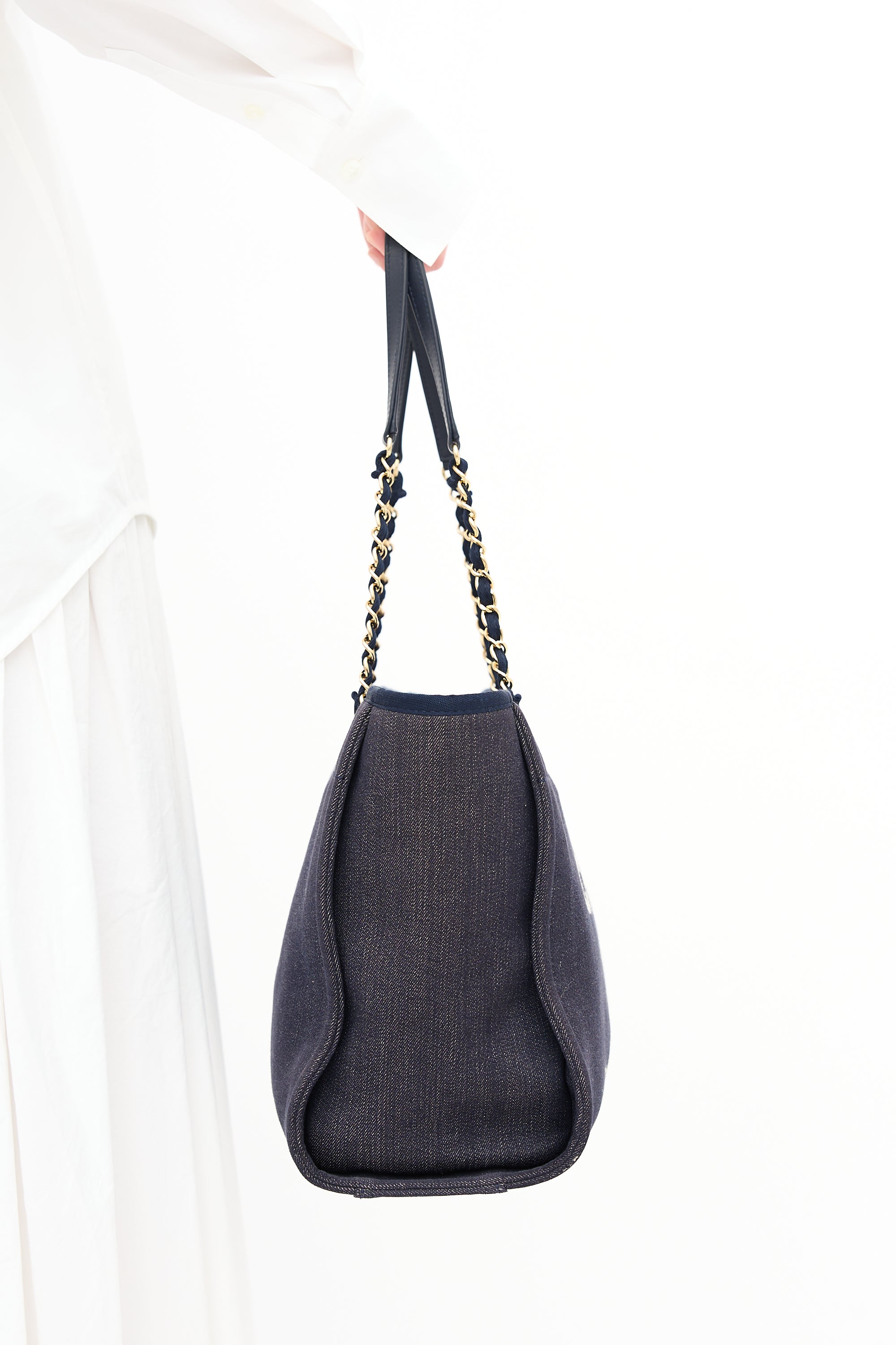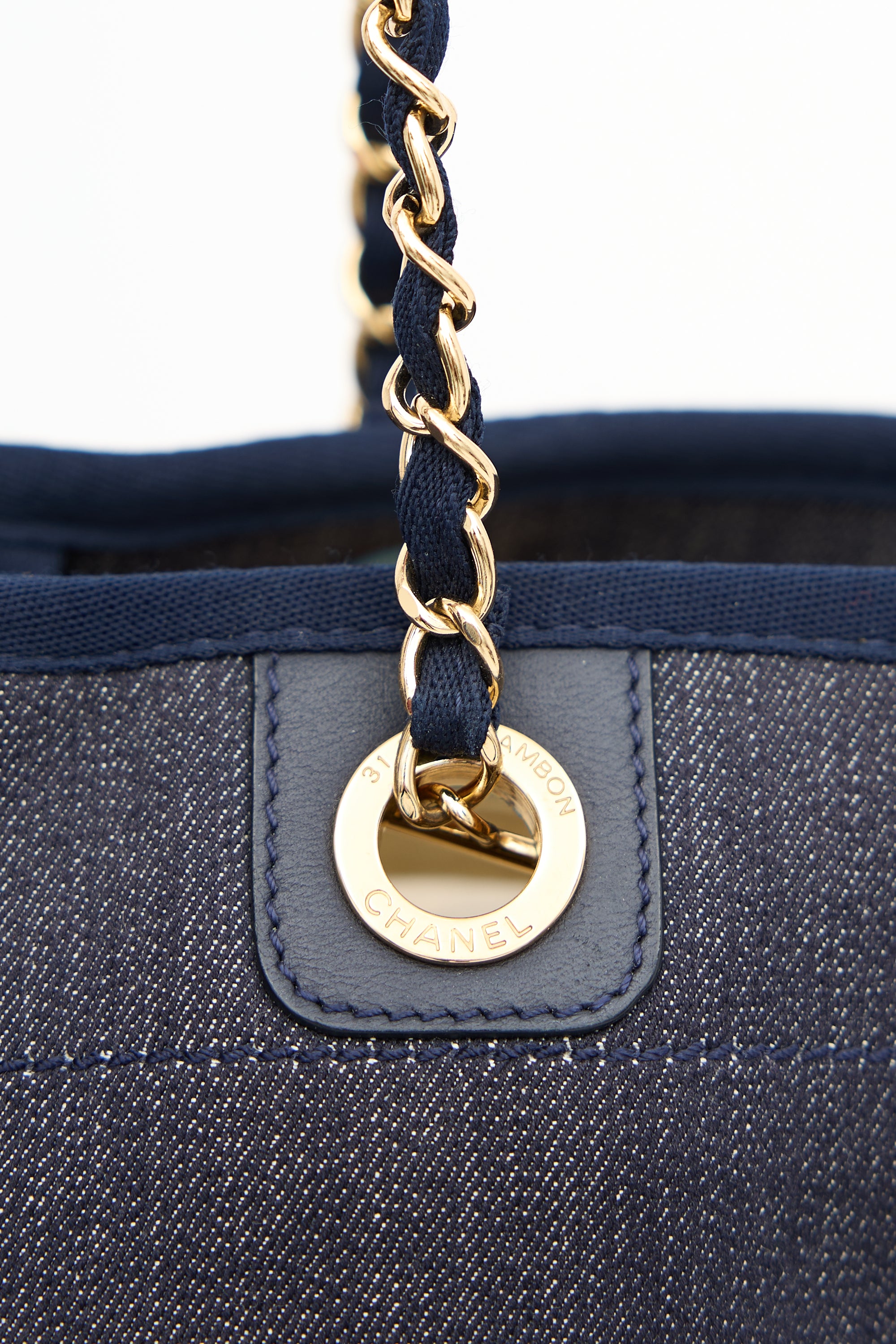 Pre-owned Chanel 2012 raw denim Deauville tote bag featuring woven logo front, navy trim, gold tone hardware, dual braided chain straps with leather handles, magnetic top closure, and one lined main compartment with one zip pocket and two slip pockets. Comes with care guide and certificate of authenticity card.