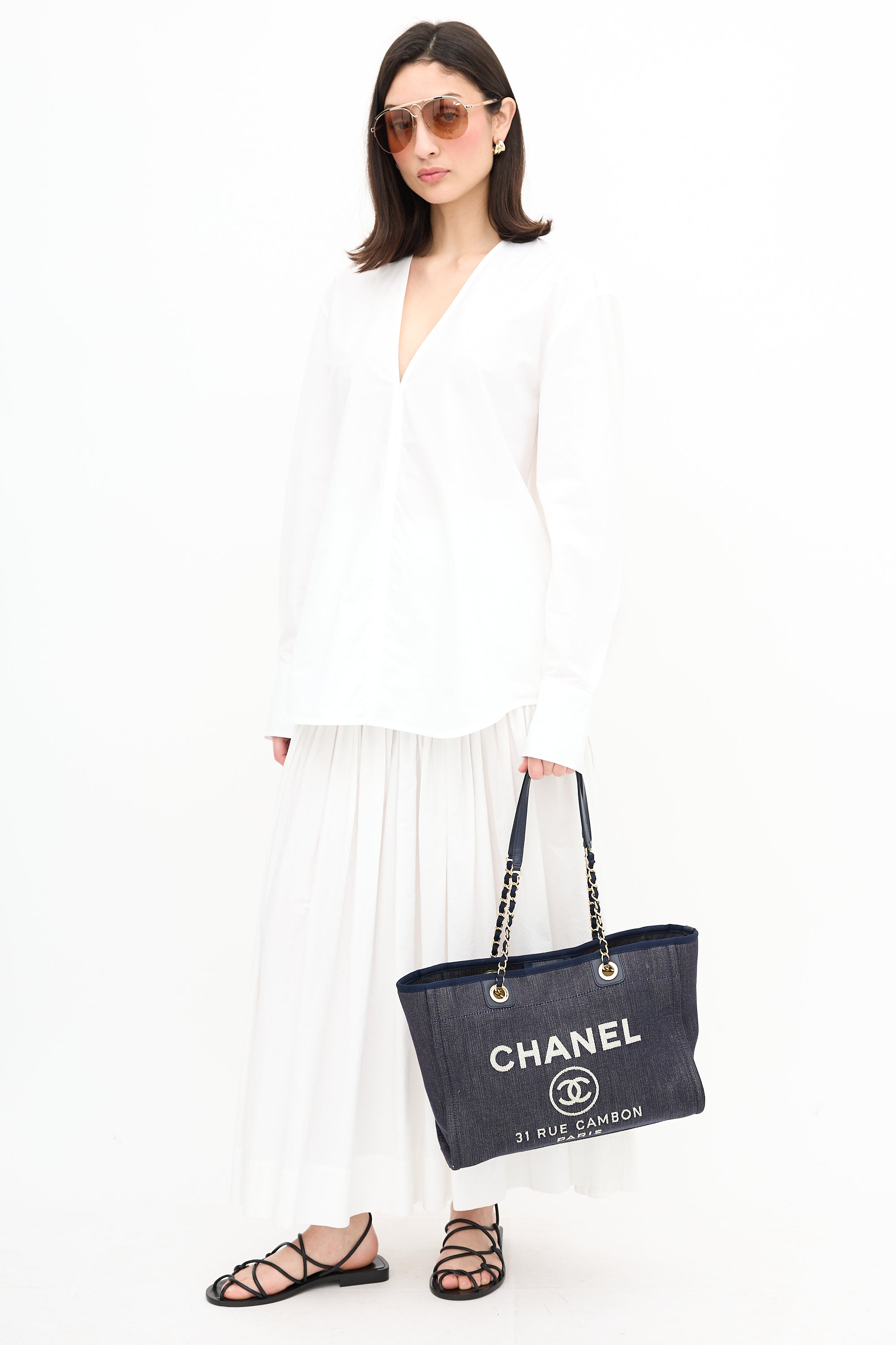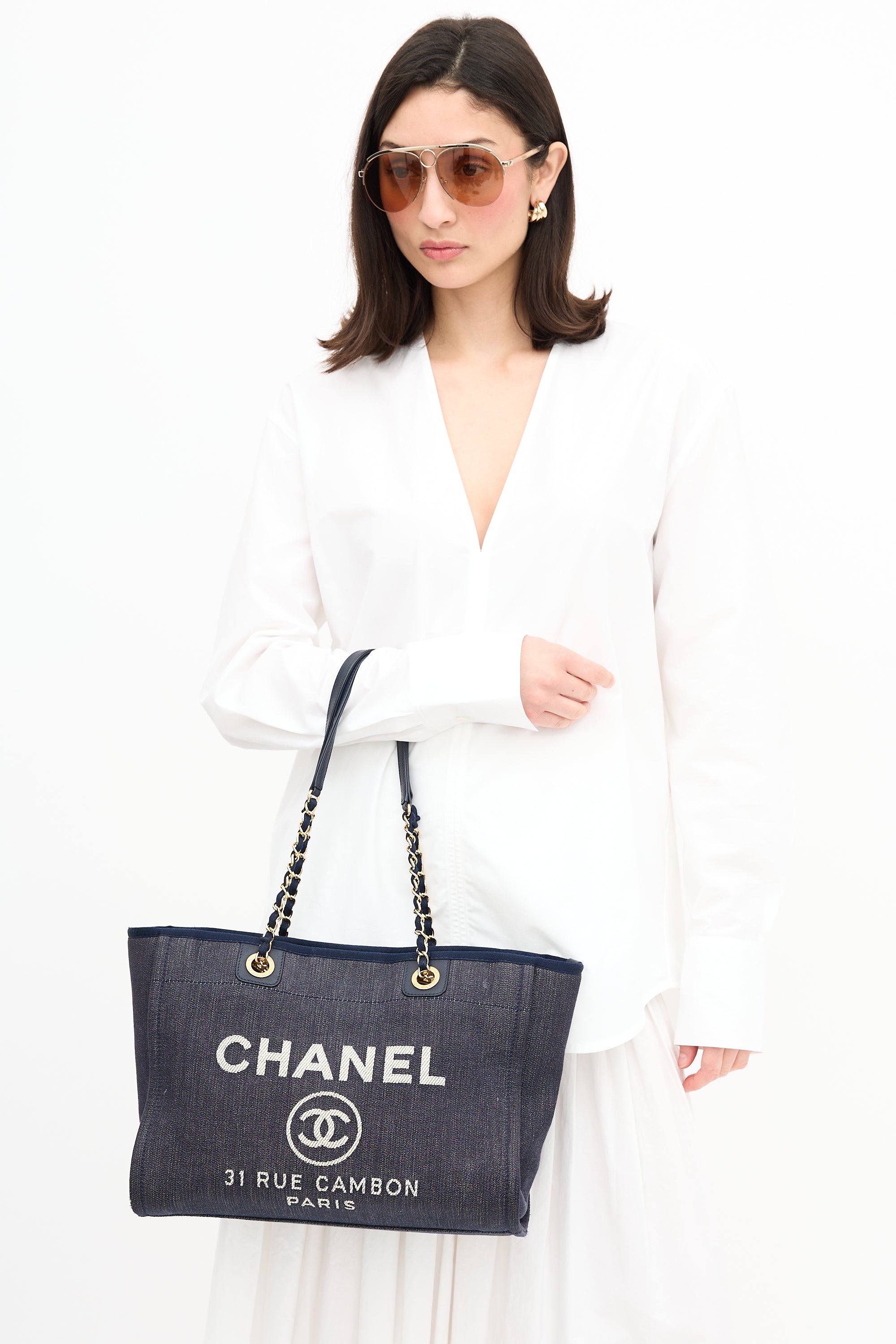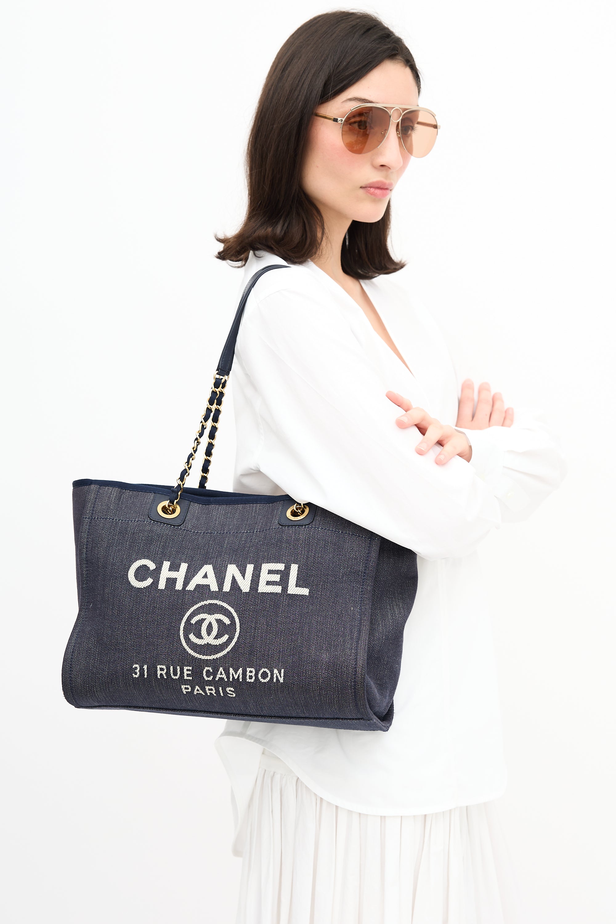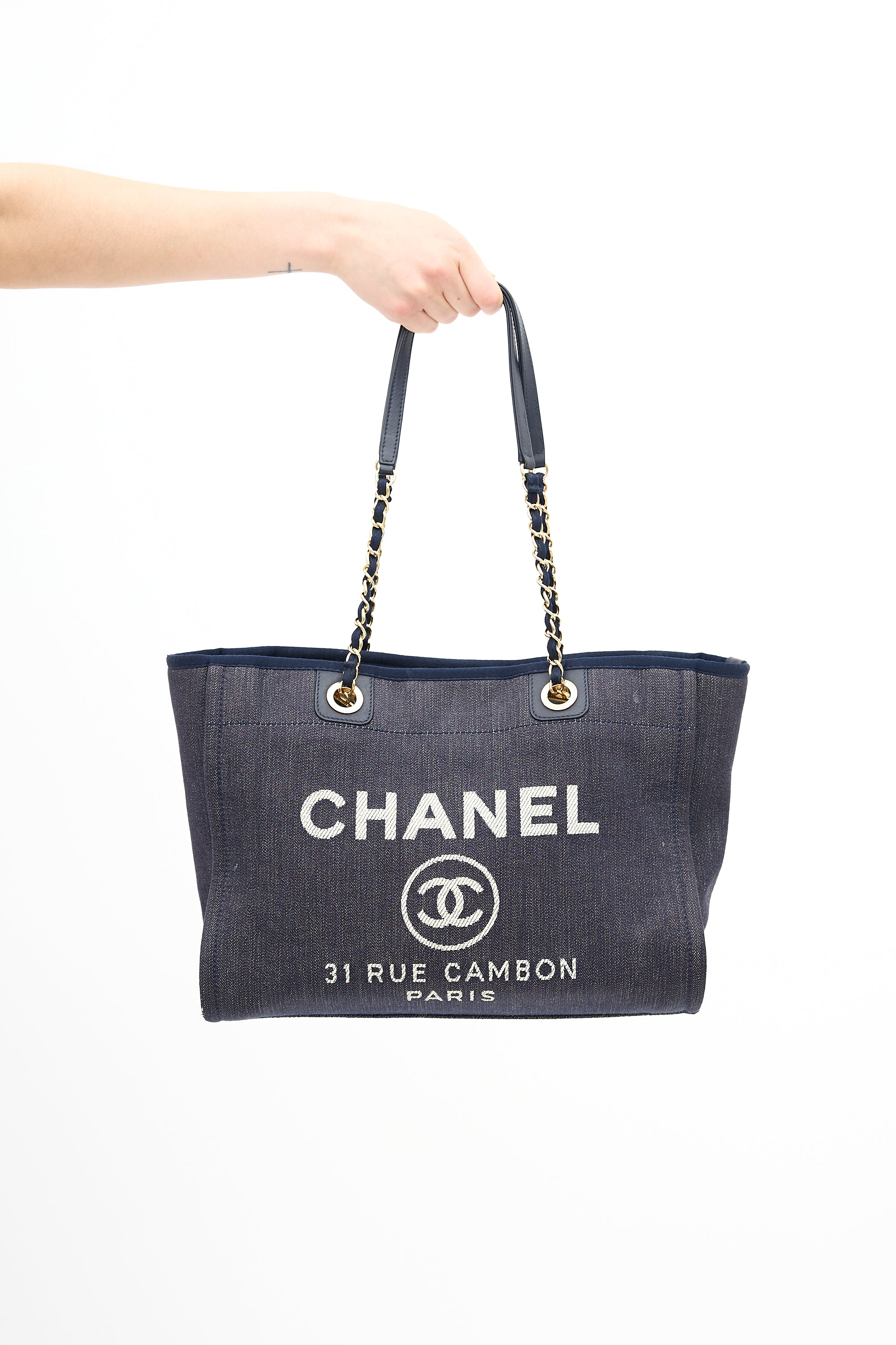 Pre-owned Chanel 2012 raw denim Deauville tote bag featuring woven logo front, navy trim, gold tone hardware, dual braided chain straps with leather handles, magnetic top closure, and one lined main compartment with one zip pocket and two slip pockets. Comes with care guide and certificate of authenticity card.