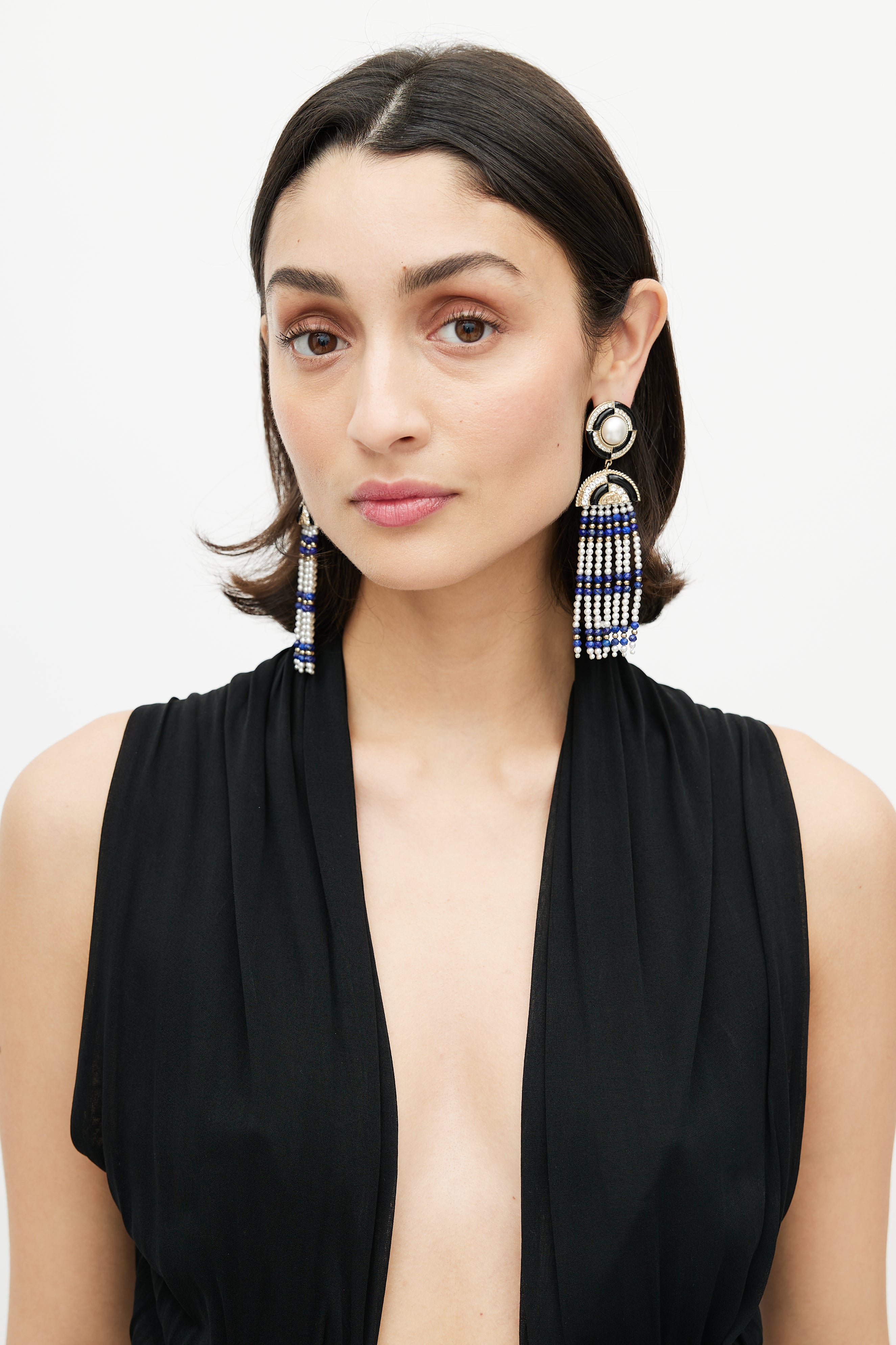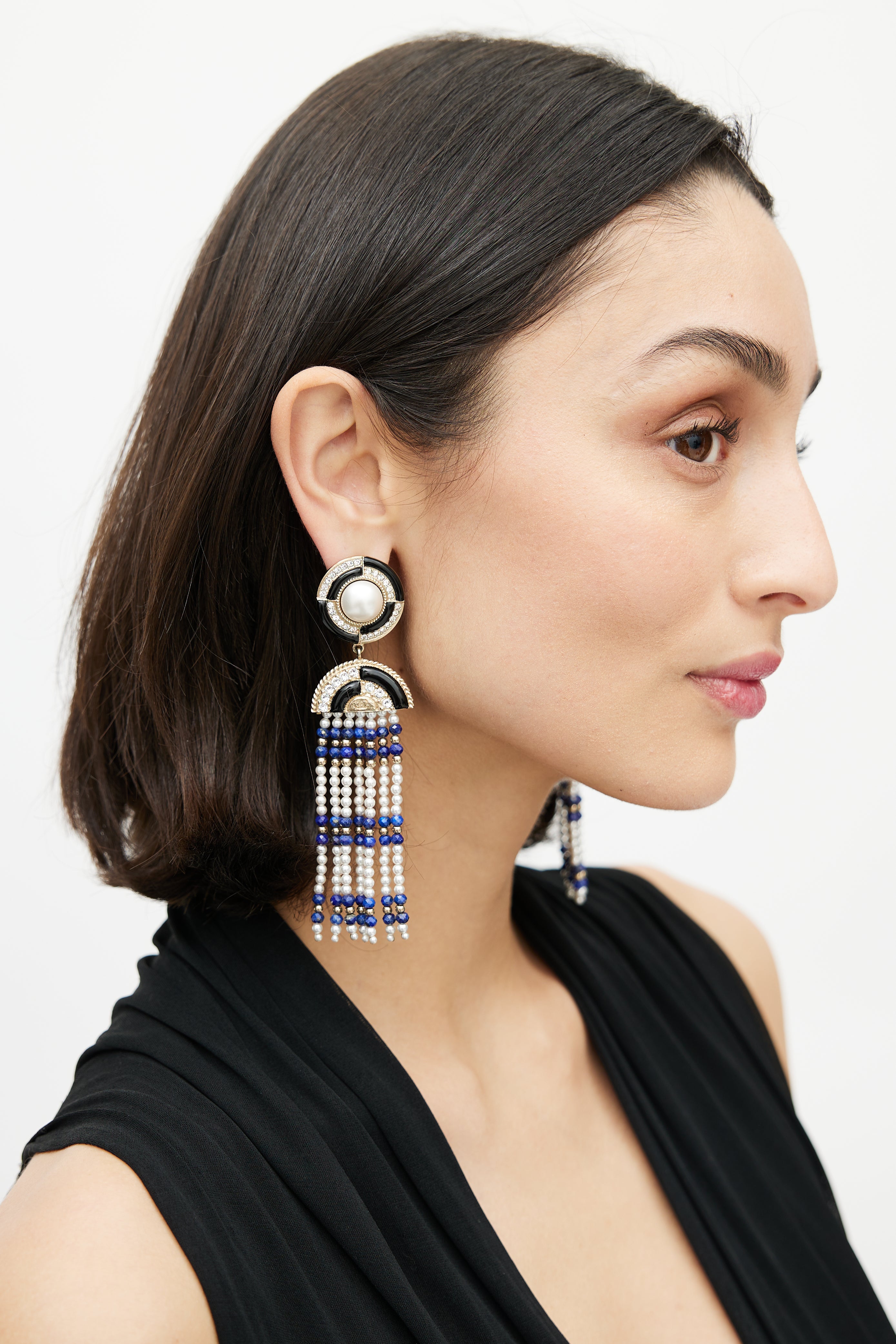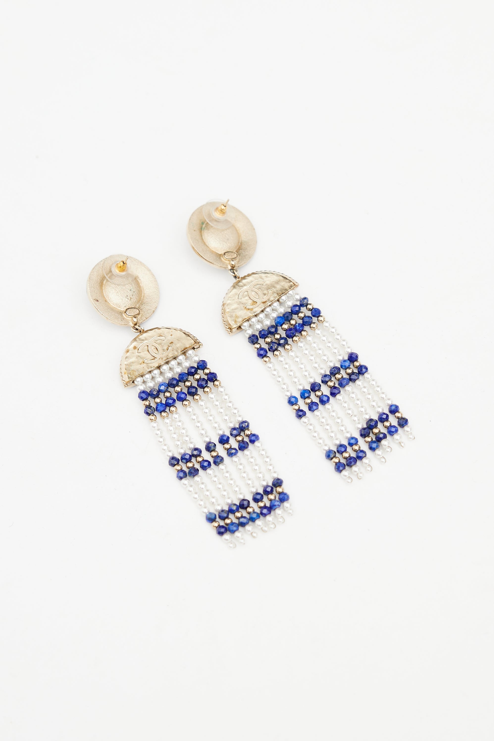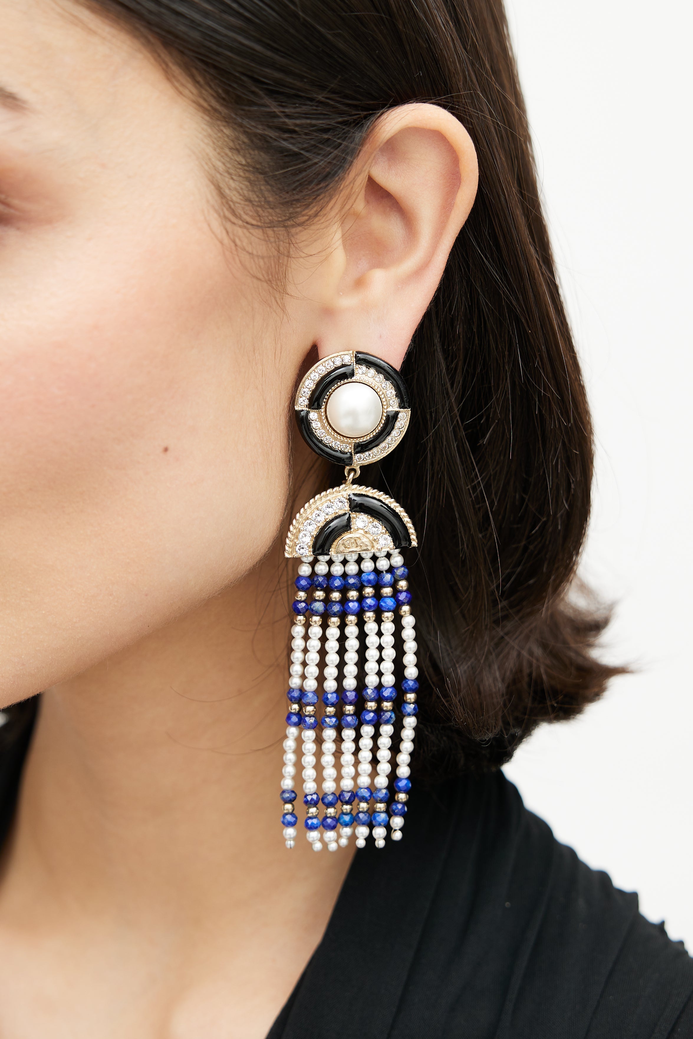 Pre-owned Chanel gold earrings featuring jewel embellishment, multicolour beaded tassels, circular faux pearl at centre, and push lock closure. Comes with original box.