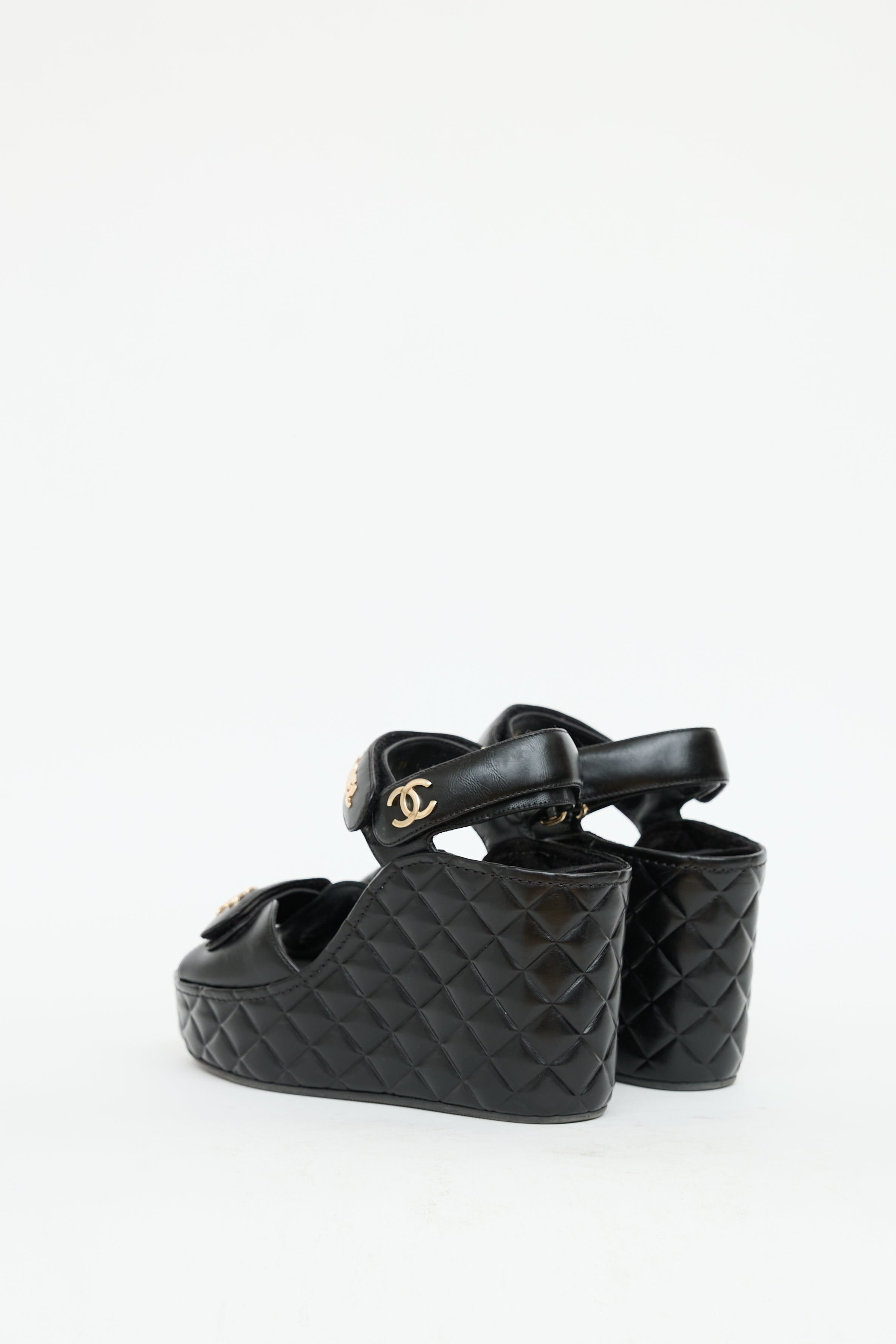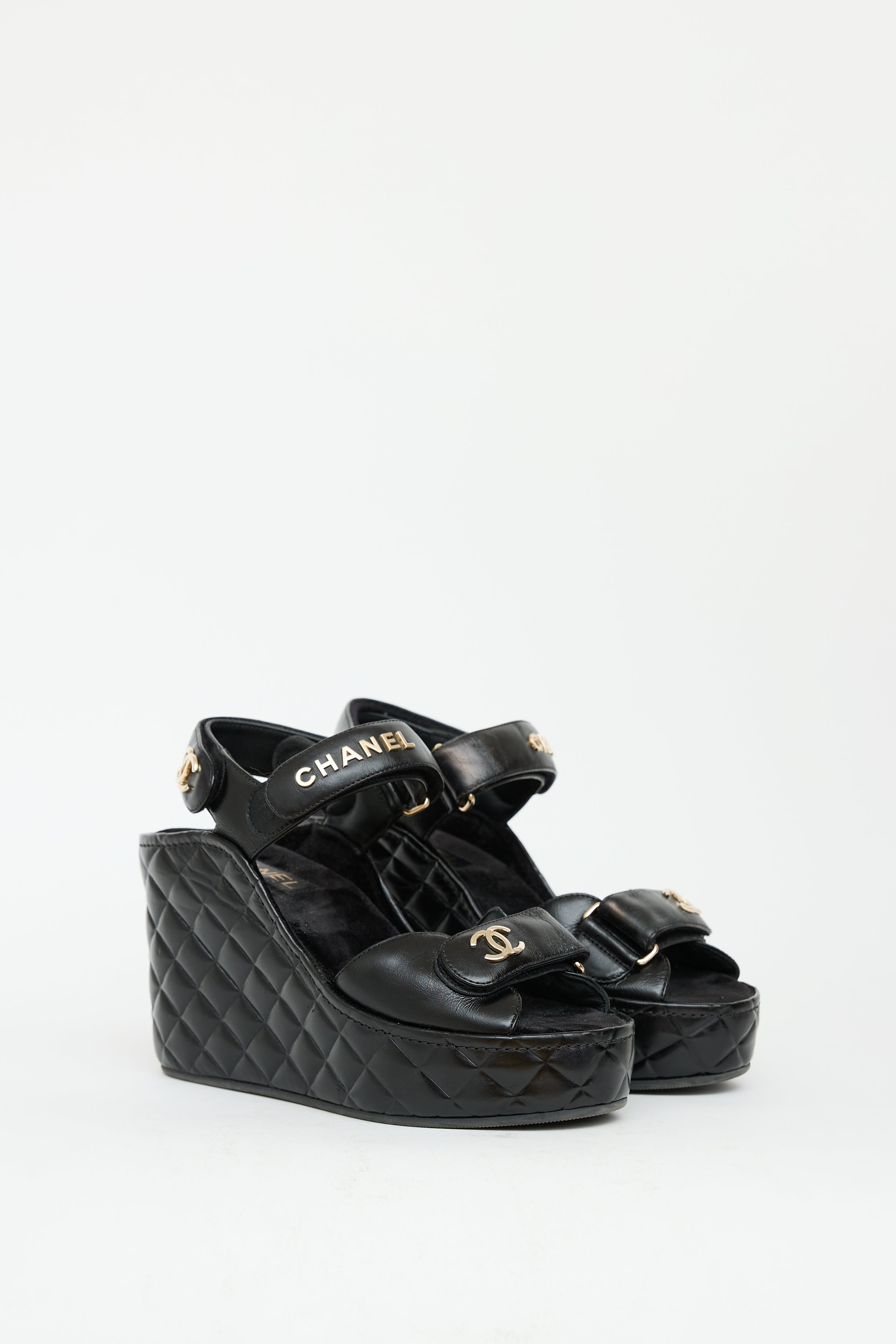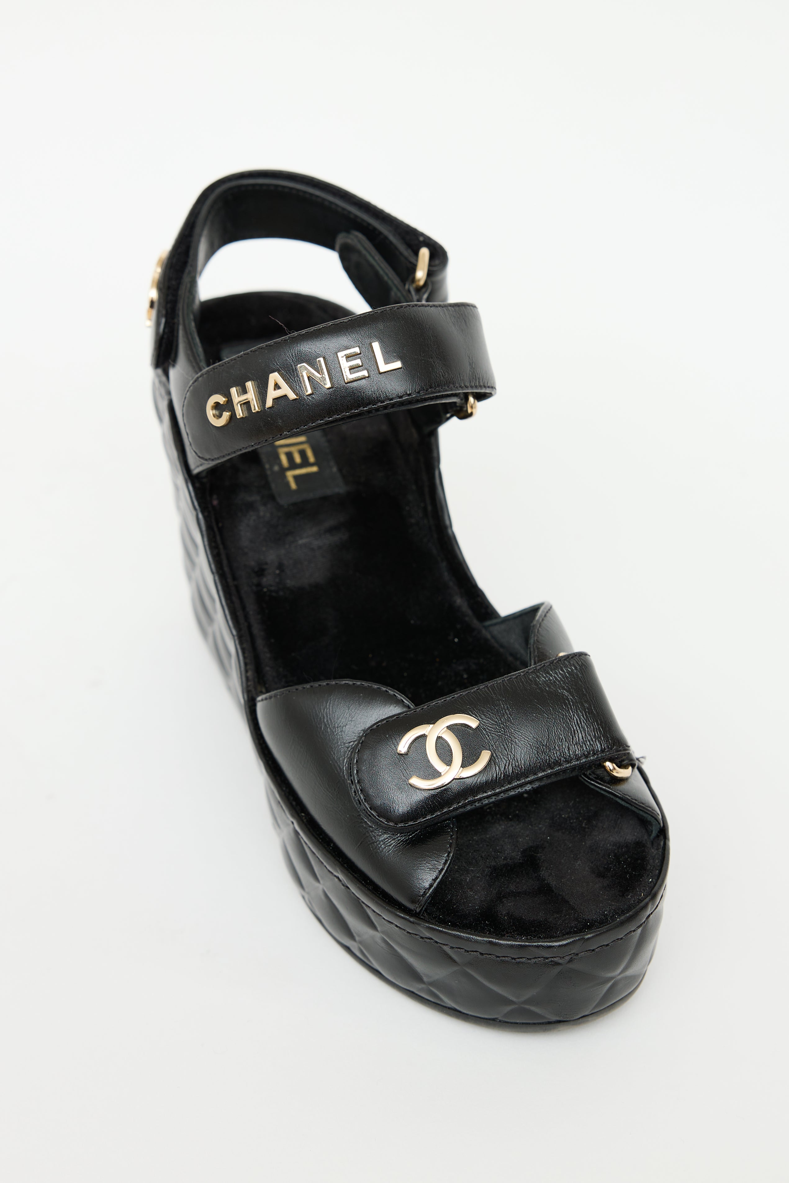 Pre-owned Chanel black leather sandals featuring an open round toe, quilted stitching, strap at vamp with CC logo hardware, wrapped wedge heel, lined insole, and adjustable straps at ankle with gold tone CC logo hardware.