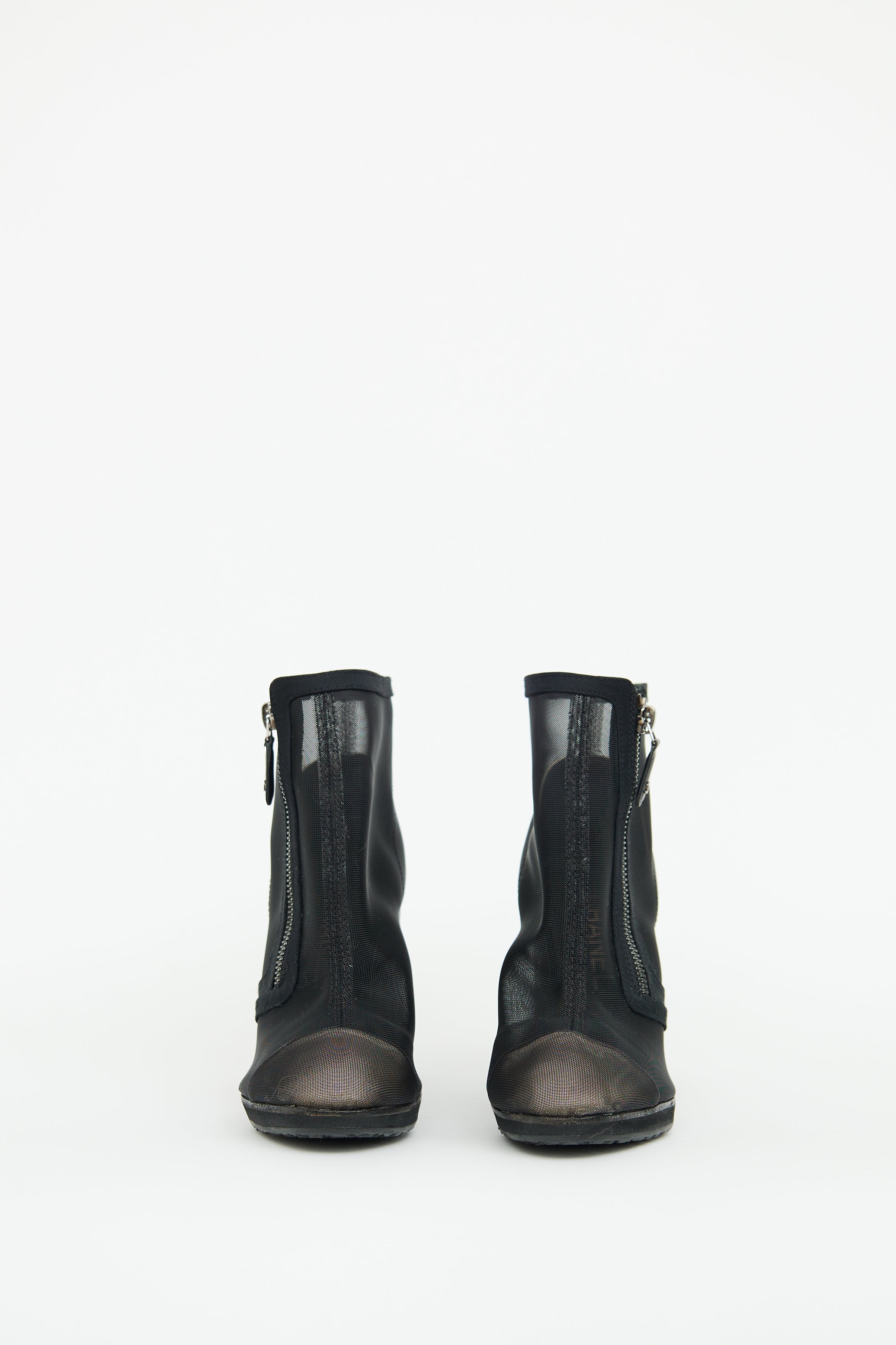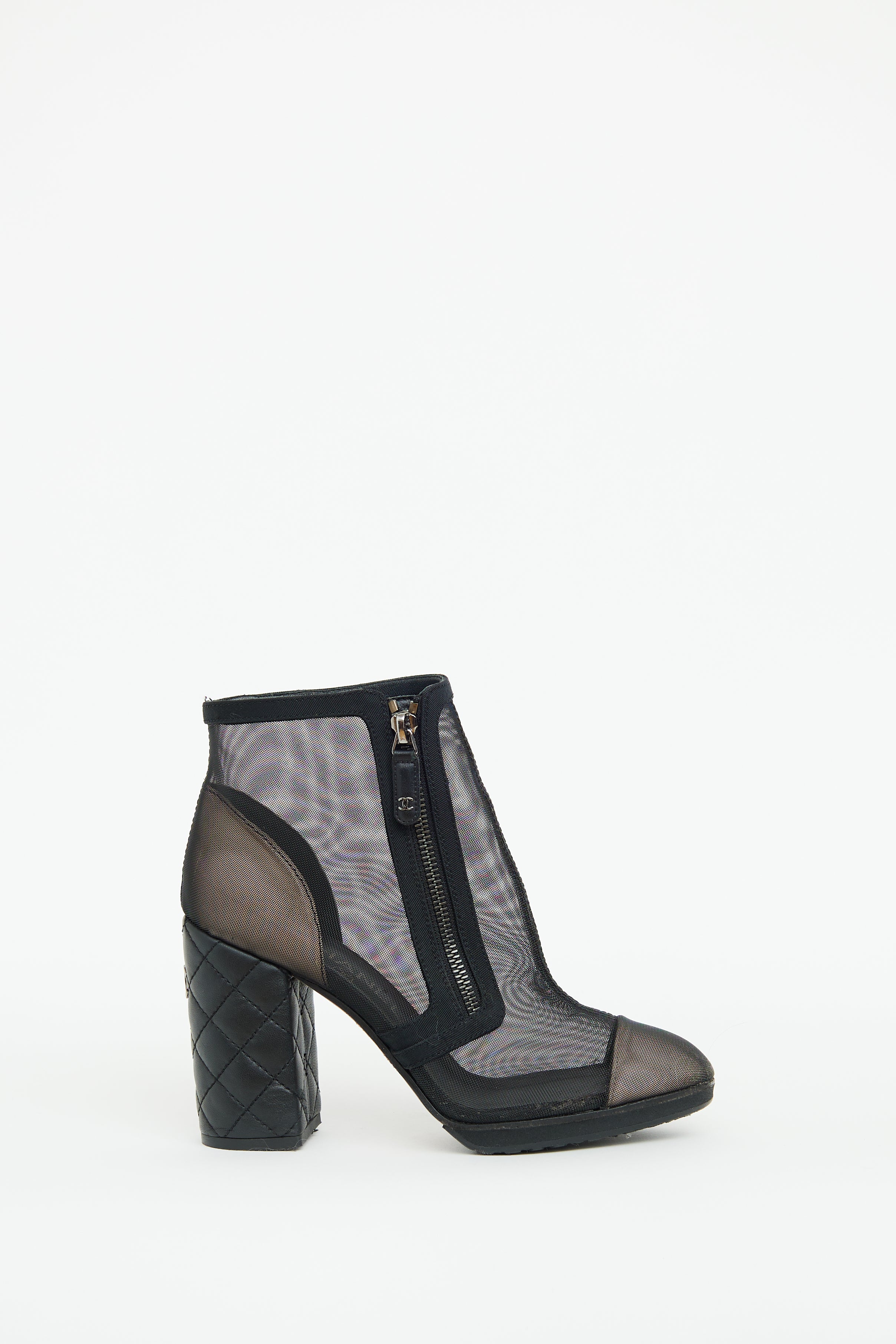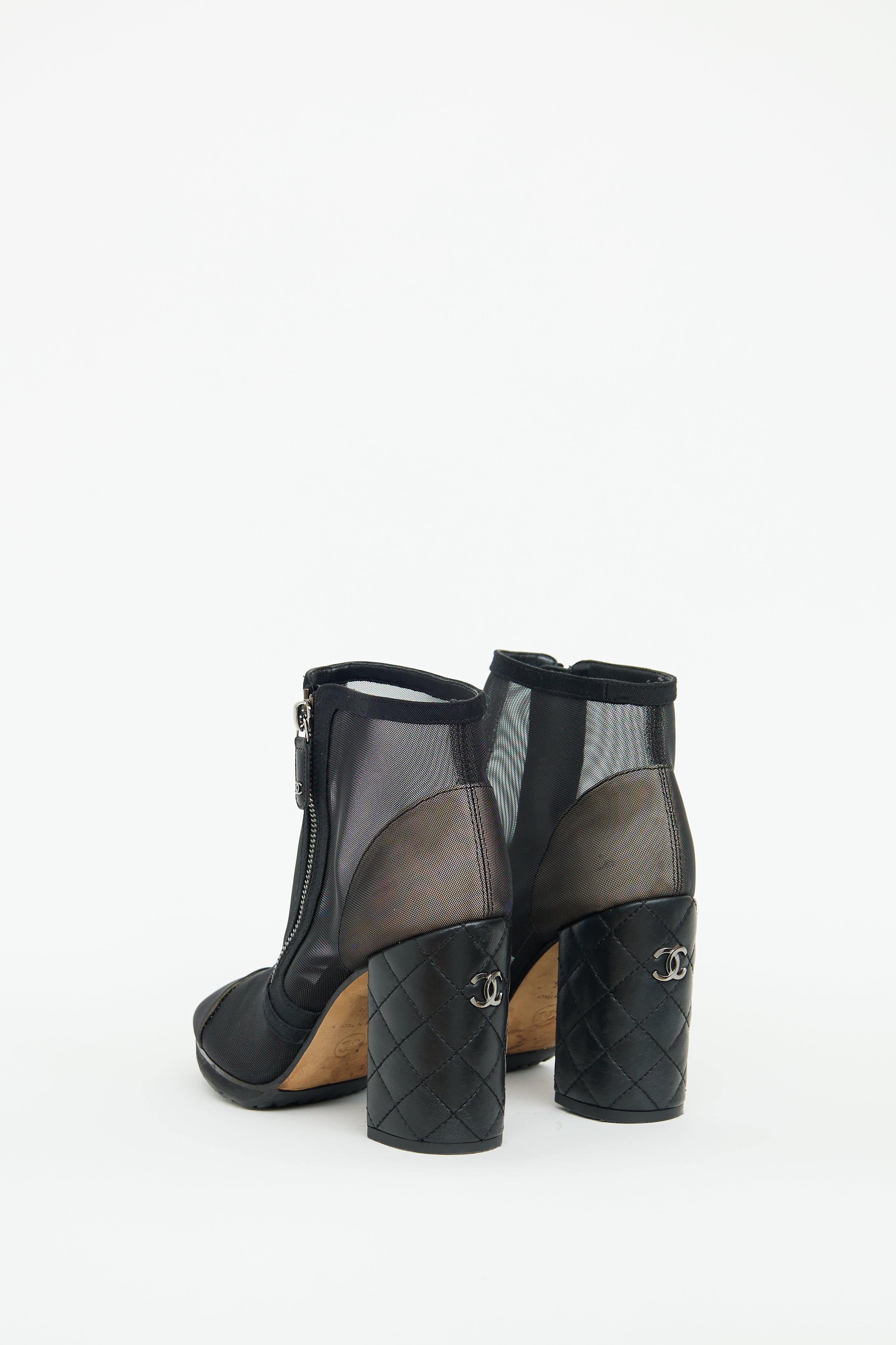 Pre-owned Chanel 2020 black ankle boots featuring round toe, mesh upper, side zip entry with pull tab and quilted block heel with silver tone CC hardware.