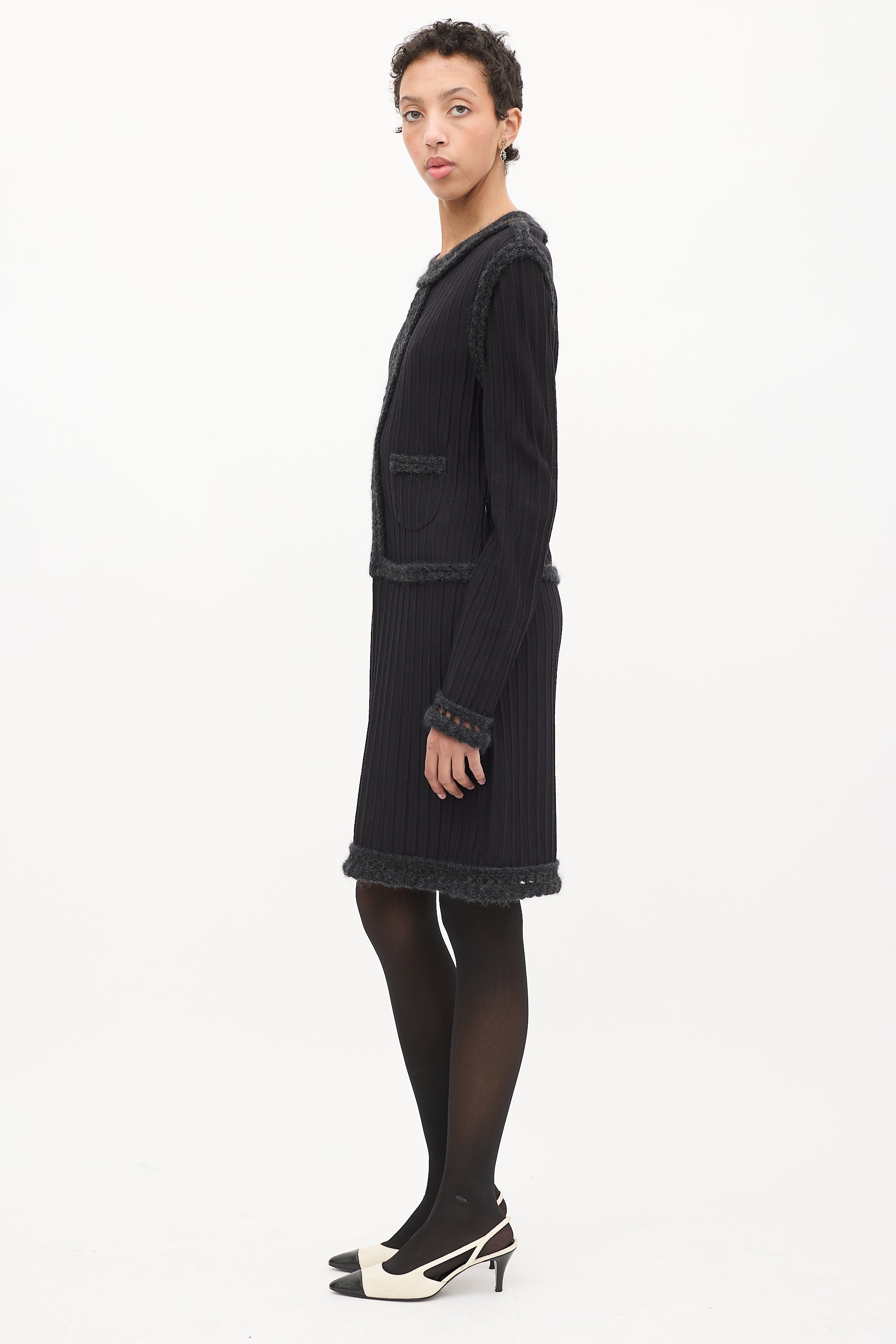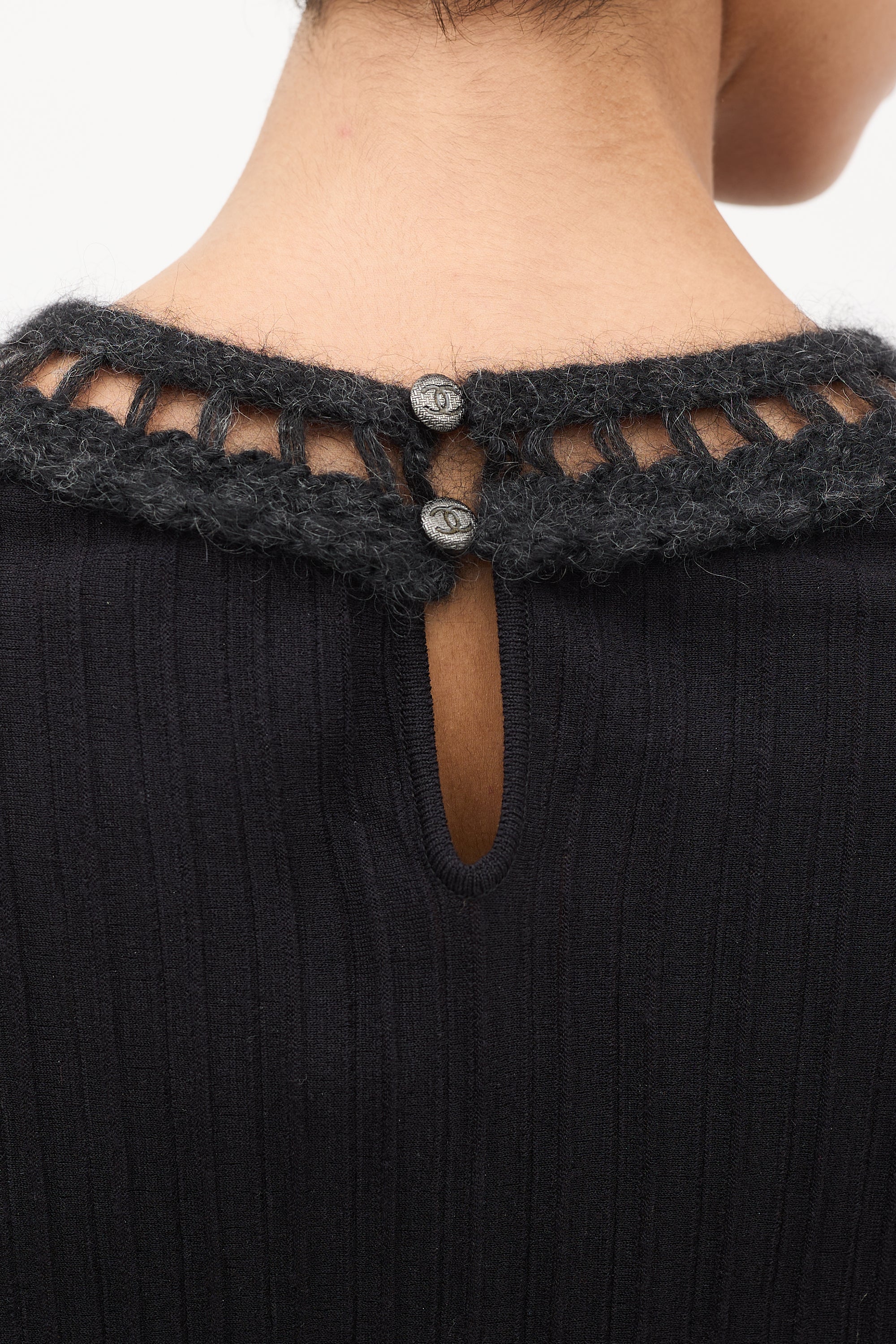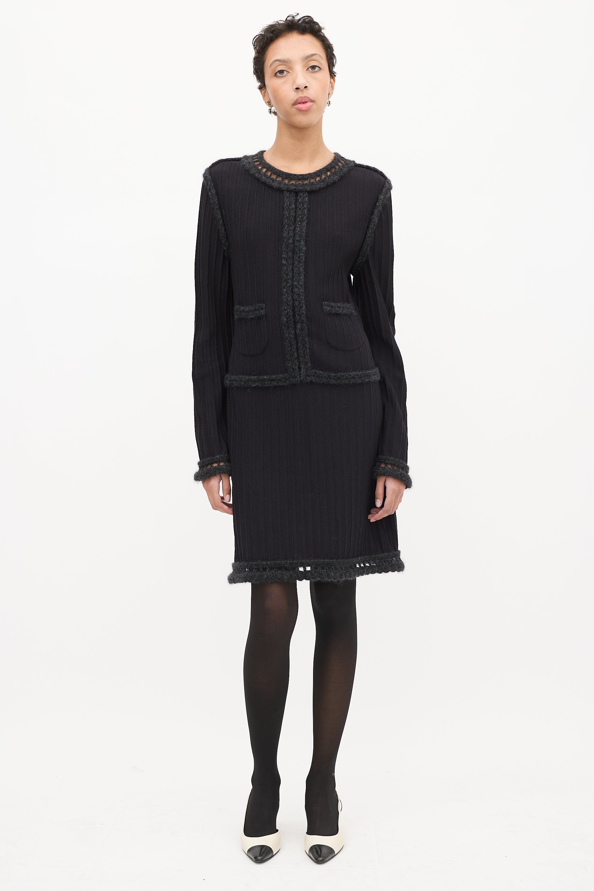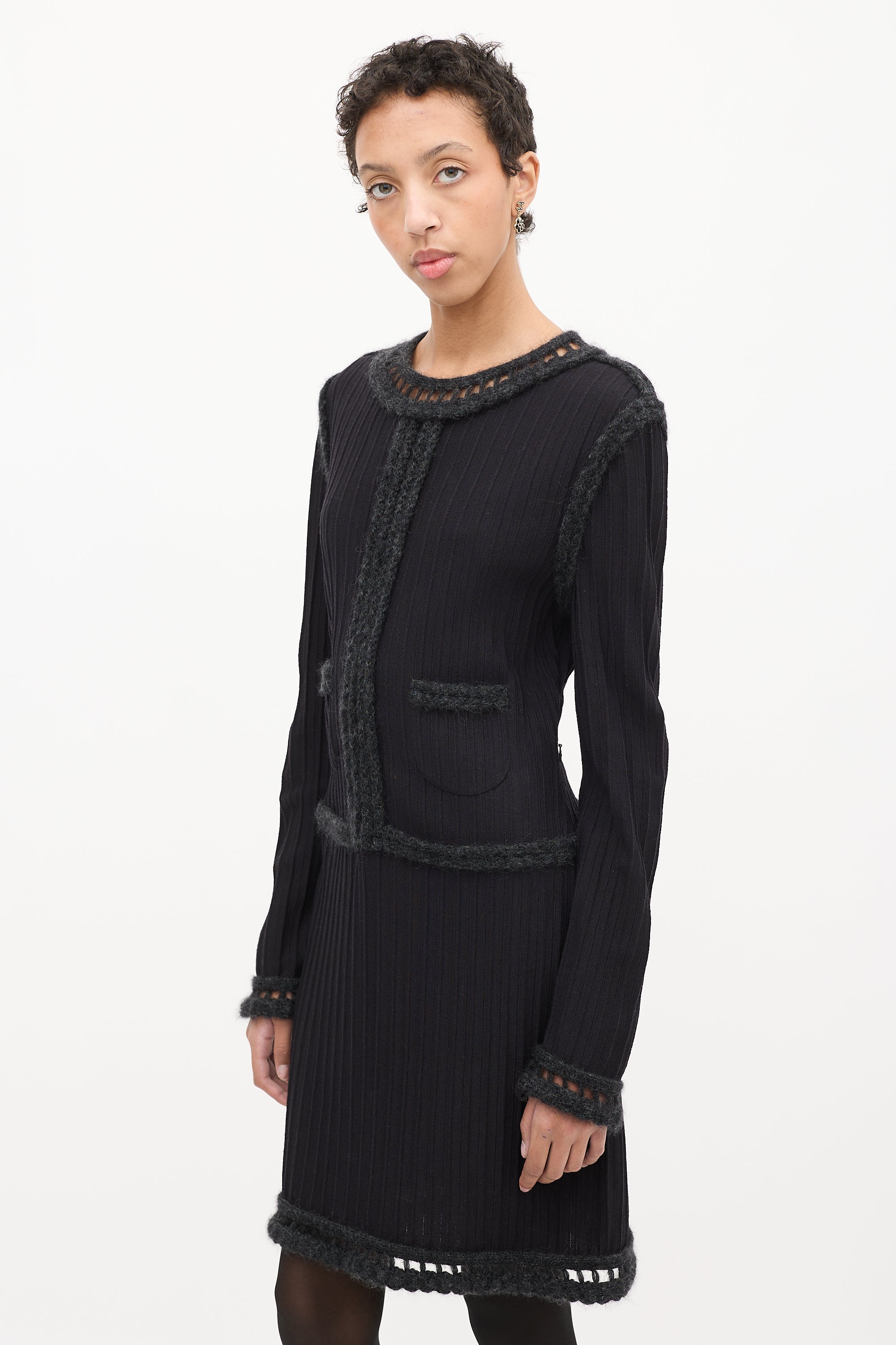 Pre-owned Chanel black wool blend midi dress featuring a round neckline with double CC button back fastening, two front patch pockets, long sleeves, concealed side zip closure, and knit and latticed trim throughout.