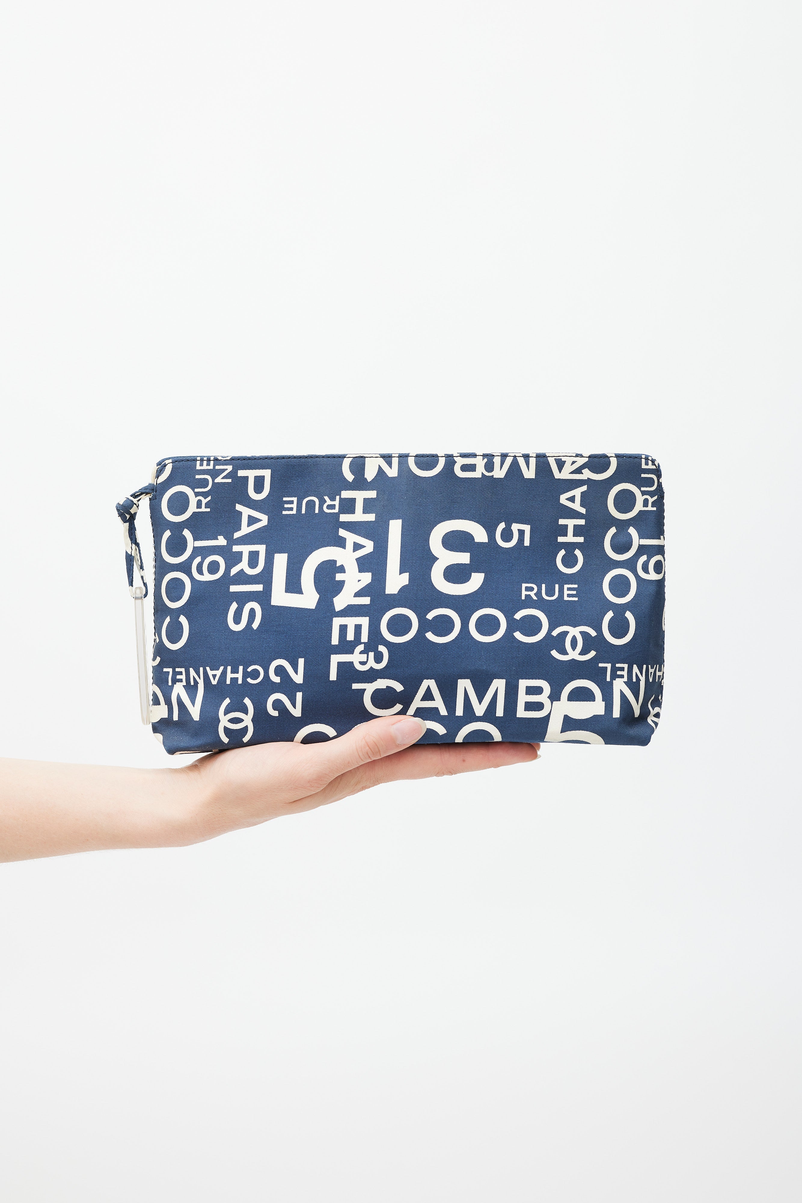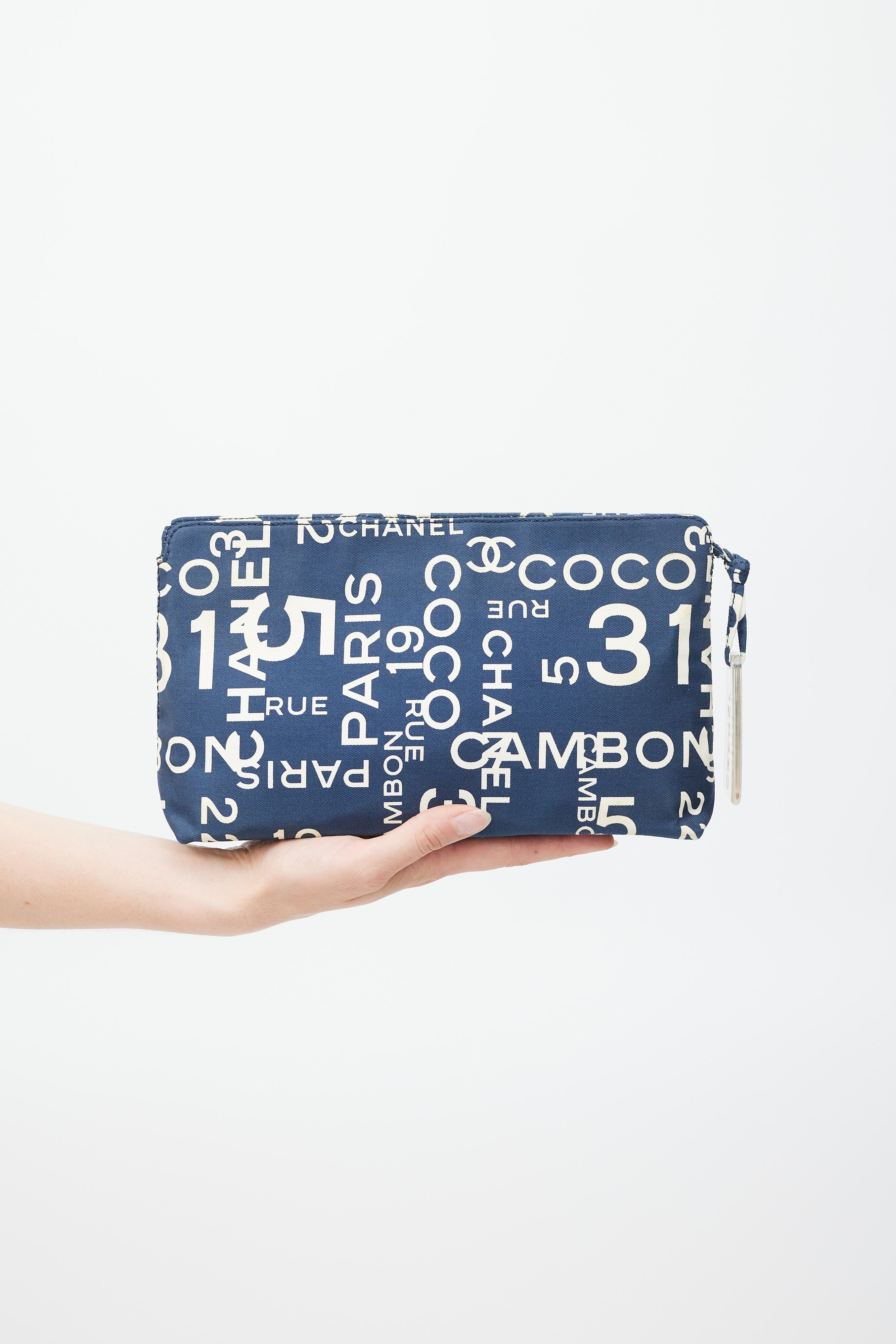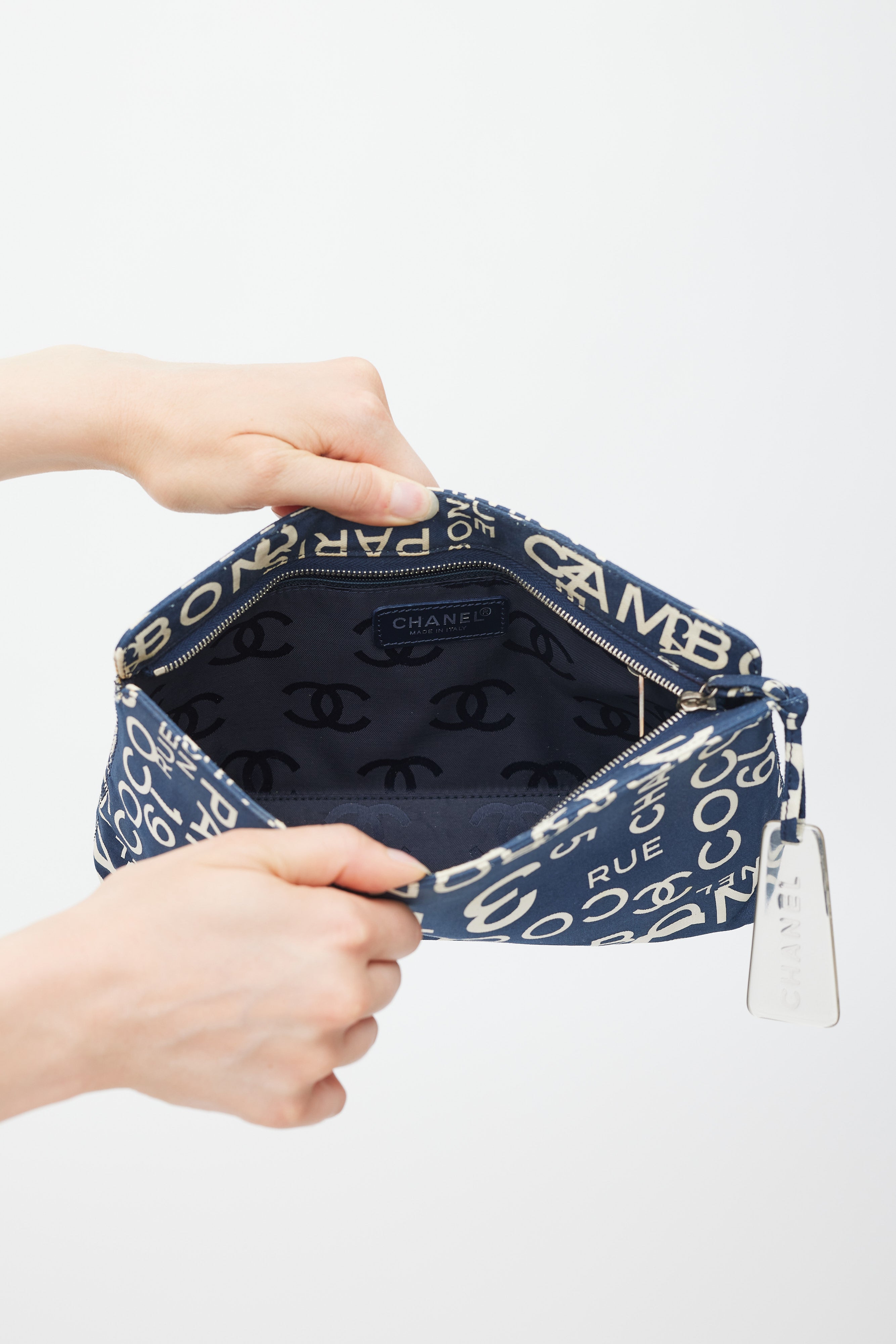 Pre-owned Chanel blue and white Rue Cambon pouch featuring lettering throughout, top zip closure with clear debossed logo acetate pull tab charm, and one lined main compartment with single zip pocket.