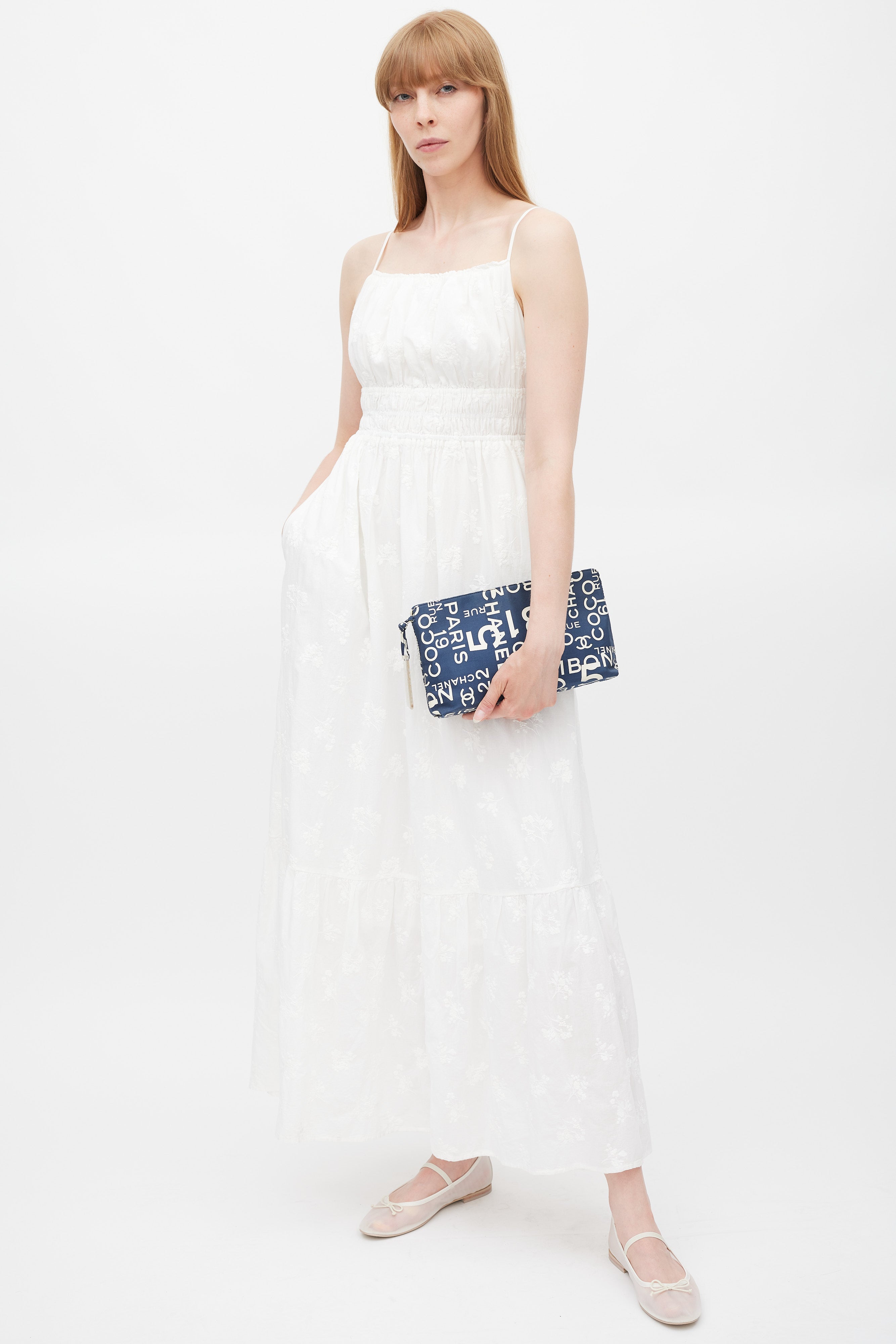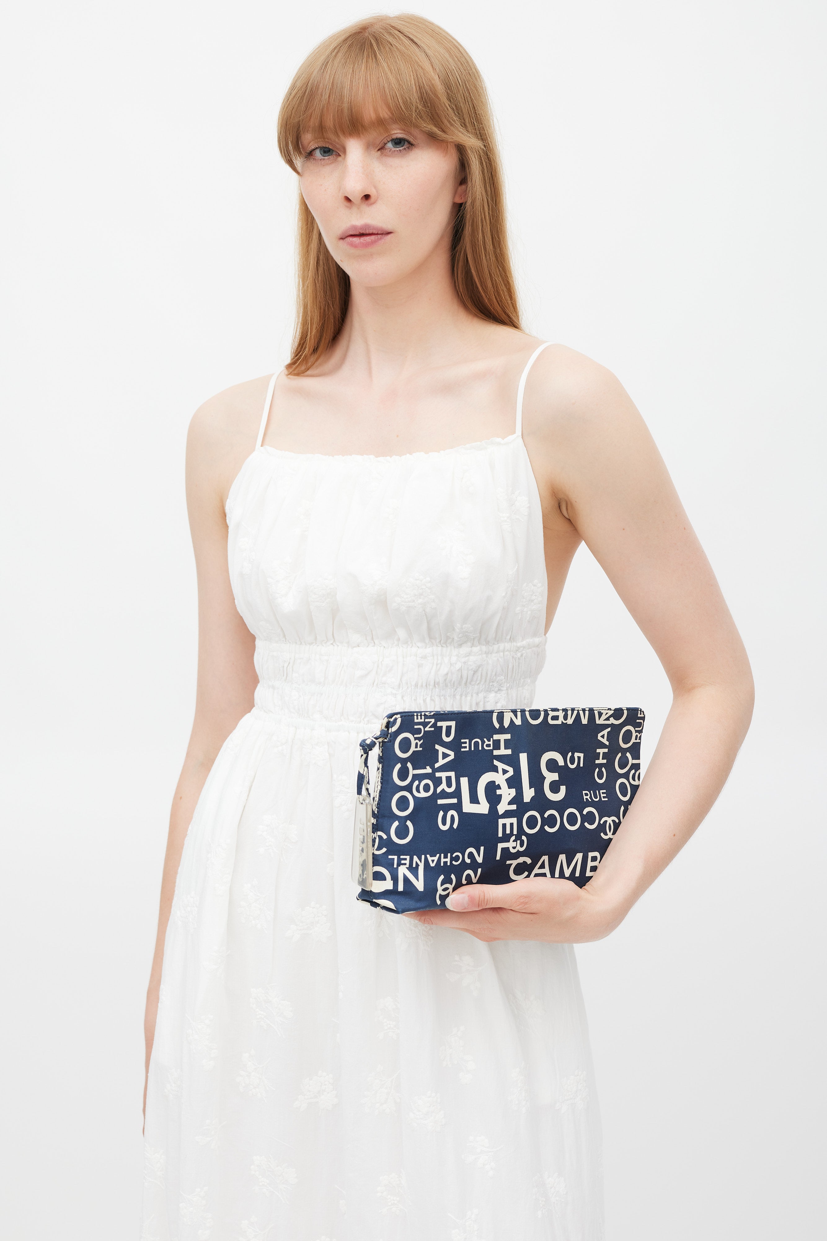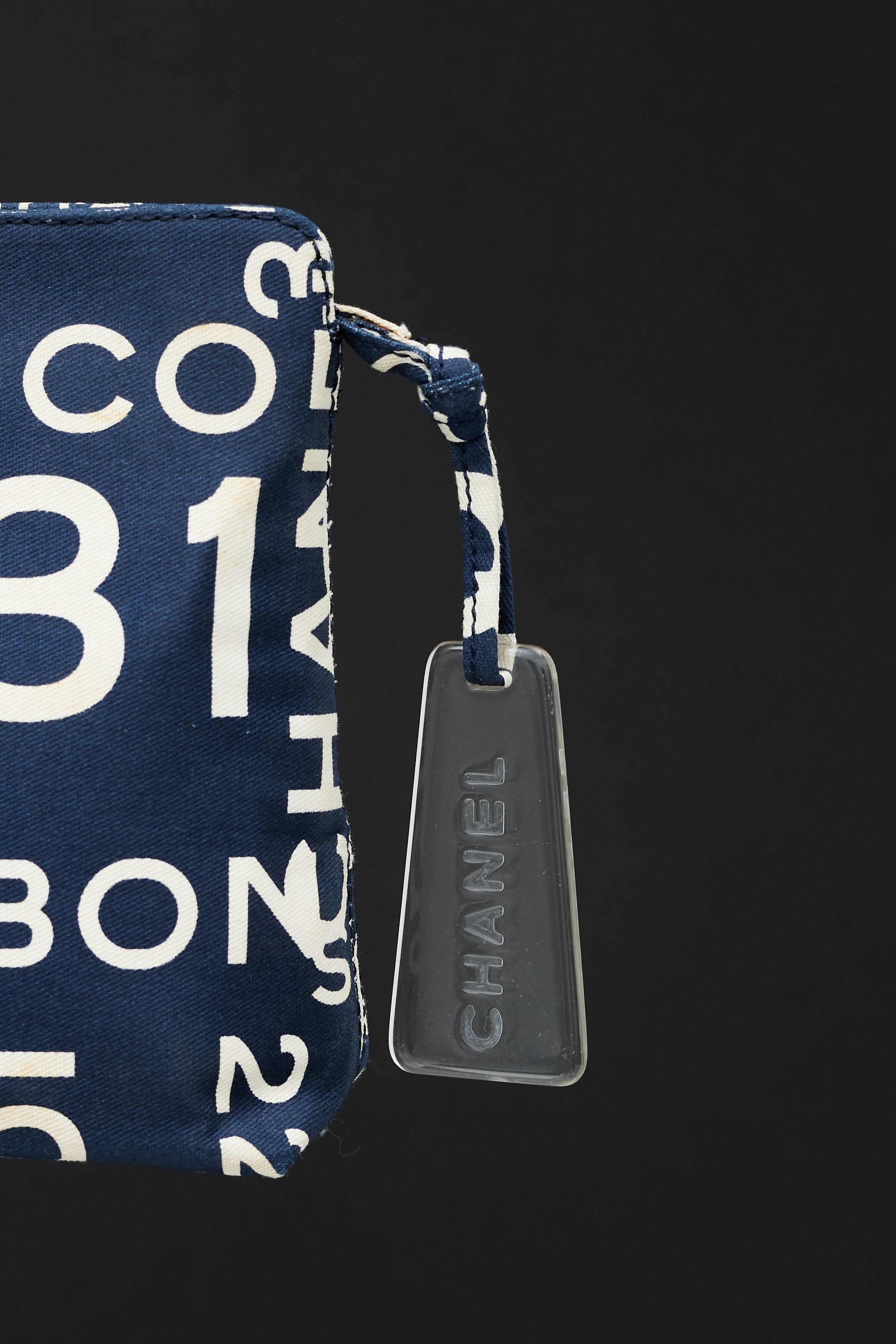 Pre-owned Chanel blue and white Rue Cambon pouch featuring lettering throughout, top zip closure with clear debossed logo acetate pull tab charm, and one lined main compartment with single zip pocket.