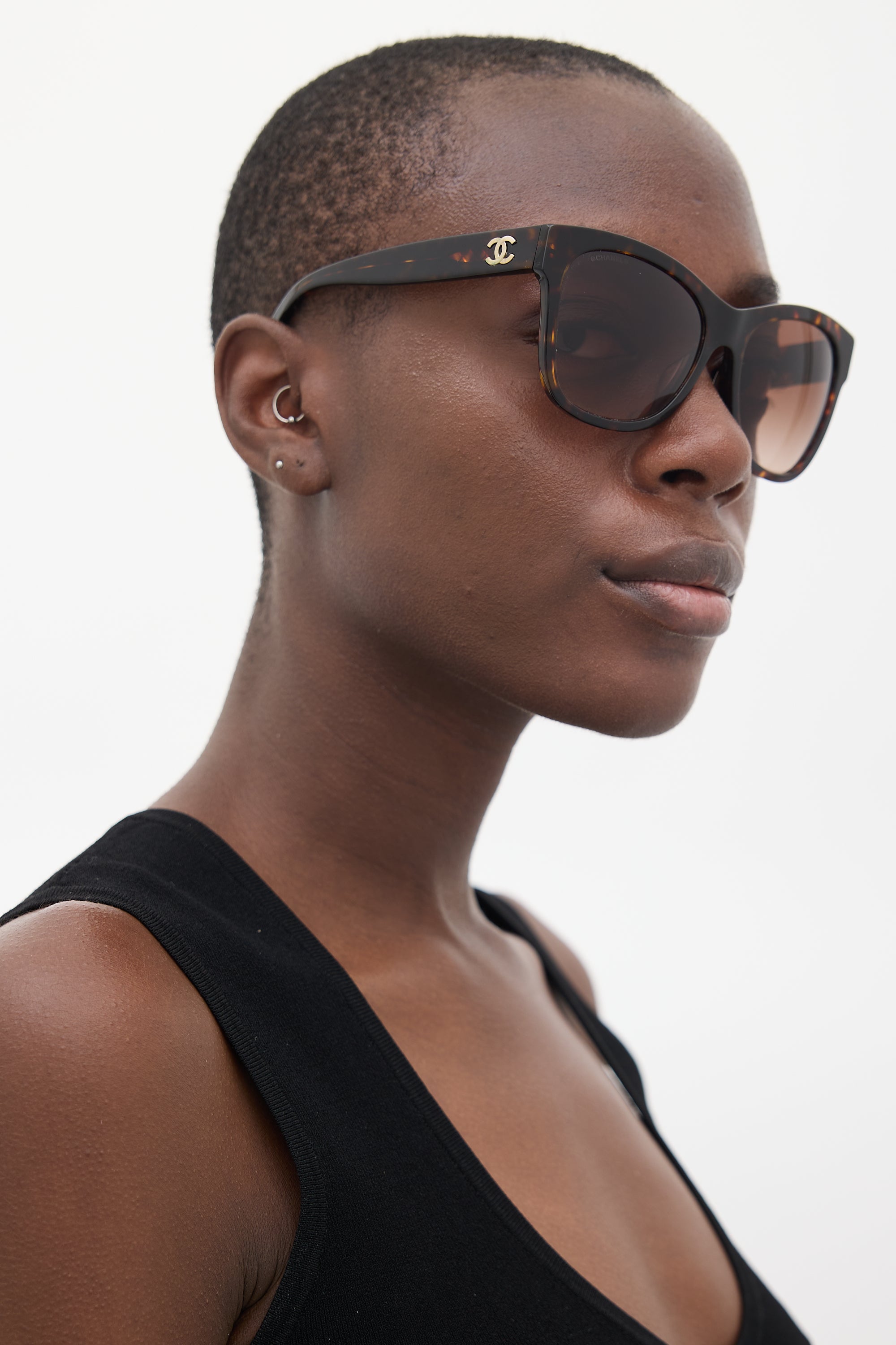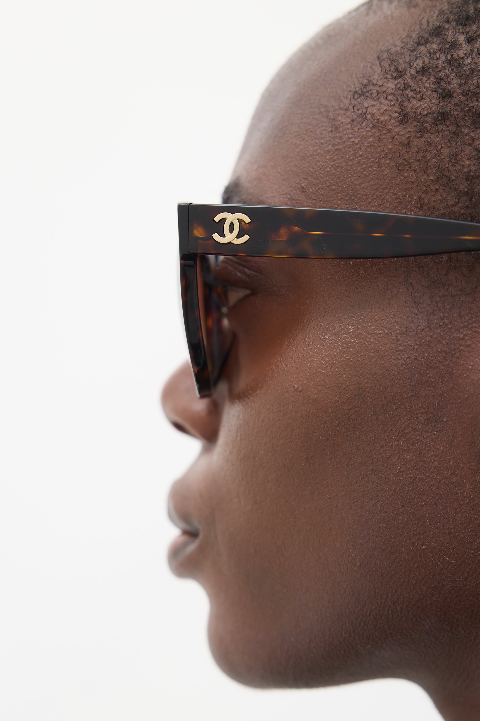 Pre-owned Chanel brown 5380-A wayfarer sunglasses featuring a tortoise shell frame, tinted lenses, nose pads, and gold tone CC logo hardware at temples. Comes with original case.