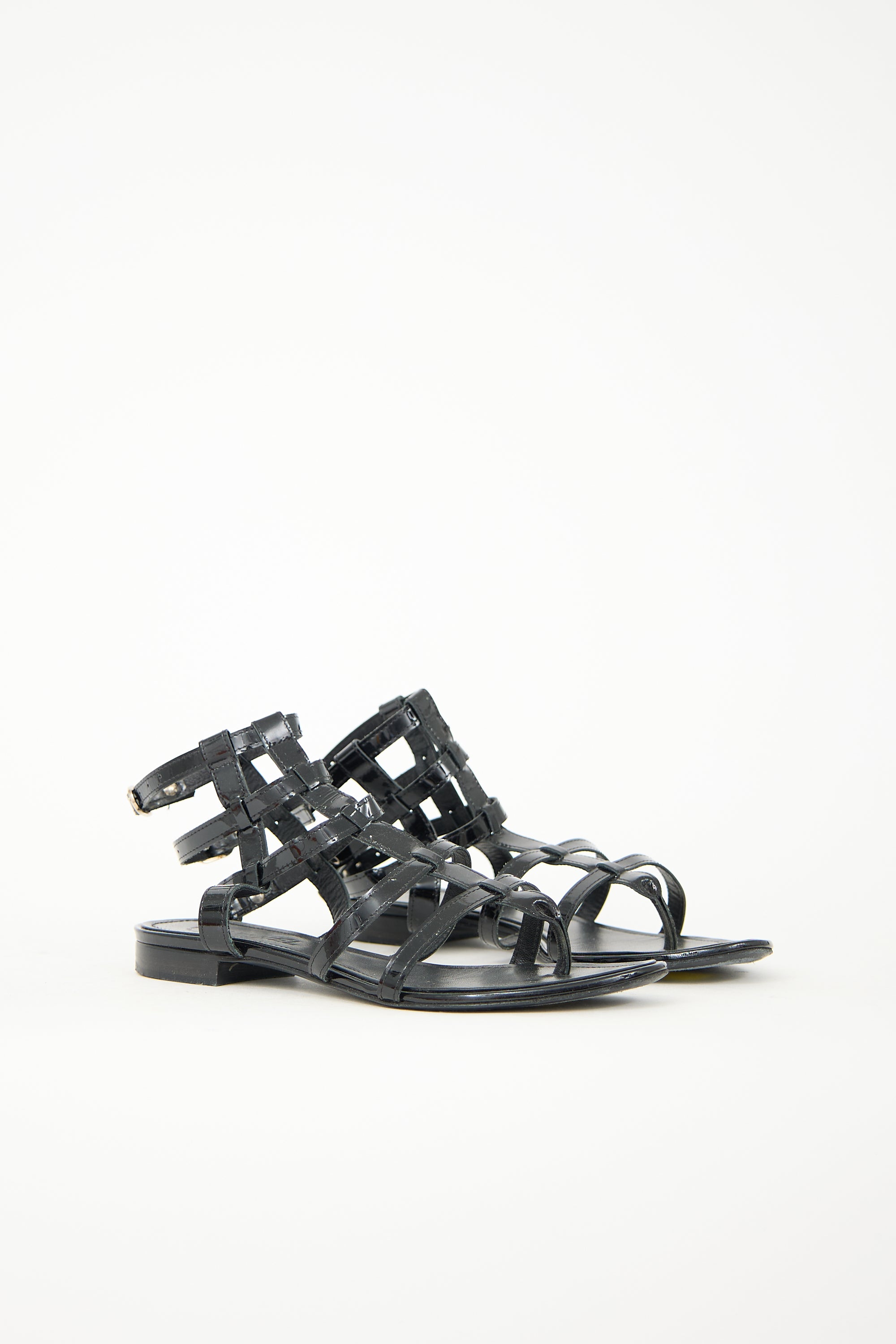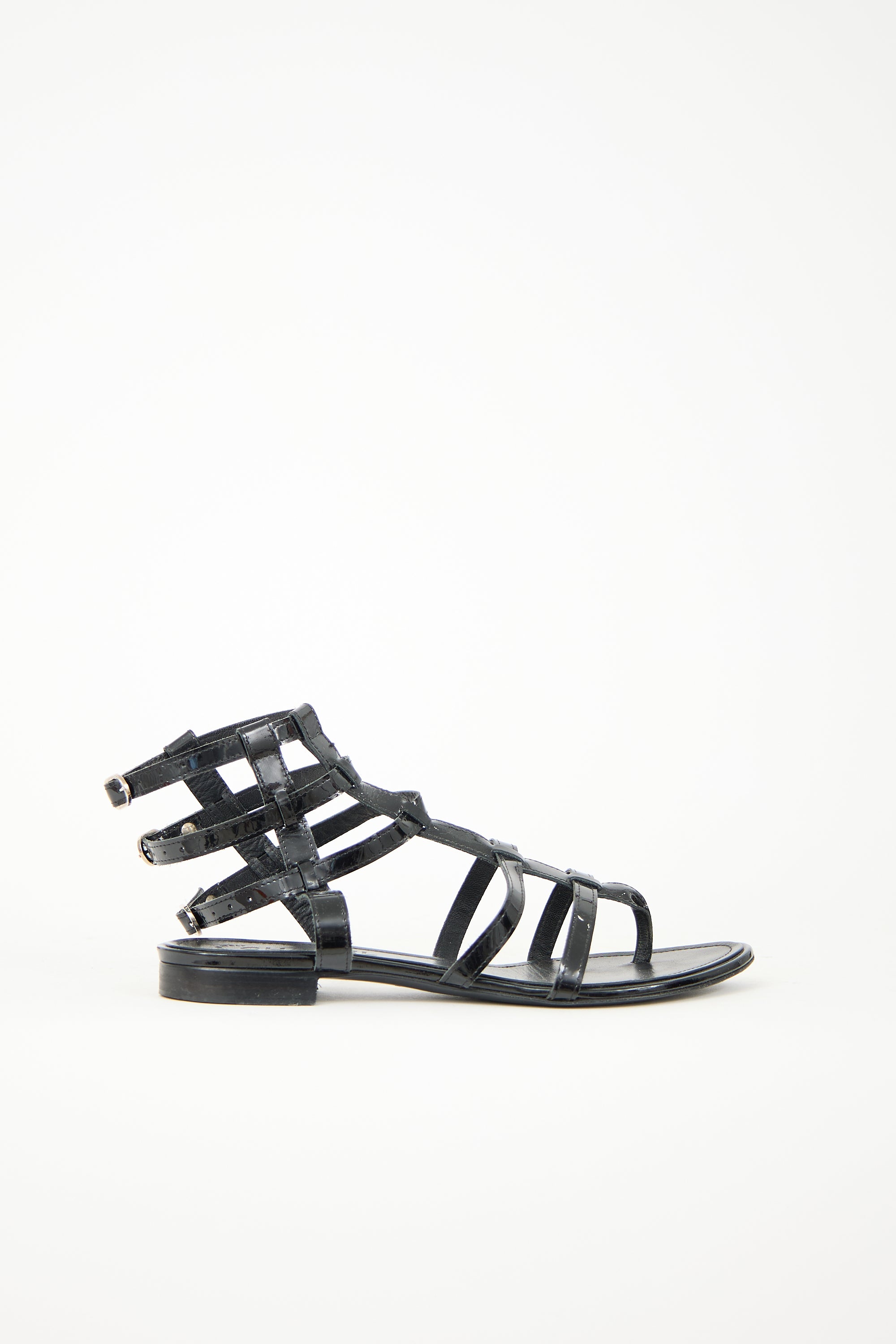 Pre-owned Chanel Cruise 2007 black patent leather gladiator sandals featuring open almond toe, strappy cage upper, three adjustable ankle straps, and stacked block heel. Comes with original box.