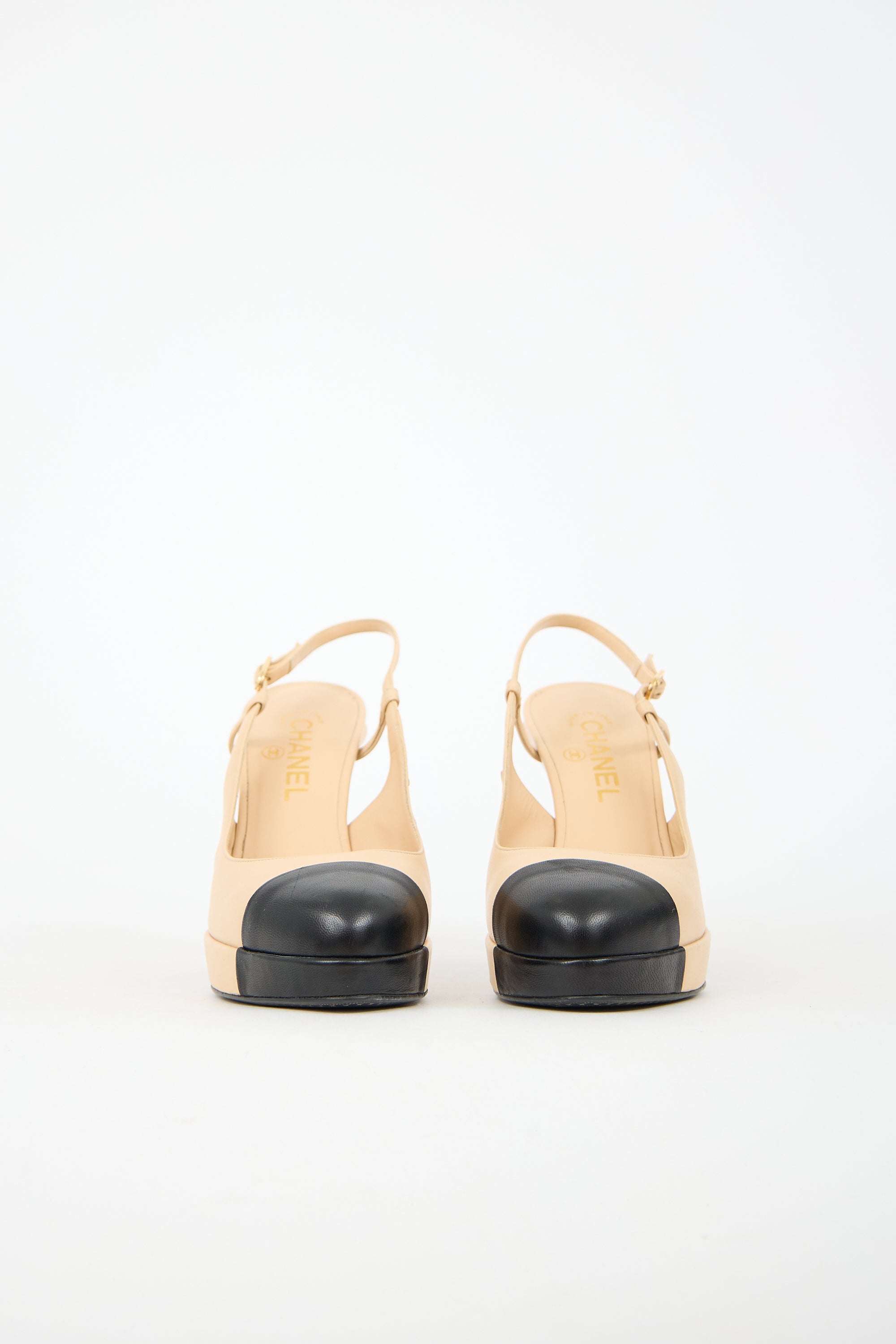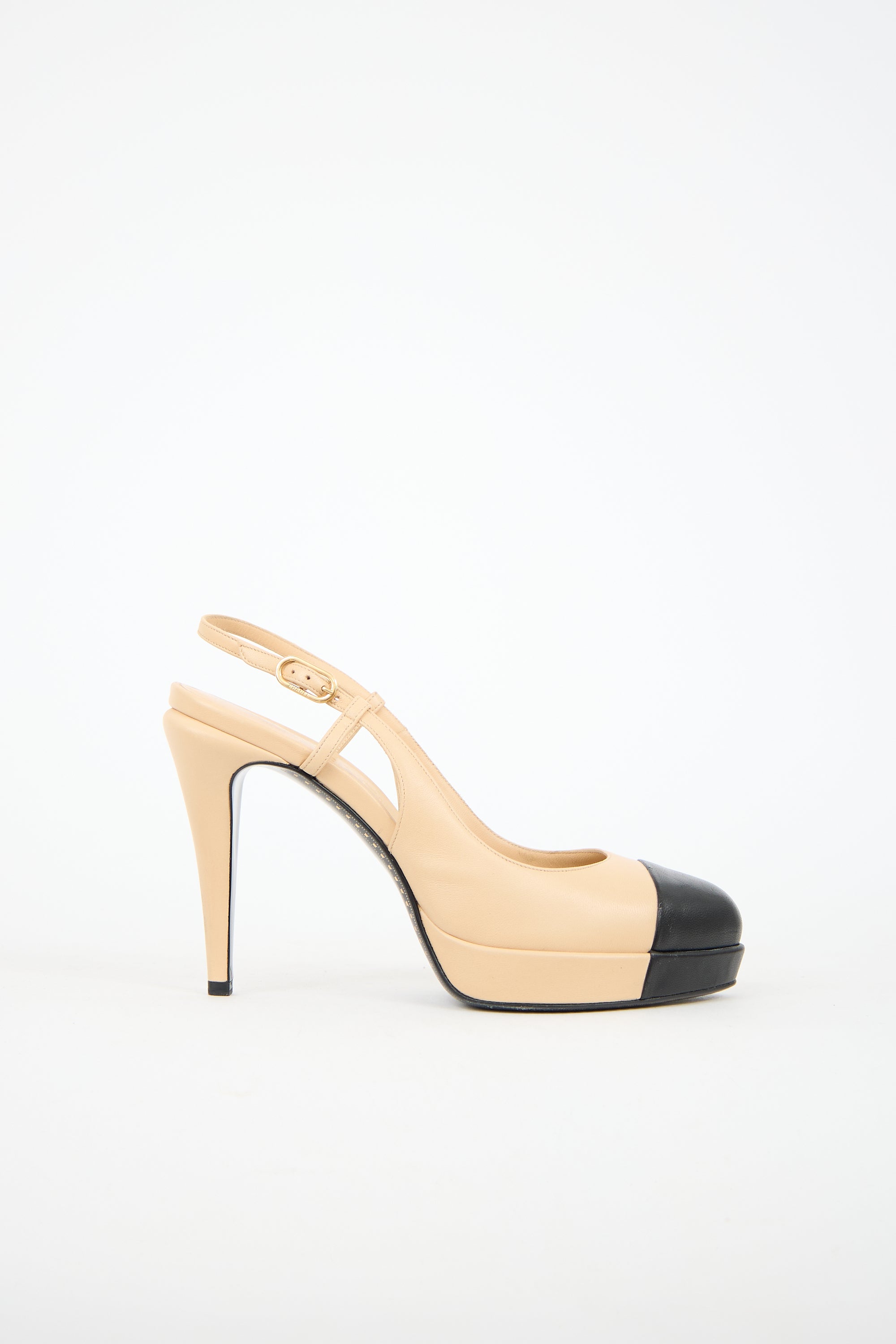 Pre-owned Chanel beige leather heels featuring almond toe, black leather cap, tonal interlocking CC embellishment at inner side, adjustable slingback strap, and covered platform and tapered heel.