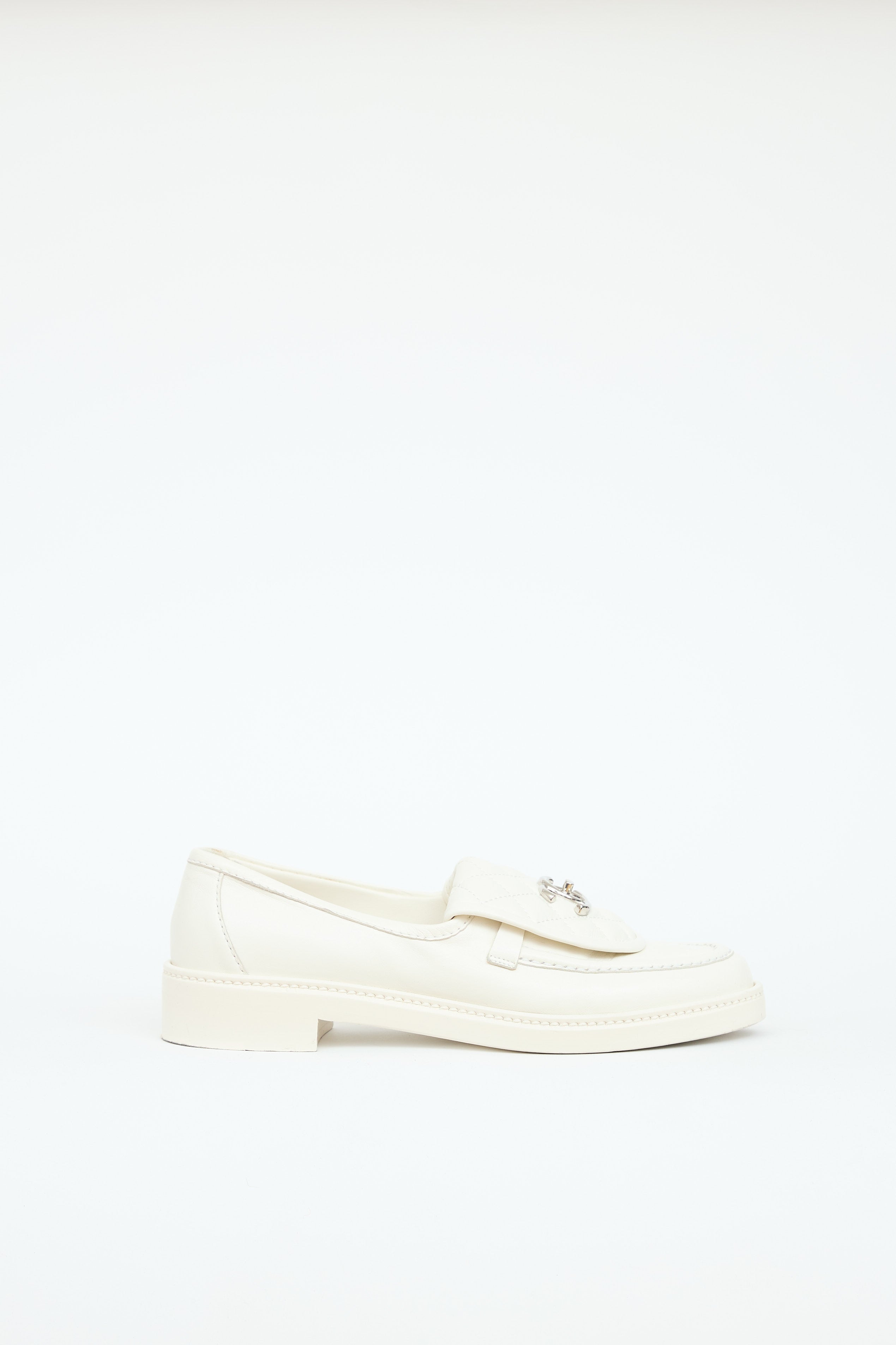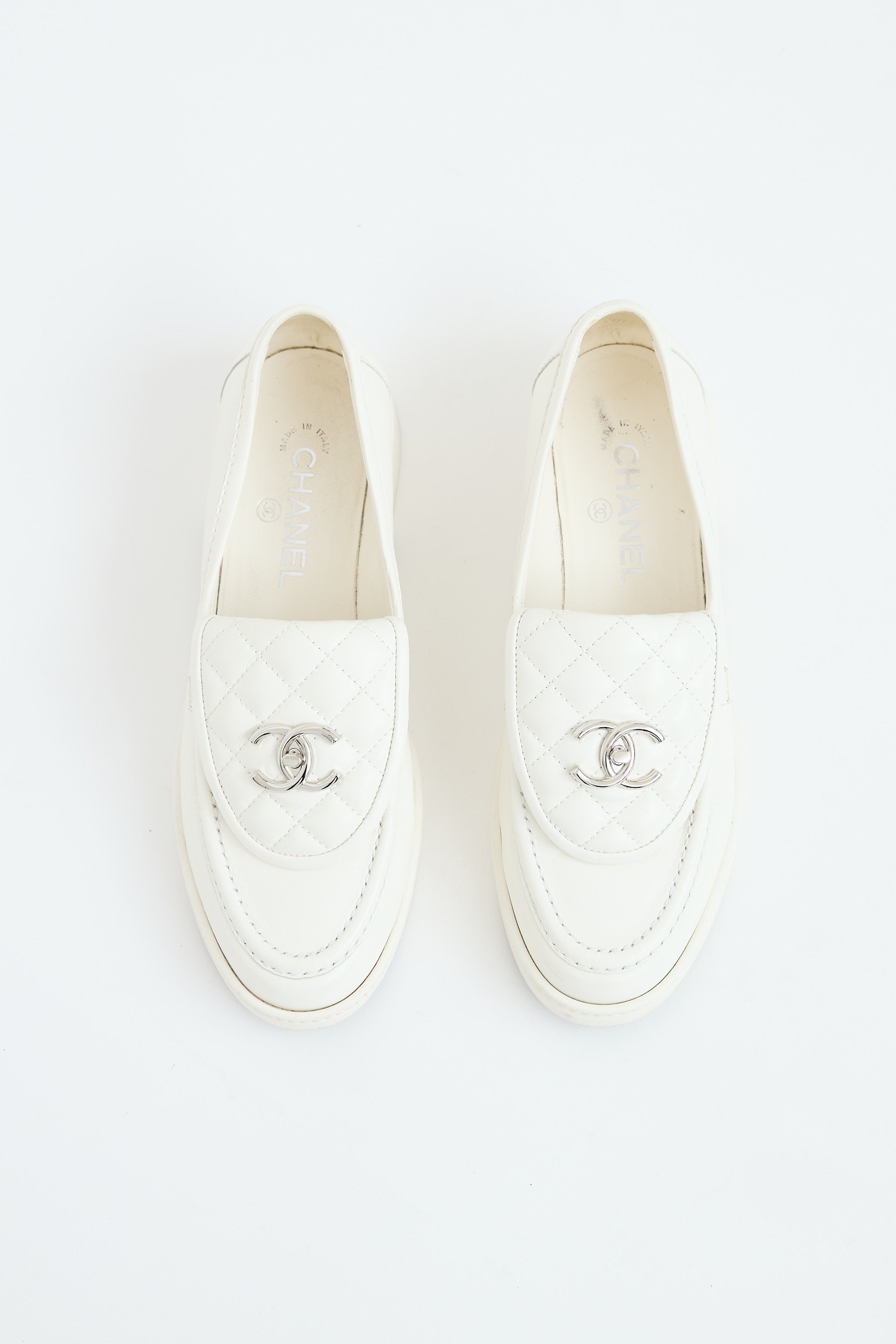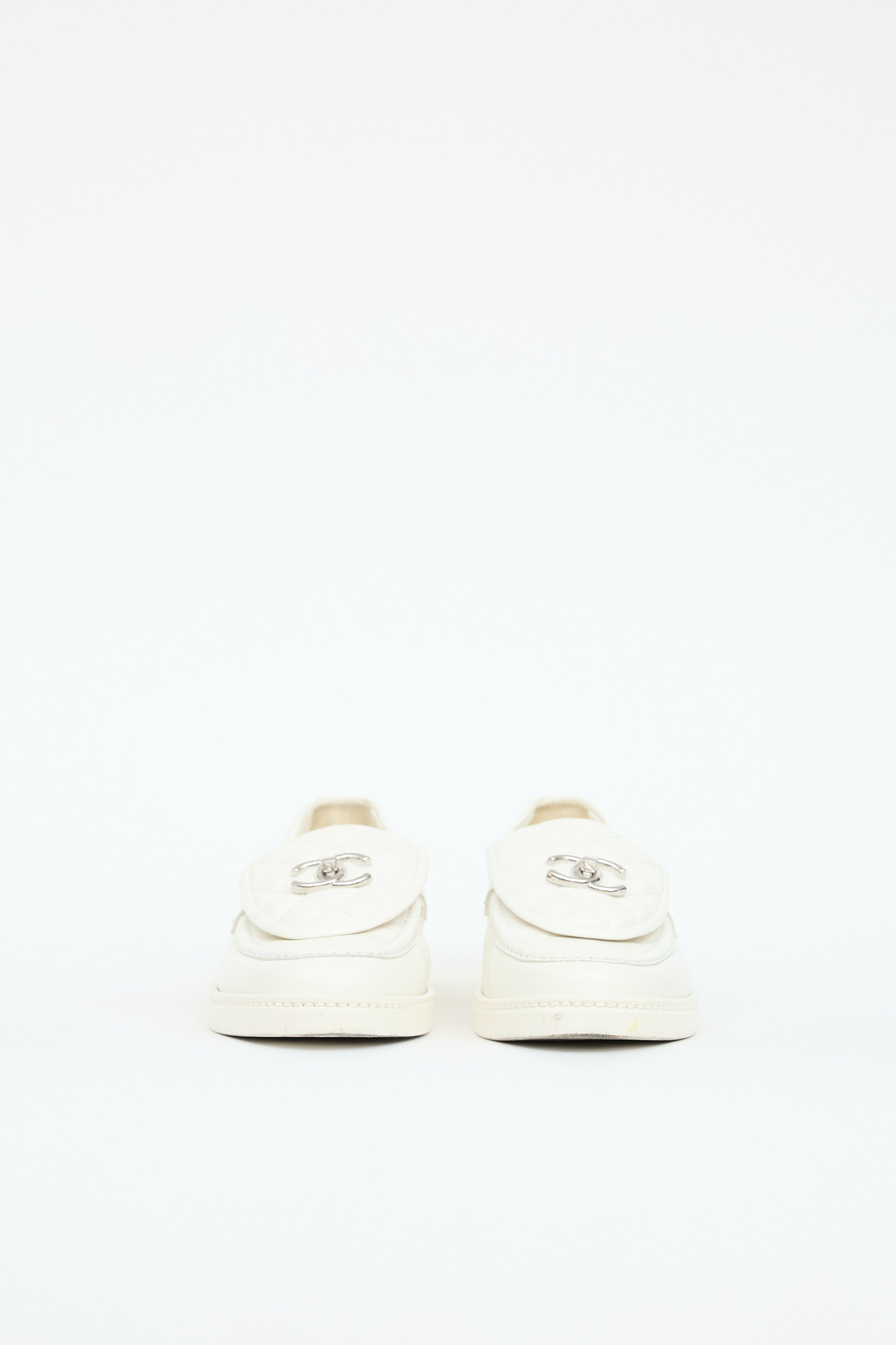 Pre-owned Chanel white quilted CC Turnlock loafer featuring almond toe, silver tone CC hardware at vamp with turn lock, quilted tongue, and wrapped block heel.
