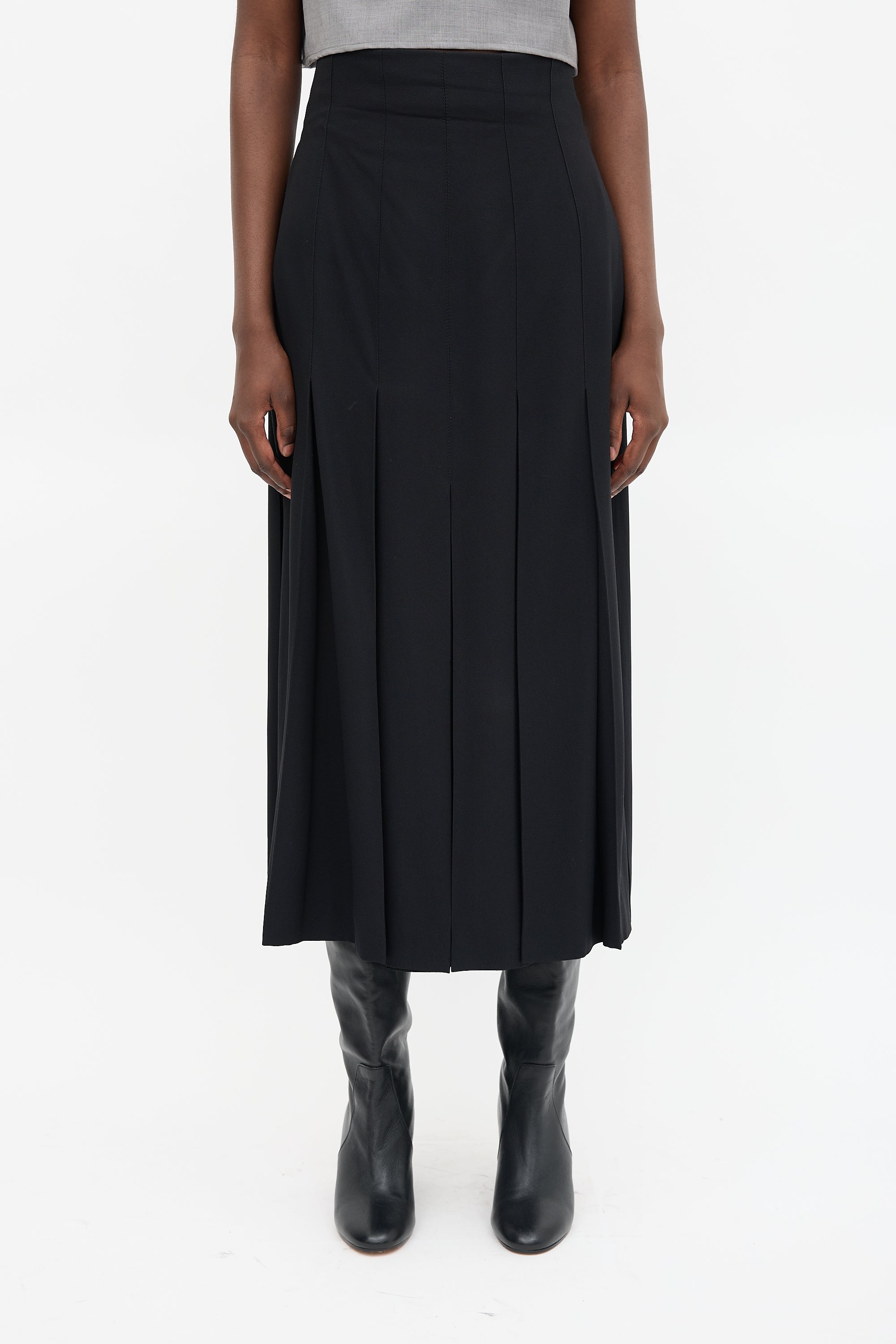 Pre-owned Chanel vintage black skirt featuring high waist, concealed back zip, front and back vents, and box pleats. Lined. c. 1990s.
