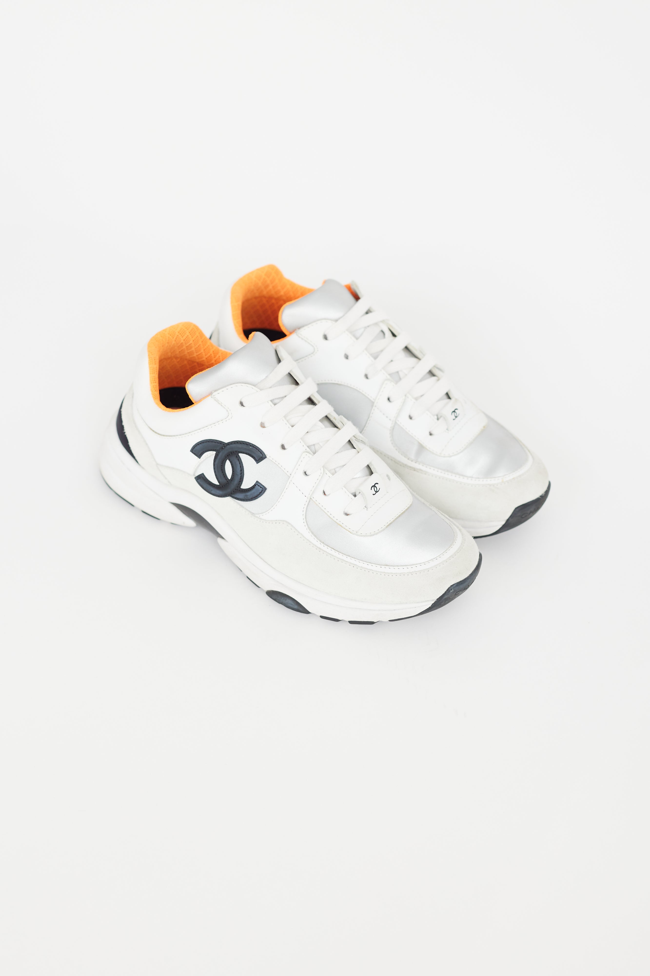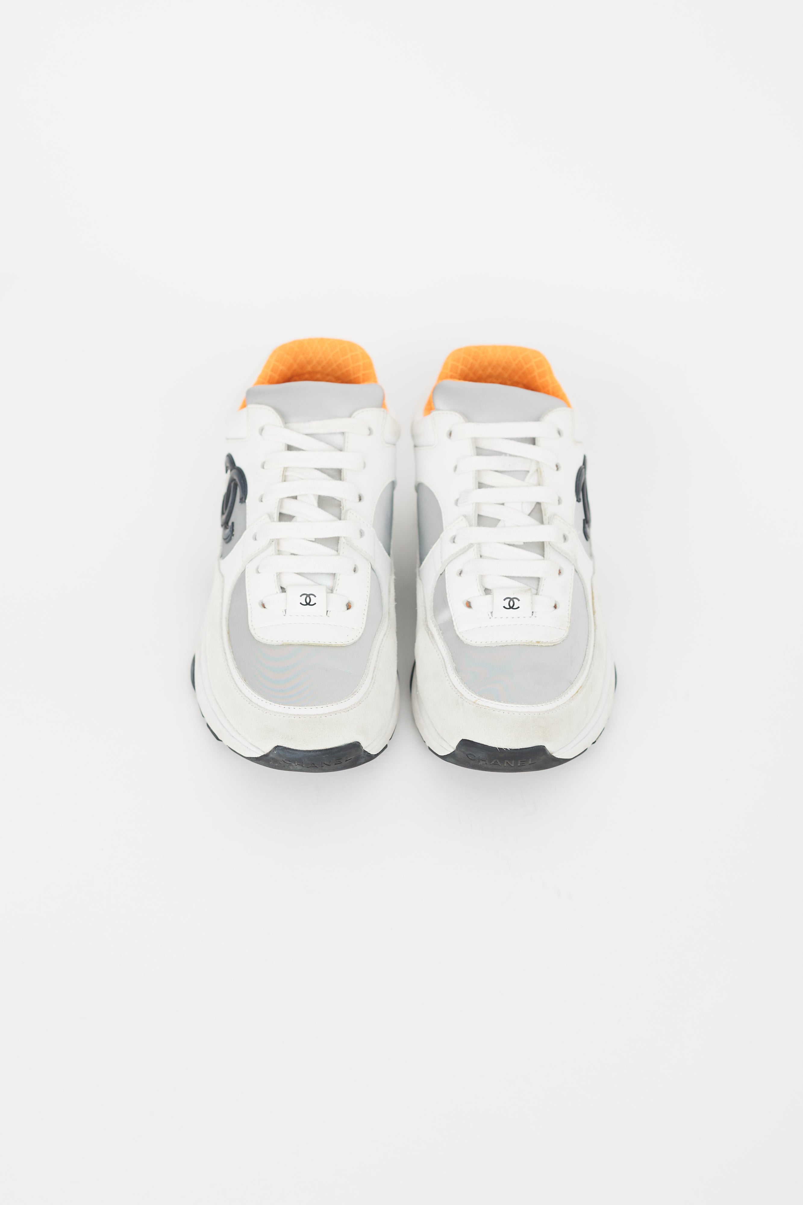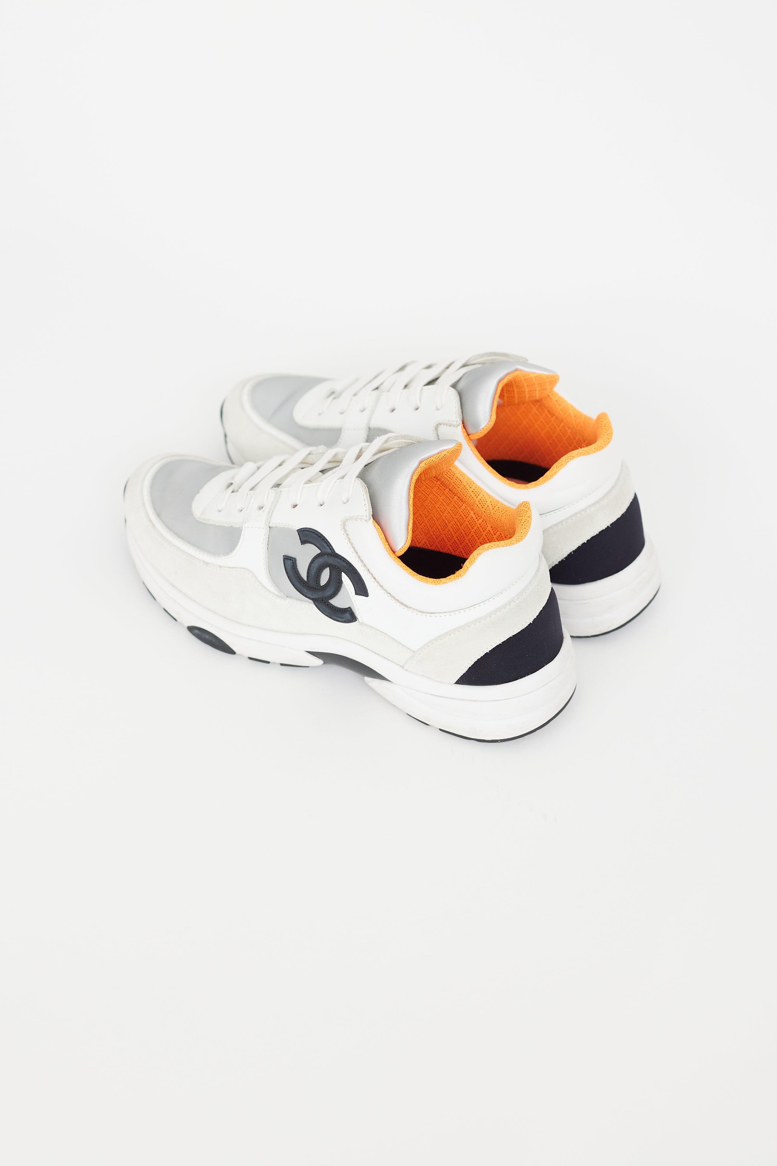 Pre-owned Chanel multicolour leather sneaker featuring grey suede panel throughout upper, orange interior lining, black logo at side and tongue, and white lace up front.