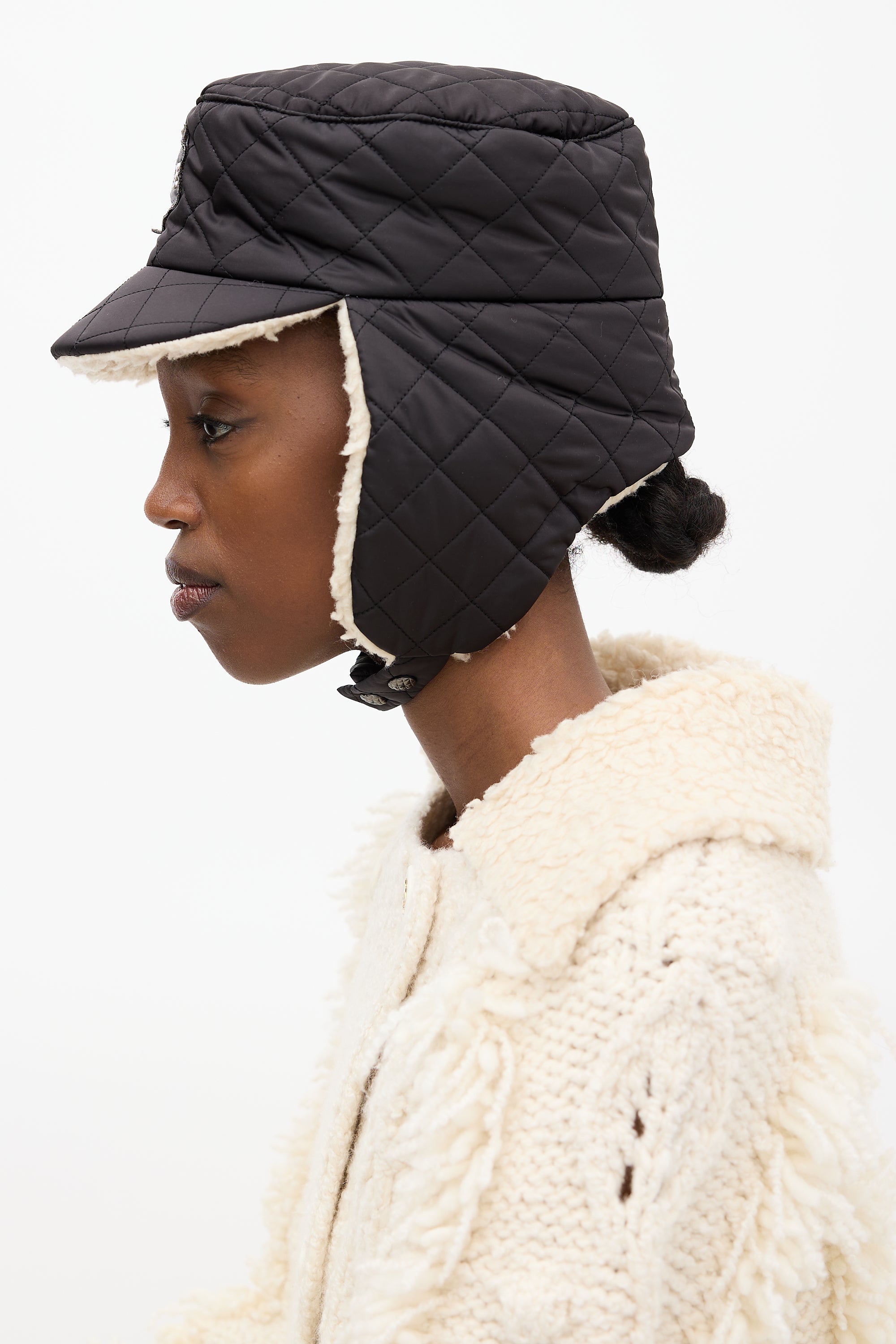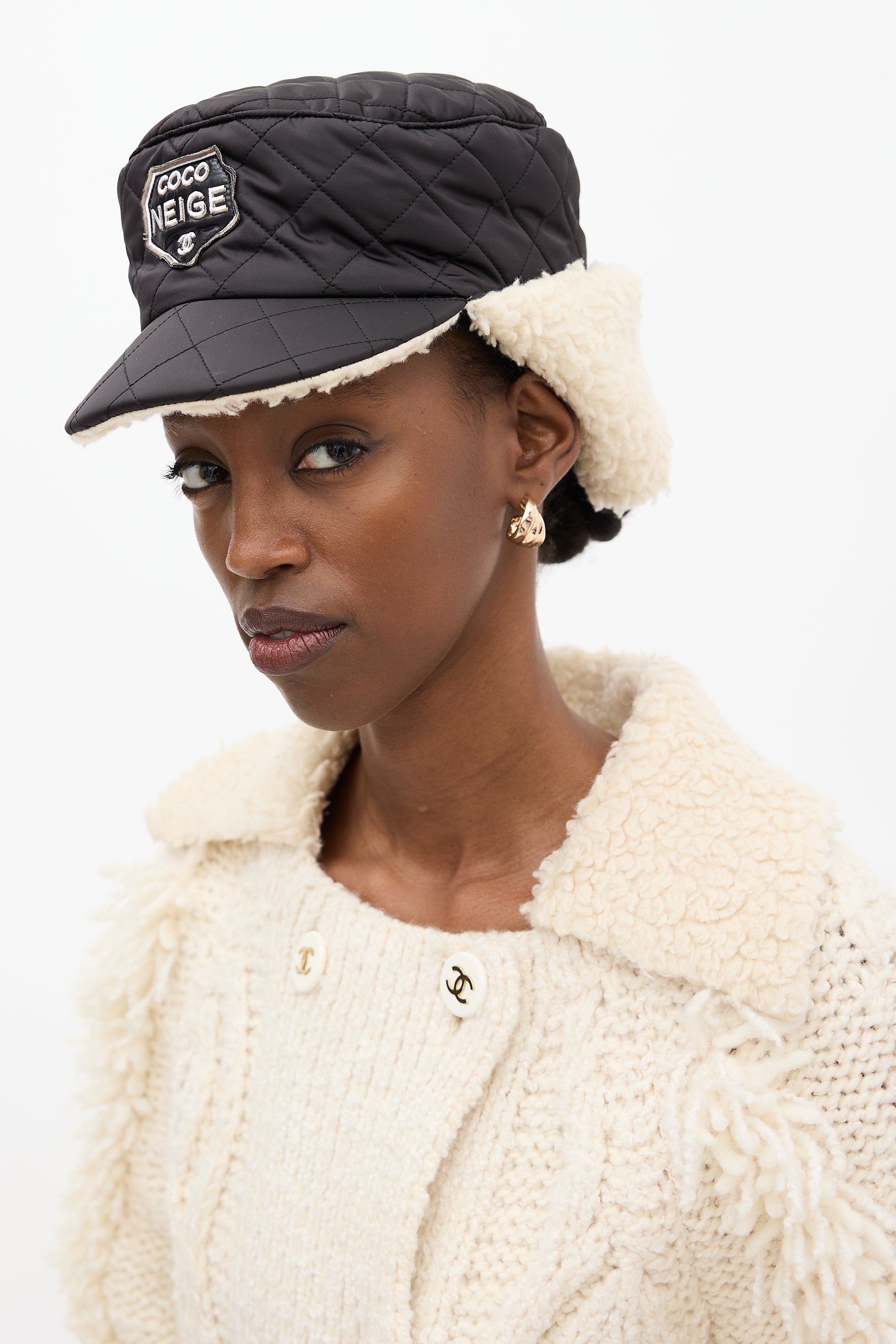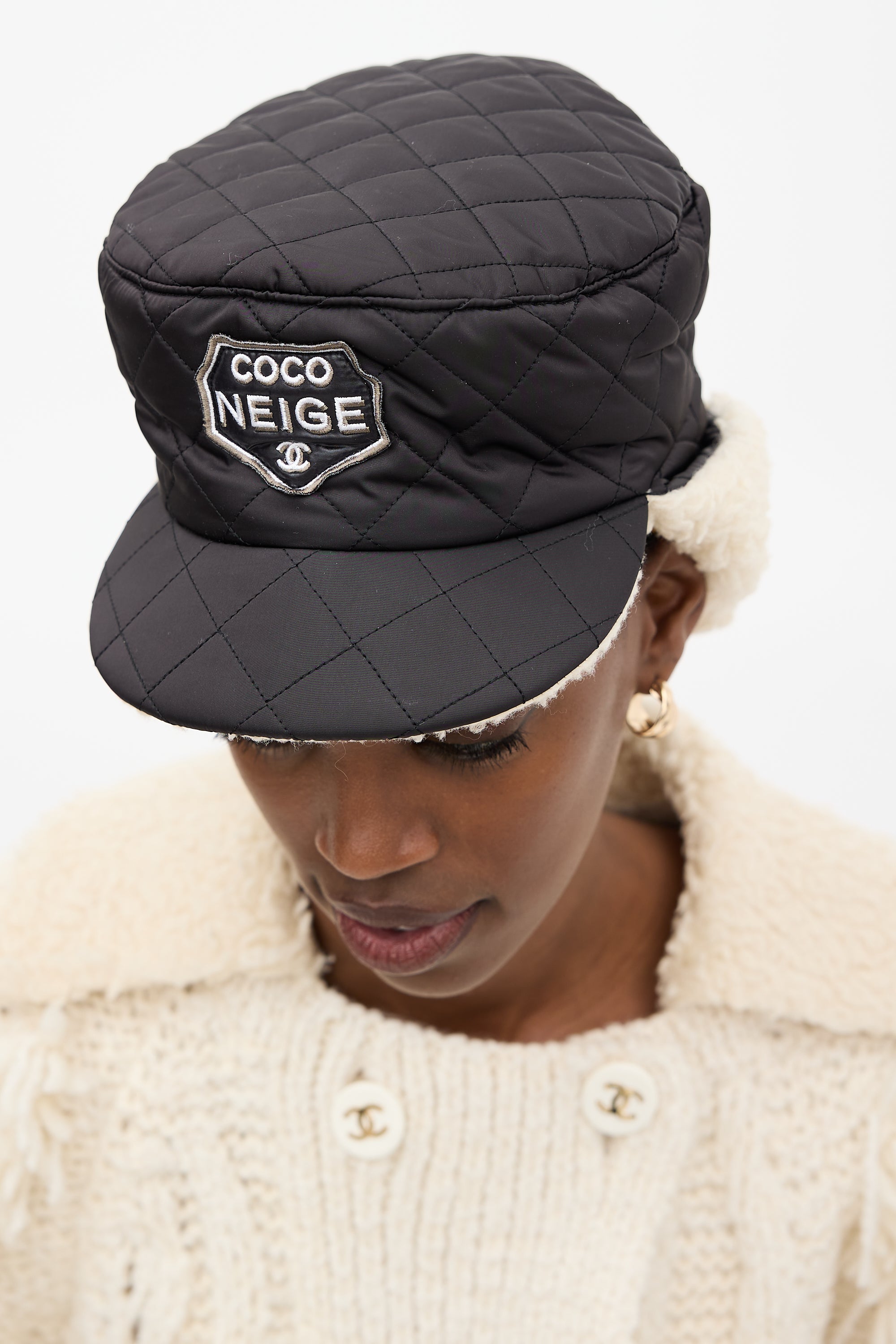 Pre-owned Chanel Winter 2018 black trapper hat featuring "Coco Neige" patch at front, puffer upper, shearling lining at flaps and under brim, and Ruthenium hardware snap button fastening.