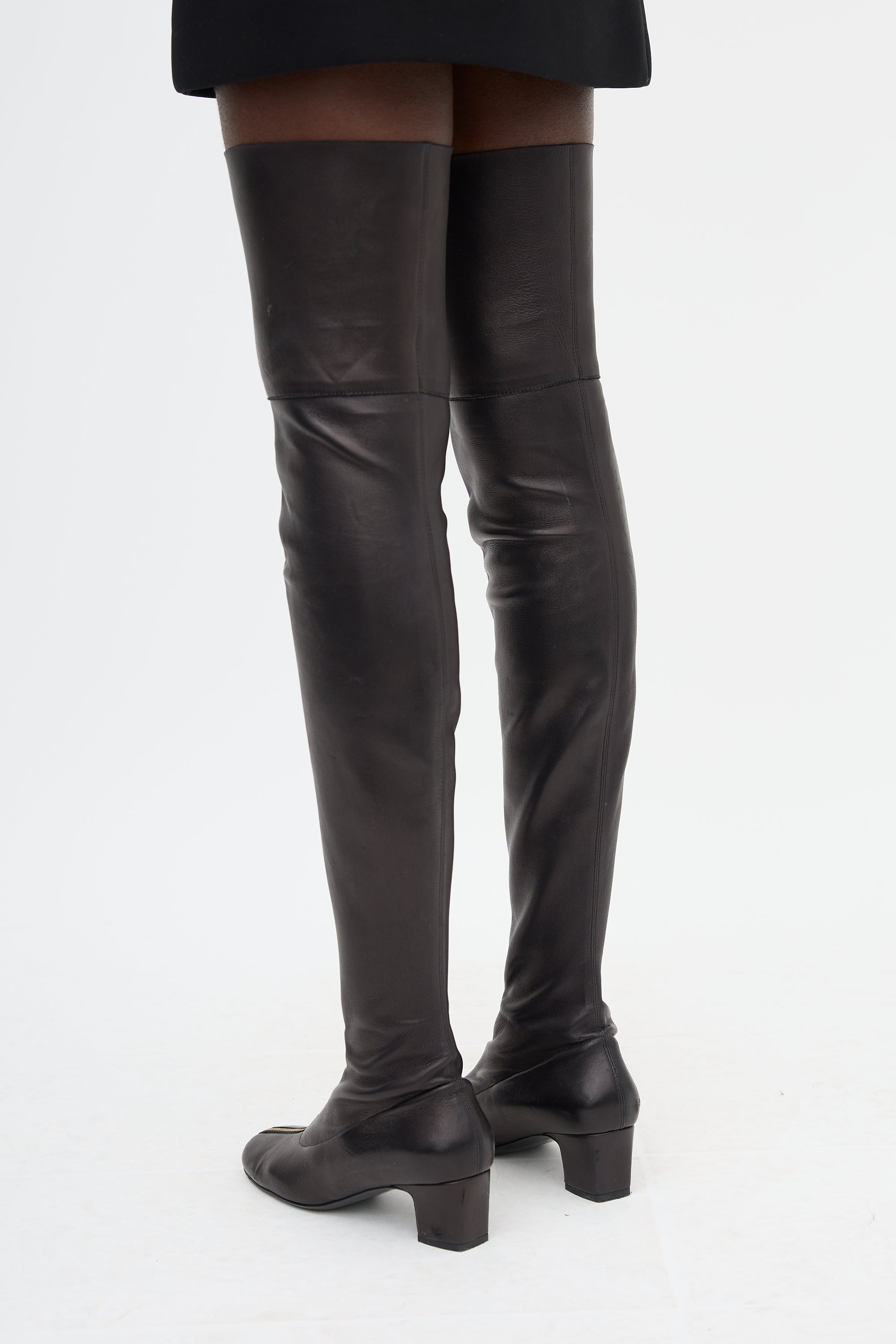 Pre-owned Chanel black leather boots featuring rounded toe, thigh high shaft, gold tone front zip, and covered block heel.