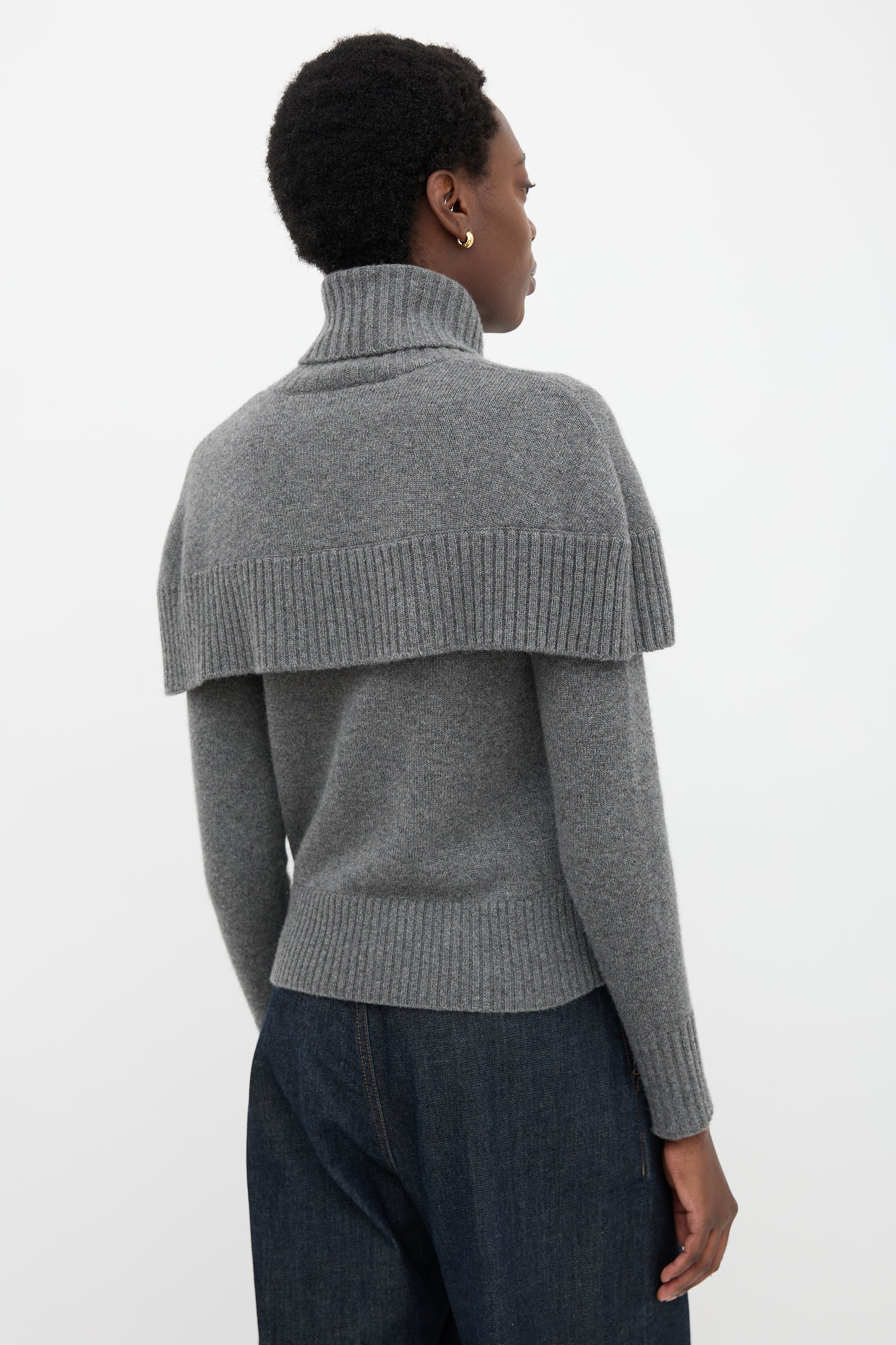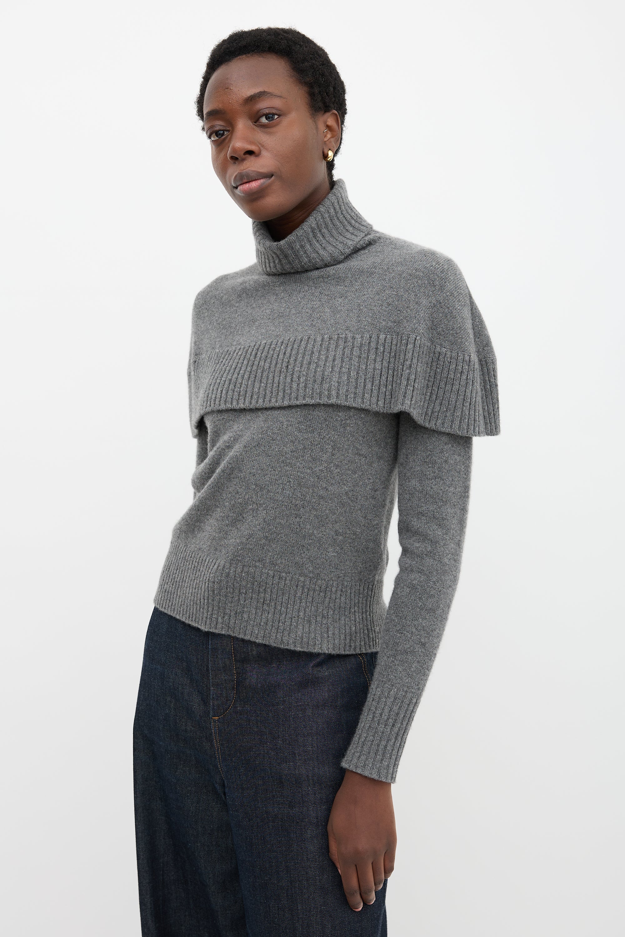 Pre-owned Chloé grey cashmere sweater featuring turtleneck, ruffle yoke, and ribbed collar, ruffle, hem, and cuffs.