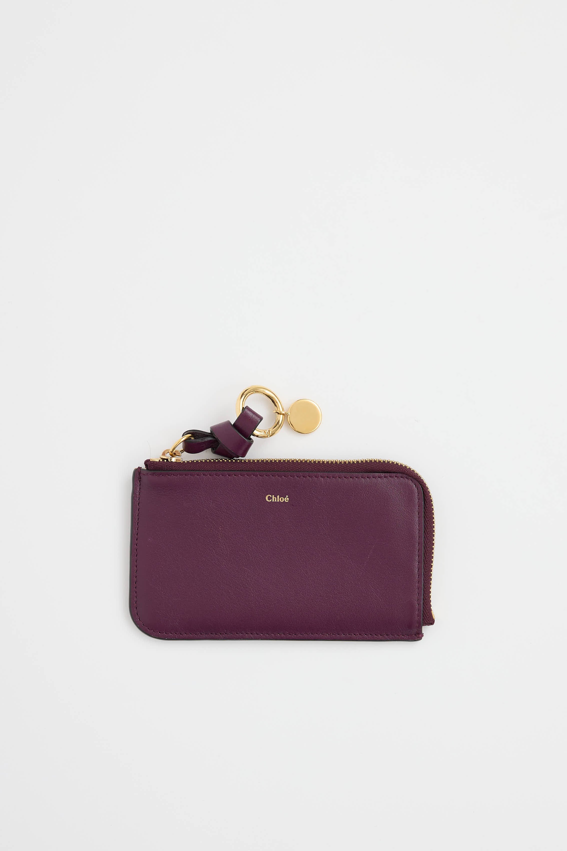 Pre-owned Chloé purple leather Alphabet card holder featuring gold stamped logo at front, zip closure at opening with knotted charm zipper pull, gold tone clasp and charm, one main compartment, four card slots and one slip pocket at back.