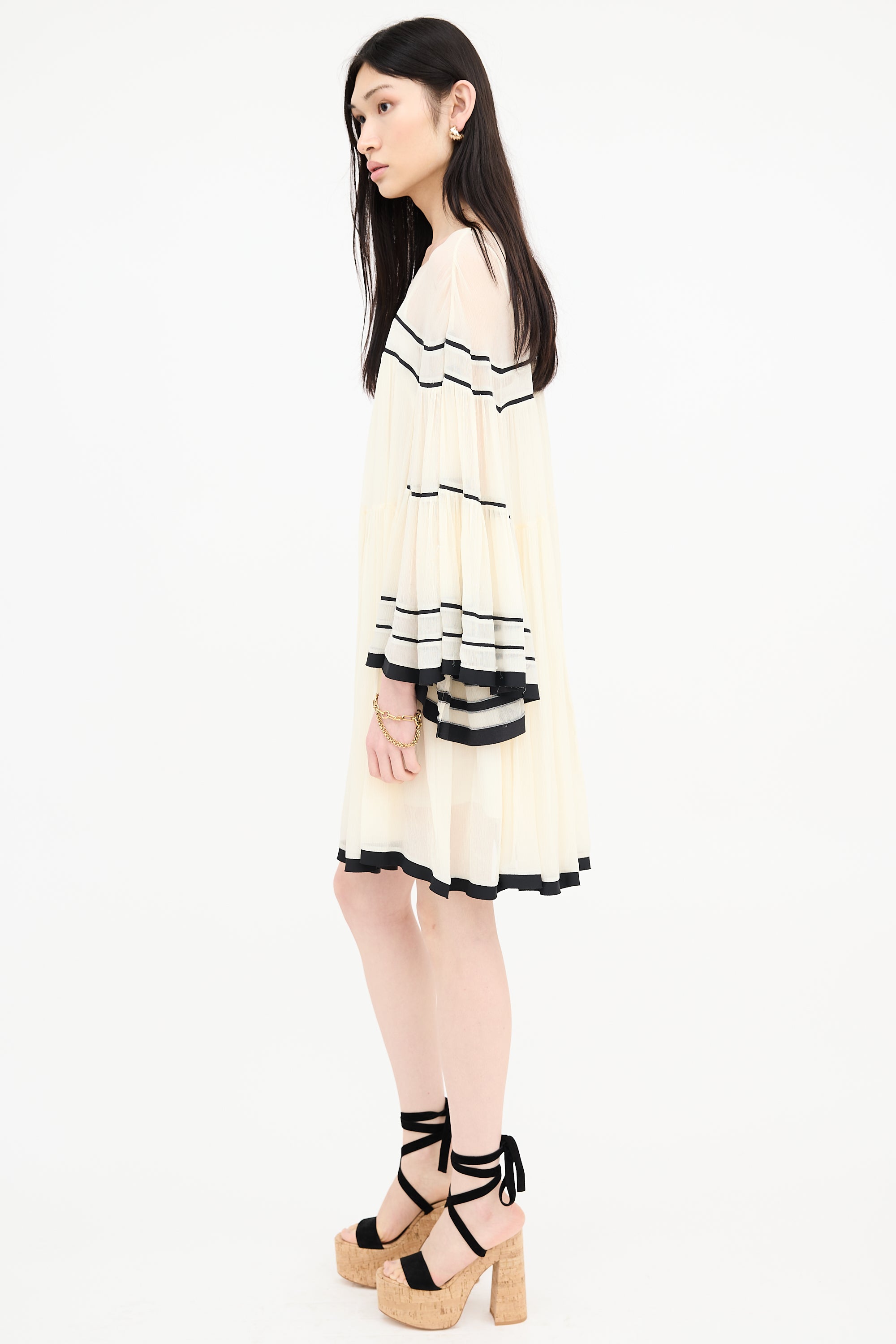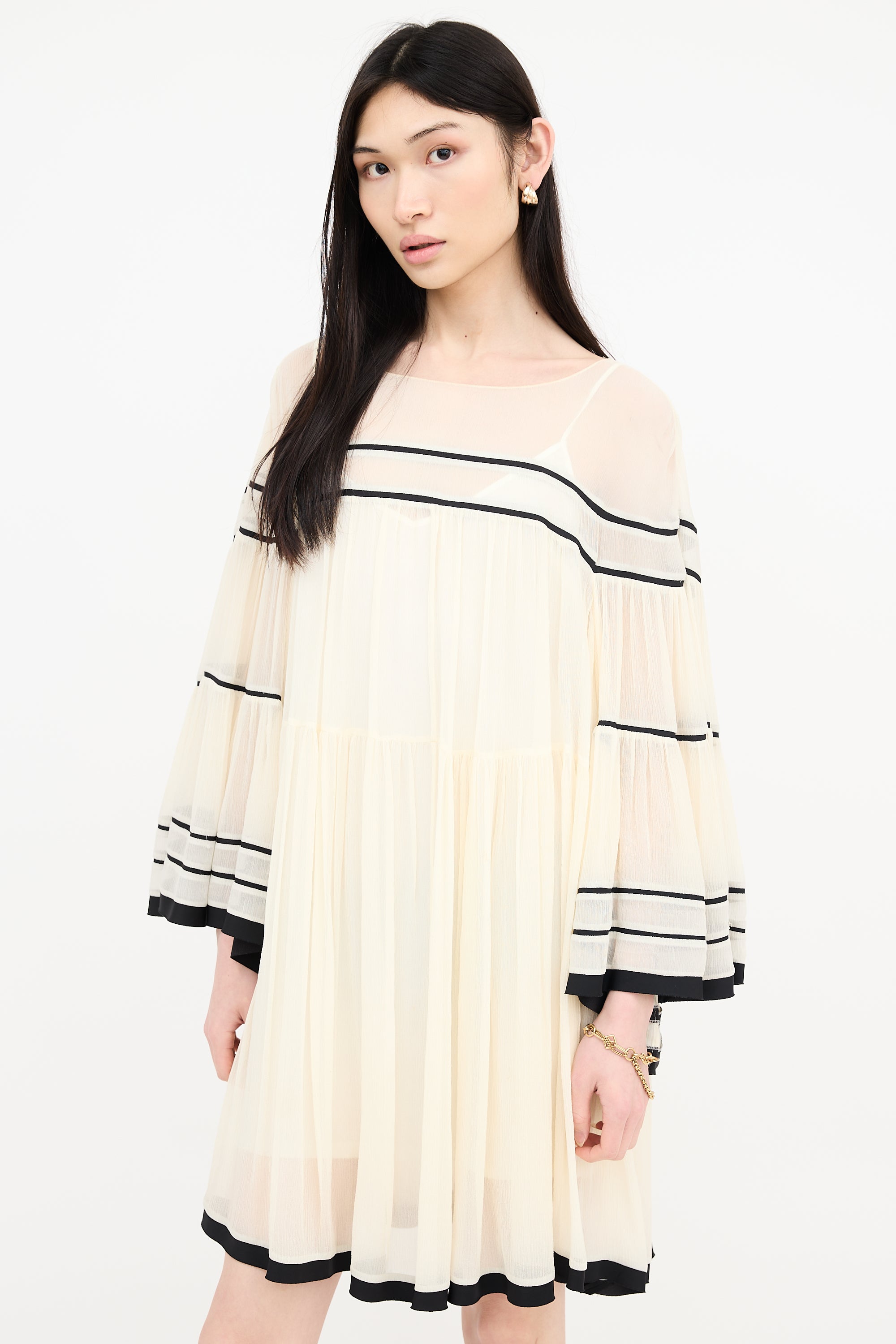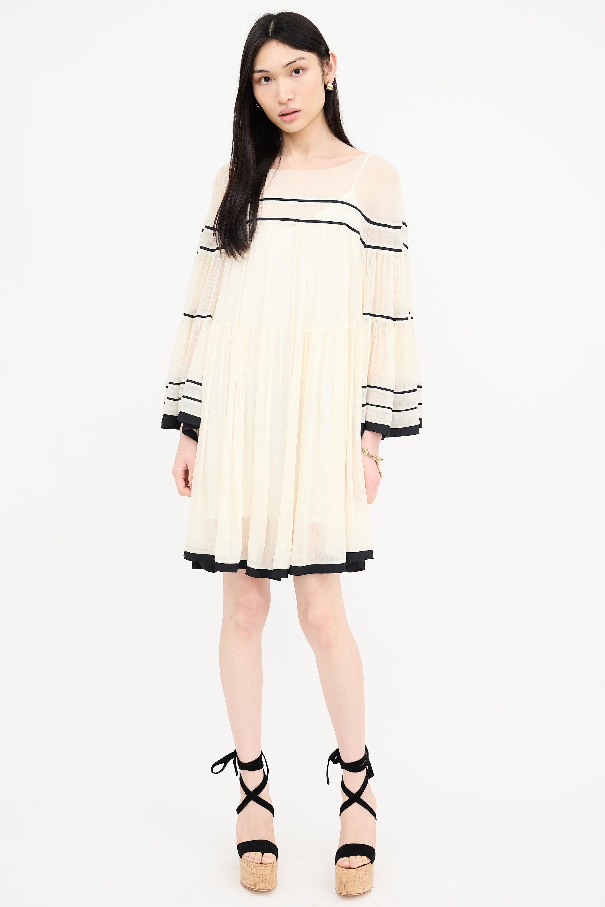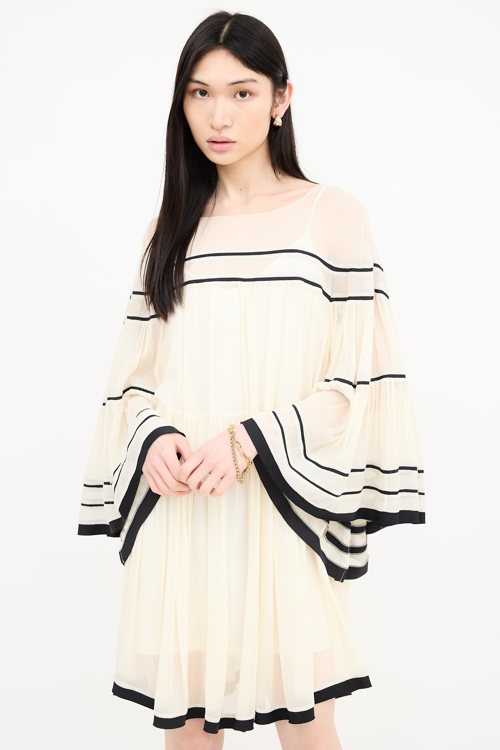 Pre-owned Chloé cream and black silk sheer mini dress featuring boat neckline, black stripe detailing, and bell sleeves.
