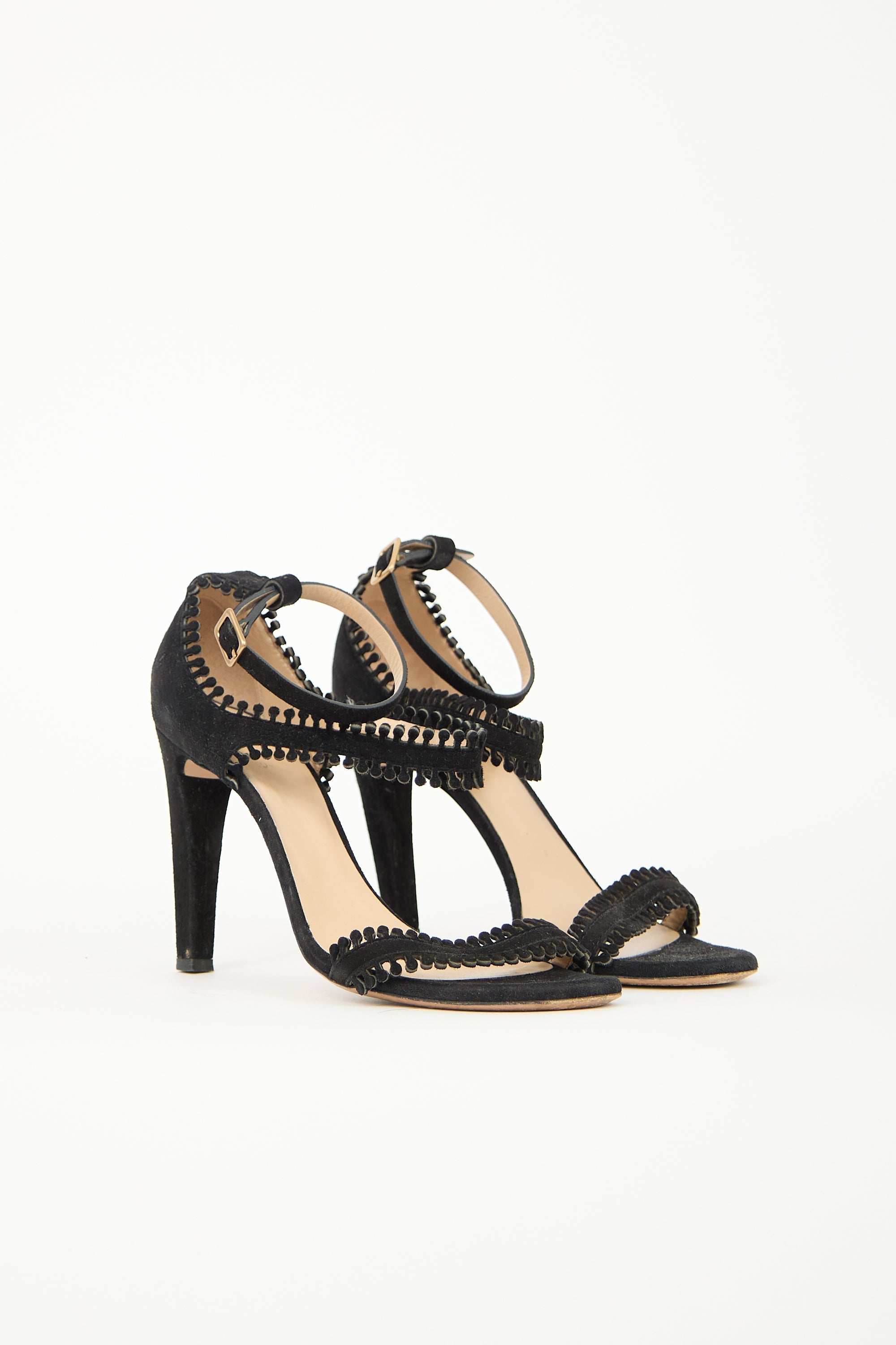 Pre-owned Chloé black suede heels featuring almond toe, decorative trim, adjustable ankle straps, and covered stiletto heel.