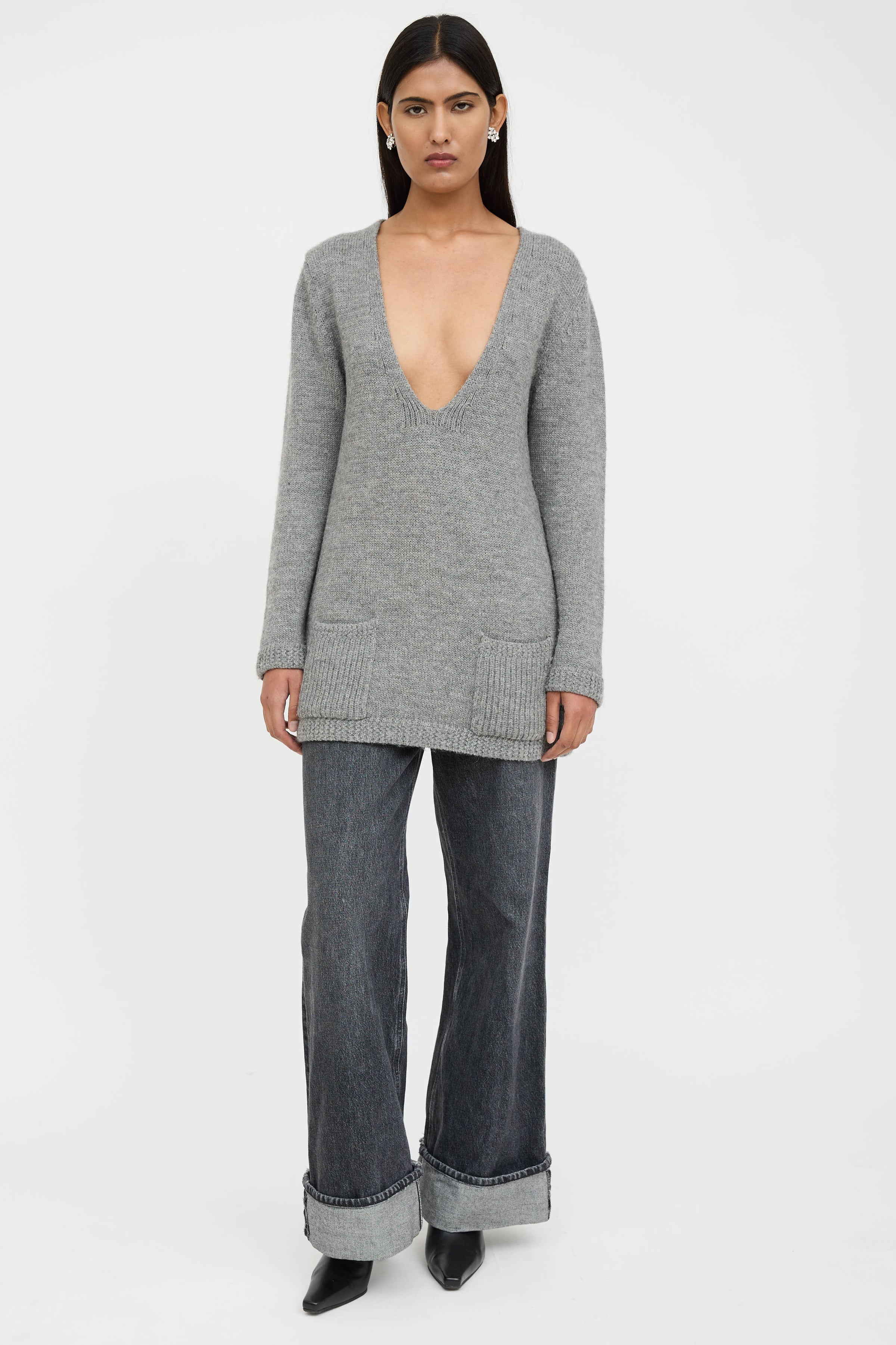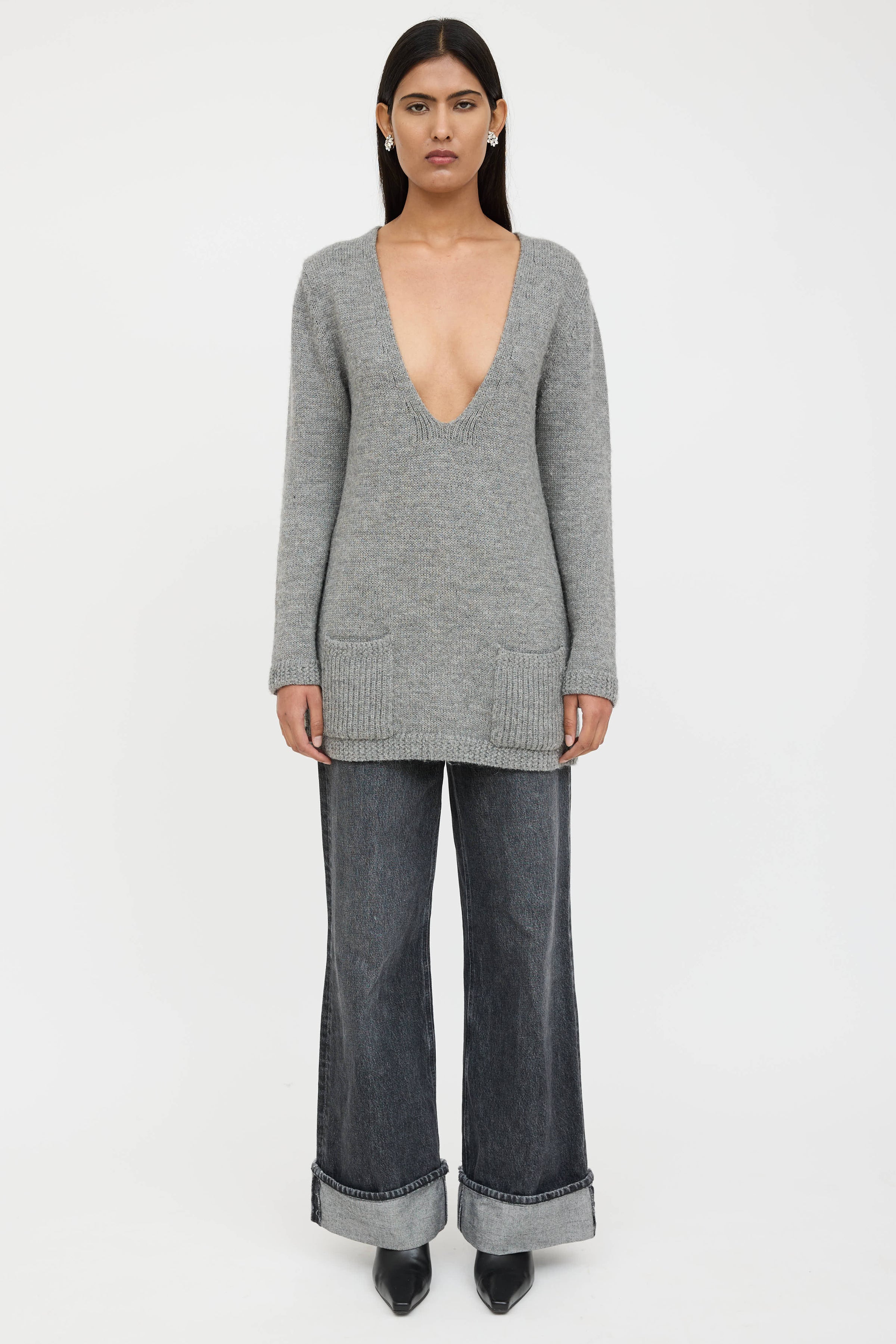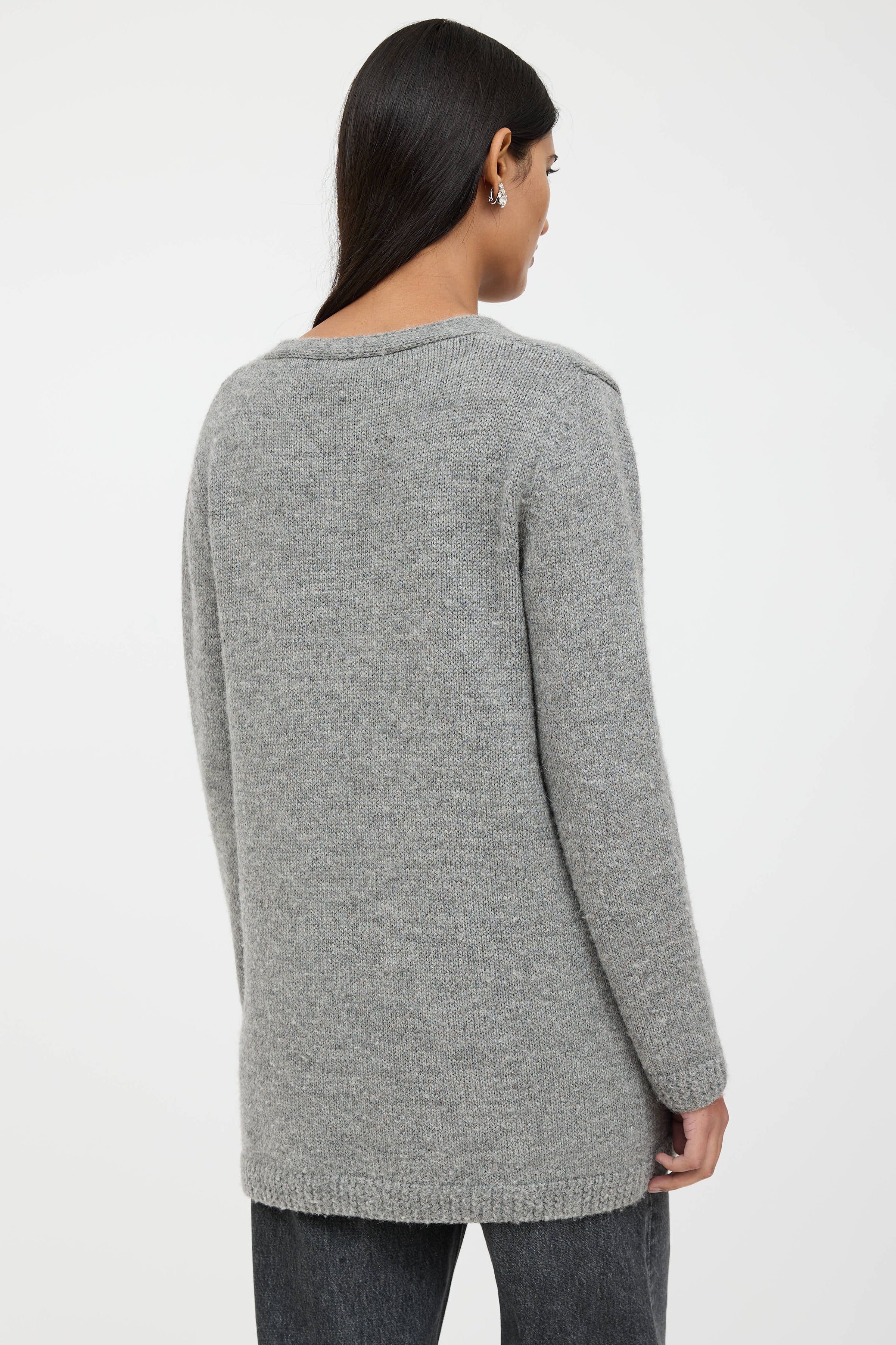 Pre-owned Chloé grey wool knit sweater featuring a V-neckline, long sleeves, two patch pockets at hip, and ribbed hem.