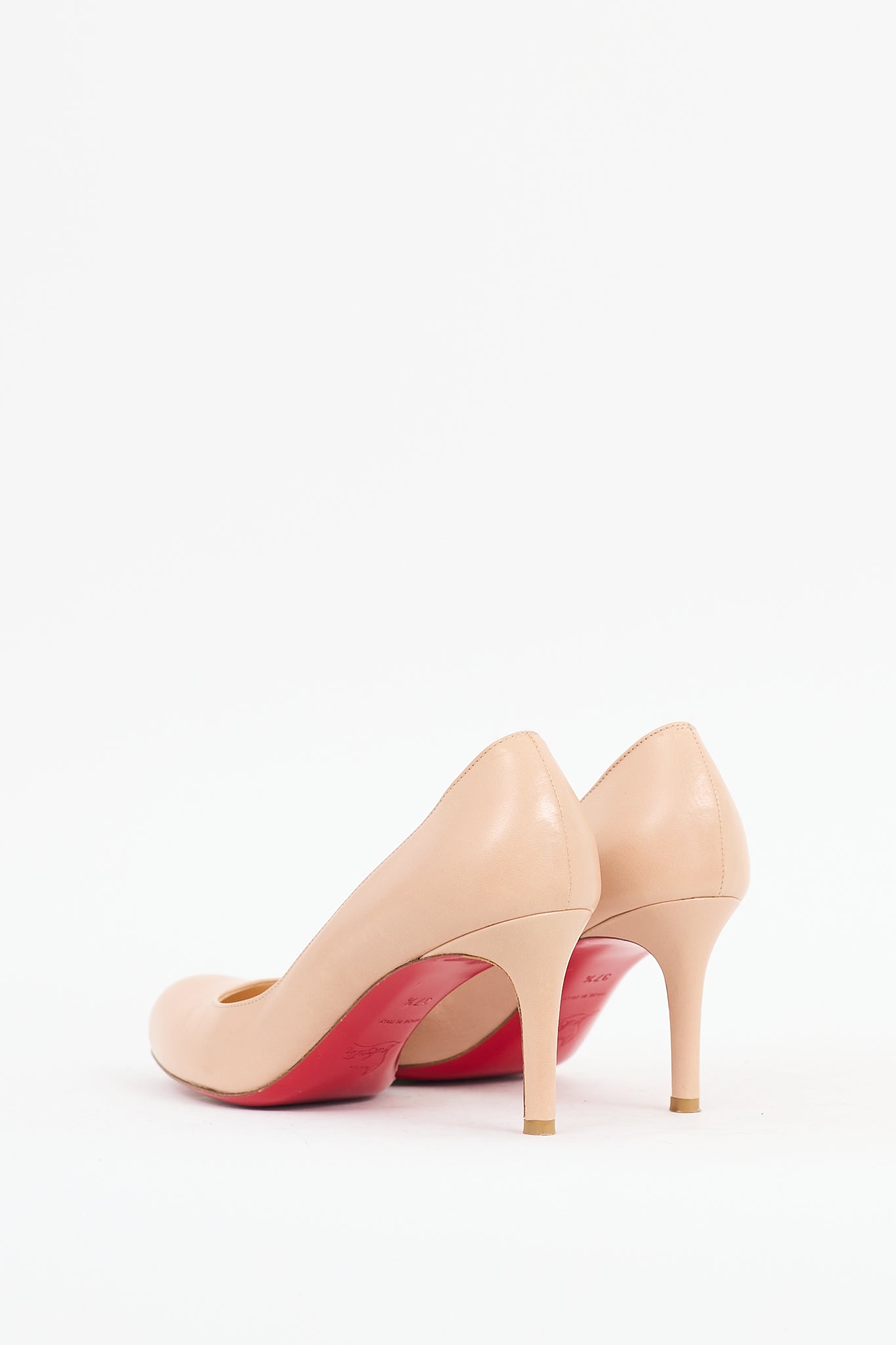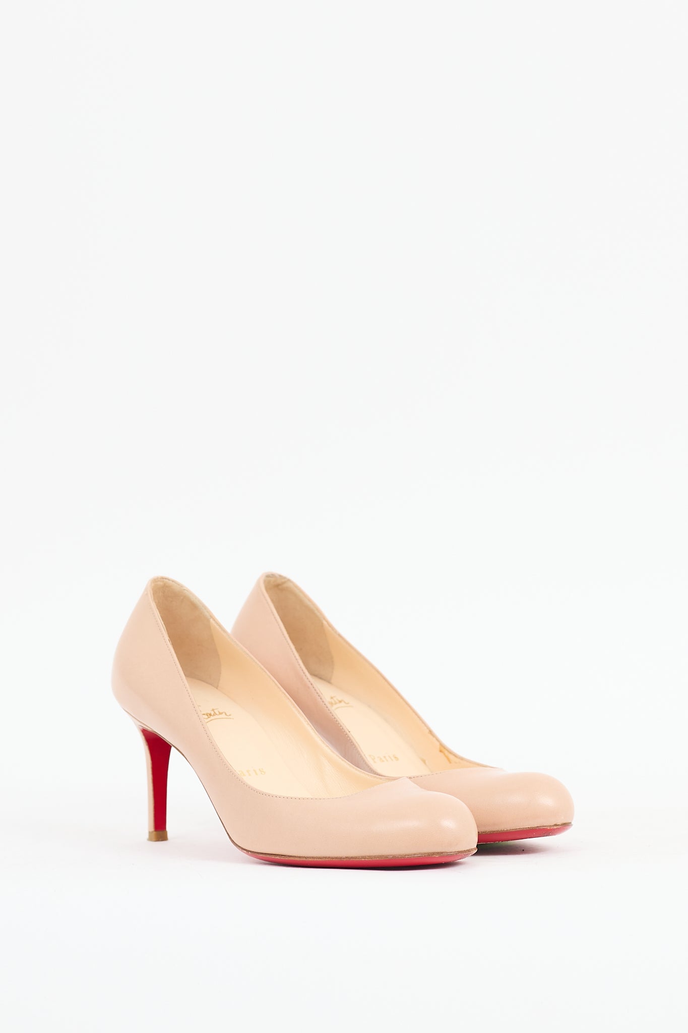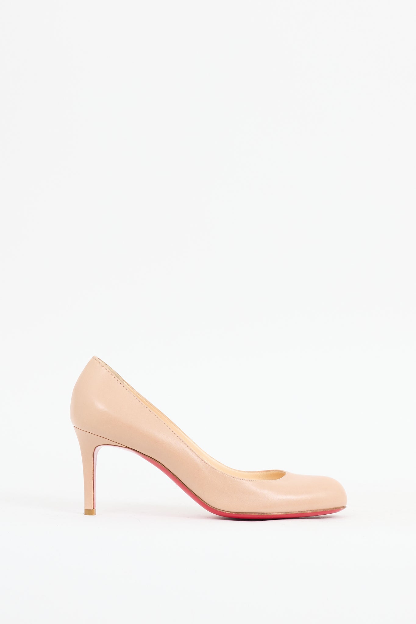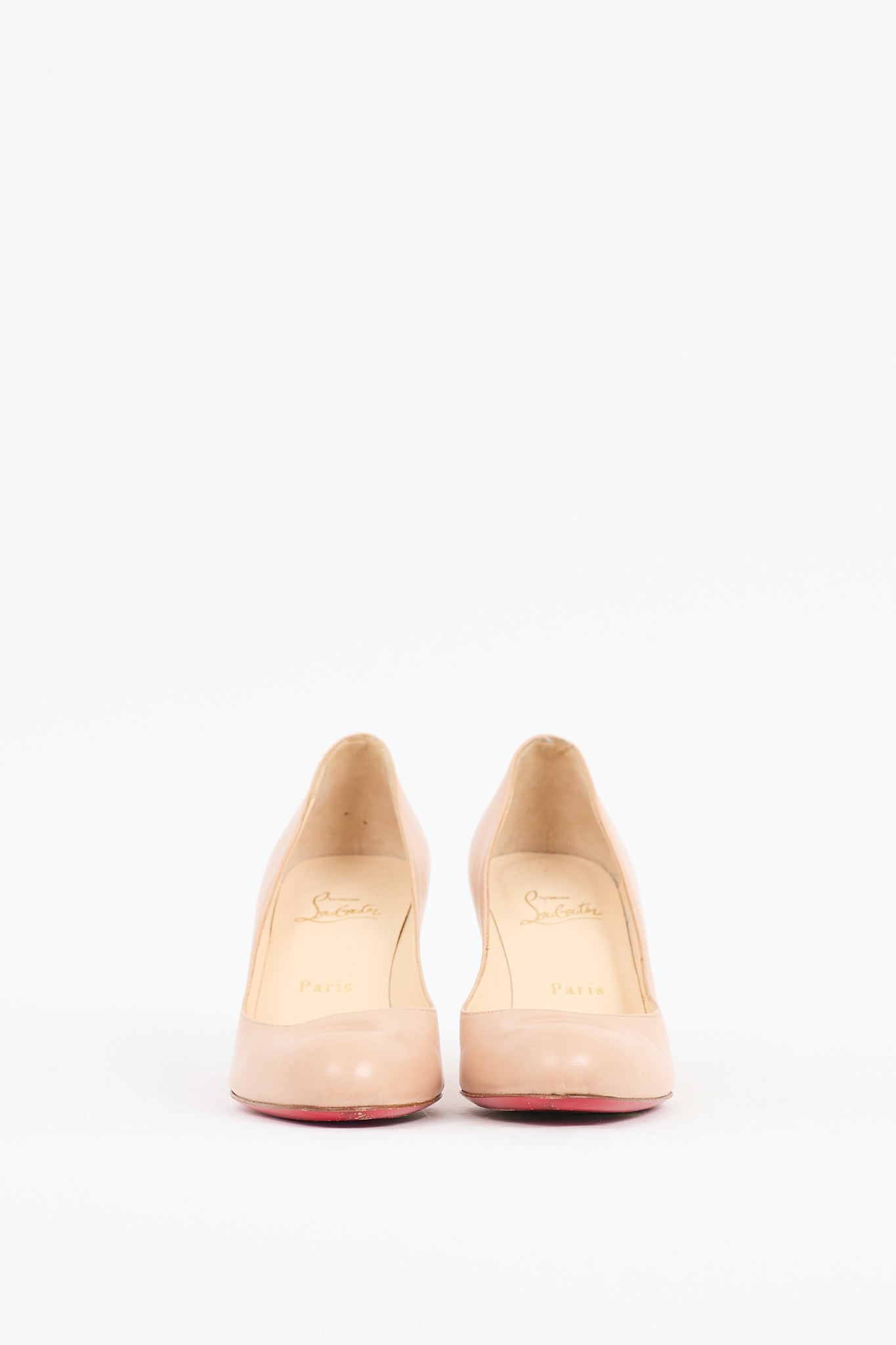 Pre-owned Christian Louboutin beige leather pumps featuring a round toe, wrapped stiletto heel, and slip on entry.