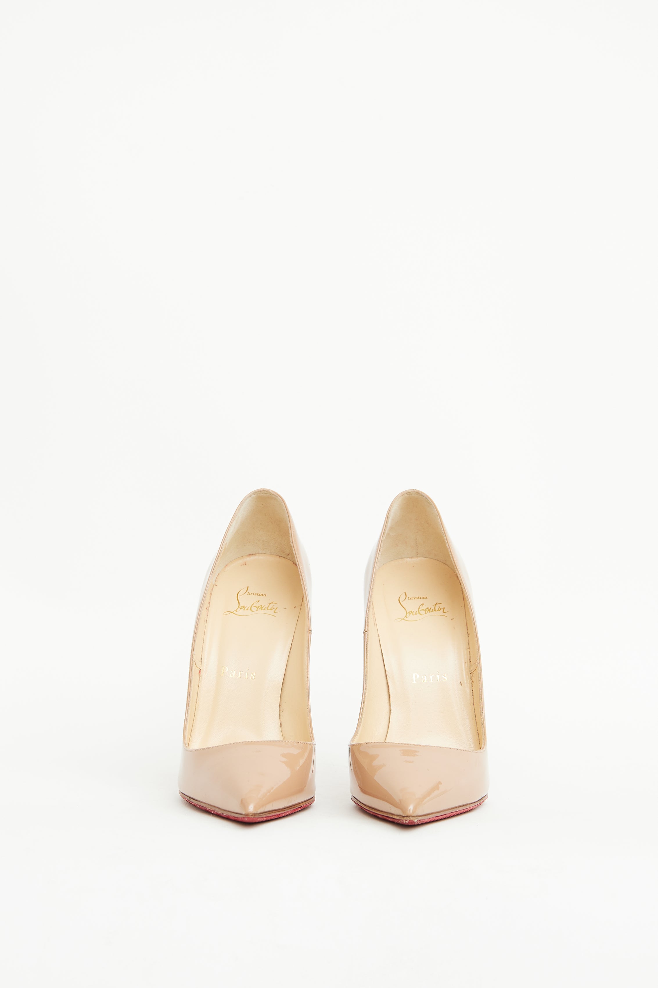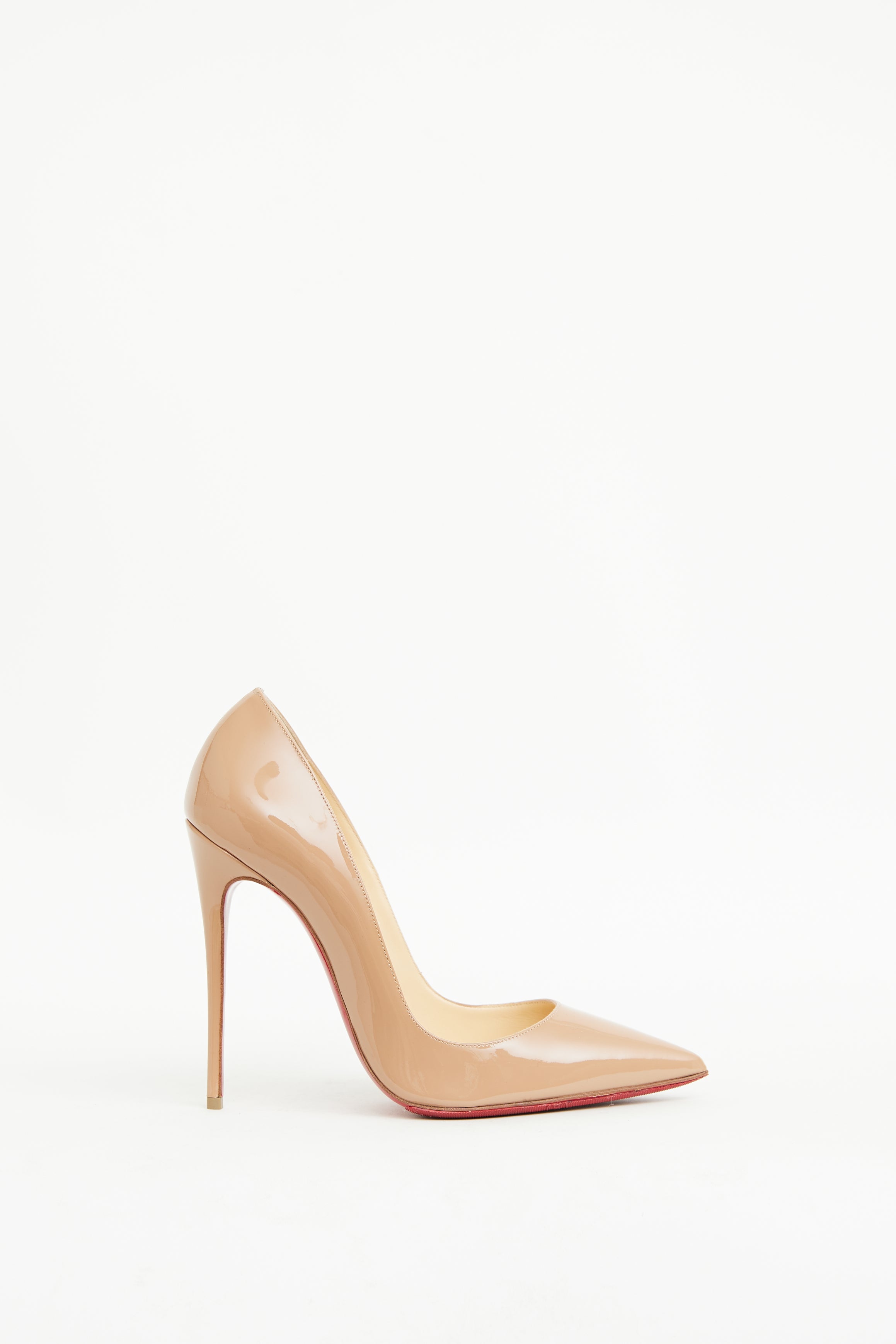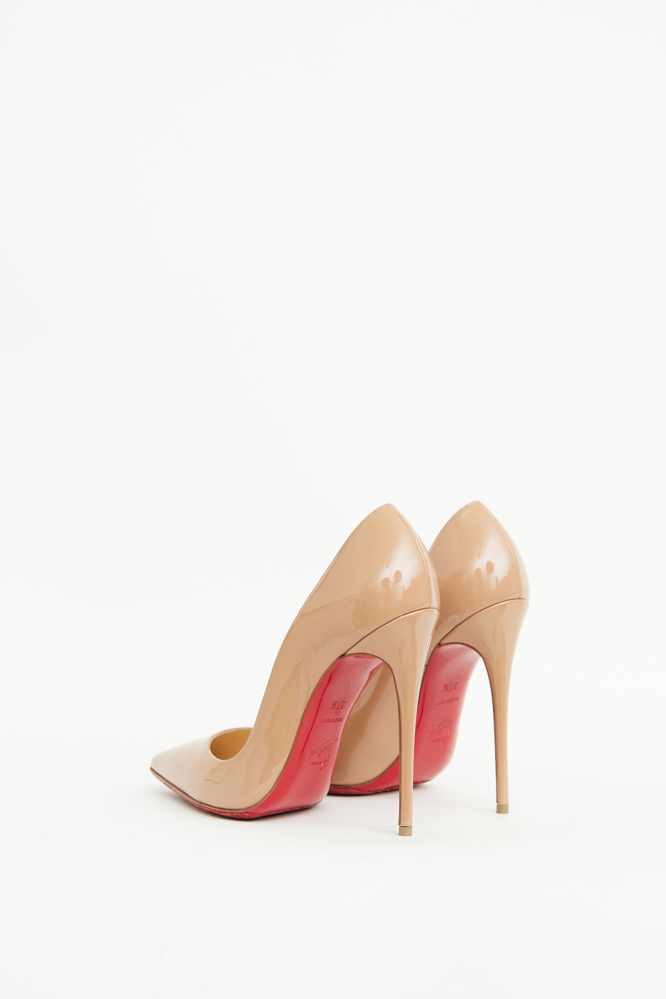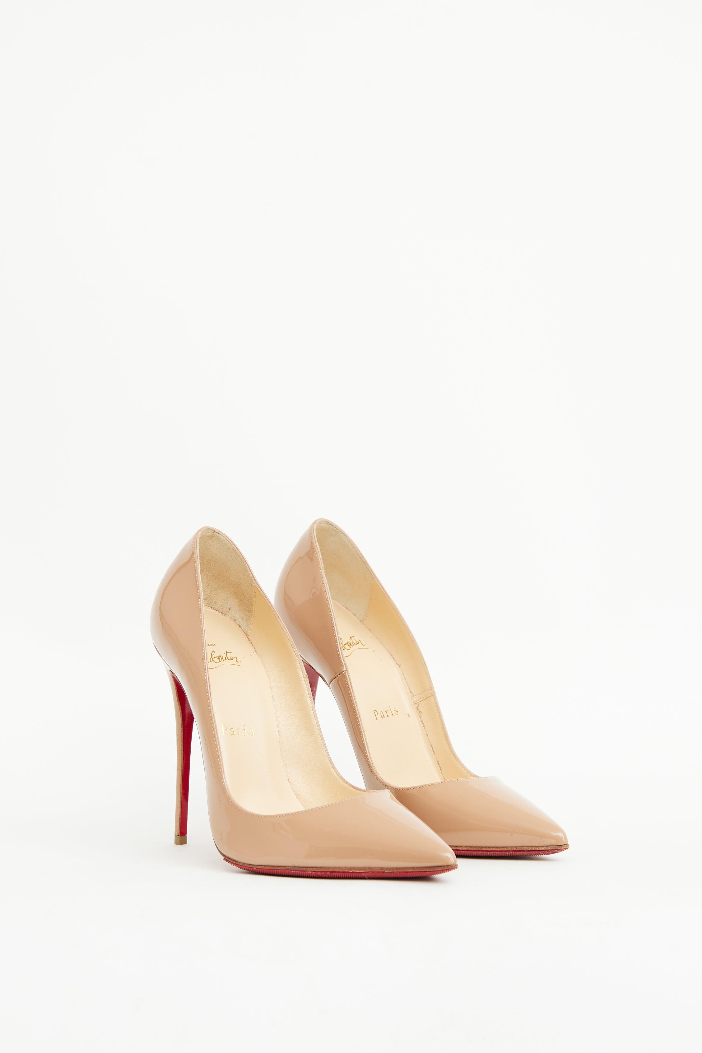 Pre-owned Christian Louboutin nude So Kate patent leather pumps featuring pointed toe, covered stiletto heel and signature red bottom with Topy outsole.