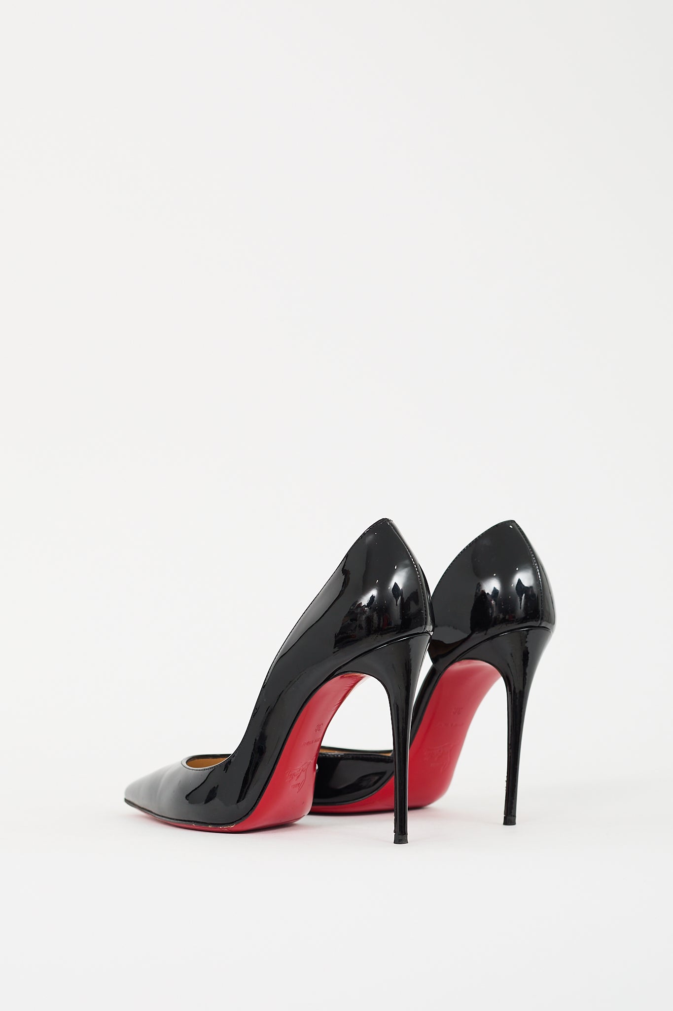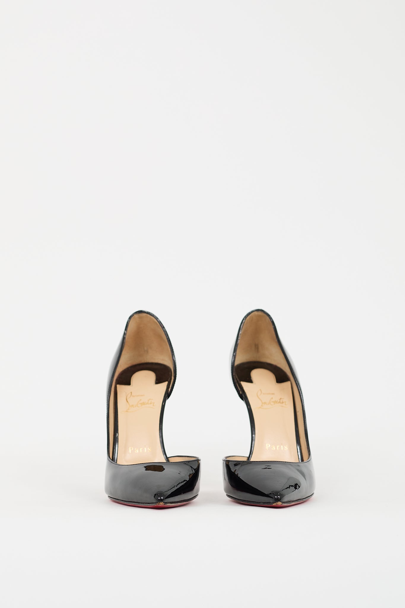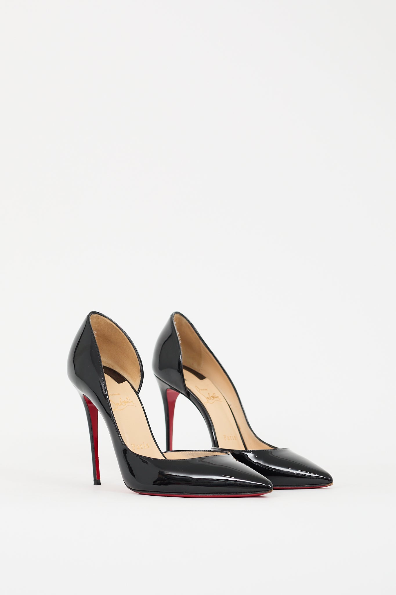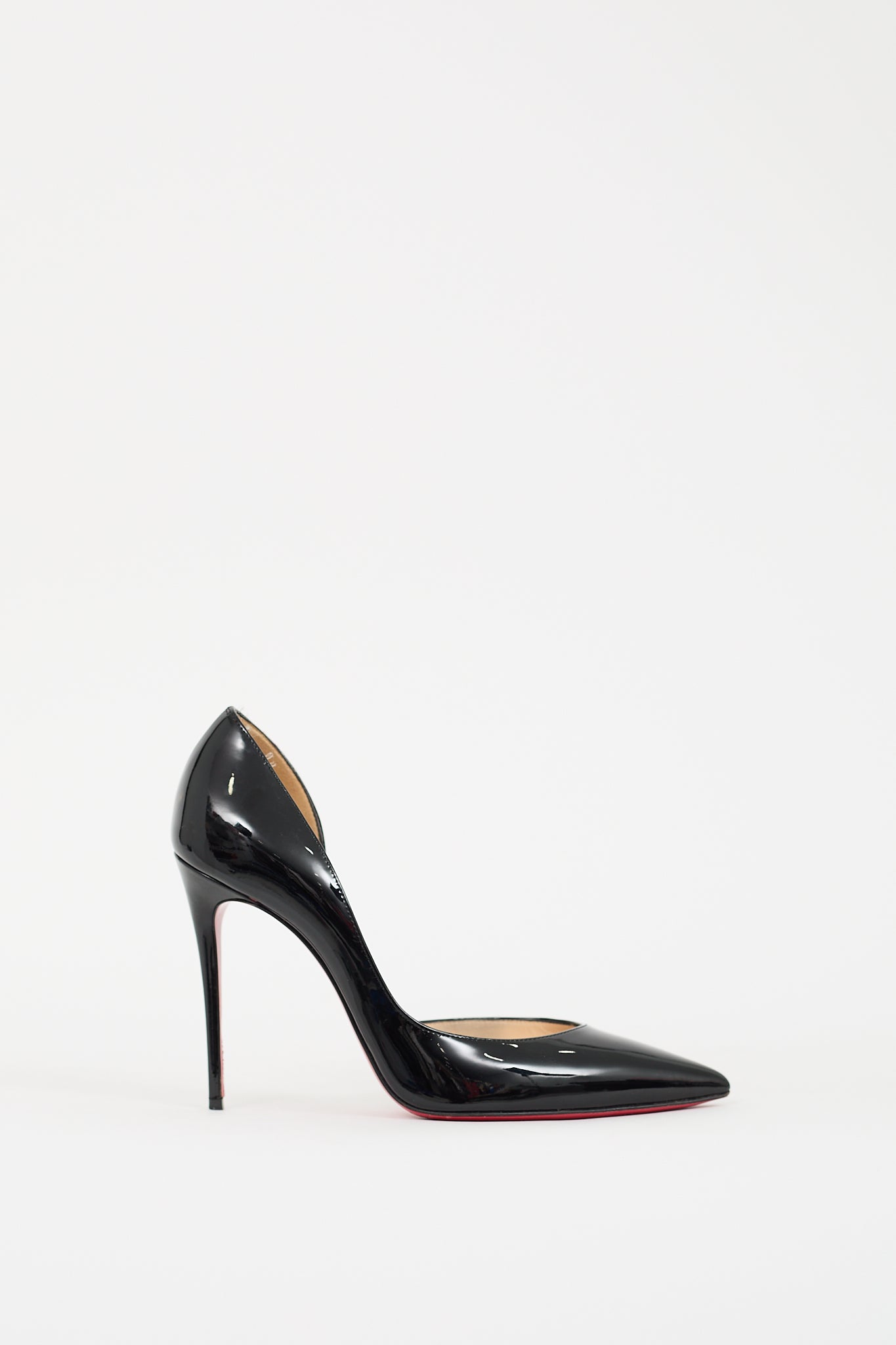 Pre-owned Christian Louboutin black patent leather Iriza D'orsay pumps featuring pointed toe, slip on entry, stiletto heel, and signature red lacquered outsole. Comes with original dust bags.