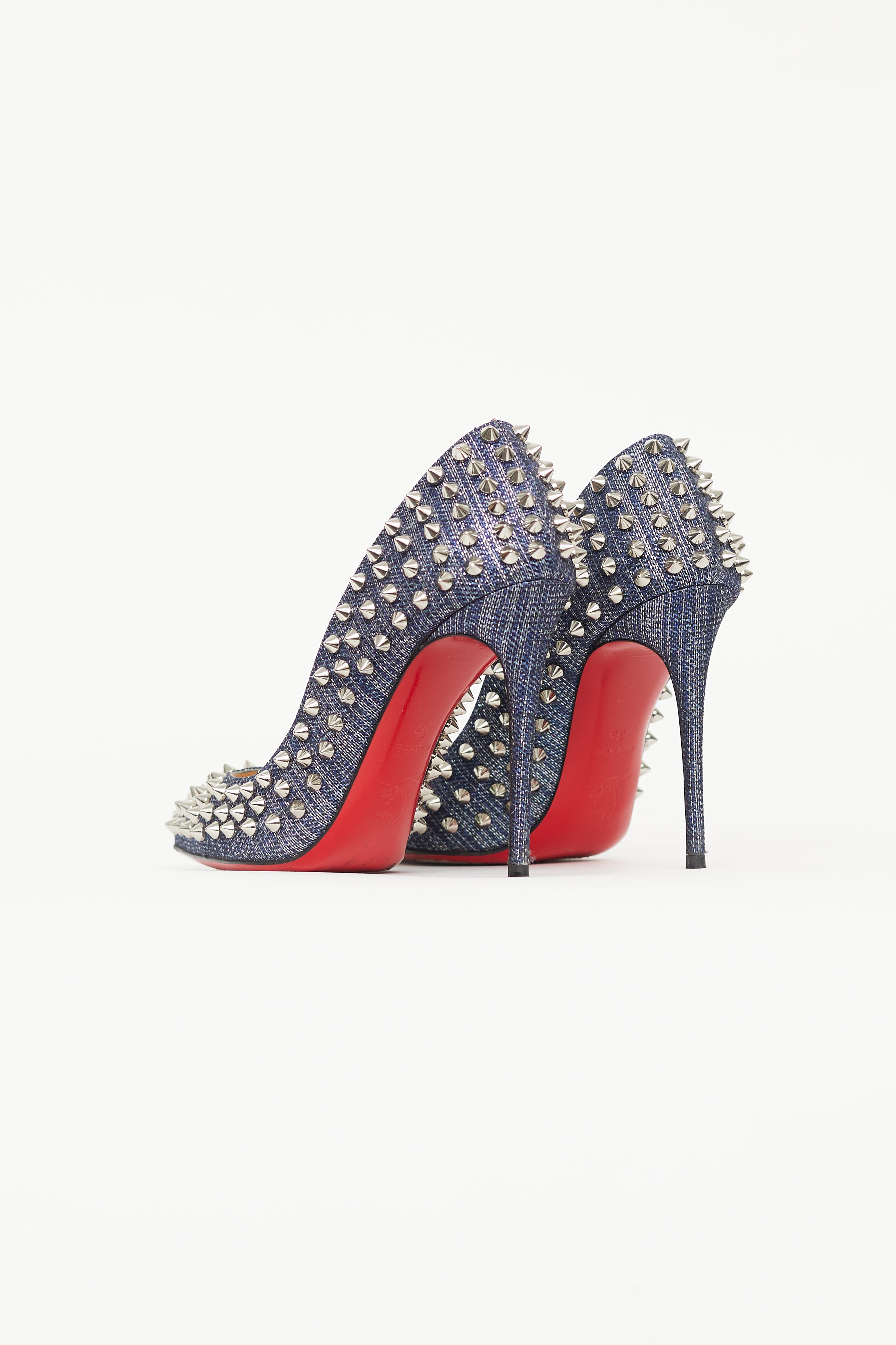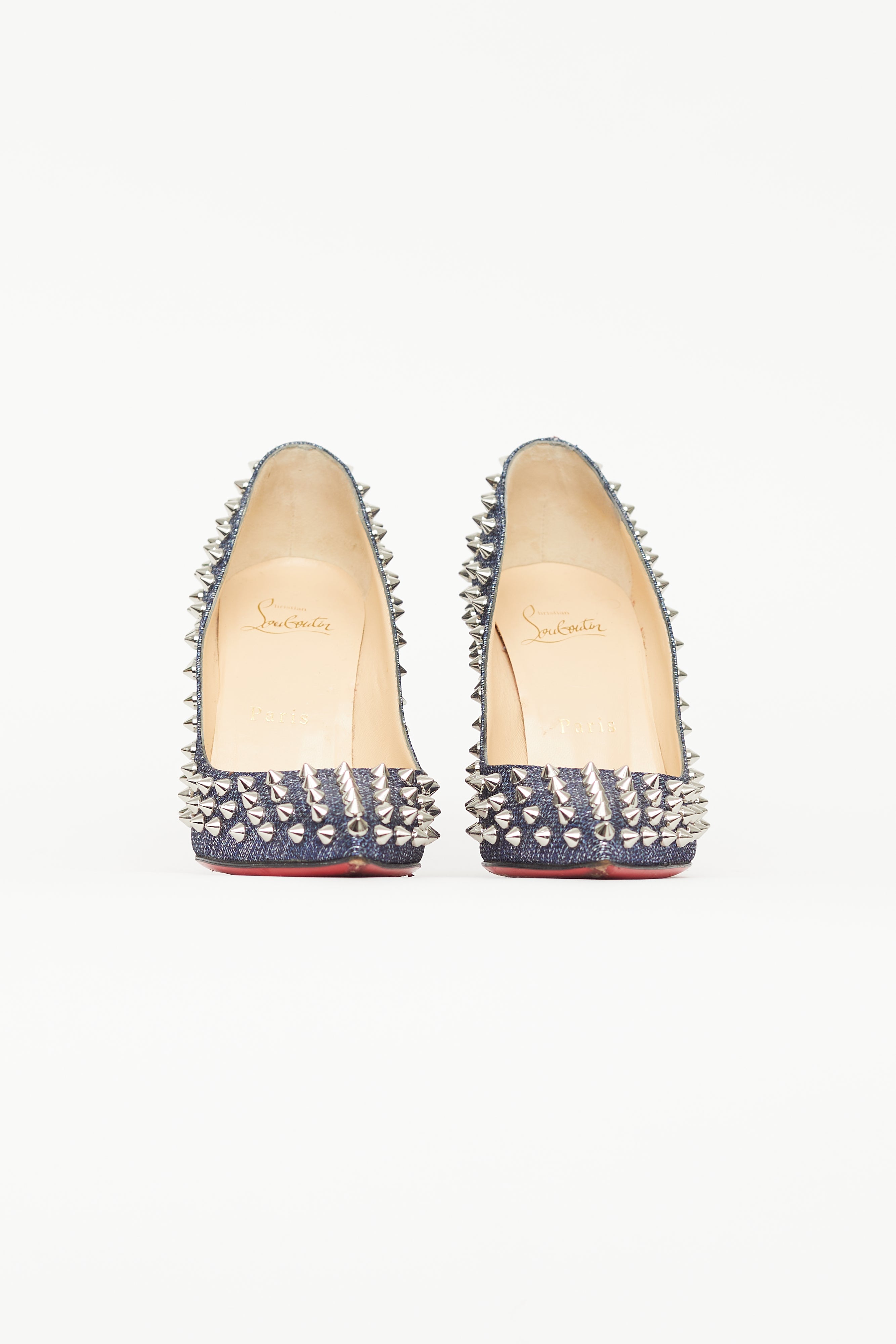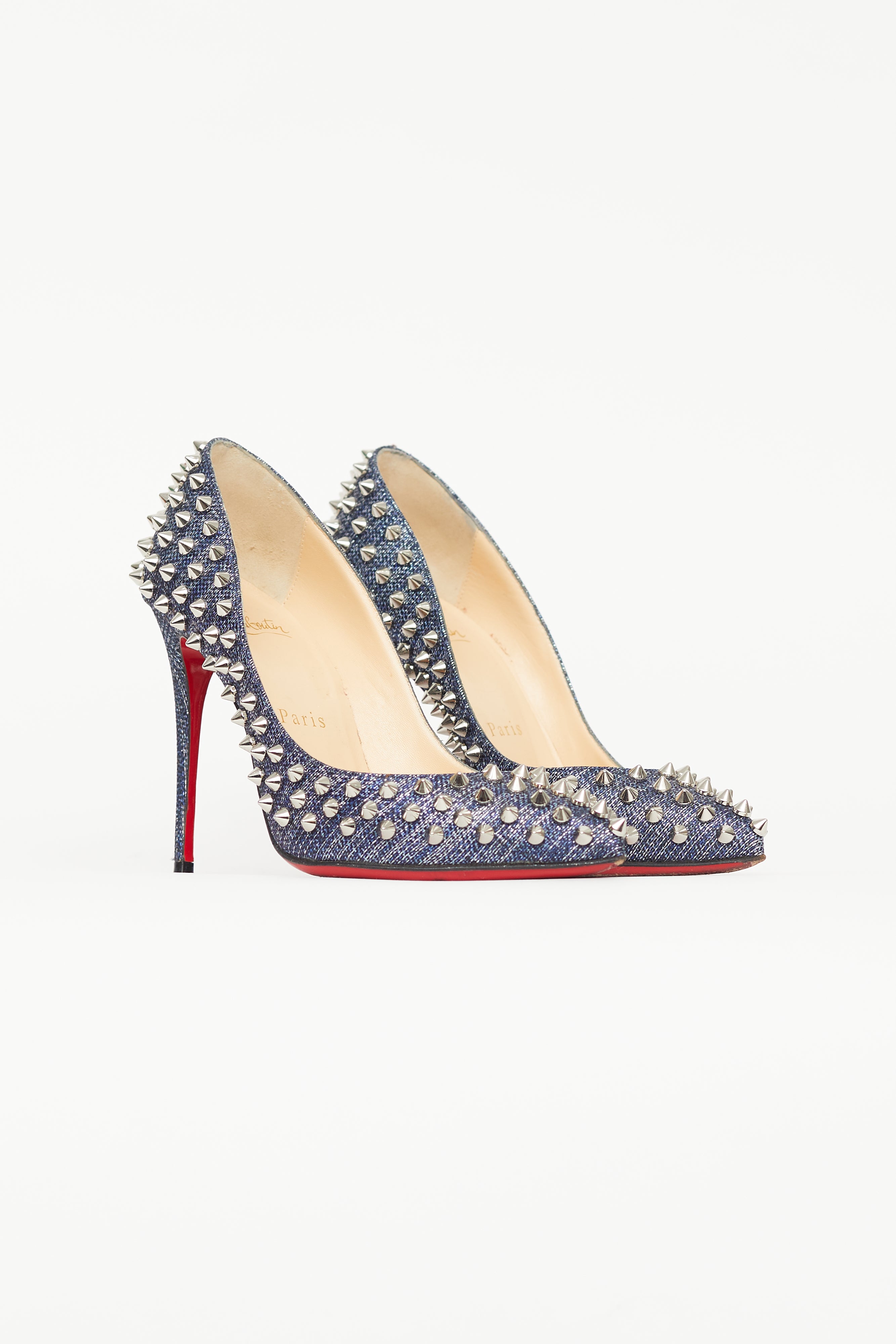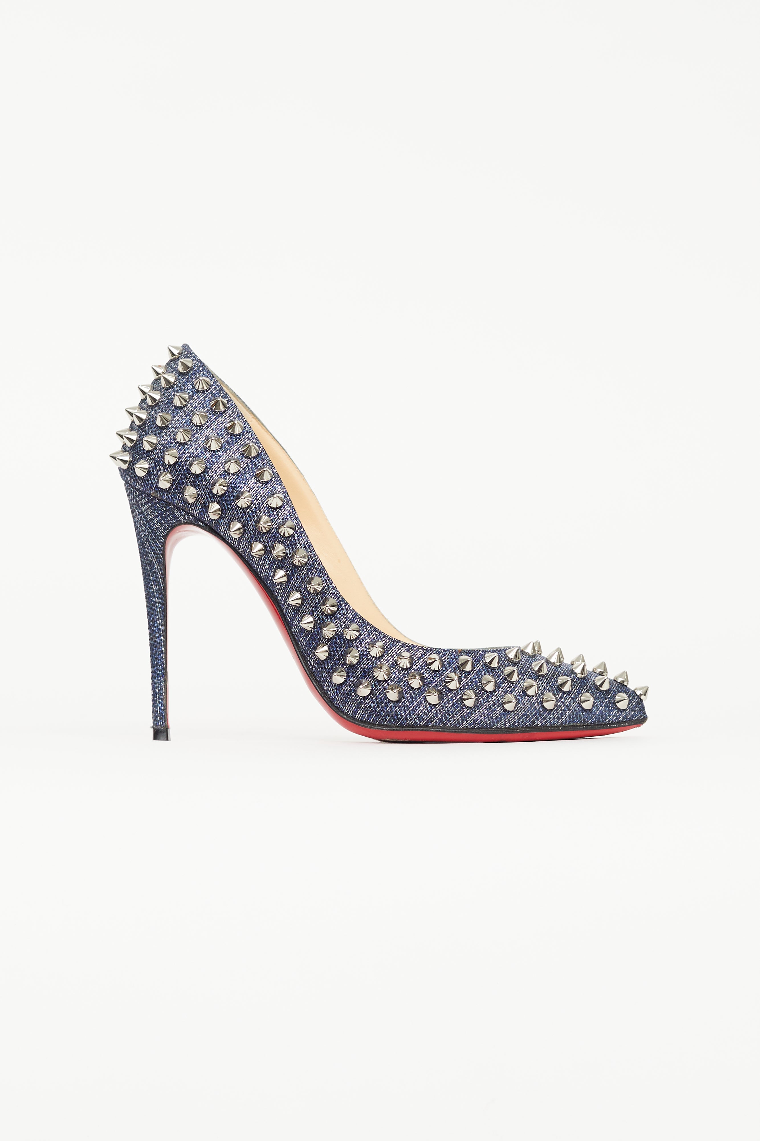 Pre-owned Christian Louboutin blue denim Follies Spike heels featuring pointed toe, denim upper, silver tone spike embellishment throughout, covered stiletto heel, and signature red lacquered outsole. Comes with original box.