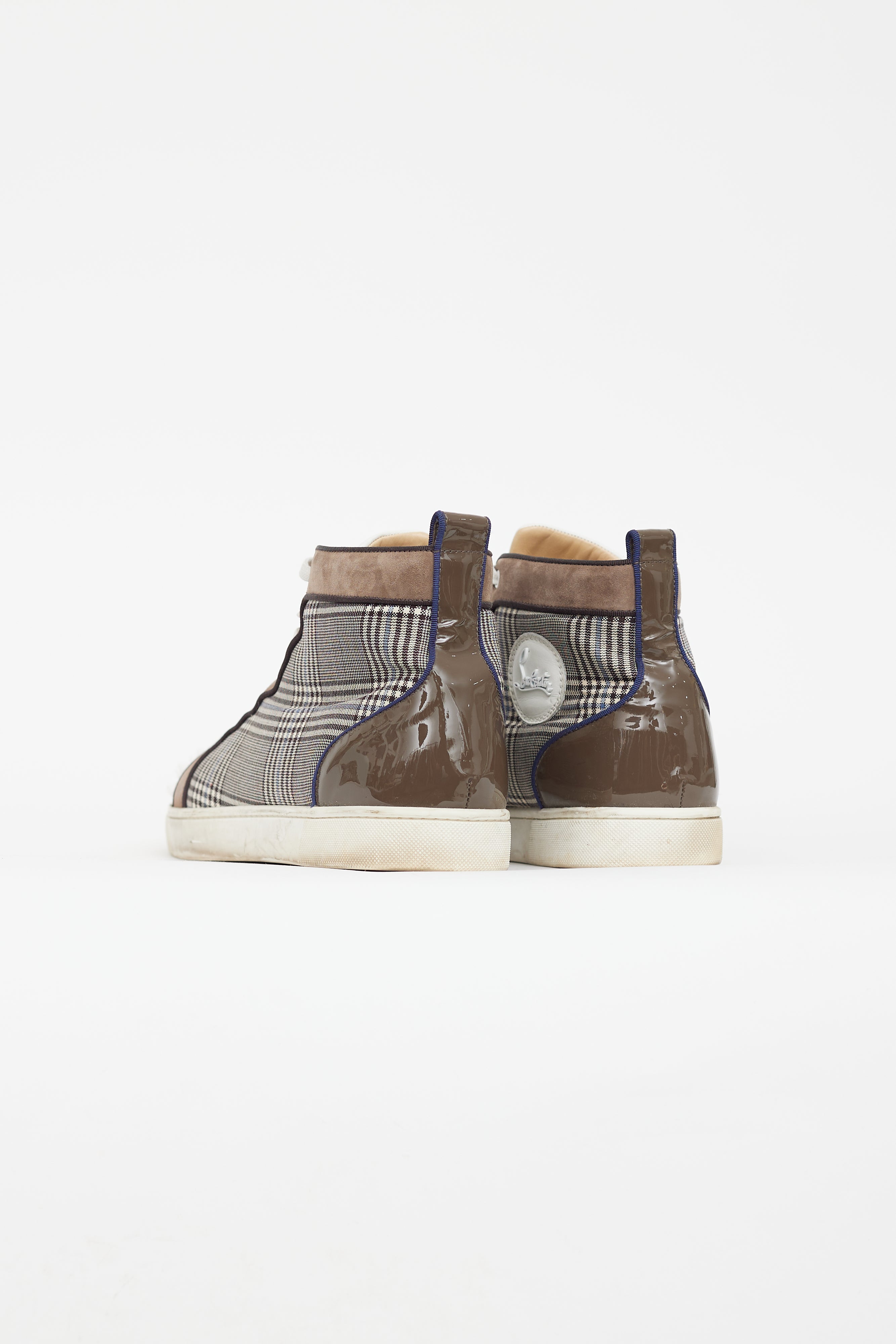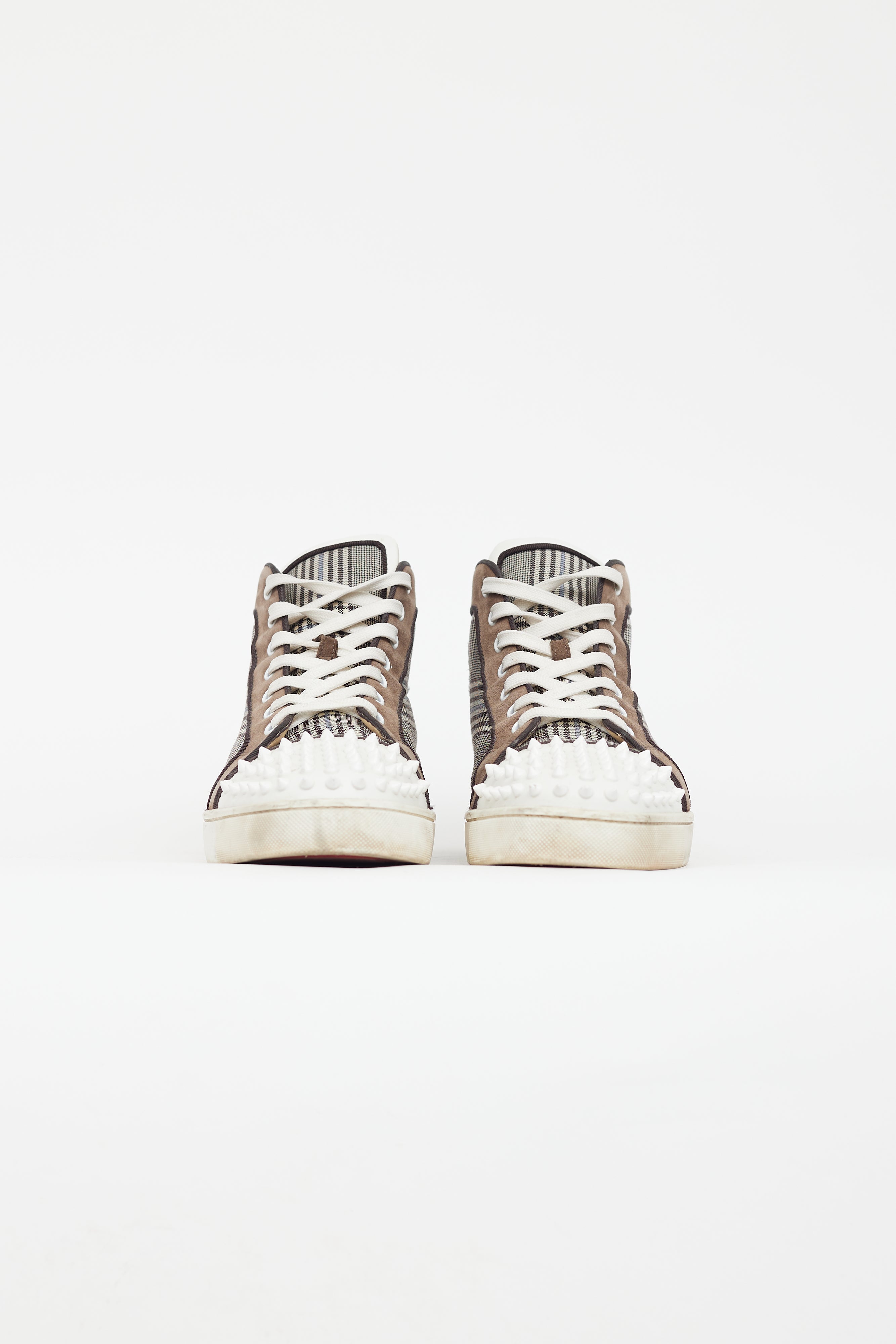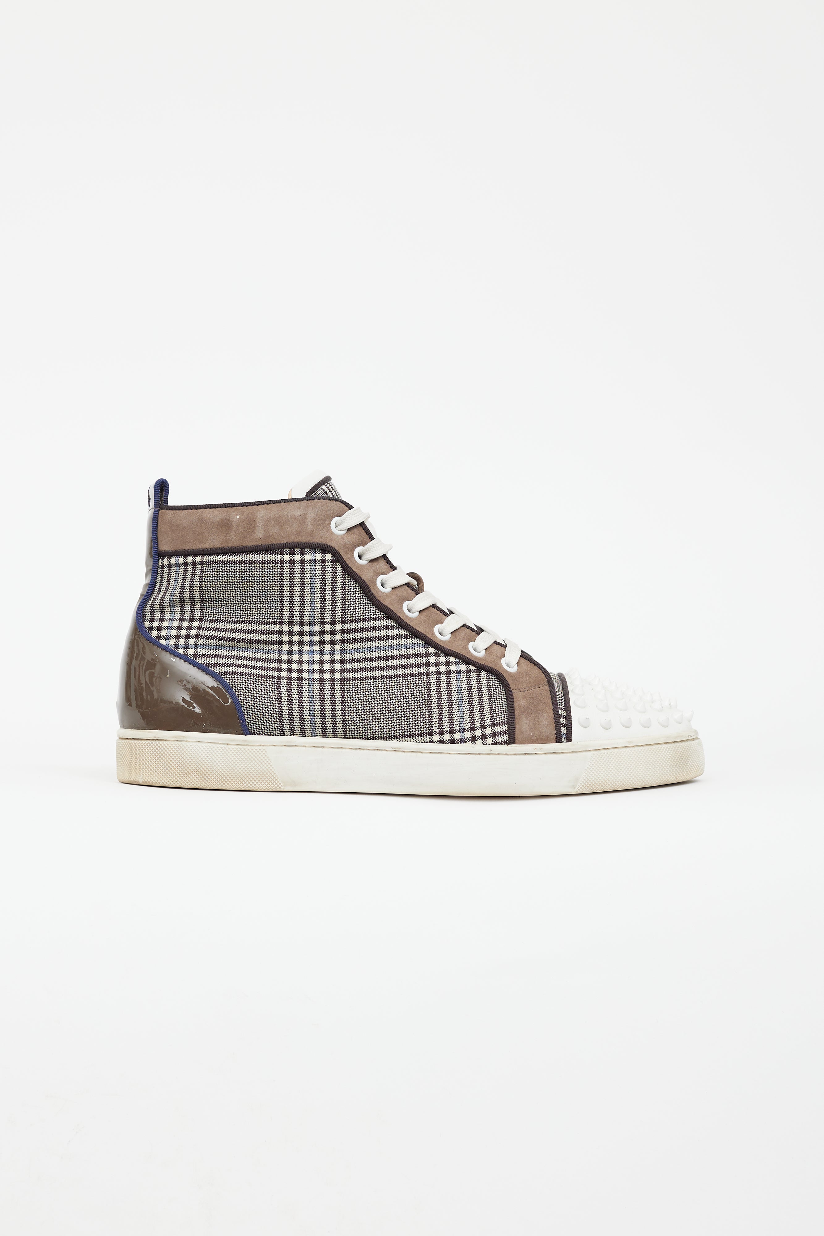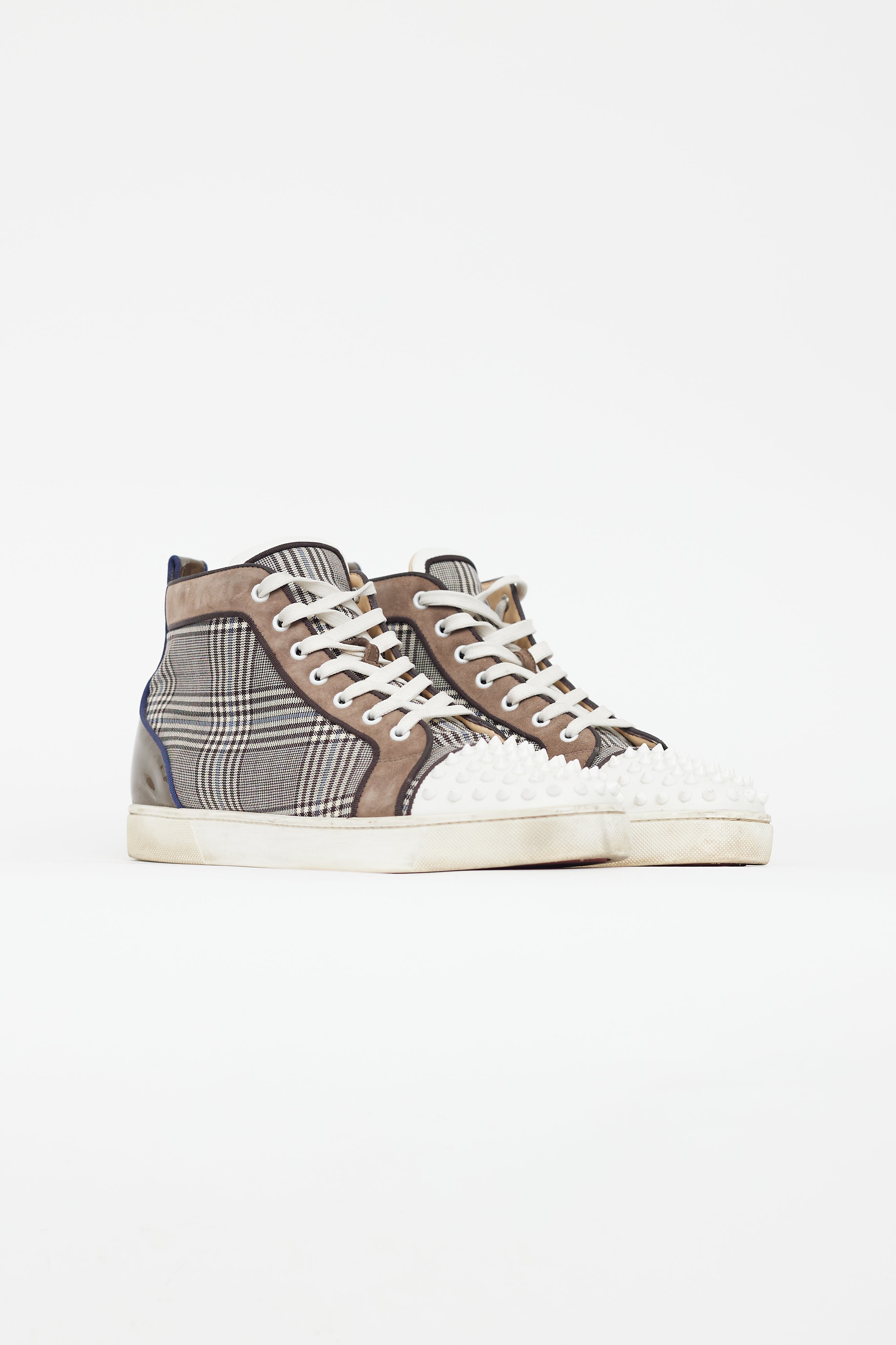 Pre-owned Christian Louboutin brown Lou Spikes Orlato plaid sneakers featuring white studded toe box, lace up front, logo at inner side, and patent leather brown panel with pull tab at counter.