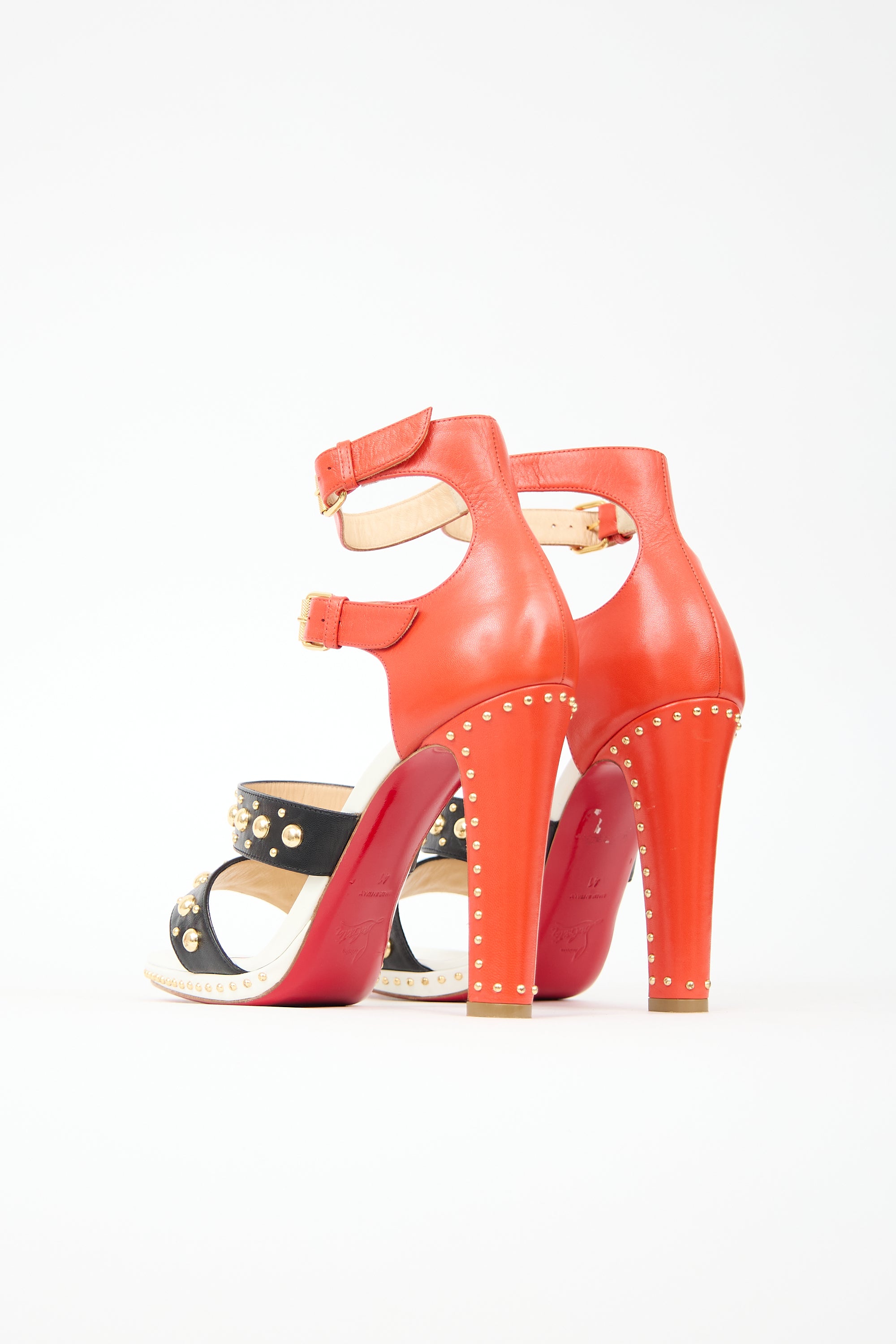 Pre-owned Christian Louboutin red, black, and white leather Decodame sandals featuring rounded toe, gold tone stud embellished upper, dual adjustable ankle straps, covered block heel with stud trim, and signature red lacquered outsole.