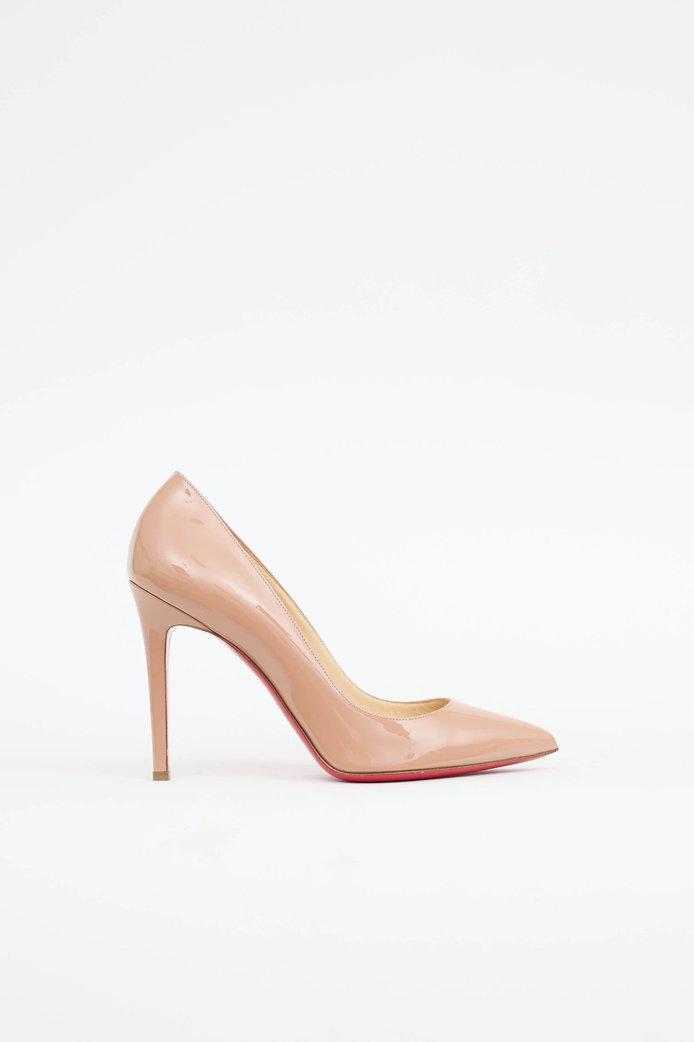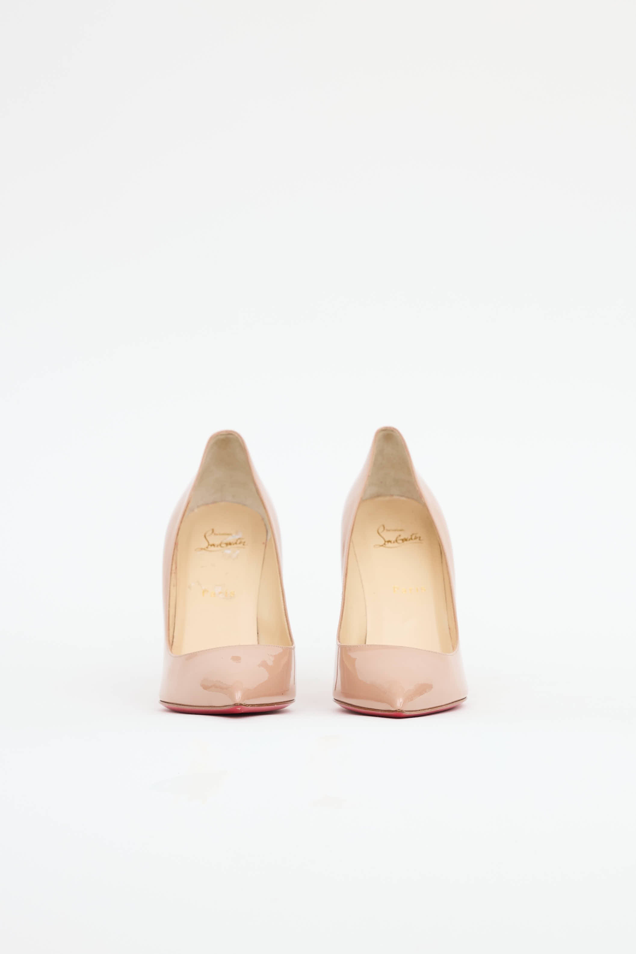 Pre-owned Christian Louboutin beige So Kate 100 pumps featuring a patent leather upper, pointed toe, slip on entry and signature red bottoms.