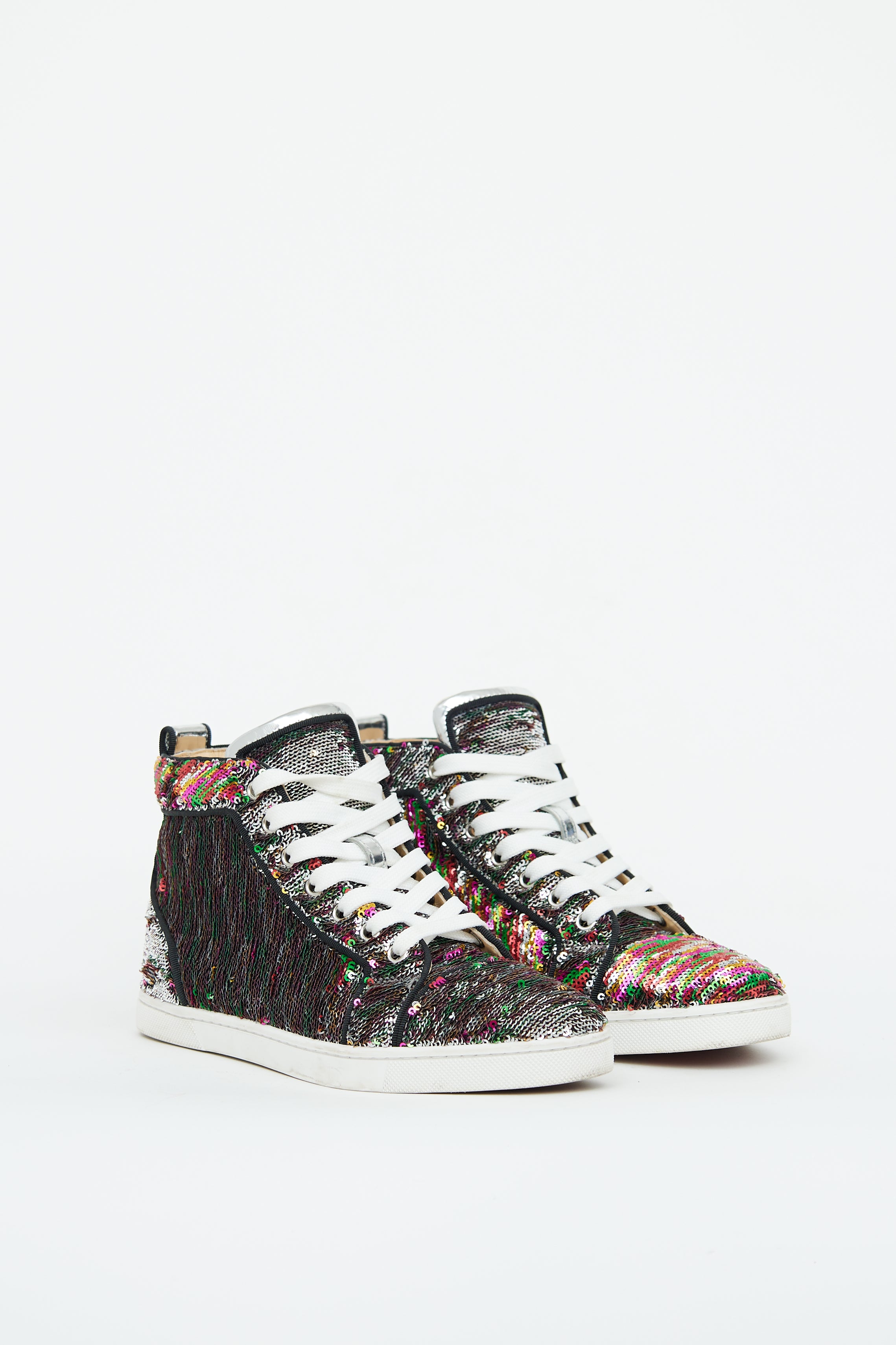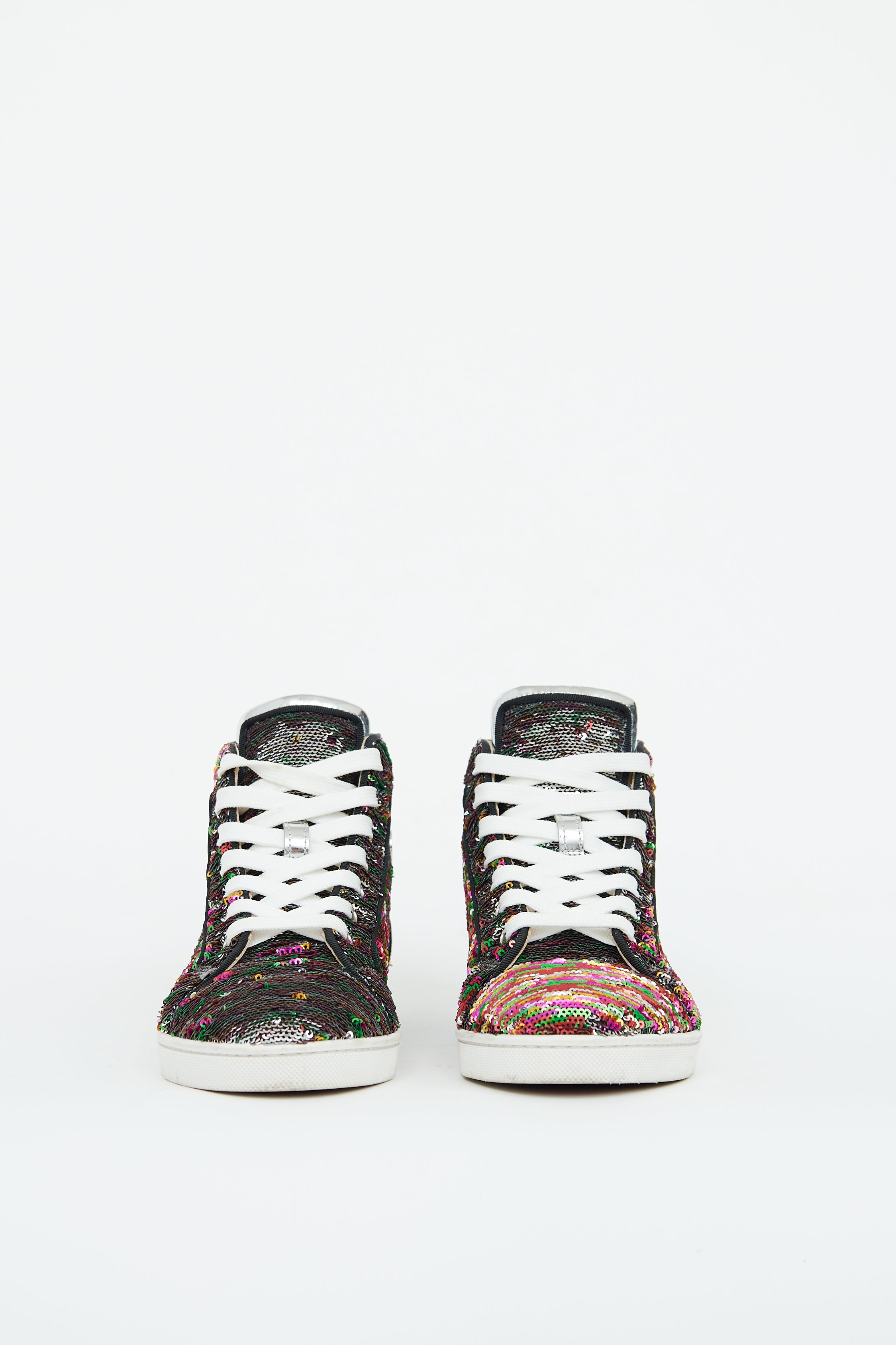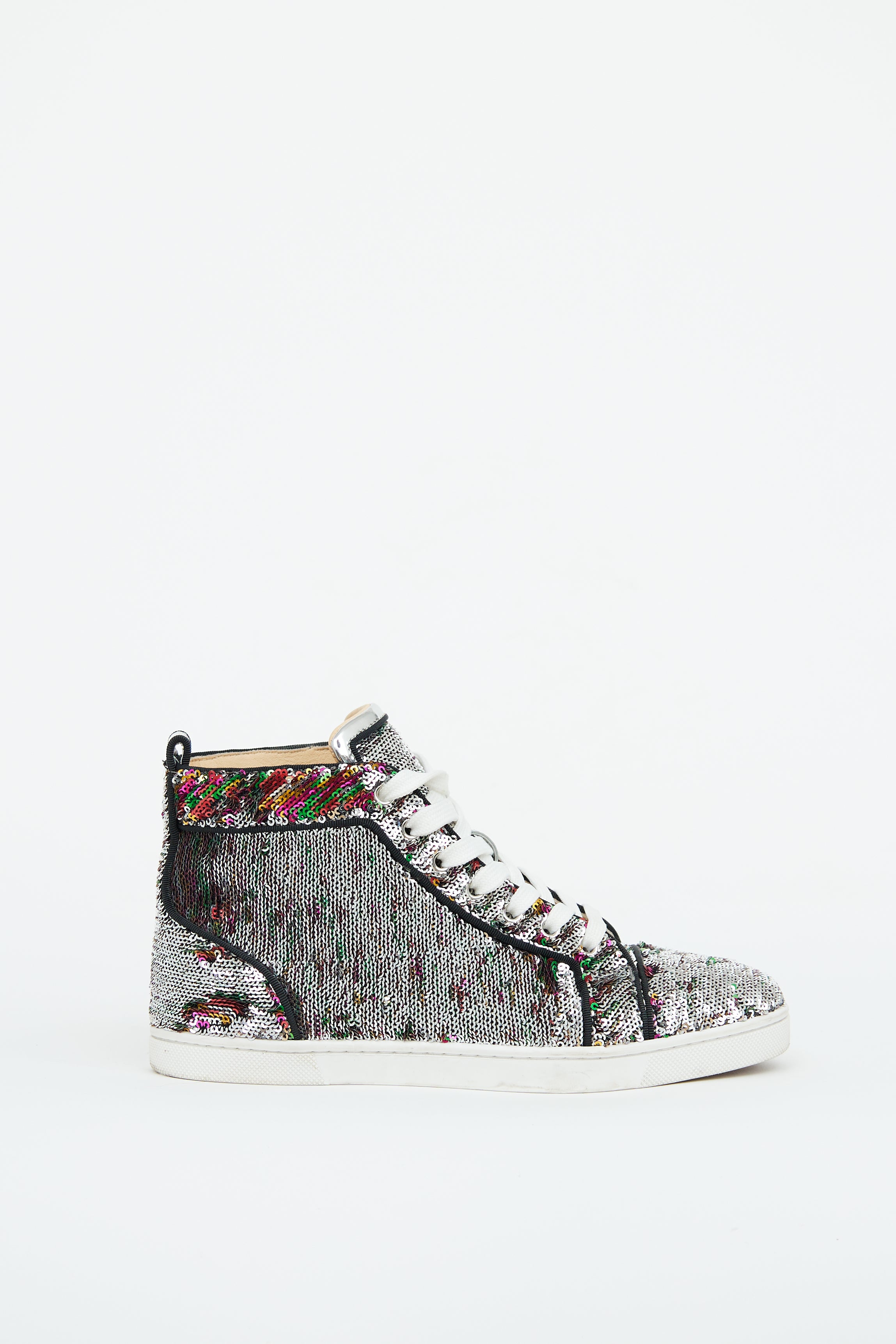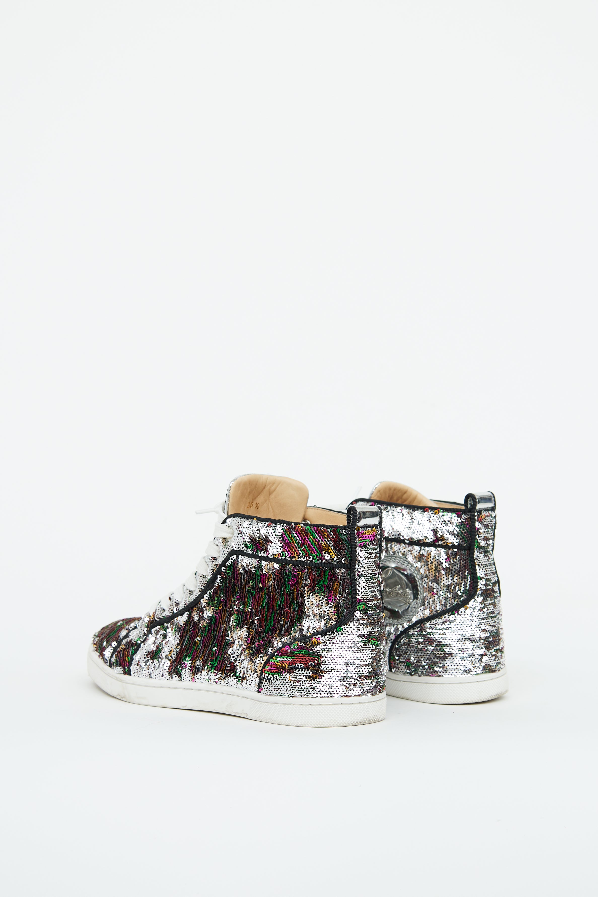 Pre-owned Christian Louboutin silver multi colour BipBip sneakers featuring round toe, sequin upper, lace up, circle mirrored Louboutin text patch, rubbed midsole and signature red bottom outsole.