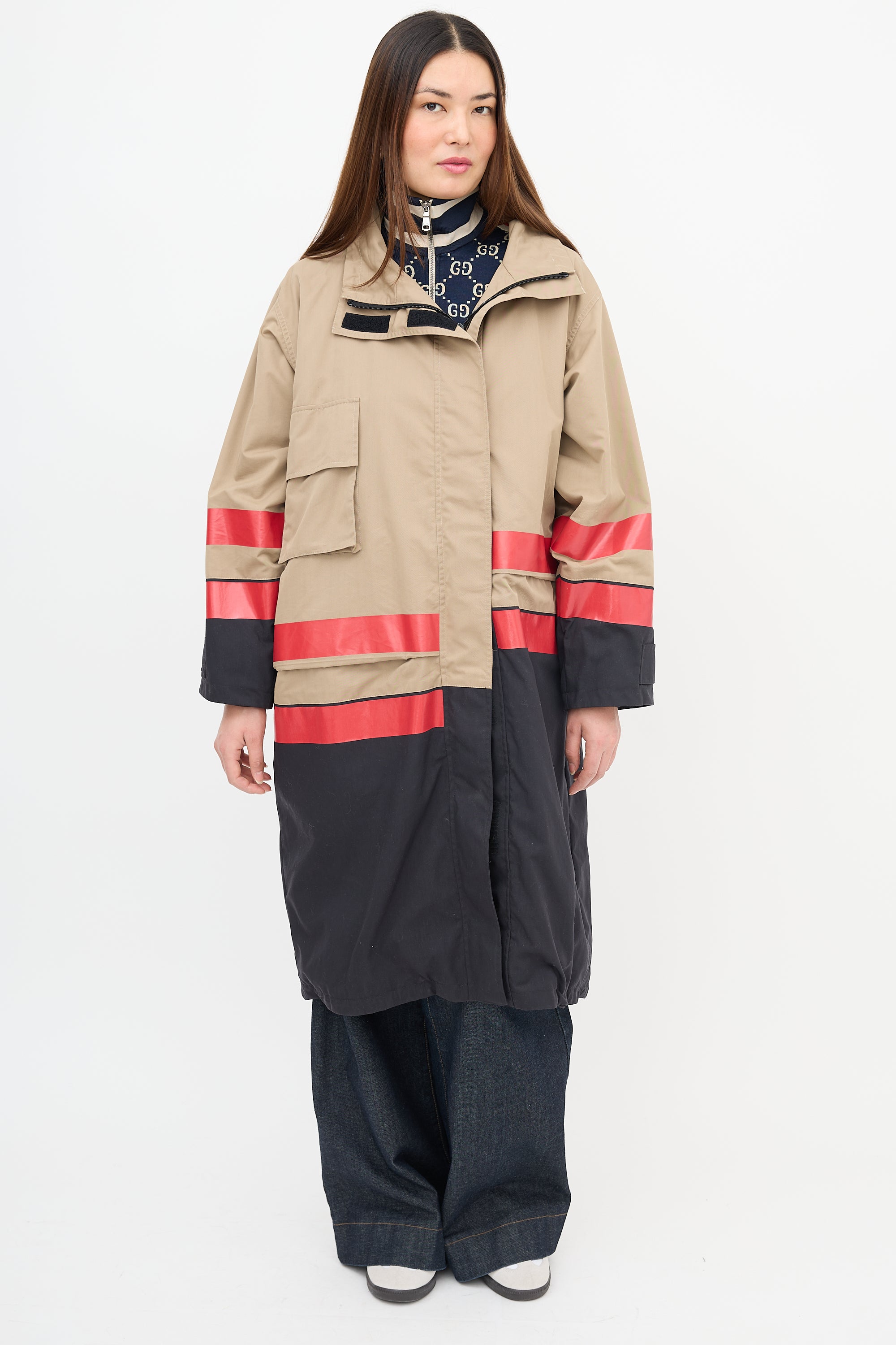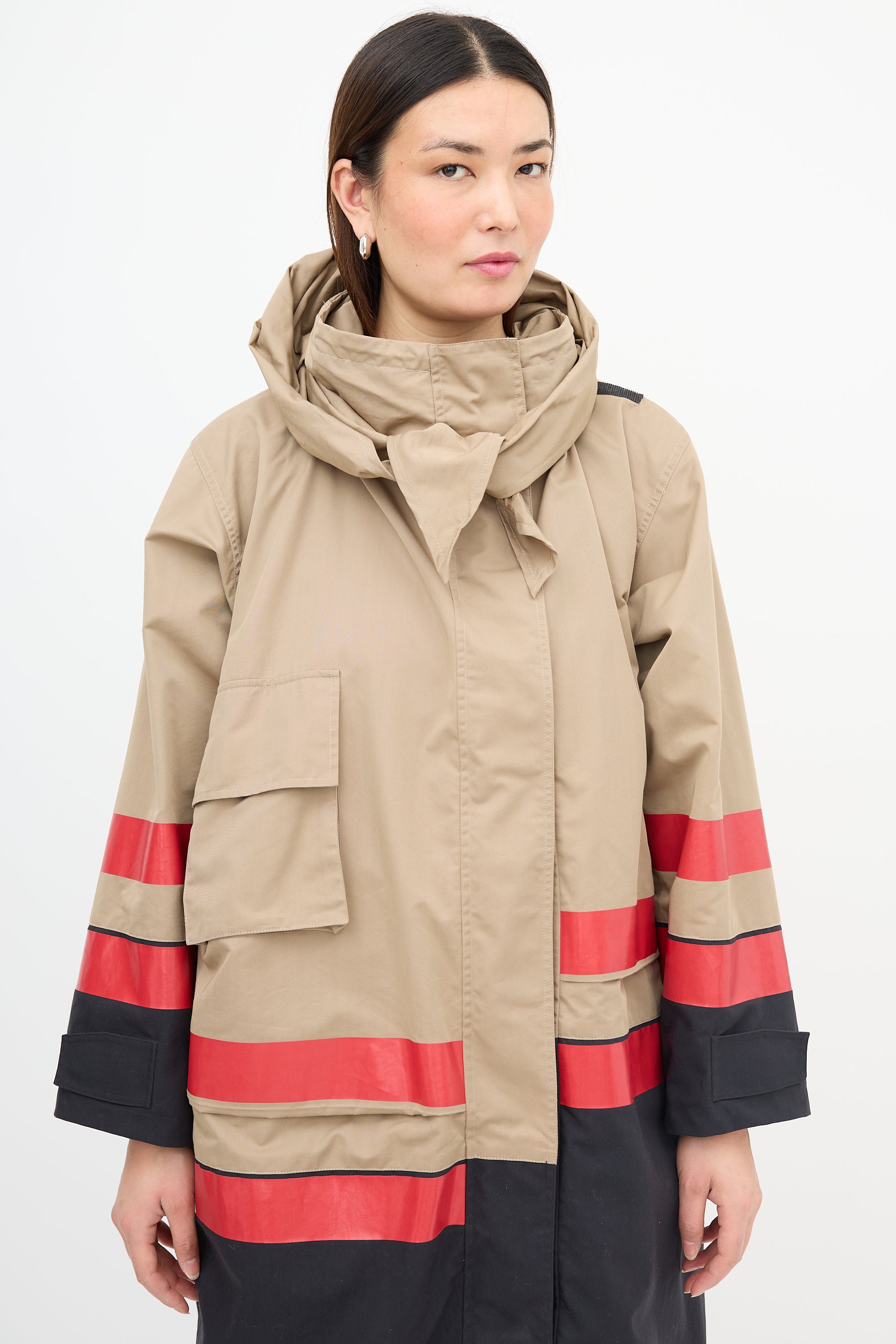Pre-owned Gucci X Balenciaga 2021 brown, black, and red parka featuring drawcord funnel collar, packable scarf, double zip front, Velcro placket, flap pocket at right chest, concealed front zip pockets, one interior zip pocket, interior drawcord hem, and inset ribbing and Velcro straps at cuffs. Lined.