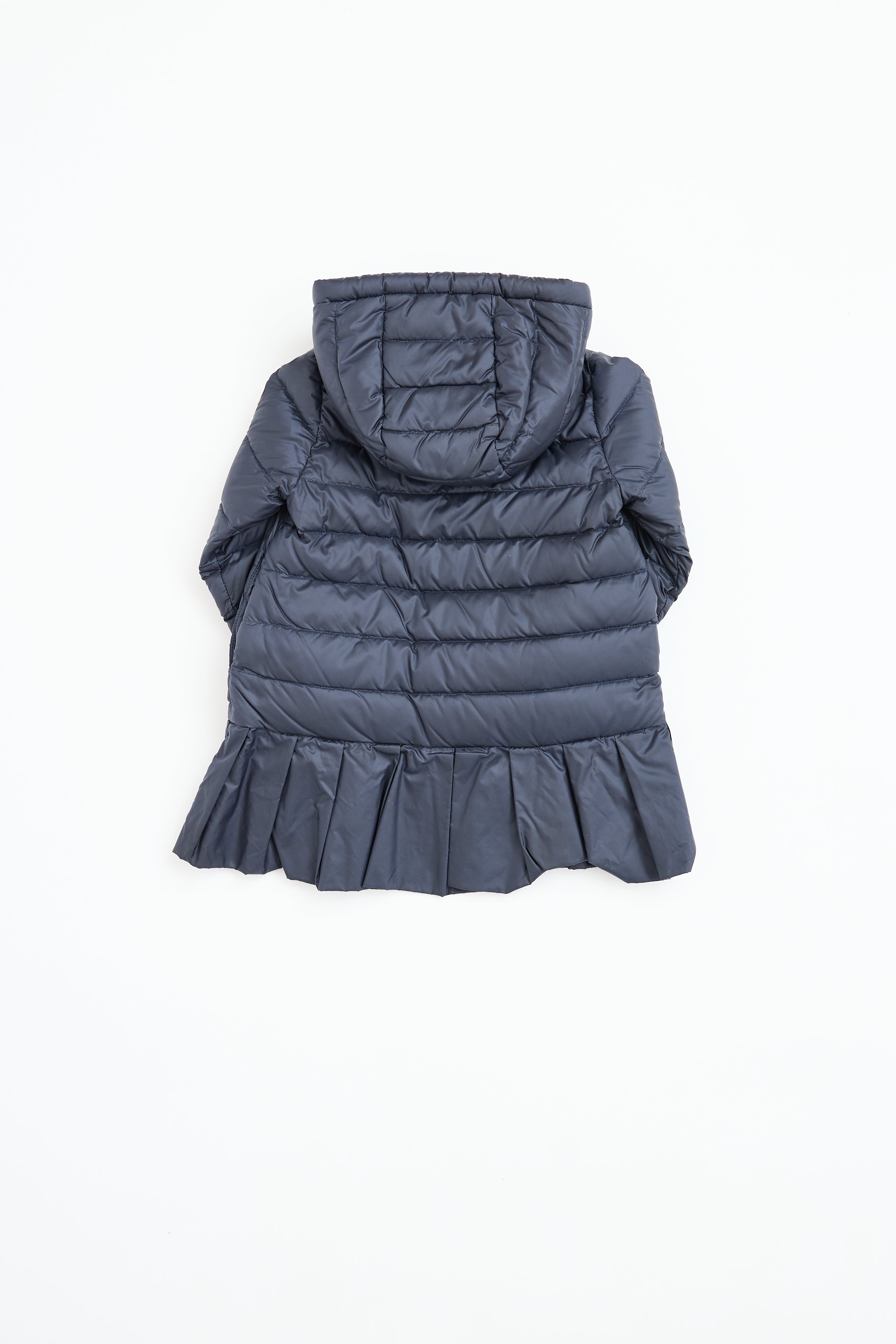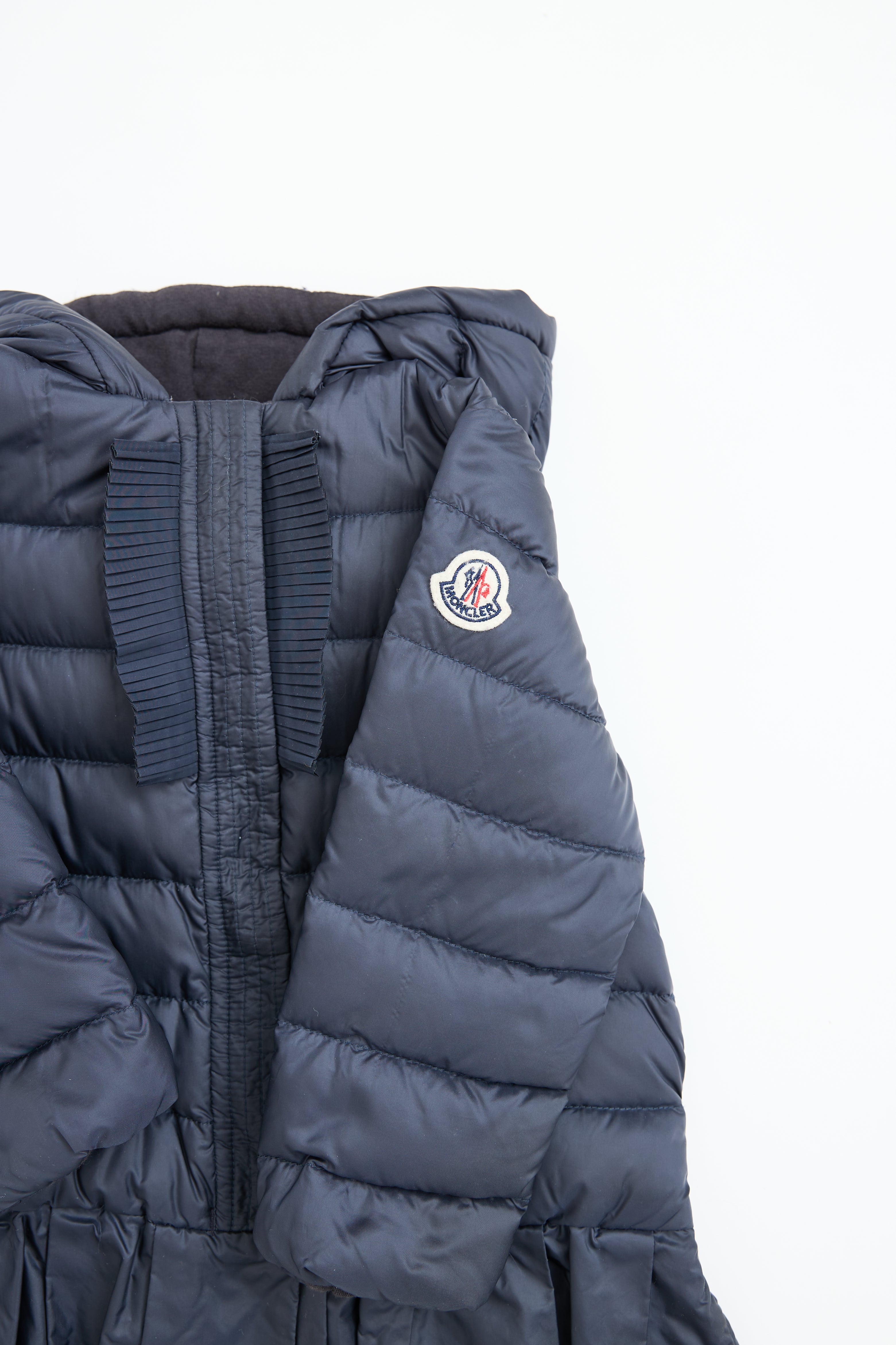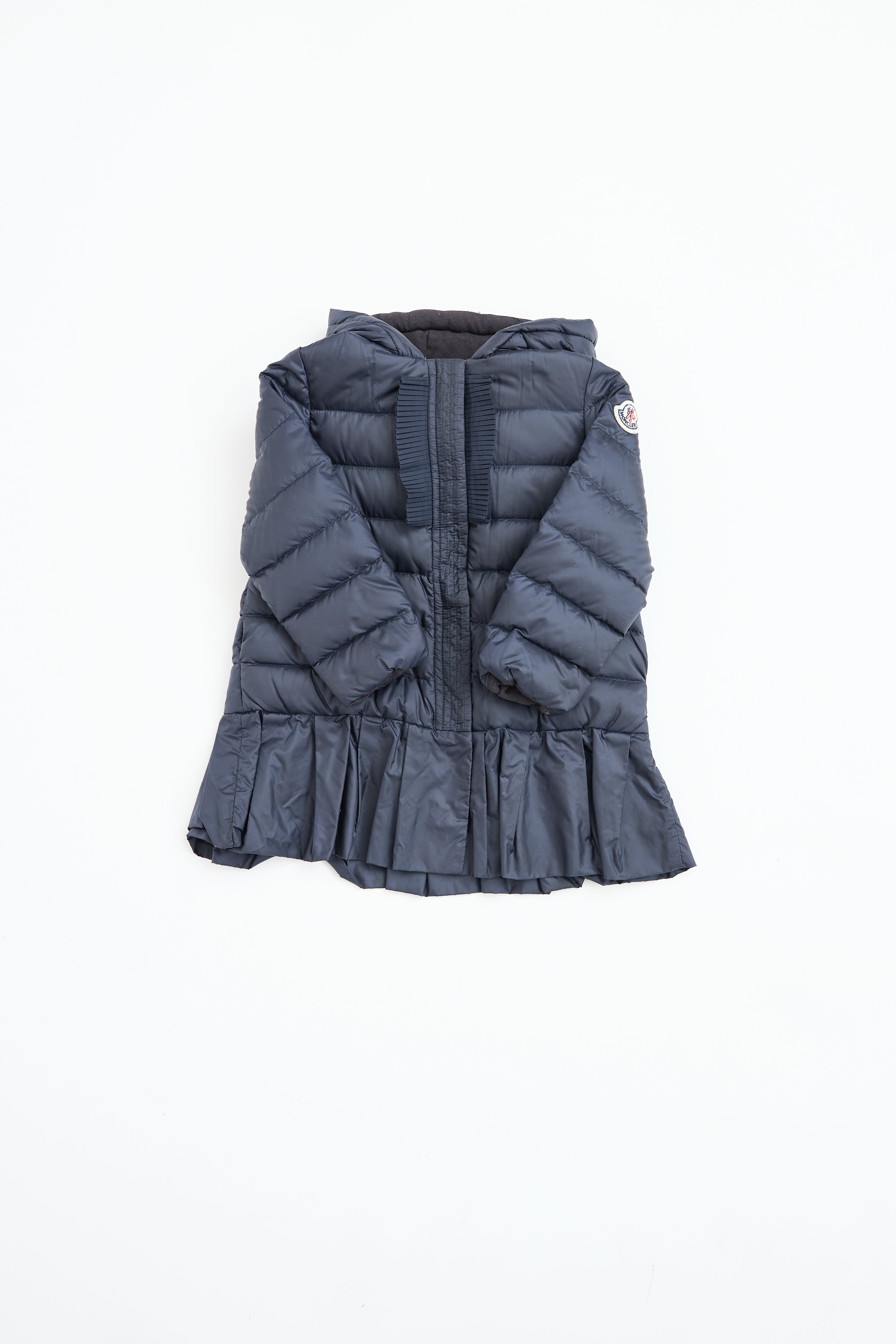 Pre-owned Moncler kids navy peplum puffer featuring a lined hood, zip and button down closure, fringe detailing at chest, logo patch at left sleeve, and peplum hem. Lined.