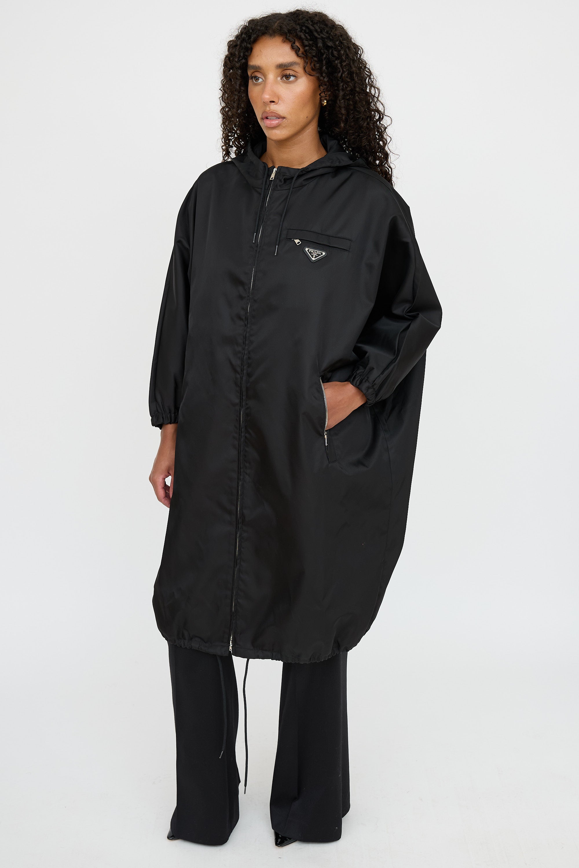 Pre-owned Prada black 2020 Re-Nylon long sleeve zip coat featuring drawstring hood, zip up front, batwing sleeves, patch pocket at chest with metal logo plaque, zip pockets at side, drawstring hemline, and elastic cuffs. Lined.