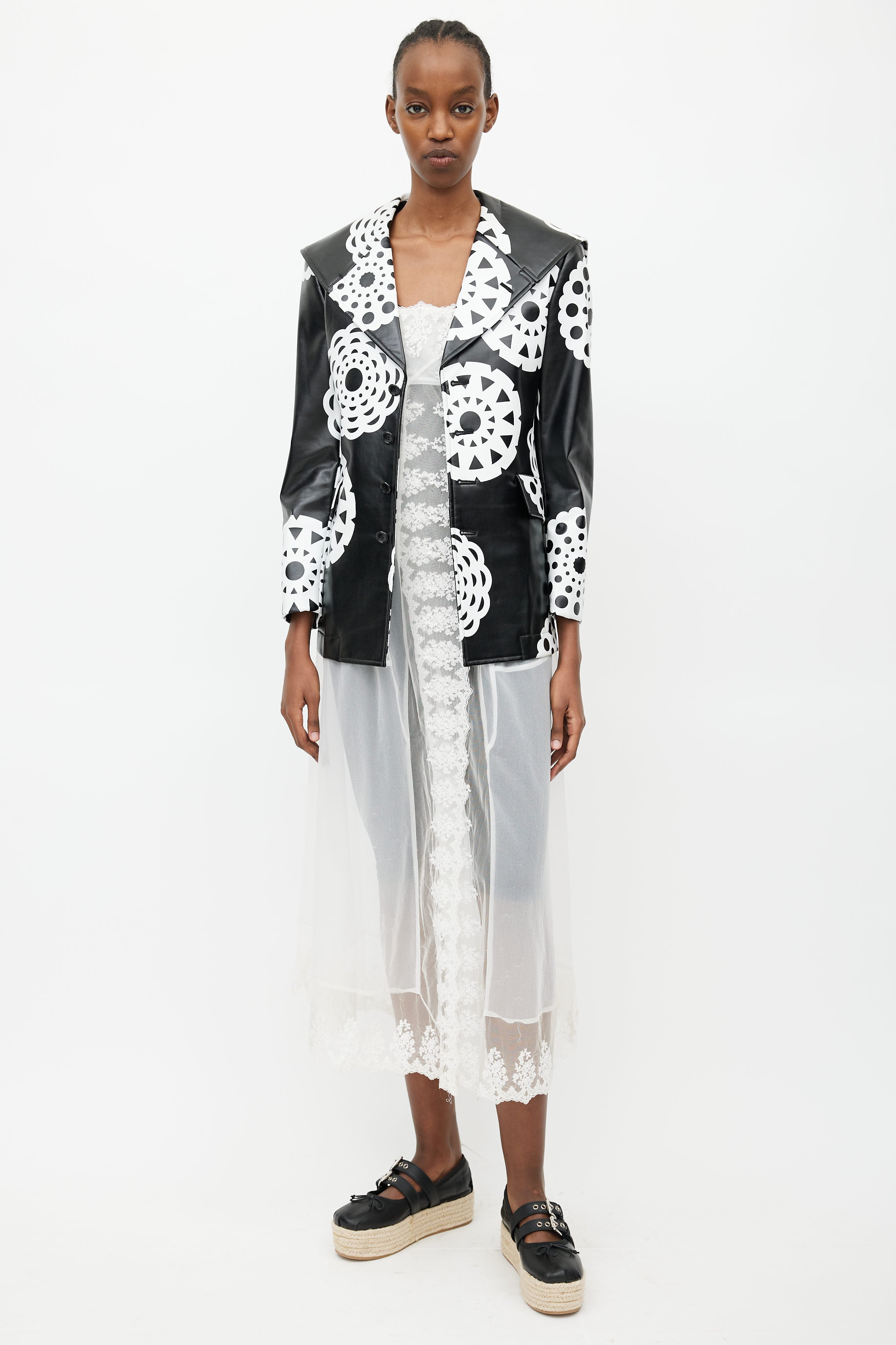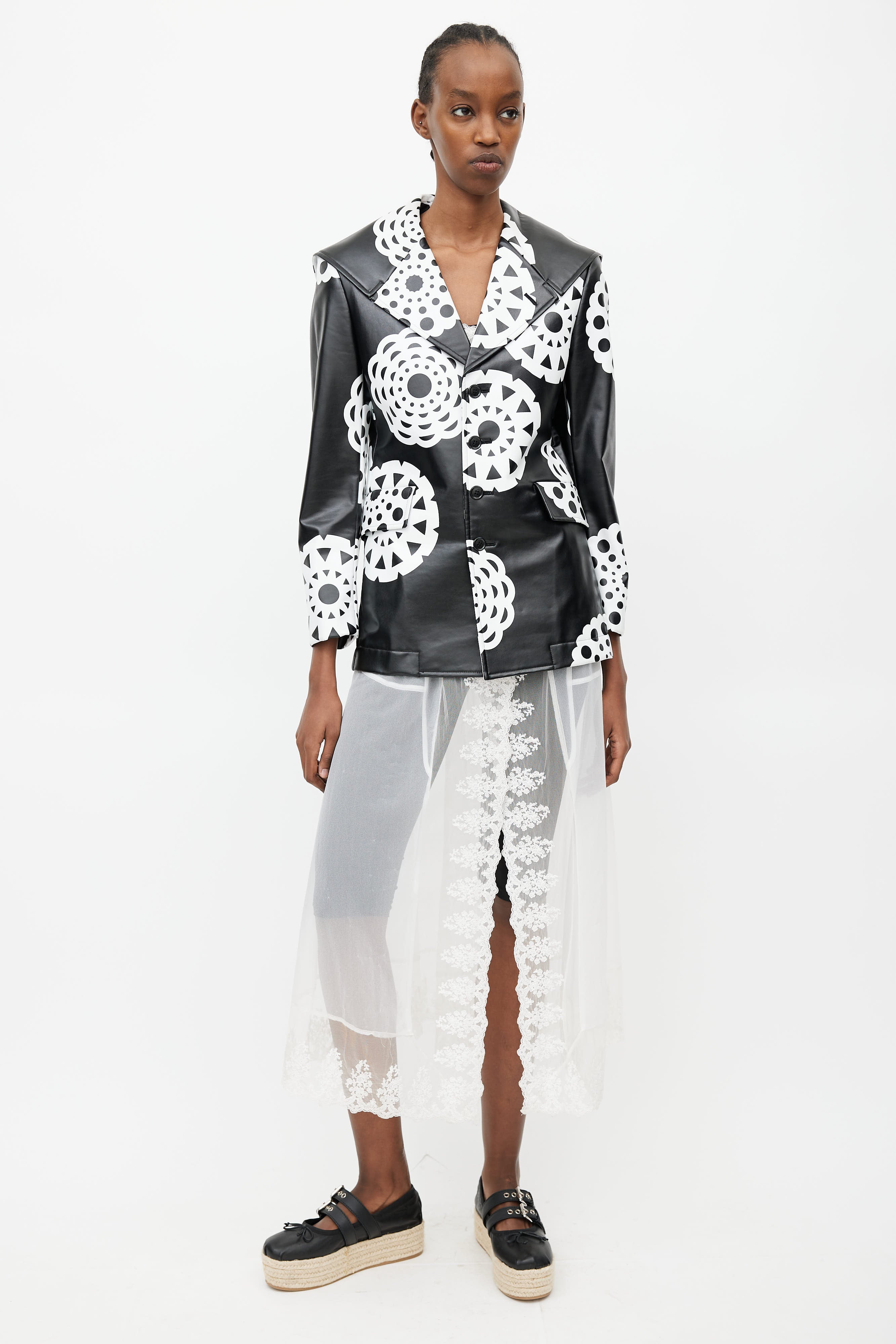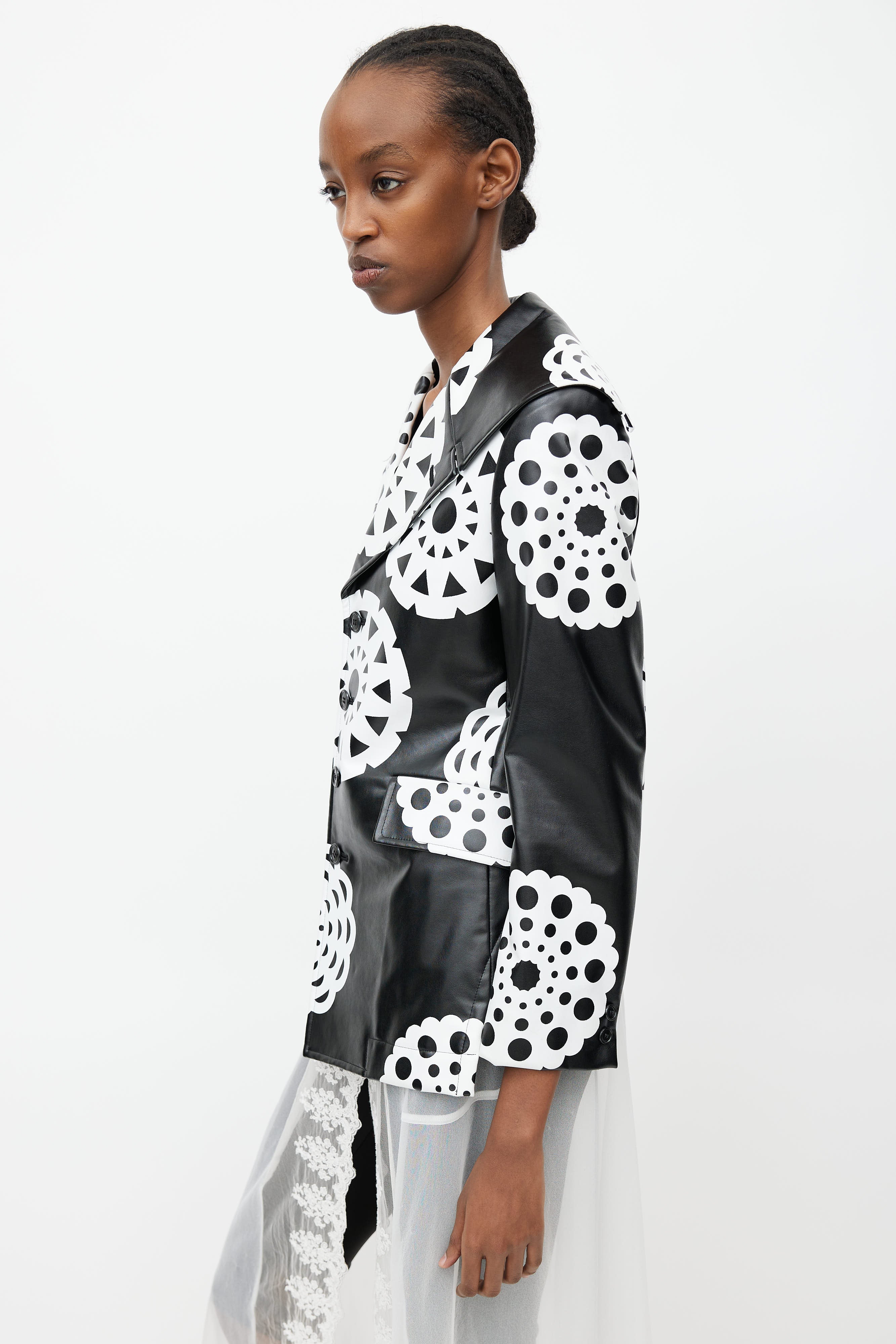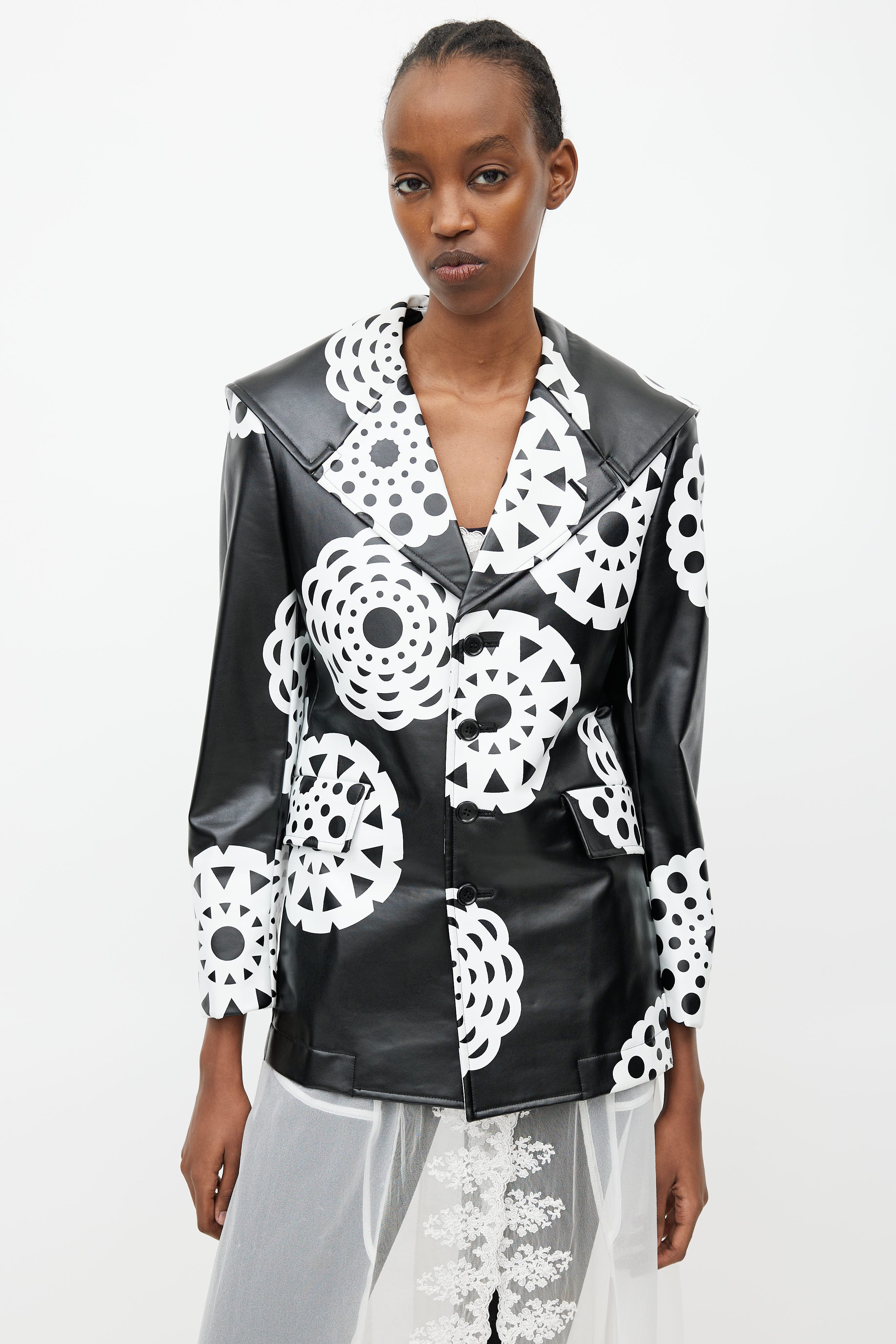 Pre-owned Fall 2001 Comme des Garçons 'Beyond Taboo' black and white faux leather jacket featuring lace print throughout, button up front, sailor collar, two flap pockets at hip, and scoop back hem. Lined. Look #17 from the collection.