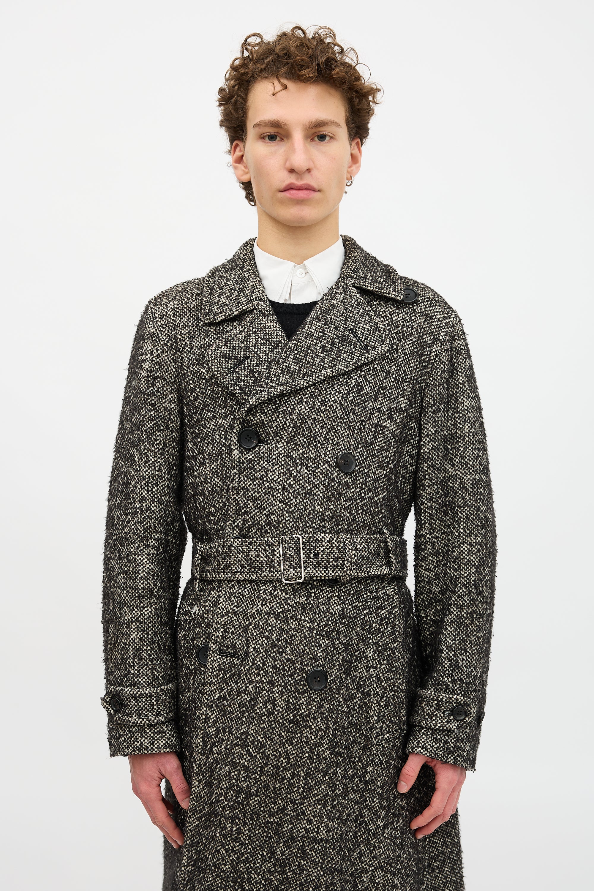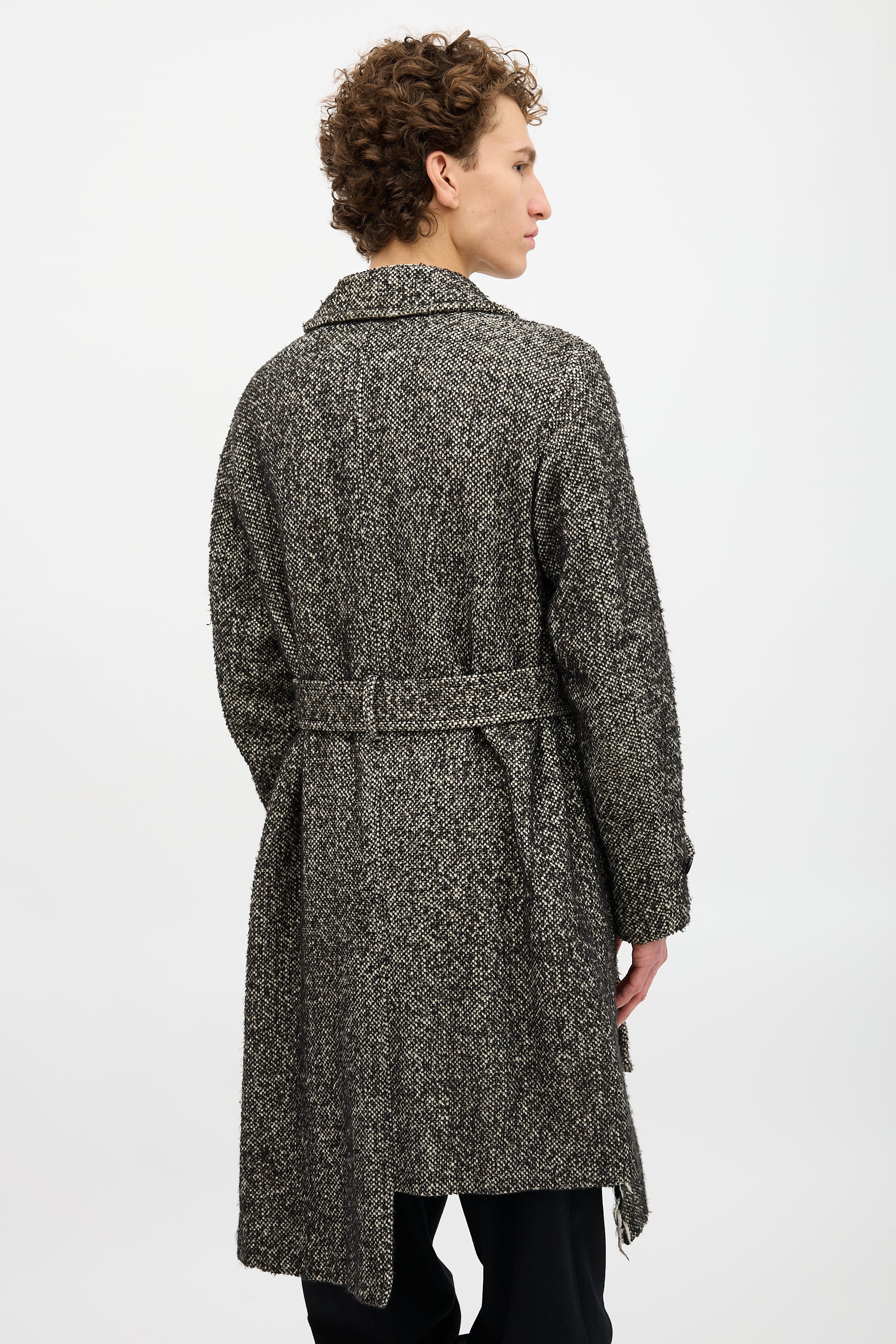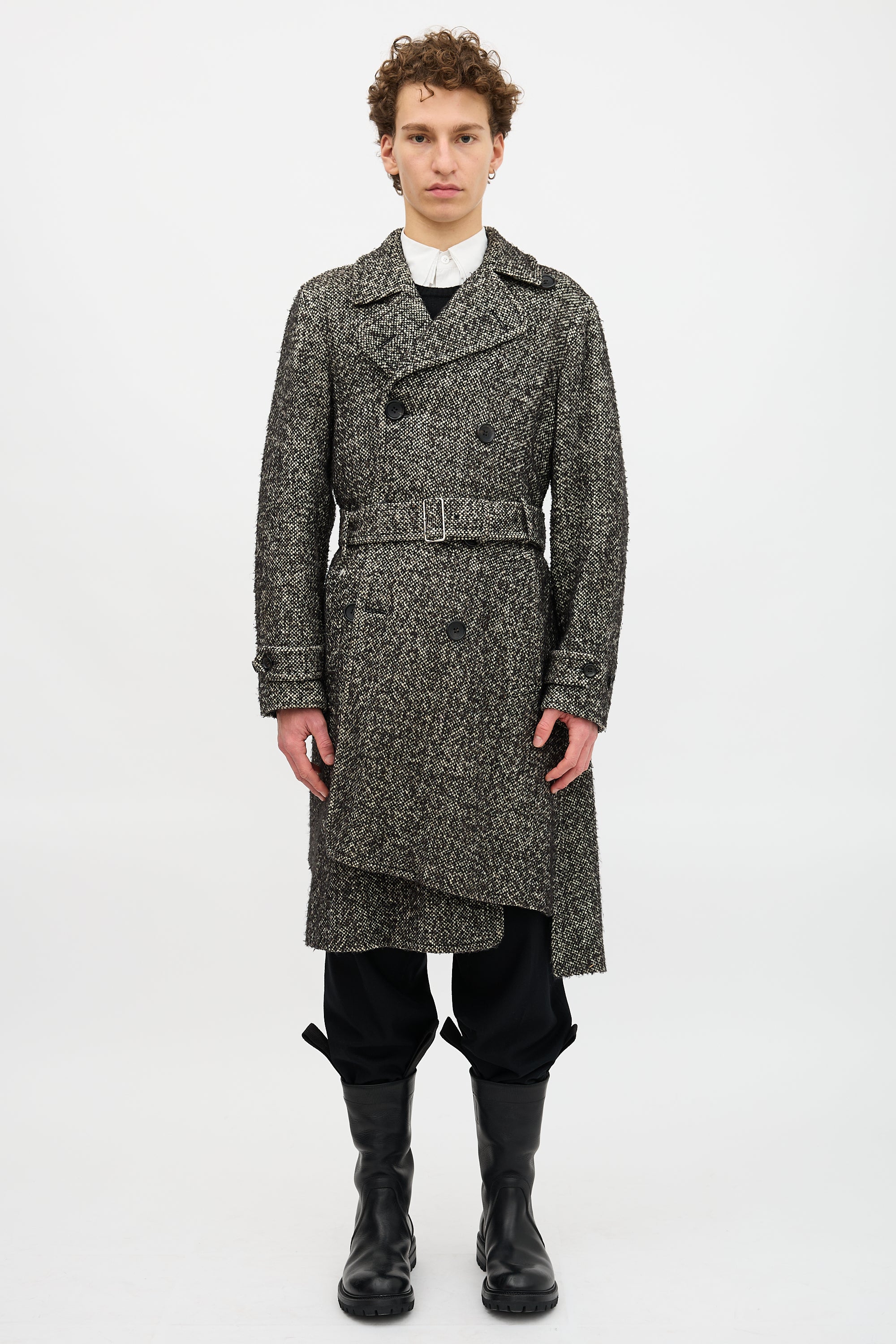 Pre-owned Comme des Garçons Homme Plus Fall/Winter 2017 black and white wool boucle coat featuring wide collar and lapel, asymmetrical design, double breasted button up front, two front pockets, two interior pockets, waist belt, back vent, and cuff straps. Lined.